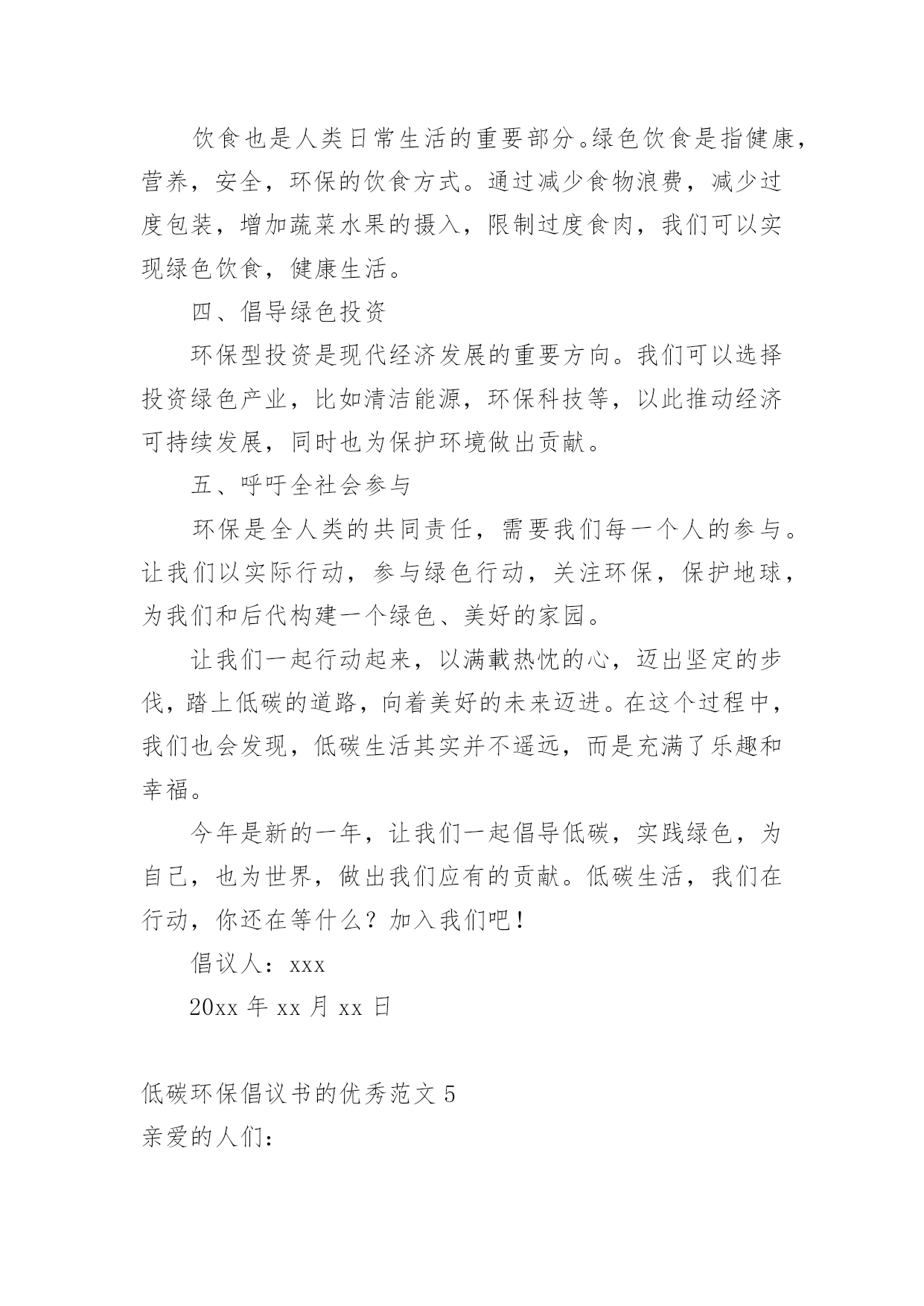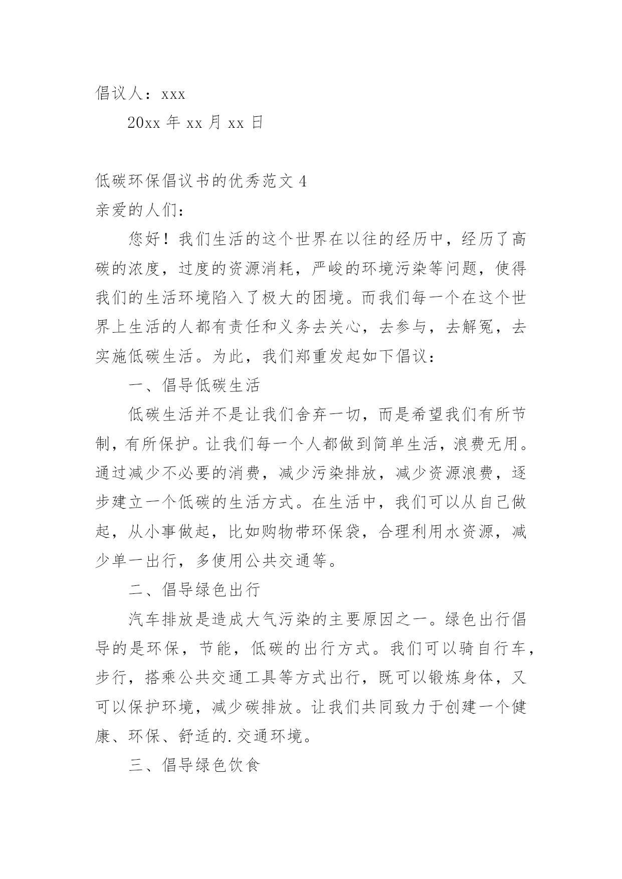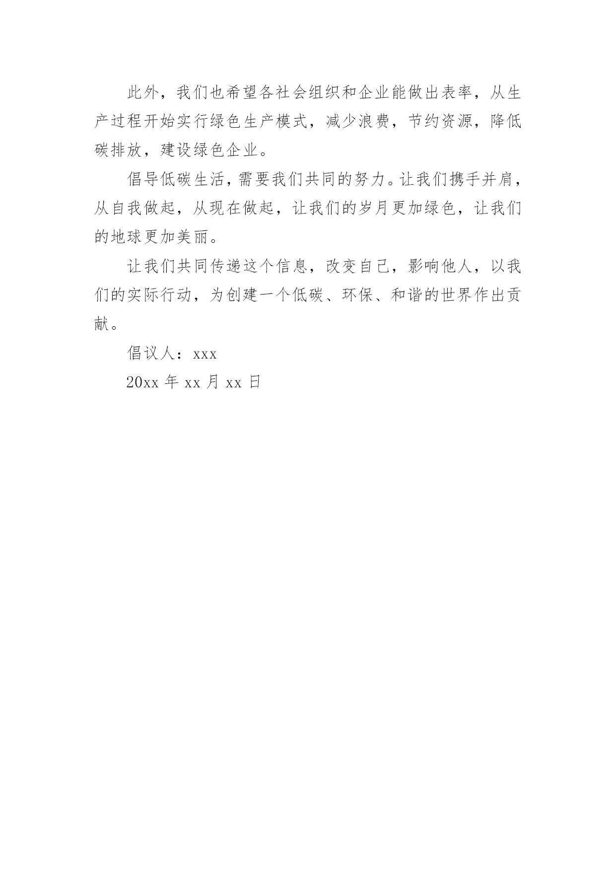 低碳环保倡议书的优秀低碳环保倡议书的优秀范文在不断进步的时代,倡议书的使用频率越来越高,倡议书本身不具有很强的约束力,有关人员可以表示响应,也可以不表示响应。相信许多人会觉得倡议书很难写吧,下面是小编帮大家整理的低碳环保倡议书的优秀范文,欢迎阅读与收藏。低碳环保倡议书的优秀范文1亲爱的人们:我在这里,作为公司的策划人,倡议我们一起投身到保护我们居住的地球这一伟大的事业中去。前一段时间,我参观了几个用户的工厂,和他们的工作人员交谈时,我深深地意识到,我们的工作与保护环境息息相关。日常生活中的每一个细小动作,都会对我们的生存环境产生影响,我们需要更积极的态度来面对这个问题。为此,我希望我们所有的'员工能够尊重自然、尊重环境,尽我们最大的能力,减少排放的二氧化碳,参与到低碳生活的行列中来,养成节约能源、节约资源的好习惯。我相信,只有我们每个人都参与进来,才能最大限度地降低碳排放,保护我们的地球。我们需要采取一些实质性的措施,比如:鼓励员工使用公共交通工具上下班,尽量避免用私家车;办公室内,我们应该尽量使用节能灯泡,减少不必要的电力消耗;公司的餐厅应优先选择当地的、季节性的食物,尽量避免使用长途运输的食物;我们还应该鼓励员工们采用使用双面印刷的方式,来减少纸张的使用。我也诚邀公司的每位领导和员工提出自己对低碳生活的理解和建议,让我们一起创建一个低碳、环保的办公环境。低碳生活并不遥远,它就在我们的身边,它就是我们生活中的一种态度,一种对自然、对生命的尊重。当我们每个人都拥有这样的态度时,我们的世界就会变得更加美好。为了实现这一目标,我建议我们建立一个环保小组,负责推广节能减排、低碳生活的理念,制定相关的规章制度,监督实施。同时,我们还应该在全公司范围内开展低碳之旅、环保讲座等各种活动,提高员工们的环保意识,有效地推广环保知识。让我们共同为创建一个更加环保、低碳的世界而努力,用我们的行动为地球的未来做出贡献。再次感谢大家对此次倡议的关注和支持,让我们一起行动起来,保护我们的地球,保护我们的家。"让我们的地球再次绿意盎然,让我们的生活充满阳光,这是我们每一个人的责任和义务。"倡议人:xxx20xx年xx月xx日低碳环保倡议书的优秀范文2亲爱的人们:感谢各位在百忙之中抽出宝贵的时间阅读我们倡议的递交书。我们这次融合心力写下《低碳绿色生活倡议书》的目的就是为了倡导我们的社区生活更低碳,更健康,更环保。在近年来全球气候变暖的大背景下,温室效应日益严重,一些恶劣的自然灾害也正在全球范围内频繁发生,给人类,给地球带来了严重伤害。我们唯一的地球,就好似一个疾病缠身的老人,极度需要我们这些住在她身上的孩子们细心的照料。面对如此严峻的环境问题,我们是否应该坐视不理?答案是:绝对不能。因此,为了我们共同的家园,为了我们和我们后代的生活环境,我们倡导全体社区成员一起行动起来,采取一系列低碳生活的行动——从我做起,从现在做起,从身边做起。倡议具体如下:一、倡议我们尽量采购新鲜、本地和季节性的食物,减少长途运输带来的碳排放;二、倡导我们合理利用用水,节约每一滴珍贵的水源;三、倡导我们尽可能采用公共交通工具、骑自行车或步行替代个人小轿车出行;四、倡议我们积极参与垃圾分类,鼓励废物回收,有效利用资源,减少垃圾填埋;五、倡导我们节约能源,提倡使用节能产品度过灯号,晚间不用电器尽量关闭。以上五点倡议,涵盖了我们日常生活的各个方面。我们希望并相信,只要我们每一个人都能遵循并实践,就能在我们的社区中形成一股强大的低碳生活的新风尚。我们相信,小步走得快,只要每个人都能尽自己的一份力,就能推动全社区、乃至全人类走向一个更健康、更绿色、更可持续的未来。我们坚信,我们的'地球,是值得我们去爱的,让我们携手并肩,行动起来,珍爱这个属于我们的家园。一起期待我们的社区在所有成员的共同努力下,成为一片绿色的翡翠,一个低碳的乐园,一个带给我们无尽的幸福和欢乐的避风港。让我们共同前行,为了我们的地球、为了我们的未来!倡议人:xxx20xx年xx月xx日低碳环保倡议书的优秀范文3亲爱的人们:环保以其独特的性质和价值,已经深深渗透到我们每个人的日常生活中。然而,我们面临的环境问题仍然严峻。气候变化、水污染、空气污染、土地退化等问题让我们深感危机。低碳环保生活方式的推广,有赖于全社会每一个人的实实在在的行动。它不仅使我们与自然和谐共生,净化了人们的心灵,还为子孙后代留下了洁净的生存环境。我们需要在生活中落实低碳环保。这包括鼓励公共交通、节约能源、选择环保产品,减少一次性物品的使用,善于回收和再利用,垃圾分类等。这些举动,虽然微小,但如果每个人都行动起来,就足以产生巨大的变化。我们需要在工作中实践低碳环保。企业是社会生产生活的.重要组成部分,企业绿色低碳发展的重要性不言而喻。企业应结合自身特点,进行