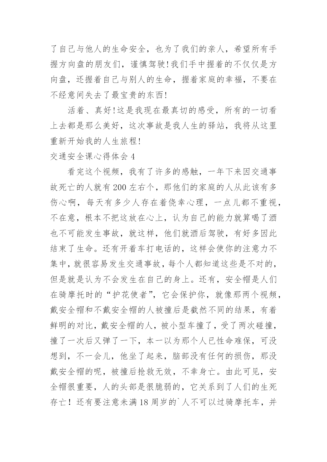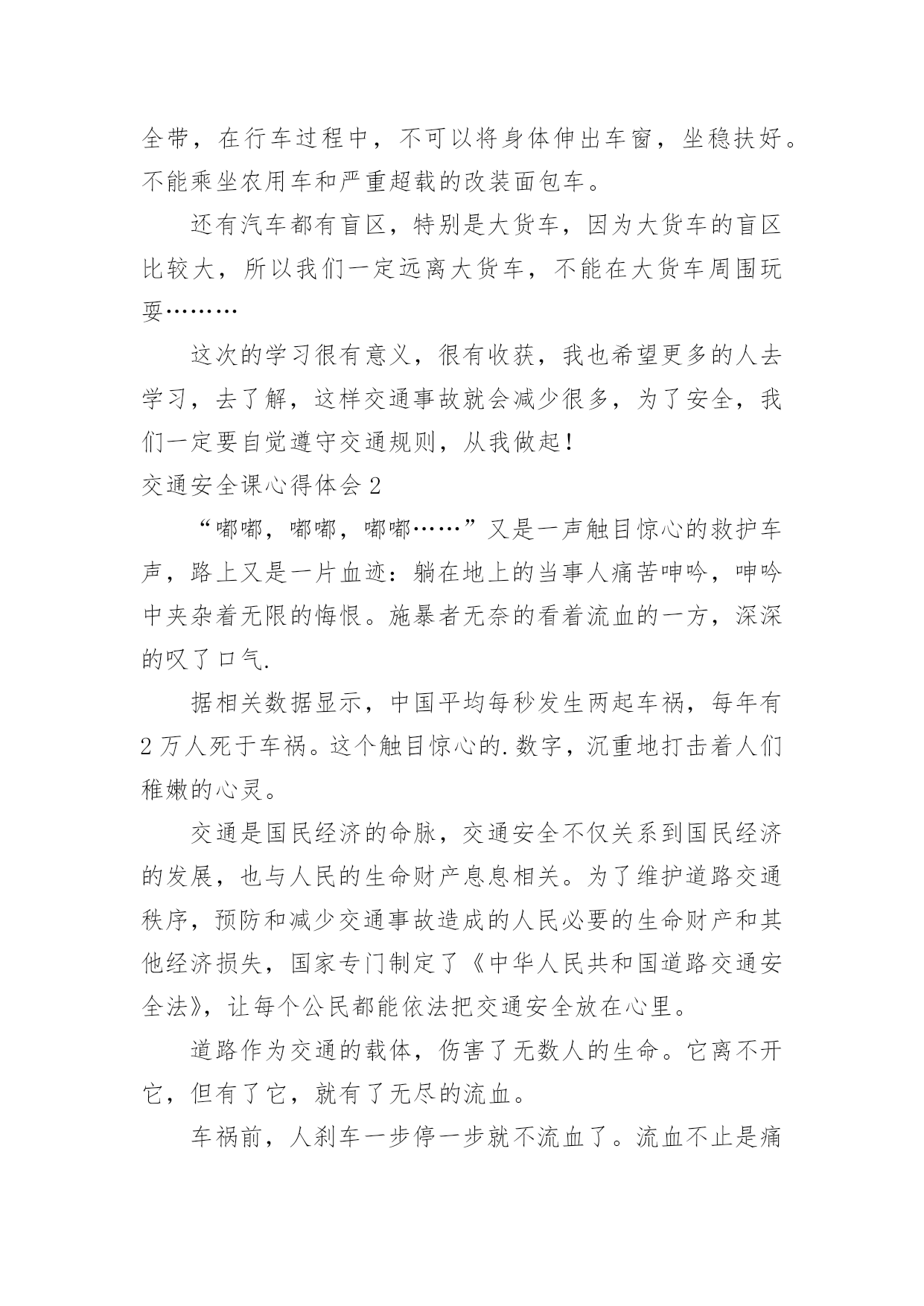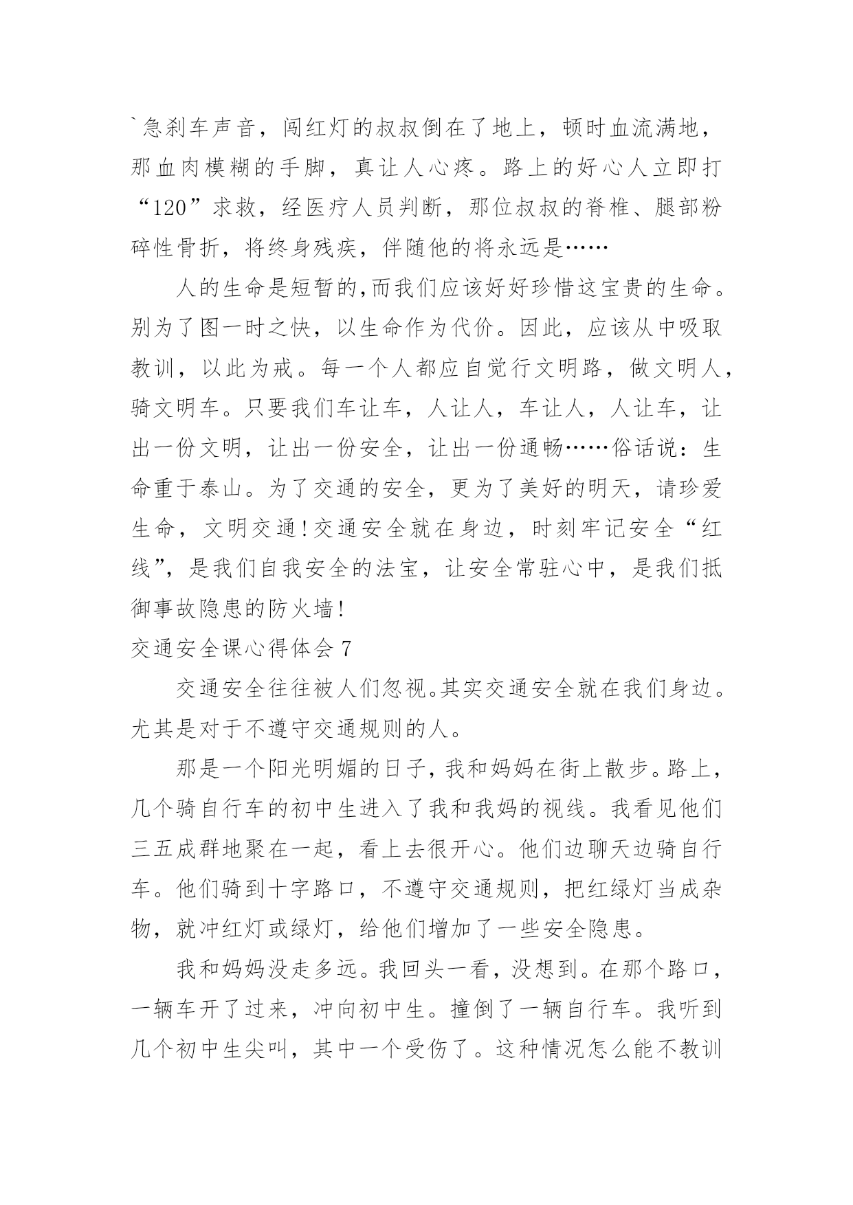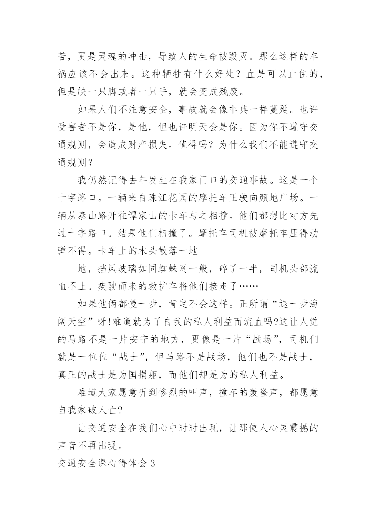 交通安全课心得体会交通安全课心得体会当我们备受启迪时,可以通过写心得体会的方式将其记录下来,通过写心得体会,可以帮助我们总结积累经验。那么如何写心得体会才能更有感染力呢?下面是小编帮大家整理的交通安全课心得体会,欢迎大家分享。交通安全课心得体会1今天晚上,我观看了央视少儿播出的《交通安全》视频,让我对交通安全的重要性有了更加全面、深刻的理解。我们在日常生活中离不开吃、穿、住、行,这个“行”看似简单,但却很重要。因为任何一个忽视交通规则的'不良行为,就有可能威胁到我们的生命。视频里那些交通事故的画面,让我意识到了生命的可贵,交通安全的重我们在走路时,必须走人行横道,一定要记住“红灯停,绿灯行”,集中精力,随时注意观察路面情况,宁停三分,不争一秒,保证行路的安全。告诉爸爸妈妈在骑行电动车时,一定要佩戴头盔,而且我们在乘坐时,也要佩戴头盔,通过视频对比,我们看到了佩戴头盔的重要性,它可以在事故中保障我们的安全,大家一定记得佩。我们在上、下学乘坐校车和公共汽车时,一定要系好安全带,在行车过程中,不可以将身体伸出车窗,坐稳扶好。不能乘坐农用车和严重超载的改装面包车。还有汽车都有盲区,特别是大货车,因为大货车的盲区比较大,所以我们一定远离大货车,不能在大货车周围玩耍………这次的学习很有意义,很有收获,我也希望更多的人去学习,去了解,这样交通事故就会减少很多,为了安全,我们一定要自觉遵守交通规则,从我做起!交通安全课心得体会2“嘟嘟,嘟嘟,嘟嘟……”又是一声触目惊心的救护车声,路上又是一片血迹:躺在地上的当事人痛苦呻吟,呻吟中夹杂着无限的悔恨。施暴者无奈的看着流血的一方,深深的叹了口气.据相关数据显示,中国平均每秒发生两起车祸,每年有2万人死于车祸。这个触目惊心的.数字,沉重地打击着人们稚嫩的心灵。交通是国民经济的命脉,交通安全不仅关系到国民经济的发展,也与人民的生命财产息息相关。为了维护道路交通秩序,预防和减少交通事故造成的人民必要的生命财产和其他经济损失,国家专门制定了《中华人民共和国道路交通安全法》,让每个公民都能依法把交通安全放在心里。道路作为交通的载体,伤害了无数人的生命。它离不开它,但有了它,就有了无尽的流血。车祸前,人刹车一步停一步就不流血了。流血不止是痛苦,更是灵魂的冲击,导致人的生命被毁灭。那么这样的车祸应该不会出来。这种牺牲有什么好处?血是可以止住的,但是缺一只脚或者一只手,就会变成残废。如果人们不注意安全,事故就会像非典一样蔓延。也许受害者不是你,是他,但也许明天会是你。因为你不遵守交通规则,会造成财产损失。值得吗?为什么我们不能遵守交通规则?我仍然记得去年发生在我家门口的交通事故。这是一个十字路口。一辆来自珠江花园的摩托车正驶向颜地广场。一辆从泰山路开往谭家山的卡车与之相撞。他们都想比对方先过十字路口。结果他们相撞了。摩托车司机被摩托车压得动弹不得。卡车上的木头散落一地地,挡风玻璃如同蜘蛛网一般,碎了一半,司机头部流血不止。疾驶而来的救护车将他们接走了……如果他俩都慢一步,肯定不会这样。正所谓“退一步海阔天空”呀!难道就为了自我的私人利益而流血吗?这让人觉的马路不是一片安宁的地方,更像是一片“战场”,司机们就是一位位“战士”,但马路不是战场,他们也不是战士,真正的战士是为国捐躯,而他们却是为的私人利益。难道大家愿意听到惨烈的叫声,撞车的轰隆声,都愿意自我家破人亡?让交通安全在我们心中时时出现,让那使人心灵震撼的声音不再出现。交通安全课心得体会3记得每次开车,家里人都会千叮万嘱要注意安全、开慢一点,听的多了,还真有点不耐烦。经常看到车祸的发生,从未想过会发生在自己身上,也许是对自己多年的驾驶技术的自信,觉得事故离我很遥远,然而,事故还是发生了。大年初七,因买不到回郴州的车票,急着赶回去开业务员列会,我跟朋友借了一部车赶回郴州,经过湖南汝城县,在当地住了一晚。第二天上午,带上业务员小何继续出发。因为早上下了一场雨,路面有些湿滑,在行驶到一处长陡坡的弯道处时,路面突然出现一层湿滑的'泥土,车轮打滑,车辆失控、失去重心滚入路旁的深沟。当我从底朝天的车里挣扎出来后,看到车子正好被一个小土堆挡住,前后都是空荡荡的悬崖,望着那几十米的深渊,我感觉头皮发麻,浑身直冒冷汗。业务员小何还在车厢中痛苦呻吟,我砸碎玻璃将其救出后,拦了一部过路车,心急火燎的将她送到附近的医院检查,在等待结果的这段时间里,心里的煎熬,那种极度痛苦的滋味无比难受。不幸中的万幸,小何虽然骨折,但没有伤到神经,悬着的心才稍稍落下!事情刚刚过去不久,现在想起来还心有余悸。想想如果车子滚下了悬崖,我脑中浮现出父母绝望的面孔、妻子心碎的声音、女儿无助的眼神、美满幸福的家庭从此支离破碎,留给亲人们的只有痛不欲生;我不敢再想象下去了!所谓车祸猛如虎,只有身处其中才能真正理