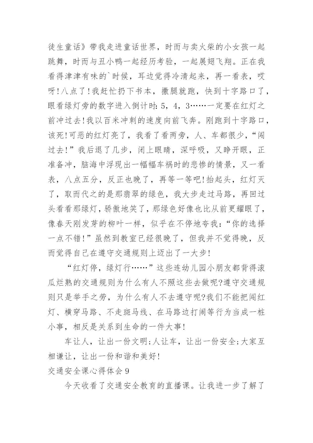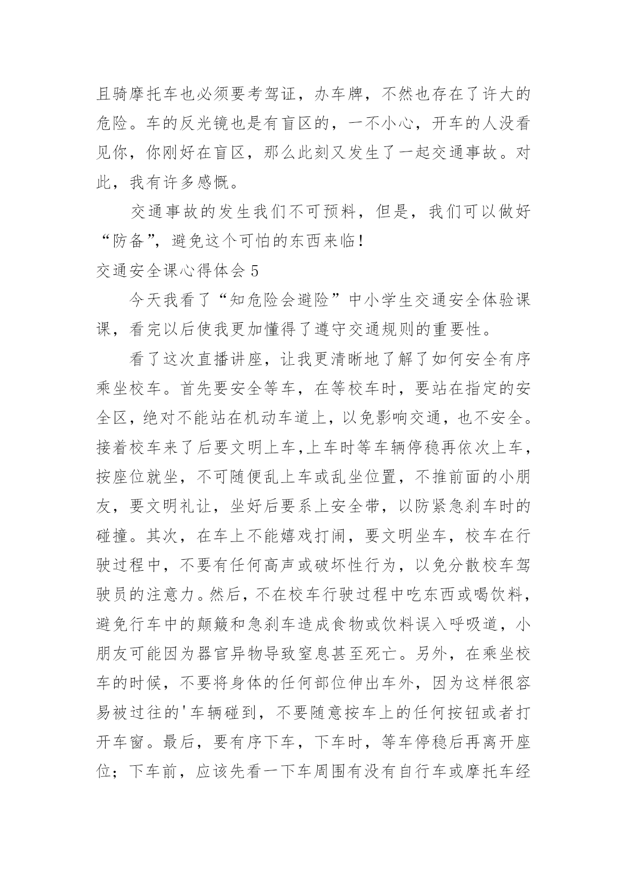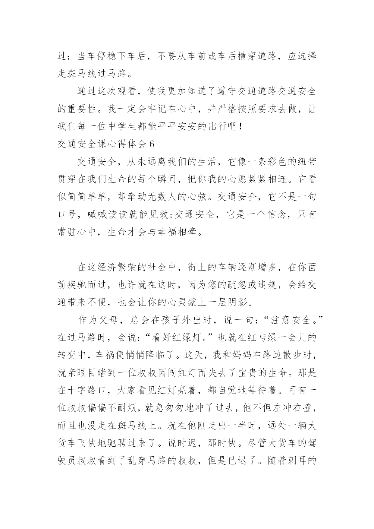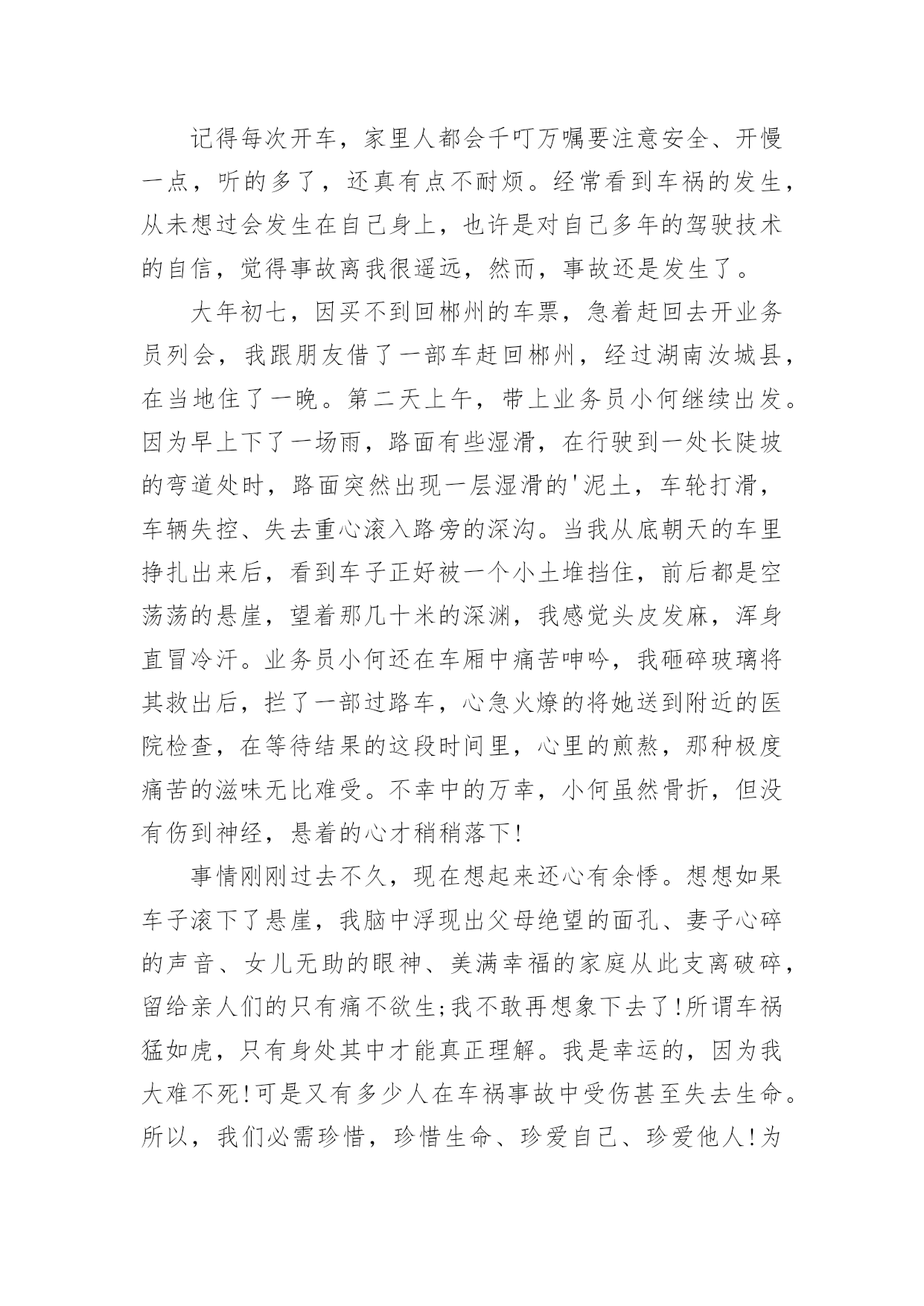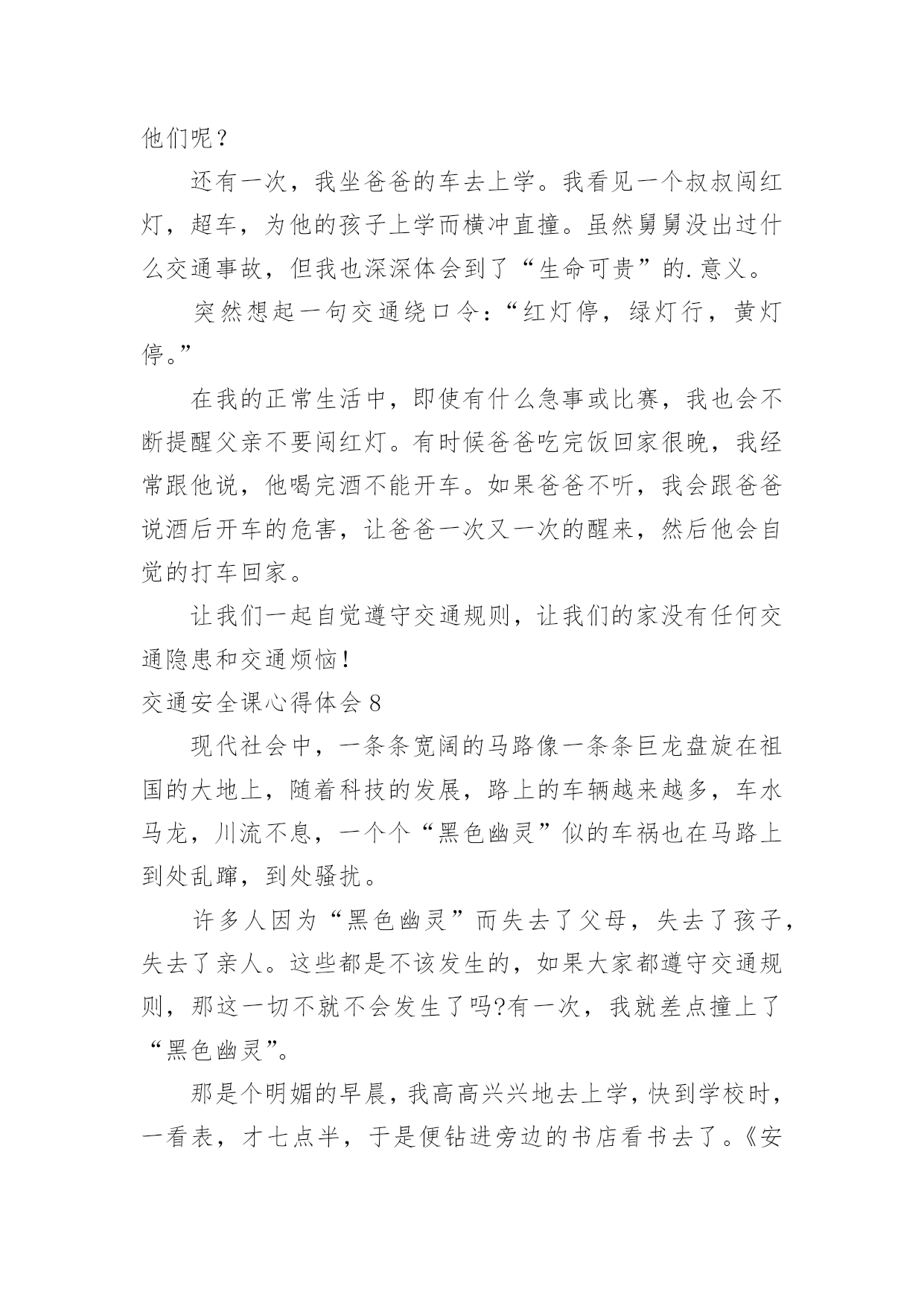 交通安全课心得体会交通安全课心得体会当我们备受启迪时,可以通过写心得体会的方式将其记录下来,通过写心得体会,可以帮助我们总结积累经验。那么如何写心得体会才能更有感染力呢?下面是小编帮大家整理的交通安全课心得体会,欢迎大家分享。交通安全课心得体会1今天晚上,我观看了央视少儿播出的《交通安全》视频,让我对交通安全的重要性有了更加全面、深刻的理解。我们在日常生活中离不开吃、穿、住、行,这个“行”看似简单,但却很重要。因为任何一个忽视交通规则的'不良行为,就有可能威胁到我们的生命。视频里那些交通事故的画面,让我意识到了生命的可贵,交通安全的重我们在走路时,必须走人行横道,一定要记住“红灯停,绿灯行”,集中精力,随时注意观察路面情况,宁停三分,不争一秒,保证行路的安全。告诉爸爸妈妈在骑行电动车时,一定要佩戴头盔,而且我们在乘坐时,也要佩戴头盔,通过视频对比,我们看到了佩戴头盔的重要性,它可以在事故中保障我们的安全,大家一定记得佩。我们在上、下学乘坐校车和公共汽车时,一定要系好安全带,在行车过程中,不可以将身体伸出车窗,坐稳扶好。不能乘坐农用车和严重超载的改装面包车。还有汽车都有盲区,特别是大货车,因为大货车的盲区比较大,所以我们一定远离大货车,不能在大货车周围玩耍………这次的学习很有意义,很有收获,我也希望更多的人去学习,去了解,这样交通事故就会减少很多,为了安全,我们一定要自觉遵守交通规则,从我做起!交通安全课心得体会2“嘟嘟,嘟嘟,嘟嘟……”又是一声触目惊心的救护车声,路上又是一片血迹:躺在地上的当事人痛苦呻吟,呻吟中夹杂着无限的悔恨。施暴者无奈的看着流血的一方,深深的叹了口气.据相关数据显示,中国平均每秒发生两起车祸,每年有2万人死于车祸。这个触目惊心的.数字,沉重地打击着人们稚嫩的心灵。交通是国民经济的命脉,交通安全不仅关系到国民经济的发展,也与人民的生命财产息息相关。为了维护道路交通秩序,预防和减少交通事故造成的人民必要的生命财产和其他经济损失,国家专门制定了《中华人民共和国道路交通安全法》,让每个公民都能依法把交通安全放在心里。道路作为交通的载体,伤害了无数人的生命。它离不开它,但有了它,就有了无尽的流血。车祸前,人刹车一步停一步就不流血了。流血不止是痛苦,更是灵魂的冲击,导致人的生命被毁灭。那么这样的车祸应该不会出来。这种牺牲有什么好处?血是可以止住的,但是缺一只脚或者一只手,就会变成残废。如果人们不注意安全,事故就会像非典一样蔓延。也许受害者不是你,是他,但也许明天会是你。因为你不遵守交通规则,会造成财产损失。值得吗?为什么我们不能遵守交通规则?我仍然记得去年发生在我家门口的交通事故。这是一个十字路口。一辆来自珠江花园的摩托车正驶向颜地广场。一辆从泰山路开往谭家山的卡车与之相撞。他们都想比对方先过十字路口。结果他们相撞了。摩托车司机被摩托车压得动弹不得。卡车上的木头散落一地地,挡风玻璃如同蜘蛛网一般,碎了一半,司机头部流血不止。疾驶而来的救护车将他们接走了……如果他俩都慢一步,肯定不会这样。正所谓“退一步海阔天空”呀!难道就为了自我的私人利益而流血吗?这让人觉的马路不是一片安宁的地方,更像是一片“战场”,司机们就是一位位“战士”,但马路不是战场,他们也不是战士,真正的战士是为国捐躯,而他们却是为的私人利益。难道大家愿意听到惨烈的叫声,撞车的轰隆声,都愿意自我家破人亡?让交通安全在我们心中时时出现,让那使人心灵震撼的声音不再出现。交通安全课心得体会3记得每次开车,家里人都会千叮万嘱要注意安全、开慢一点,听的多了,还真有点不耐烦。经常看到车祸的发生,从未想过会发生在自己身上,也许是对自己多年的驾驶技术的自信,觉得事故离我很遥远,然而,事故还是发生了。大年初七,因买不到回郴州的车票,急着赶回去开业务员列会,我跟朋友借了一部车赶回郴州,经过湖南汝城县,在当地住了一晚。第二天上午,带上业务员小何继续出发。因为早上下了一场雨,路面有些湿滑,在行驶到一处长陡坡的弯道处时,路面突然出现一层湿滑的'泥土,车轮打滑,车辆失控、失去重心滚入路旁的深沟。当我从底朝天的车里挣扎出来后,看到车子正好被一个小土堆挡住,前后都是空荡荡的悬崖,望着那几十米的深渊,我感觉头皮发麻,浑身直冒冷汗。业务员小何还在车厢中痛苦呻吟,我砸碎玻璃将其救出后,拦了一部过路车,心急火燎的将她送到附近的医院检查,在等待结果的这段时间里,心里的煎熬,那种极度痛苦的滋味无比难受。不幸中的万幸,小何虽然骨折,但没有伤到神经,悬着的心才稍稍落下!事情刚刚过去不久,现在想起来还心有余悸。想想如果车子滚下了悬崖,我脑中浮现出父母绝望的面孔、妻子心碎的声音、女儿无助的眼神、美满幸福的家庭从此支离破碎,留给亲人们的只有痛不欲生;我不敢再想象下去了!所谓车祸猛如虎,只有身处其中才能真正理