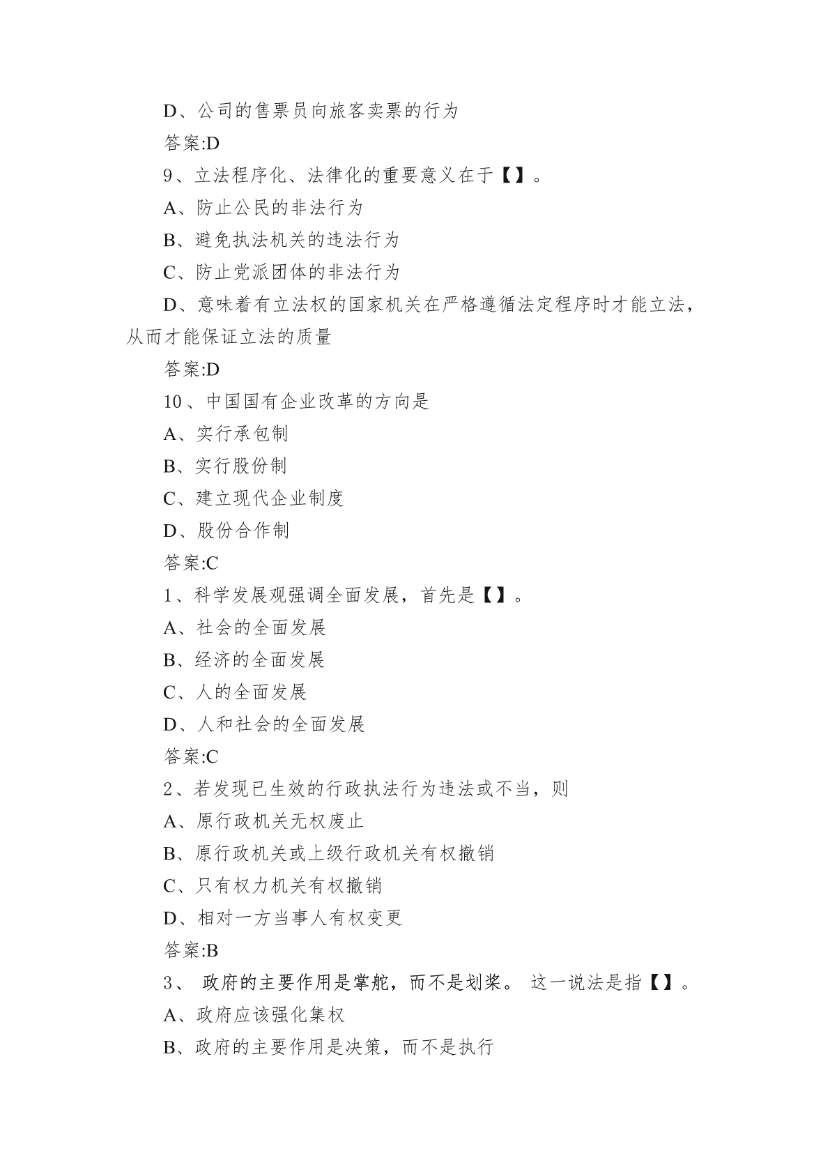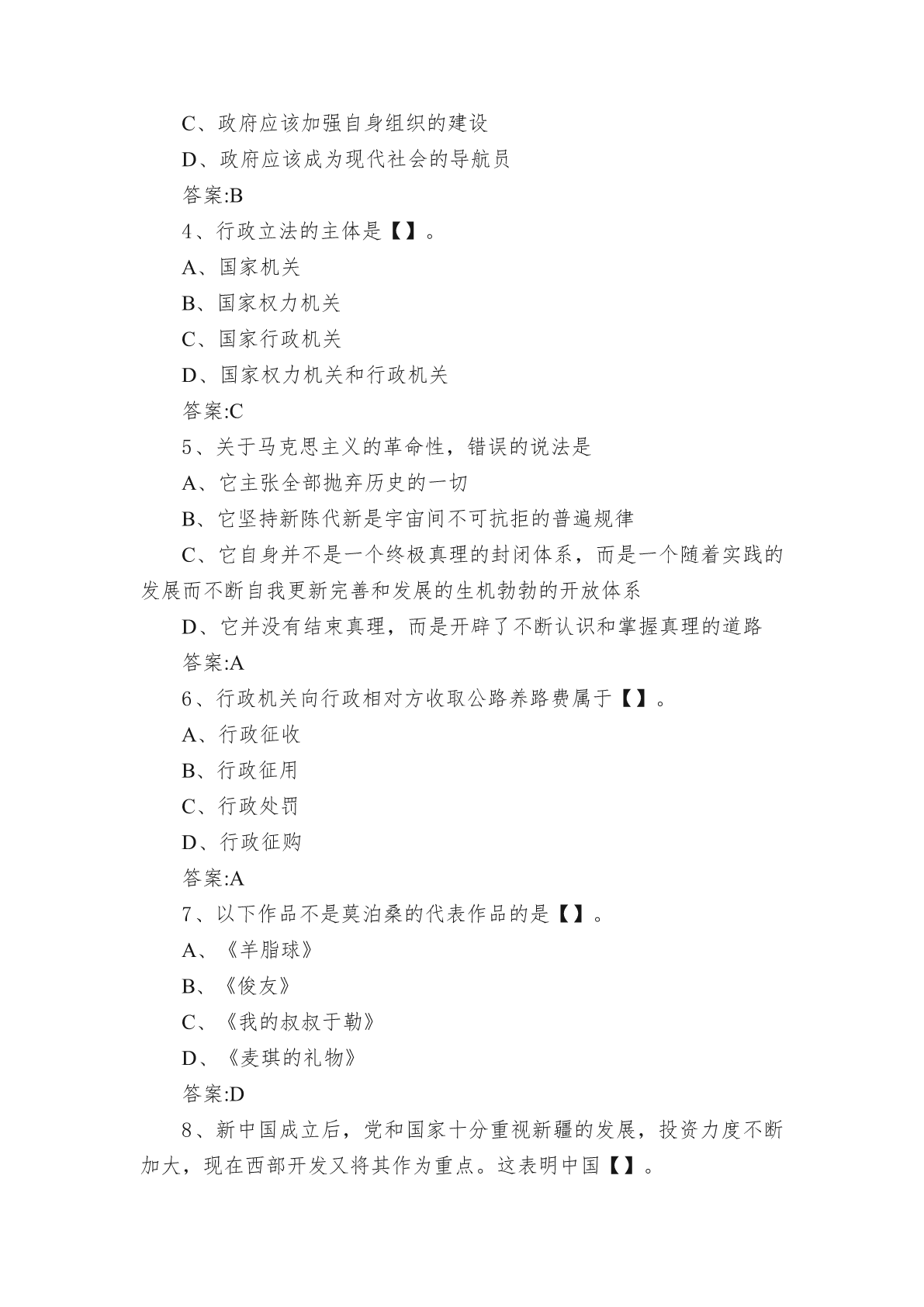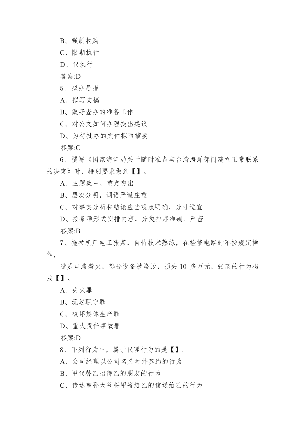 河南公务员考试公共基础知识试题河南公务员考试公共基础知识试题河南公务员考试公共基础知识试题及答案:1、由比利时政府授权修建的全球首座温室气体零排放极地考察站2月15日在南极落成,这座考察站依靠风能和太阳能运转,力求实现对环境的影响最小化,它的名字是【】。A、伊丽莎白公主站B、基辅罗斯公主站C、伊莎贝尔公主站D、茜茜利亚公主站答案:A2、行政许可申请事项依法不属于本行政机关职权范围的,应当【】。A、在7日内将申请转送有关行政机关B、在5日内作出不予受理的决定C、即时告知申请人不受理D、即时作出不予受理的决定并告知向有关行政机关申请答案:D3、在中英《南京条约》及其附件中,最能反映英国发动侵略战争目的的规定是【】。A、割让香港岛B、开放五个通商口岸C、赔款的规定D、英国享受最惠国待遇答案:B4、下列行政强制措施当中【】属于间接执行性强制措施。A、查封、扣押B、强制收购C、限期执行D、代执行答案:D5、拟办是指A、拟写文稿B、做好查办的准备工作C、对公文如何办理提出建议D、为待批办的文件拟写摘要答案:C6、撰写《国家海洋局关于随时准备与台湾海洋部门建立正常联系的决定》时,特别要求做到【】。A、主题集中,重点突出B、层次分明,词语严谨庄重C、对事实分析和结论应当观点明确,分寸适宜D、按条项形式安排内容,分类排序准确、严密答案:B7、拖拉机厂电工张某,自恃技术熟练,在检修电路时不按规定操作,造成电路着火,部分设备被烧毁,损失10多万元,张某的行为构成【】。A、失火罪B、玩忽职守罪C、破坏集体生产罪D、重大责任事故罪答案:D8、下列行为中,属于代理行为的是【】。A、公司经理以公司名义对外签约的行为B、甲代替乙招待乙的朋友的行为C、传达室孙大爷将甲寄给乙的信送给乙的行为D、公司的售票员向旅客卖票的行为答案:D9、立法程序化、法律化的重要意义在于【】。A、防止公民的非法行为B、避免执法机关的违法行为C、防止党派团体的非法行为D、意味着有立法权的国家机关在严格遵循法定程序时才能立法,从而才能保证立法的质量答案:D10、中国国有企业改革的方向是A、实行承包制B、实行股份制C、建立现代企业制度D、股份合作制答案:C1、科学发展观强调全面发展,首先是【】。A、社会的全面发展B、经济的全面发展C、人的全面发展D、人和社会的全面发展答案:C2、若发现已生效的行政执法行为违法或不当,则A、原行政机关无权废止B、原行政机关或上级行政机关有权撤销C、只有权力机关有权撤销D、相对一方当事人有权变更答案:B3、政府的主要作用是掌舵,而不是划桨。这一说法是指【】。A、政府应该强化集权B、政府的主要作用是决策,而不是执行C、政府应该加强自身组织的建设D、政府应该成为现代社会的导航员答案:B4、行政立法的主体是【】。A、国家机关B、国家权力机关C、国家行政机关D、国家权力机关和行政机关答案:C5、关于马克思主义的革命性,错误的说法是A、它主张全部抛弃历史的一切B、它坚持新陈代新是宇宙间不可抗拒的普遍规律C、它自身并不是一个终极真理的封闭体系,而是一个随着实践的发展而不断自我更新完善和发展的生机勃勃的开放体系D、它并没有结束真理,而是开辟了不断认识和掌握真理的道路答案:A6、行政机关向行政相对方收取公路养路费属于【】。A、行政征收B、行政征用C、行政处罚D、行政征购答案:A7、以下作品不是莫泊桑的代表作品的是【】。A、《羊脂球》B、《俊友》C、《我的叔叔于勒》D、《麦琪的礼物》答案:D8、新中国成立后,党和国家十分重视新疆的发展,投资力度不断加大,现在西部开发又将其作为重点。这表明中国【】。A、坚持了民族区域自治政策B、坚持了民族团结原则C、坚持了各民族共同繁荣的原则D、坚持了宗教信仰自由政策答案:C9、马克思主义的创立意味着【】。A、人类哲学思想发达到了顶峰B、科学哲学体系的最终完成C、绝对真理的体现D、人类优秀哲学思想集大成和在更高阶段上发展的起点答案:D10、3月1日16时13分10秒,【】在北京航天飞行控制中心科技人员的精确控制下,准确受控撞击在月球东经52.36度、南纬1.50度的月球丰富海区域,为中国探月一期工程画上圆满的句号。A、嫦娥一号卫星B、东方红一号卫星C、资源一号卫星D、北京一号卫星答案:A1、行政诉讼监督,是指人民法院经过行使【】对公安机关及其人民警察具体行政行为的合法性进行审查,促使公安机关及人民警察依法行政的监督形式。A、民事审判权B、行政审判权C、刑事审判