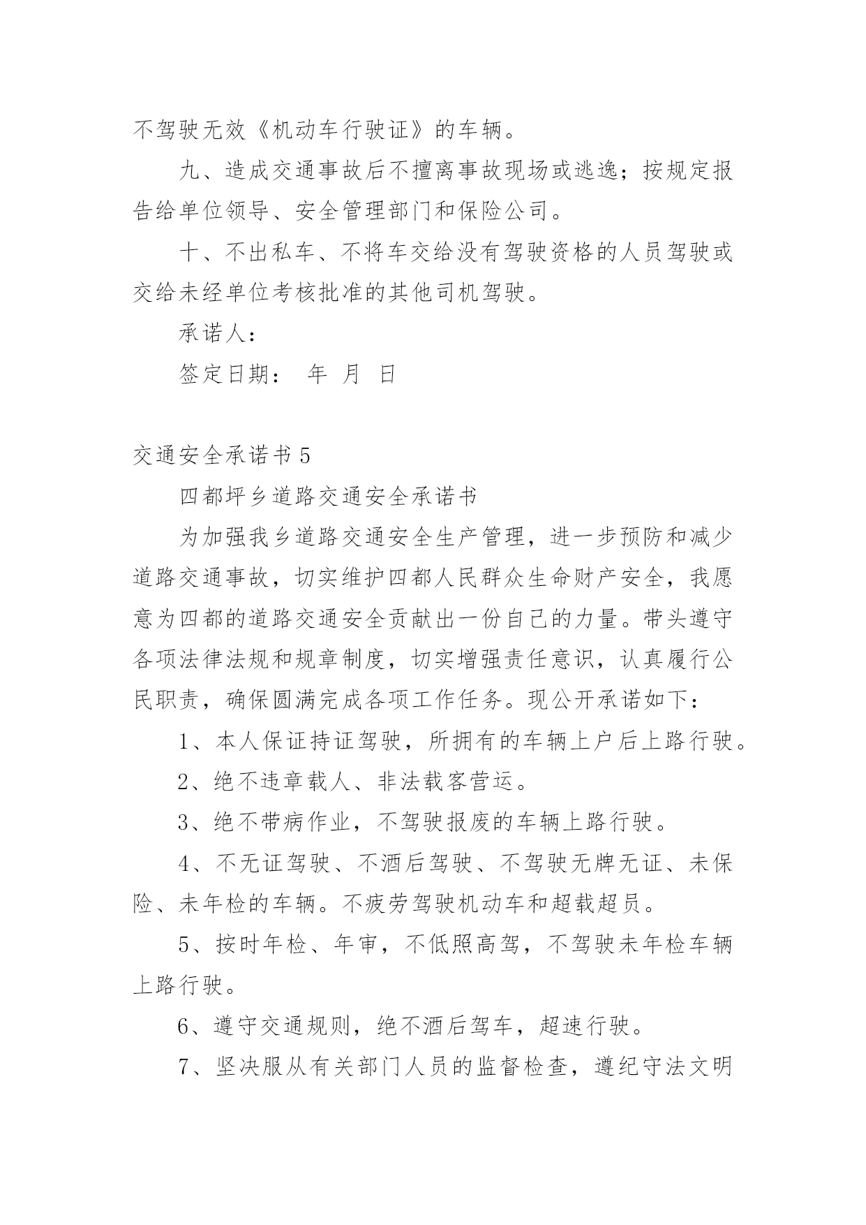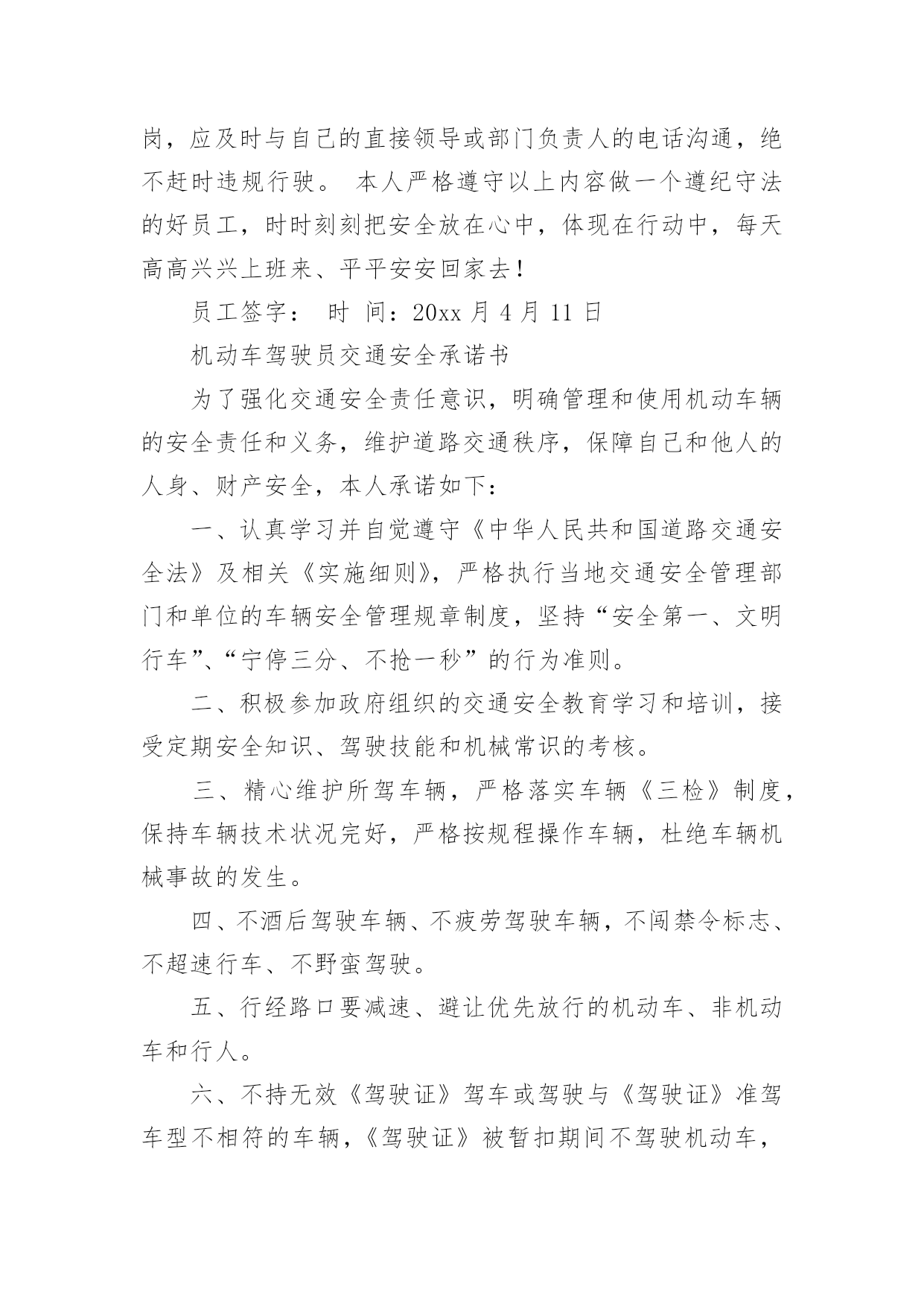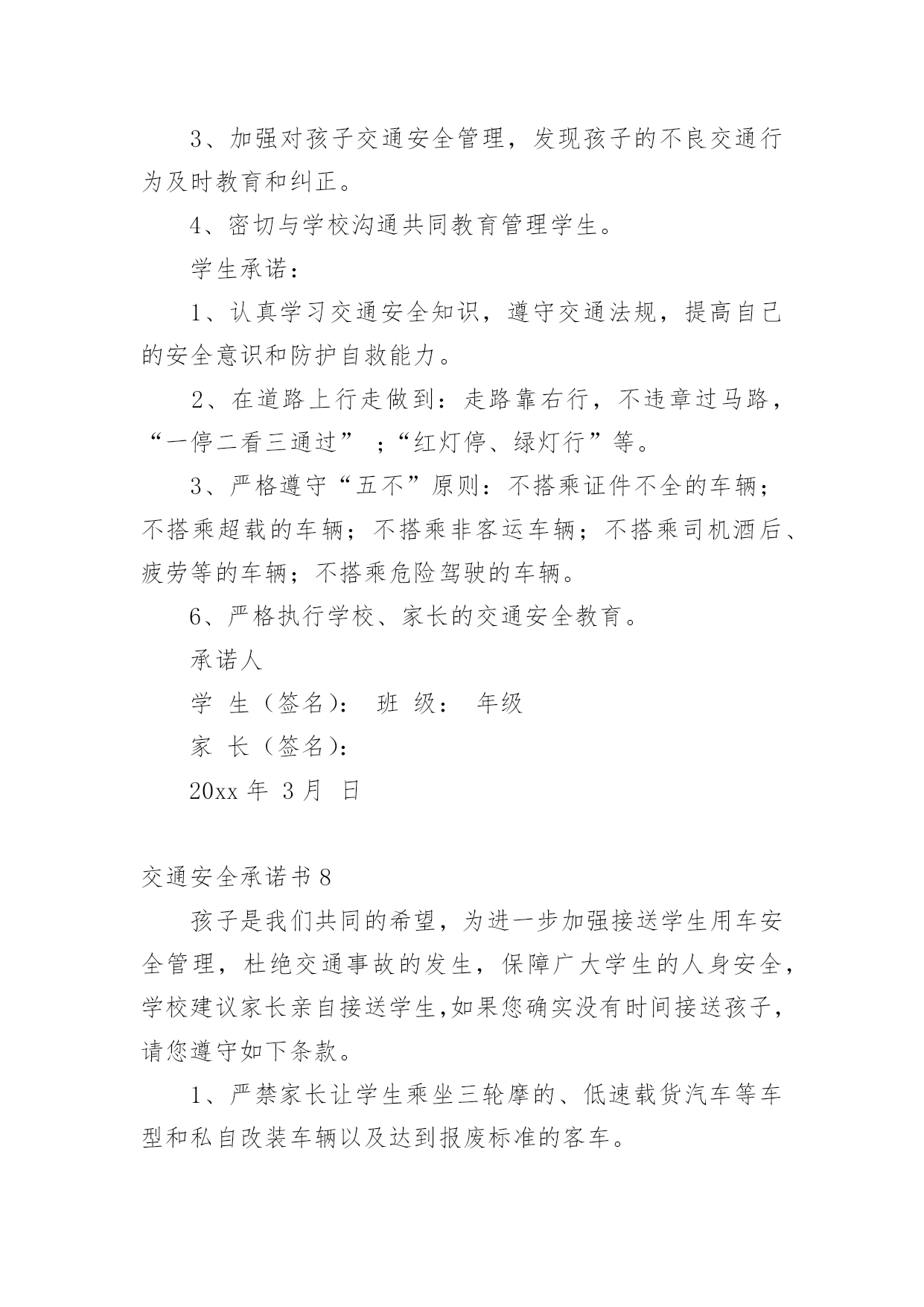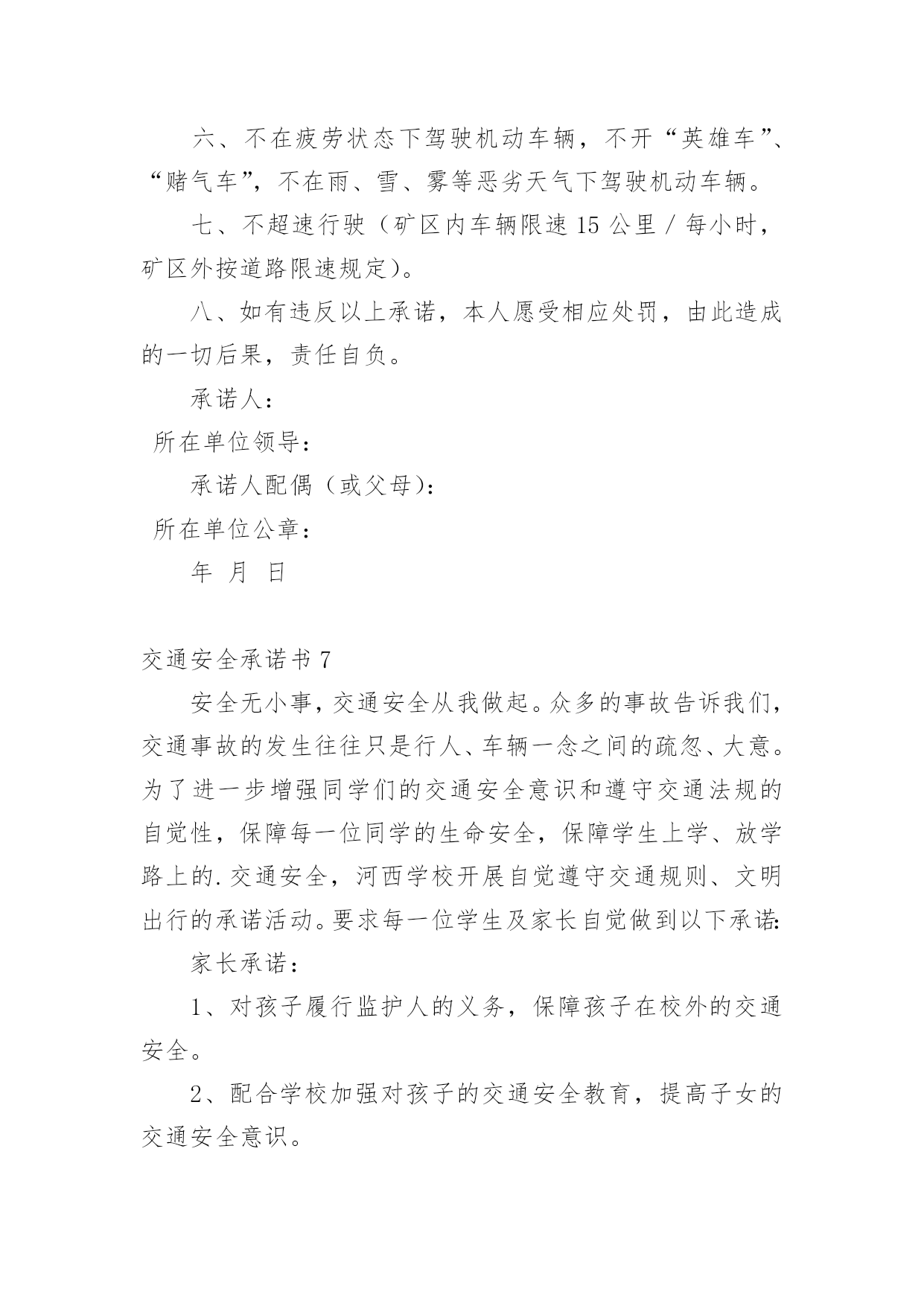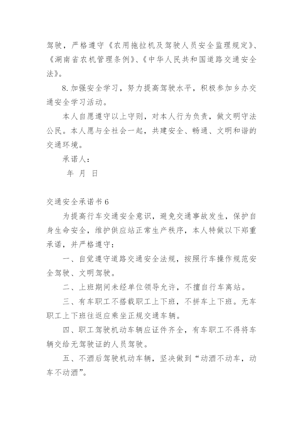 交通安全承诺书【荐】交通安全承诺书在现在的社会生活中,用到承诺书的地方越来越多,承诺书是承诺人对要约完全的、单纯的同意,并以书面的形式表示。写起承诺书来就毫无头绪?下面是小编为大家整理的交通安全承诺书,仅供参考,大家一起来看看吧。交通安全承诺书1安全无小事,交通安全从我做起。我承诺自觉做到以下几点:1、认真学习交通安全知识,遵守交通法规,提高自己的安全意识和防护自救能力。2、严格遵守交通法规,坚决不骑车上下学,不攀扶其他车辆或者手中持物;不追逐打闹,不三五并肩行驶;放假不违章骑车。3、在道路上行走做到:走路靠右行,不违章过马路,“一停二看三通过”;“红灯停、绿灯行”等。4、严格遵守“五不”原则:不搭乘证件不全的车辆;不搭乘超载的车辆;不搭乘非客运车辆;不搭乘司机酒后、疲劳等的车辆;不搭乘危险驾驶的车辆。5、严格执行学校、家长的交通安全教育。学生签字:xx家长签字:xx20xx年x月x日交通安全承诺书2生命是宝贵的,人的一生就只有一次生命,我们应该爱惜生命。注意交通安全也是爱惜生命的一部分。所以,我要自觉的遵守交通法规。1、认真学习道路交通安全法律法规和安全常识,强化自身交通法制观念,积极参加学校组织的交通安全教育活动。2、自觉遵守交通法律法规,骑车时靠右行,不并行,不撒把,不飙车,按学校规定的路线或最安全的路线上下学,放学后按时回家。3、过马路要看清信号灯,红灯停、绿灯行,要走人行横道,不得翻越交通护栏。4、未满12岁的儿童不得在马路上骑自行车;不能在马路上三五成群地玩耍和嬉戏。5、不乘坐农用车、报废车、拖拉机和无牌无证无运营手续的车辆,拒绝乘坐超载车辆。对运载学生的可疑车辆及时向班主任及学校领导汇报或向有关部门进行举报。6、将在学校学到的交通安全法律法规知识传达给家长,请他们对自己在遵守交通安全方面的行为进行监督与教育。以上各项我保证做到,请老师予以监督。此致敬礼!xxx20xx年xx月xx日交通安全承诺书3我是xx线(甲/乙)班员工,我目前在xx住宿,我使用的交通工具是xx,为了我和家人的平安幸福,我主动、自愿提高自身道路交通中的安全意识,保证自身上下班途中的人身安全,更好地防止意外交通事故给个人、家庭带来伤害或损失,我郑重向公司领导承诺,保证做到以下几点:1.本人自觉学习并遵守《道路交通安全法》、《道路交通安全法实施条例》等法律、法规;2.讲究交通公德和职业道德,文明驾驶,礼貌行车,严格遵守交通法规,服从指挥;3.根据道路交通法规,靠道路右边行驶、按车道行驶,不闯红灯,不逆向行驶;4.驾驶车辆精力集中,不超速行驶,不强行超车,驾车不接打电话,不酒后驾车,不疲劳驾车,不飙车;5.个人和非机动车(包括电动车)左转、横穿马路要下车,要走斑马线,按规定通过路口;6.机动车有牌照,证件齐全有效,驾车有安全带的必须系安全带,骑摩托车必须戴头盔、穿公司免费提供的反光衣。无头盔、反光衣、牌照、证件不全或不在有效期内的机动车不上路;7.严格遵守单位交通安全管理规定,服从管理;8.雨雾雪天气谨慎缓行,出现特殊原因不能按时到岗,应及时与自己的直接领导或部门负责人的电话沟通,绝不赶时违规行驶。本人严格遵守以上内容做一个遵纪守法的好员工,时时刻刻把安全放在心中,体现在行动中,每天高高兴兴上班来、平平安安回家去!承诺人:_________时间:_________员工交通安全承诺书二鸿金鹏集团公司,是专业从事餐饮管理、军队及地方院校、大型企业后勤饮食保障、快餐连锁配送及便利超市运营的多元化服务型公司。由于从事行业的特殊性,公司实行军事化管理,为员工免费提供食宿,要求公司内所有员工统一食宿,在上下班途中不允许骑电动车或者其他机动车辆。但由于个人原因,我本人不能按照公司统一要求,需申请骑电动车或其他机动车辆上下班,为此做出如下承诺:一、遵守国家交通法规,不闯红灯,不逆道行驶。二、遵守公司各项规章制度,不作有损公司利益的事,坚持维护公司声誉和形象,做一名合格的公司员工。三、离开工作单位后发生的任何不安全事故(隐患),并由此产生的一切纠纷,公司概不负责,一律由本人自行处理。四、本人在上、下班途中若发生人身安全责任事故、交通事故均与公司无关。五、上班期间,若私人车辆丢失、被盗等均属个人责任,与公司无关。六、以上条款本人将严格遵守,特此承诺!承诺人:_________时间:_________交通安全承诺书4为了提高自身道路交通中的安全意识,保证自身上下班途中的人身安全,更好地防止意外交通事故给个人、家庭及企业带来伤害或损失,特签订本安全承诺书。一、本人自觉学习并遵守《道路交通安全法》、《道路交通安全法实施条例》等法律、法规;二、讲究交通公德和职业道德,文明驾驶,礼貌行车,严格遵守交通法规,服从指挥;三、根据道路交通法规,靠道路右边行驶、按车道行驶,不闯红灯,