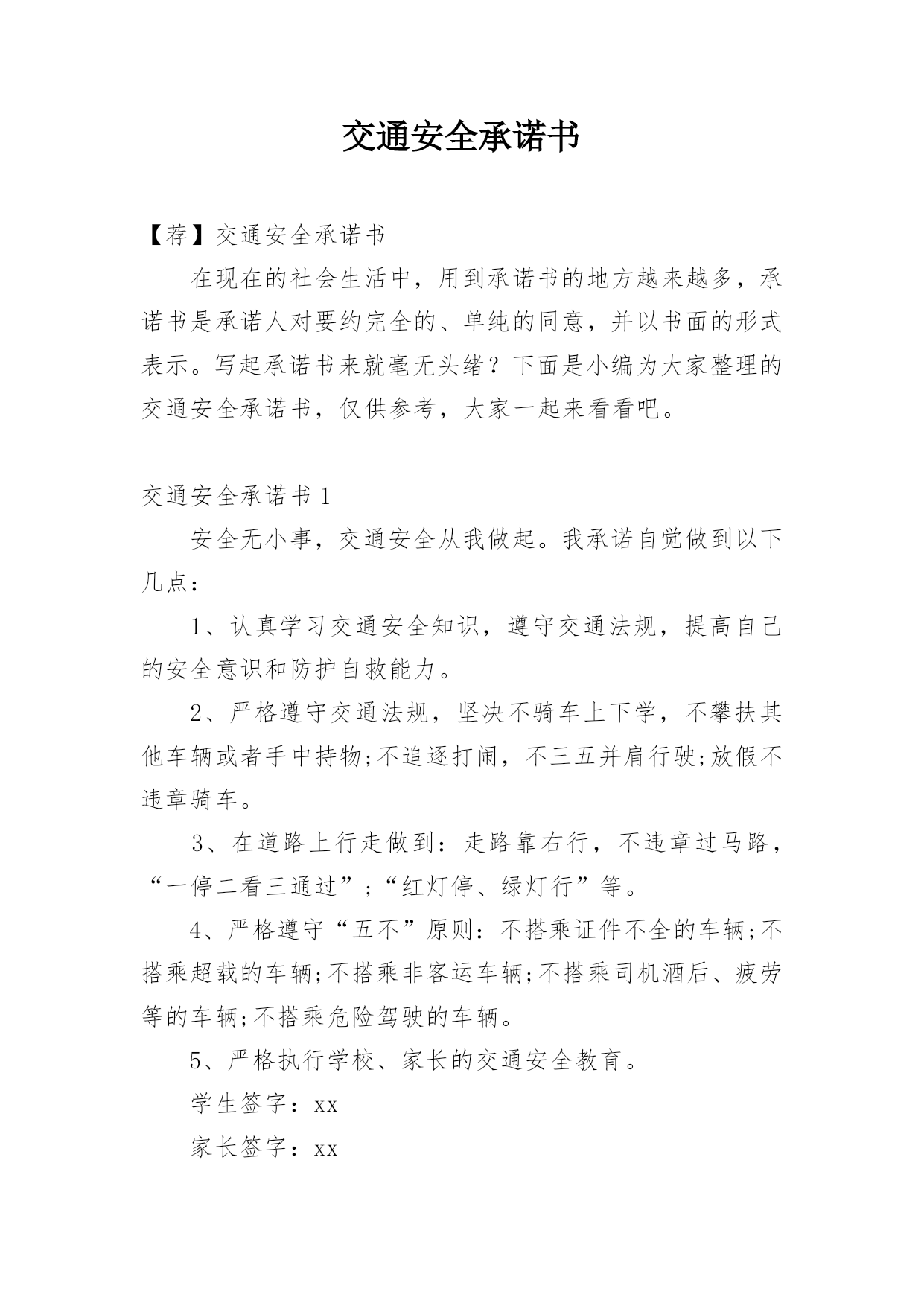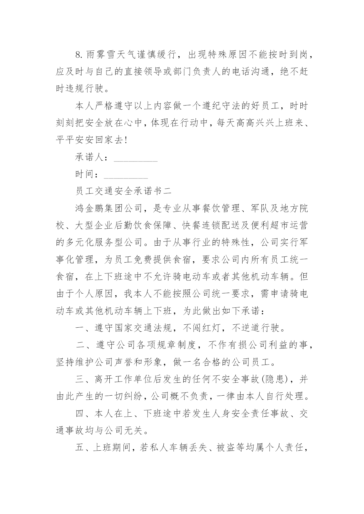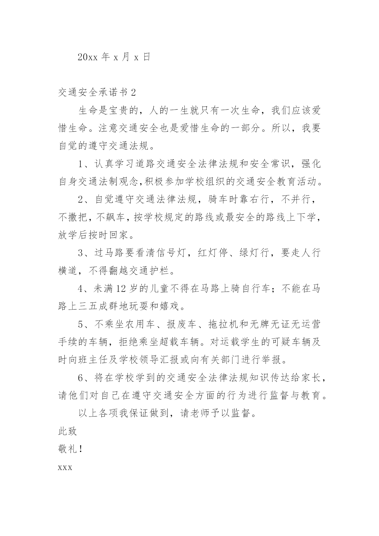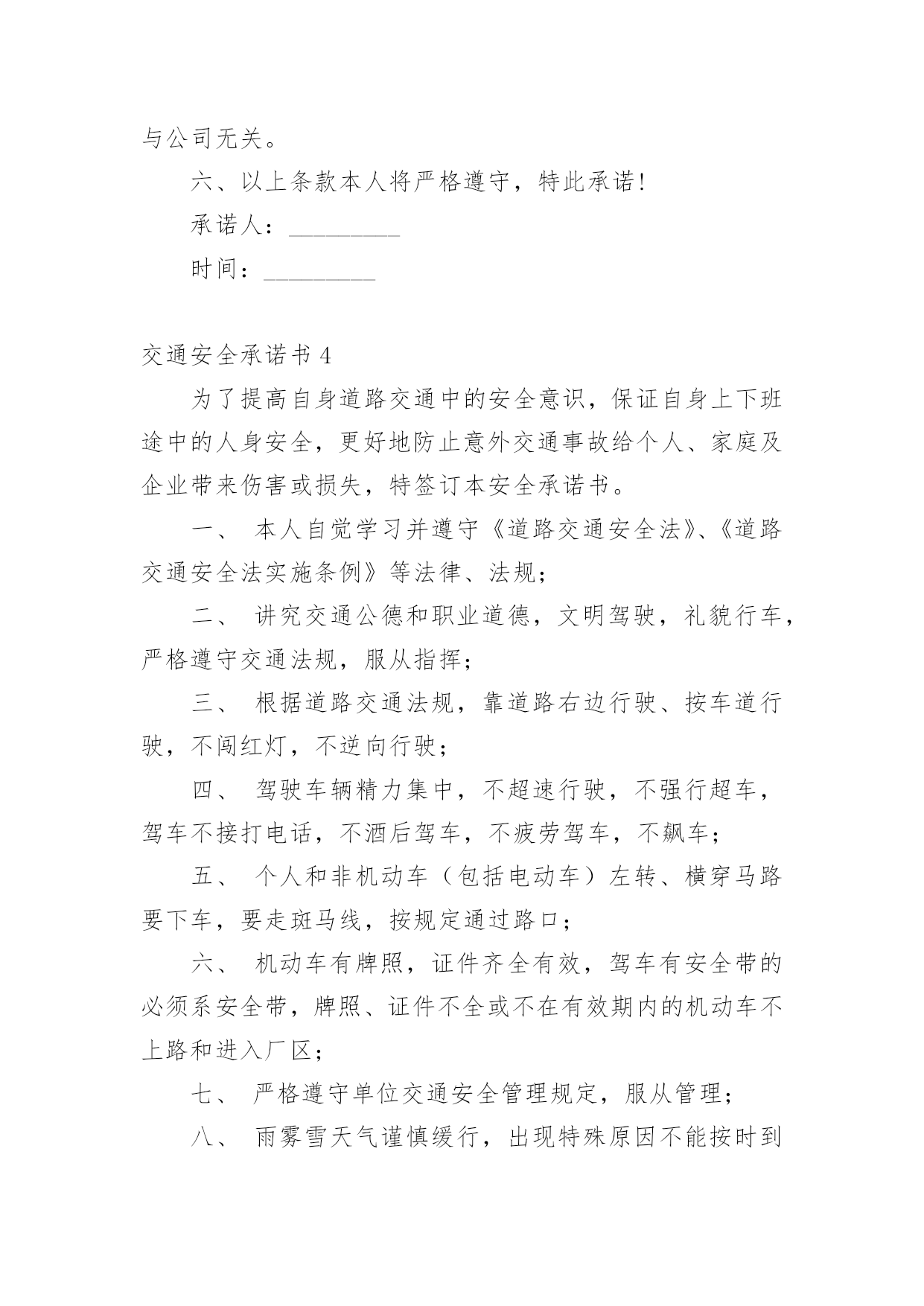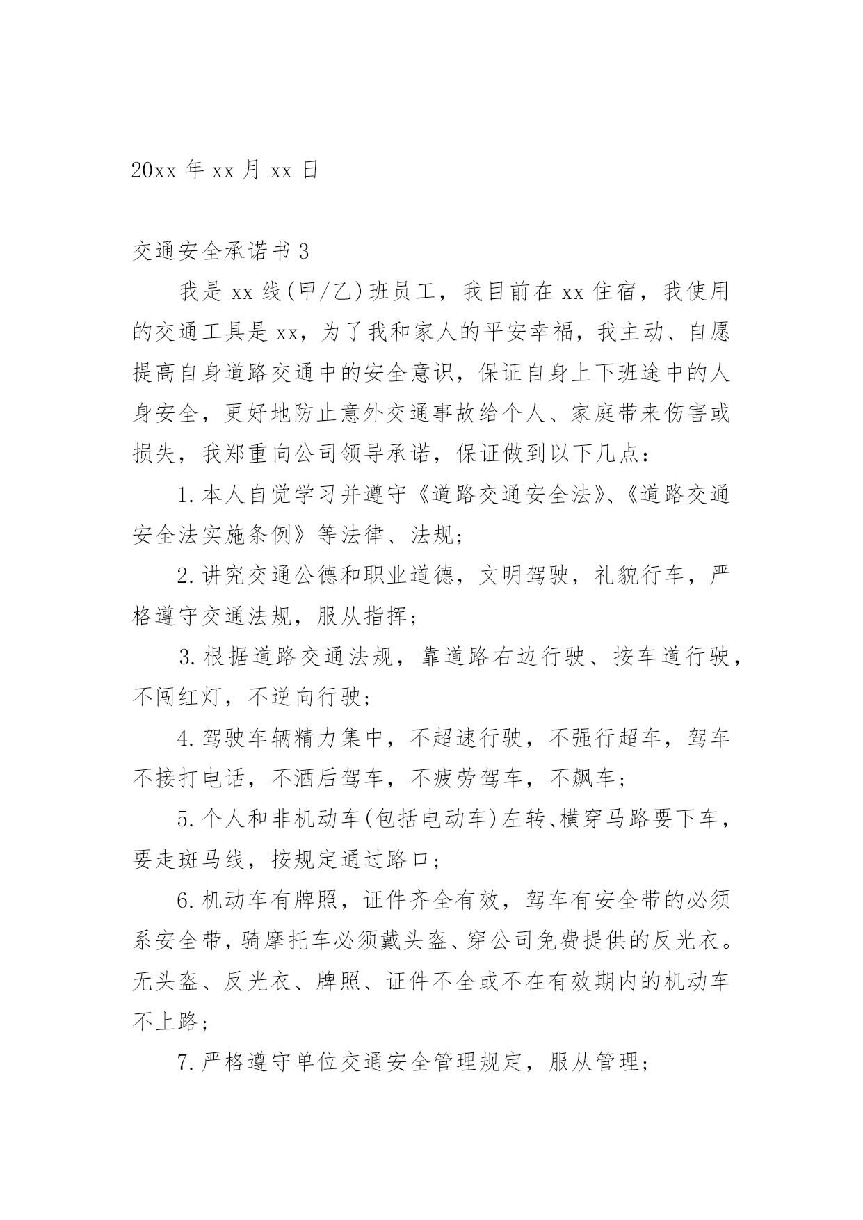 交通安全承诺书【荐】交通安全承诺书在现在的社会生活中,用到承诺书的地方越来越多,承诺书是承诺人对要约完全的、单纯的同意,并以书面的形式表示。写起承诺书来就毫无头绪?下面是小编为大家整理的交通安全承诺书,仅供参考,大家一起来看看吧。交通安全承诺书1安全无小事,交通安全从我做起。我承诺自觉做到以下几点:1、认真学习交通安全知识,遵守交通法规,提高自己的安全意识和防护自救能力。2、严格遵守交通法规,坚决不骑车上下学,不攀扶其他车辆或者手中持物;不追逐打闹,不三五并肩行驶;放假不违章骑车。3、在道路上行走做到:走路靠右行,不违章过马路,“一停二看三通过”;“红灯停、绿灯行”等。4、严格遵守“五不”原则:不搭乘证件不全的车辆;不搭乘超载的车辆;不搭乘非客运车辆;不搭乘司机酒后、疲劳等的车辆;不搭乘危险驾驶的车辆。5、严格执行学校、家长的交通安全教育。学生签字:xx家长签字:xx20xx年x月x日交通安全承诺书2生命是宝贵的,人的一生就只有一次生命,我们应该爱惜生命。注意交通安全也是爱惜生命的一部分。所以,我要自觉的遵守交通法规。1、认真学习道路交通安全法律法规和安全常识,强化自身交通法制观念,积极参加学校组织的交通安全教育活动。2、自觉遵守交通法律法规,骑车时靠右行,不并行,不撒把,不飙车,按学校规定的路线或最安全的路线上下学,放学后按时回家。3、过马路要看清信号灯,红灯停、绿灯行,要走人行横道,不得翻越交通护栏。4、未满12岁的儿童不得在马路上骑自行车;不能在马路上三五成群地玩耍和嬉戏。5、不乘坐农用车、报废车、拖拉机和无牌无证无运营手续的车辆,拒绝乘坐超载车辆。对运载学生的可疑车辆及时向班主任及学校领导汇报或向有关部门进行举报。6、将在学校学到的交通安全法律法规知识传达给家长,请他们对自己在遵守交通安全方面的行为进行监督与教育。以上各项我保证做到,请老师予以监督。此致敬礼!xxx20xx年xx月xx日交通安全承诺书3我是xx线(甲/乙)班员工,我目前在xx住宿,我使用的交通工具是xx,为了我和家人的平安幸福,我主动、自愿提高自身道路交通中的安全意识,保证自身上下班途中的人身安全,更好地防止意外交通事故给个人、家庭带来伤害或损失,我郑重向公司领导承诺,保证做到以下几点:1.本人自觉学习并遵守《道路交通安全法》、《道路交通安全法实施条例》等法律、法规;2.讲究交通公德和职业道德,文明驾驶,礼貌行车,严格遵守交通法规,服从指挥;3.根据道路交通法规,靠道路右边行驶、按车道行驶,不闯红灯,不逆向行驶;4.驾驶车辆精力集中,不超速行驶,不强行超车,驾车不接打电话,不酒后驾车,不疲劳驾车,不飙车;5.个人和非机动车(包括电动车)左转、横穿马路要下车,要走斑马线,按规定通过路口;6.机动车有牌照,证件齐全有效,驾车有安全带的必须系安全带,骑摩托车必须戴头盔、穿公司免费提供的反光衣。无头盔、反光衣、牌照、证件不全或不在有效期内的机动车不上路;7.严格遵守单位交通安全管理规定,服从管理;8.雨雾雪天气谨慎缓行,出现特殊原因不能按时到岗,应及时与自己的直接领导或部门负责人的电话沟通,绝不赶时违规行驶。本人严格遵守以上内容做一个遵纪守法的好员工,时时刻刻把安全放在心中,体现在行动中,每天高高兴兴上班来、平平安安回家去!承诺人:_________时间:_________员工交通安全承诺书二鸿金鹏集团公司,是专业从事餐饮管理、军队及地方院校、大型企业后勤饮食保障、快餐连锁配送及便利超市运营的多元化服务型公司。由于从事行业的特殊性,公司实行军事化管理,为员工免费提供食宿,要求公司内所有员工统一食宿,在上下班途中不允许骑电动车或者其他机动车辆。但由于个人原因,我本人不能按照公司统一要求,需申请骑电动车或其他机动车辆上下班,为此做出如下承诺:一、遵守国家交通法规,不闯红灯,不逆道行驶。二、遵守公司各项规章制度,不作有损公司利益的事,坚持维护公司声誉和形象,做一名合格的公司员工。三、离开工作单位后发生的任何不安全事故(隐患),并由此产生的一切纠纷,公司概不负责,一律由本人自行处理。四、本人在上、下班途中若发生人身安全责任事故、交通事故均与公司无关。五、上班期间,若私人车辆丢失、被盗等均属个人责任,与公司无关。六、以上条款本人将严格遵守,特此承诺!承诺人:_________时间:_________交通安全承诺书4为了提高自身道路交通中的安全意识,保证自身上下班途中的人身安全,更好地防止意外交通事故给个人、家庭及企业带来伤害或损失,特签订本安全承诺书。一、本人自觉学习并遵守《道路交通安全法》、《道路交通安全法实施条例》等法律、法规;二、讲究交通公德和职业道德,文明驾驶,礼貌行车,严格遵守交通法规,服从指挥;三、根据道路交通法规,靠道路右边行驶、按车道行驶,不闯红灯,
