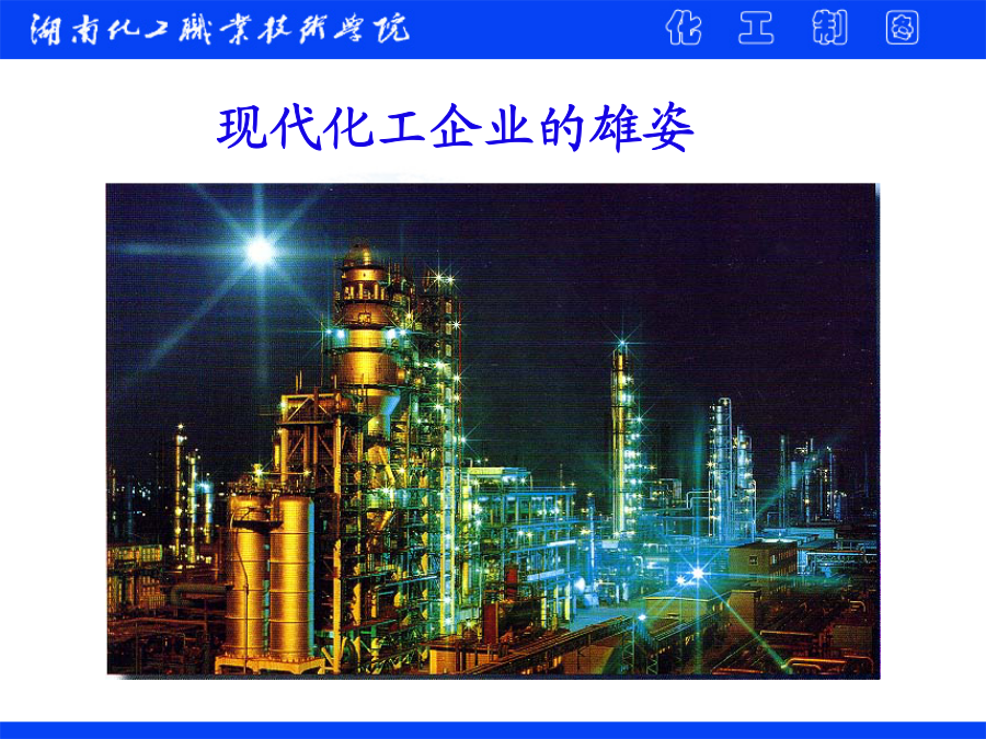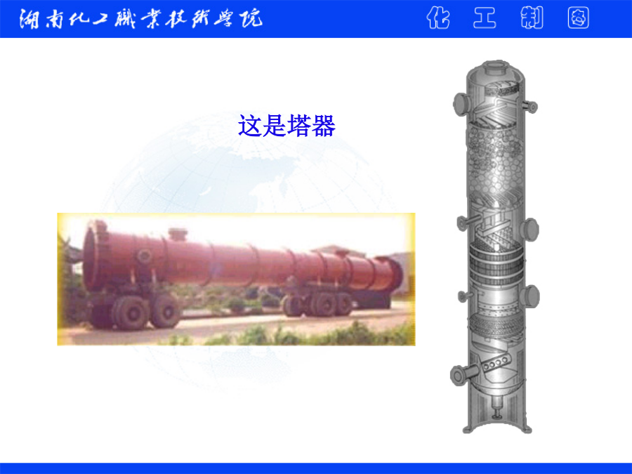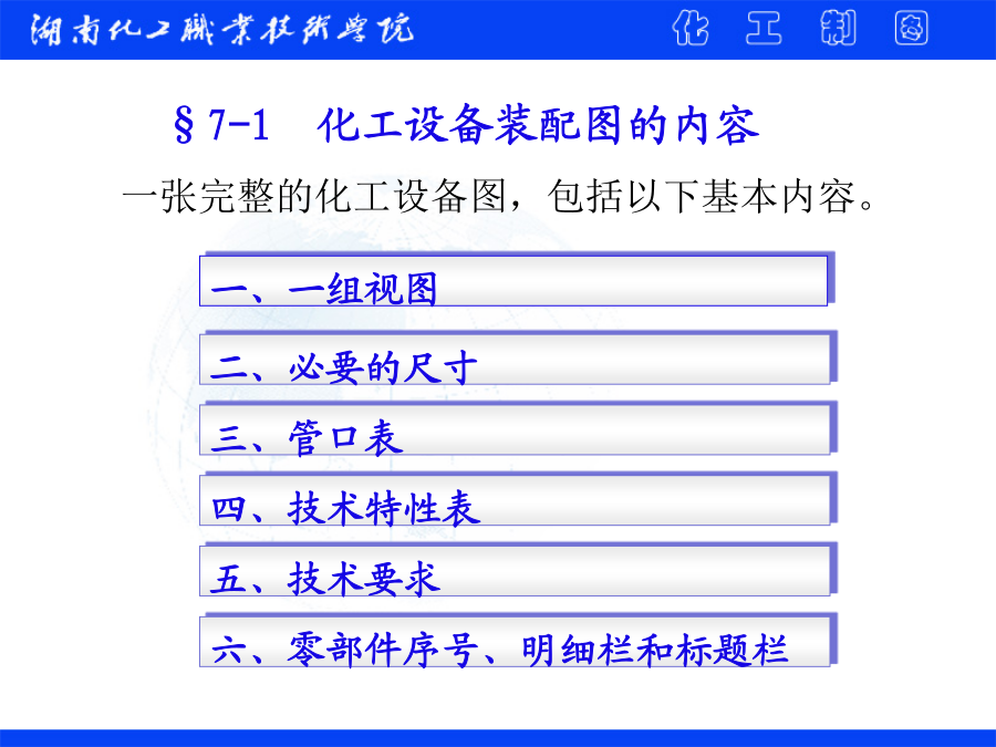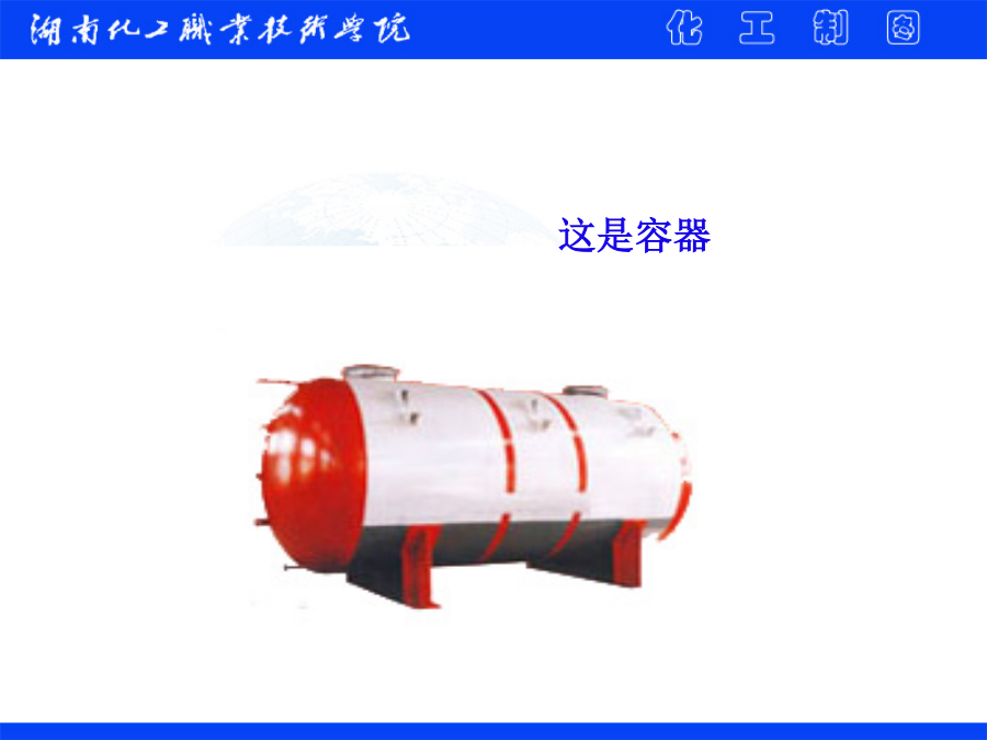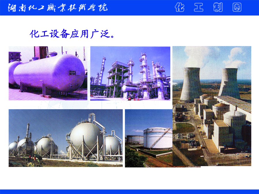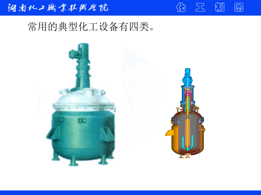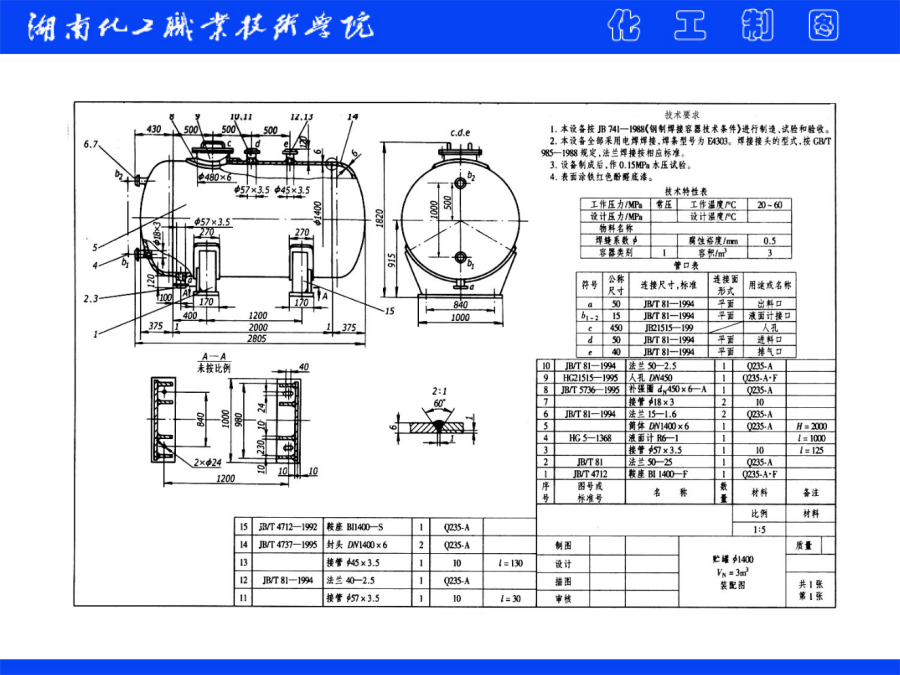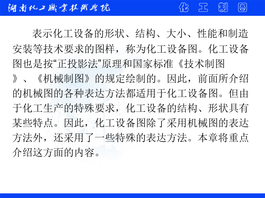 化工设备是化工生产的重要技术装备。现代化工企业的雄姿化工设备应用广泛。常用的典型化工设备有四类。这是塔器这是容器表示化工设备的形状、结构、大小、性能和制造安装等技术要求的图样,称为化工设备图。化工设备图也是按“正投影法”原理和国家标准《技术制图》、《机械制图》的规定绘制的。因此,前面所介绍的机械图的各种表达方法都适用于化工设备图。但由于化工生产的特殊要求,化工设备的结构、形状具有某些特点。因此,化工设备图除了采用机械图的表达方法外,还采用了一些特殊的表达方法。本章将重点介绍这方面的内容。§7-1化工设备装配图的内容一、一组视图二、必要的尺寸化工设备图主要用来表达设备的工作原理、各零部件间的装配关系。因此,化工设备图主要包括以下几类尺寸:(1)特性尺寸(2)装配尺寸(3)安装尺寸(4)外形(总体)尺寸(5)其他尺寸(1)特性尺寸反映化工设备的主要性能、规格的尺寸,如前图中的筒体内径φ1400、筒体长度2000等。(2)装配尺寸表示零部件之间装配关系和相对位置的尺寸,如前图中500表明人孔与进料口的相对位置。(3)安装尺寸表明设备安装在基础上或其他支架上所需的尺寸,如图中的1200、840等。(4)外形(总体)尺寸表示设备总长、总高、总宽(或外径)的尺寸,以确定该设备所占的空间。如容器的总长2807、总高1820、总宽(筒体的外径)1412。(5)其他尺寸一般包括标准零部件的规格尺寸(如图中人孔的规格尺寸φ480×6),经设计计算确定的重要尺寸(如筒体壁厚6),焊缝结构形式尺寸以及不另行绘图的零件的有关尺寸。2、尺寸基准化工设备常用尺寸基准(2)几种典型结构的尺寸注法3)接管标注管口内径和壁厚;接管为无缝钢管时,则标注“外径×壁厚”。在化工设备图中,由于零件的制造精度不高,故允许在图上将同方向(轴向)的尺寸注成封闭形式,对于某些总长(或总高)或次要尺寸,通常将这些尺寸数字加注圆括号“()”或在数字前加“≈”,以示参考之意。三、管口表四、技术特性表技术特性表是表明设备的主要技术特性的一种表格,一般安排在管口表的上方。其格式有两种,分别适用于不同类型的设备,如下图所示。技术特性表的内容包括:工作压力、工作温度、设计压力、设计温度、物料名称等。对于不同类型的设备,需增加相关内容。如容器类,增加全容积(m3);反应器类,增加全容积和搅拌转速等;换热器类,则增加换热面积等;塔器类,则增加基本风压与地震烈度等内容。五、技术要求技术要求通常包括以下几方面的内容:1、通用技术条件通用技术条件是同类化工设备在制造、装配、检验等诸方面的技术规范,已形成标准,在技术条件中,可直接引用。2、焊接要求焊接工艺在化工设备制造中应用广泛。在技术要求中,通常对焊接方法、焊条、焊剂等提出要求。3、设备的检验一般对主体设备进行水压和气密性试验,对焊缝进行探伤等。4、其他要求设备在机械加工、装配、油漆、保温、防腐、运输、安装等方面的要求。§7-2化工设备装配图的表达方法一、化工设备的基本结构及其特点2、化工设备的结构特点(2)尺寸相差悬殊设备的总体尺寸与某些局部结构(如壁厚、管口等)尺寸,往往相差很悬殊。如下图所示容器的总长为“2085”,直径为“1400”,但筒体壁厚只有“6”。(3)壳体上有较多的开孔和接管口(4)大量采用焊接结构(5)广泛采用标准化零部件二、化工设备装配图的表达特点1、多次旋转的表达方法右图人孔是按逆时针方向(从俯视图看)假想旋转45°之后,在主视图上画出其投影图的,液面计则是按顺时针方向旋转45°后,在主视图上画出的。采用多次旋转的表达方法时,一般不作标注。但这些结构的周向方位以管口方位图(或俯、左视图)为准。2、管口方位的表达方法3、局部结构的表示方法4、夸大的表达方法5、断开和分段(层)的表达方法断开和分段(层)的表达方法(续)6、化工设备图中的简化画法(2)管法兰的简化画法(3)重复结构的简化画法2)填充物的表示法3)管束的表示法4)标准零部件和外购零部件的简化画法5)液面计的简化画法7、设备整体的示意画法§7-3化工设备装配图中焊接的表示法一、焊接方法与焊缝型式构件焊接后形成的结合部分称为焊缝。按构件连接部分相对位置的不同,焊缝的接头有对接、搭接、角接和T型接等型式。二、焊缝的规定画法对常压、低压设备,在剖视图上的焊缝,按焊接接头的型式画出焊缝的剖面,剖面符号用涂黑表示;视图中的焊缝,可省略不画,对于中、高压设备或其他设备上某些重要的焊缝,则需用局部放大图,详细地表示出焊缝结构的形状和有关尺寸。三、焊缝符号表示法补充符号——说明焊缝某些特征而采用的符号,焊缝没有这些特征时,不加注此符号。焊缝尺寸符号是用字母代表对焊缝的尺寸要求,当需要注明焊缝尺寸时才标注。四、焊缝的标注2、焊缝的标注方