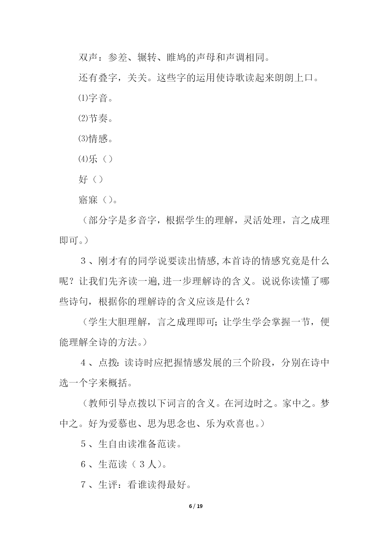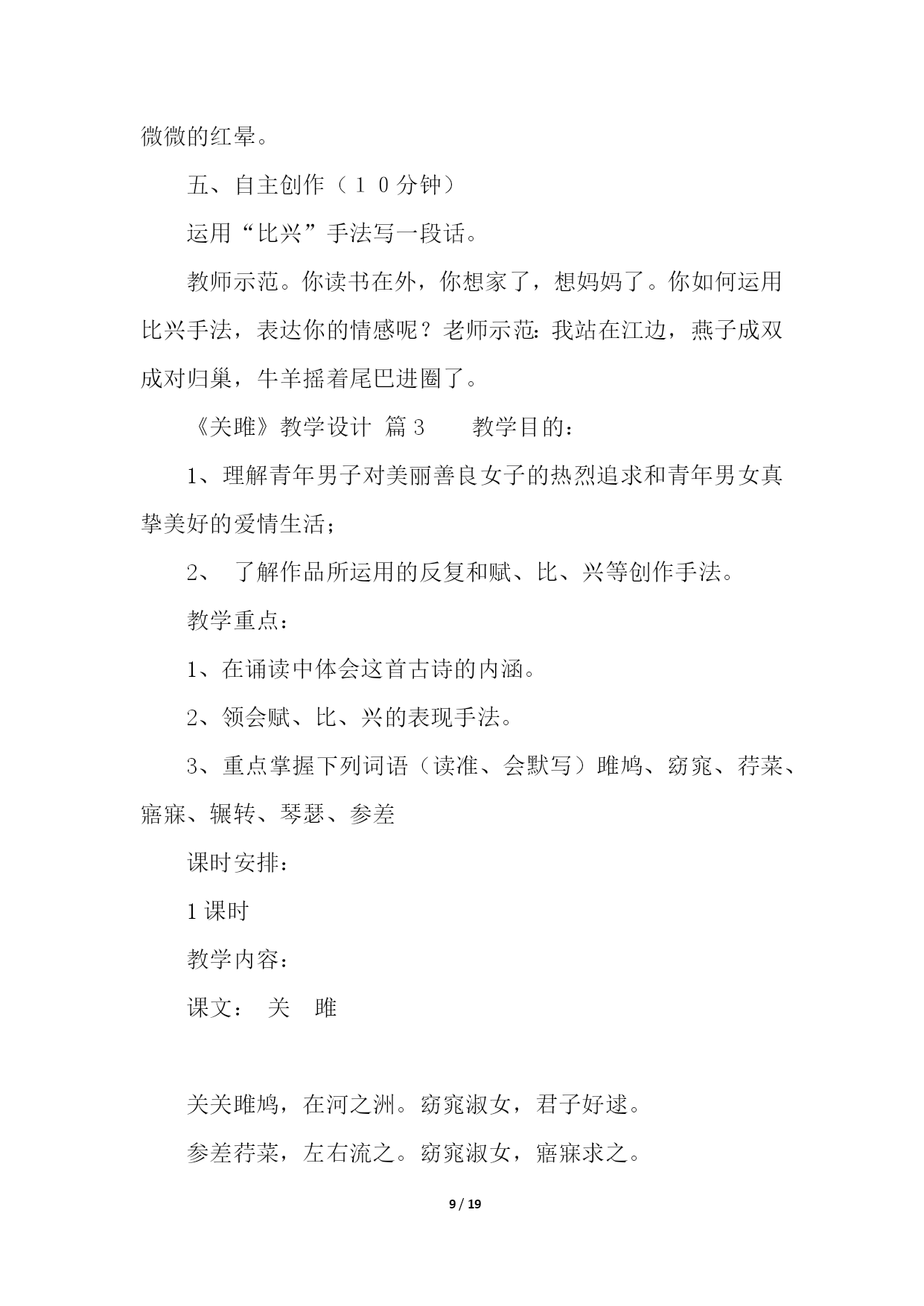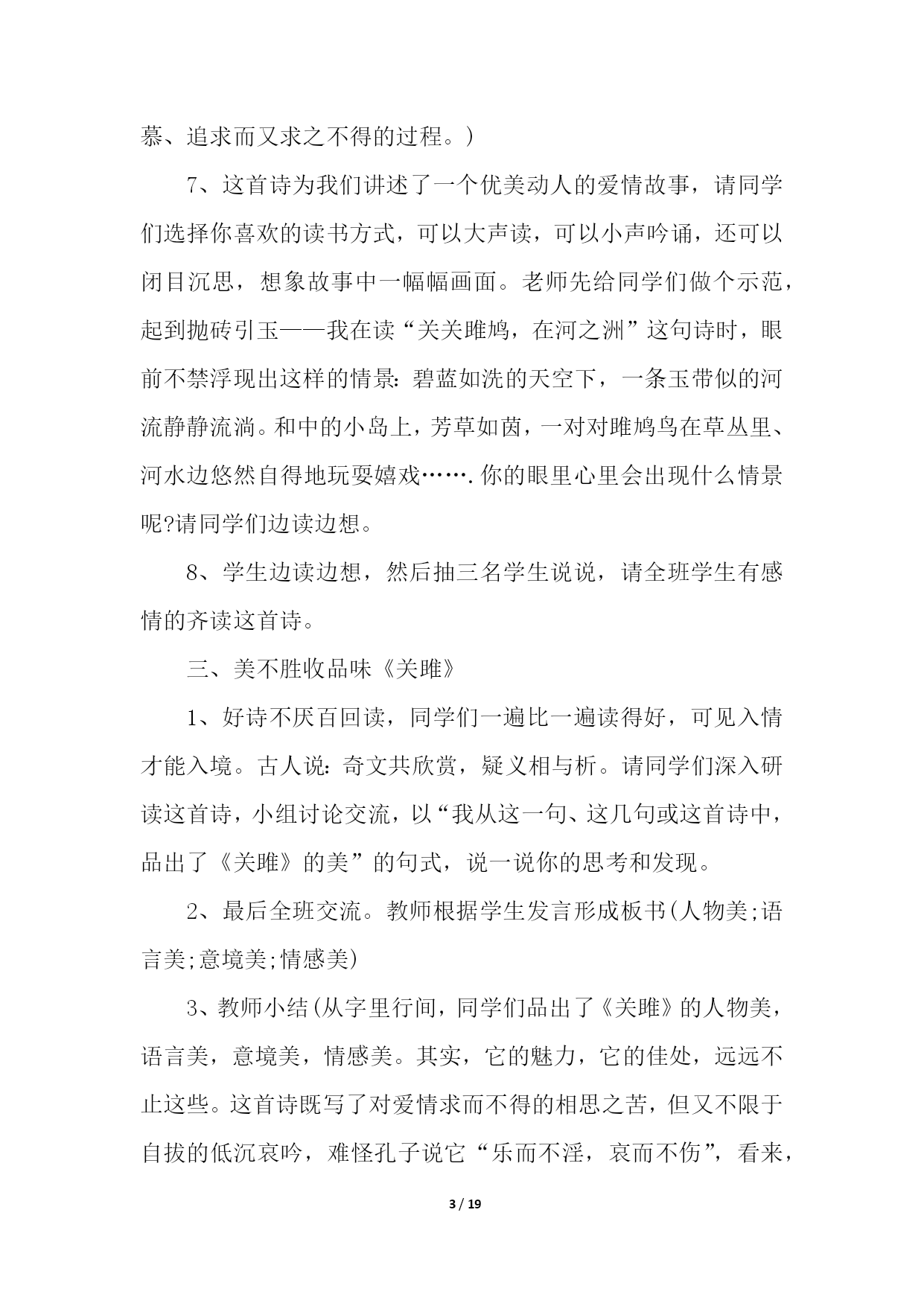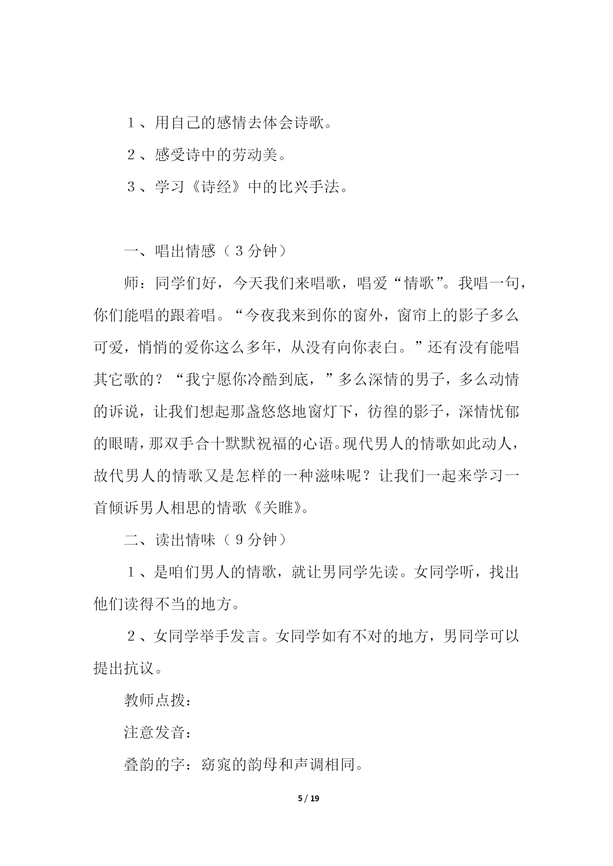 PAGE19/NUMPAGES19《关雎》教学设计《关雎》教学设计篇1教学内容知识与能力1、初步了解诗经2、了解比兴手法3、体会作品表达的思想感情。过程与方法1、反复朗读;感知诗歌大意2、采用提问质疑共同讨论等方法分析关键句子,理解意境。3、朗读背诵,积累名句。情感态度价值观正确认识古代劳动人民对美好爱情生活的追求和向往。教学重点:朗读背诵教学难点:1、对每句诗的理解2、体会整首诗表达的思想感情教具准备课件及音频资料教学课时:二课时教学过程一、激趣导入,资料共享今天我给大家带来一幅画,请同学们先欣赏欣赏(屏显画面):一对呱呱鸣叫的水鸟欢乐地嬉戏在青青河洲,长长短短的碧绿水草随水漂流,看到这幅画,你会想到什么呢?(学生自由发言)想像很丰富,那么同学们知道三千年前的人们又是怎样联想的呢?今天,让我们一起走进《诗经》,聆听三千年前华夏先民的吟唱,感受公元前东方的文明与辉煌。未读《诗经》,先闻其名,《诗经》究竟是怎样一部书,哪位同学为我们介绍介绍?(学生介绍)善于查阅资料,好。《诗经》是诗歌的源头,读者《诗经》,你会觉得不如了浪漫的殿堂。那么,大家知道冠于《诗经》三百篇之首的是哪一首吗?(生答)这节课,我们一起来学习《关雎》。二、一唱三叹吟诵《关雎》1、教师质问(学习诗歌的方法、朗读注意问题)2、请学生大声自由朗读课文,对照注释,读准字音、节奏。(老师板书课题)3、抽一名学生读,评价。4、齐读一遍,读准字音和节奏。5、师读,请同学们边听边思考,这首诗写了什么内容?试用简洁语言概括(或播放录音)6、一生说说内容。(这首诗写了一个青年男子对一女子的爱慕、追求而又求之不得的过程。)7、这首诗为我们讲述了一个优美动人的爱情故事,请同学们选择你喜欢的读书方式,可以大声读,可以小声吟诵,还可以闭目沉思,想象故事中一幅幅画面。老师先给同学们做个示范,起到抛砖引玉——我在读“关关雎鸠,在河之洲”这句诗时,眼前不禁浮现出这样的情景:碧蓝如洗的天空下,一条玉带似的河流静静流淌。和中的小岛上,芳草如茵,一对对雎鸠鸟在草丛里、河水边悠然自得地玩耍嬉戏…….你的眼里心里会出现什么情景呢?请同学们边读边想。8、学生边读边想,然后抽三名学生说说,请全班学生有感情的齐读这首诗。三、美不胜收品味《关雎》1、好诗不厌百回读,同学们一遍比一遍读得好,可见入情才能入境。古人说:奇文共欣赏,疑义相与析。请同学们深入研读这首诗,小组讨论交流,以“我从这一句、这几句或这首诗中,品出了《关雎》的美”的句式,说一说你的思考和发现。2、最后全班交流。教师根据学生发言形成板书(人物美;语言美;意境美;情感美)3、教师小结(从字里行间,同学们品出了《关雎》的人物美,语言美,意境美,情感美。其实,它的魅力,它的佳处,远远不止这些。这首诗既写了对爱情求而不得的相思之苦,但又不限于自拔的低沉哀吟,难怪孔子说它“乐而不淫,哀而不伤”,看来,被冠于《诗经》之首的《关雎》的确名不虚传。四、诗趣盎然美读《关雎》美诗若美读,定能锦上添花,别有意趣。现在,分男女生两大组配乐朗读《关雎》,比一比,看哪一组的朗读技高一筹。1、男生配乐读,女生配乐读。2、教师点评。3、师生共同演绎《关雎》之美。(师领读前四句,全班齐读前四句,第五句开始男生先读,女生后读,形成一种错落之美,最后两句诗男生读两遍,和女生的朗读合在一起。师轻声朗读前四句。)4、美诗可美读,美诗也可以和乐而歌唱,因为诗歌本是可以和乐而歌的。同学们想不想听今人谱曲的《关雎》。现在,让我们和着音乐,一起深情吟唱这首传诵千古、经典古朴的爱情歌谣。(课件播放歌曲《关雎》,师生齐唱。)结束语《诗经》是人类文明的春天,是初生天地的源头活水,开阔、丰盈、简单、洁净。课后,让我们进一步聆听华夏先民的吟唱,吟诵优美文字,传唱古老歌谣,进一步感受我国古代文明之辉煌。《关雎》教学设计篇2本诗是《诗经》的首篇,运用“比兴”和反复咏叹的手法表达思想感情,给人留下广阔的想象空间。本诗还注重音韵和谐,是训练朗读的好材料。1、用自己的感情去体会诗歌。2、感受诗中的劳动美。3、学习《诗经》中的比兴手法。一、唱出情感(3分钟)师:同学们好,今天我们来唱歌,唱爱“情歌”。我唱一句,你们能唱的跟着唱。“今夜我来到你的窗外,窗帘上的影子多么可爱,悄悄的爱你这么多年,从没有向你表白。”还有没有能唱其它歌的?“我宁愿你冷酷到底,”多么深情的男子,多么动情的诉说,让我们想起那盏悠悠地窗灯下,彷徨的影子,深情忧郁的眼晴,那双手合十默默祝福的心语。现代男人的情歌如此动人,故代男人的情歌又是怎样的一种滋味呢?让我们一起来学习一首倾诉男人相思的情歌《关睢》。二、读出情味(9分钟)1、是咱们男人的情歌,就让男同学先读。女同学听,找出他们读得不当的地方。2、女同学举手发言。女同学如有不对的地
