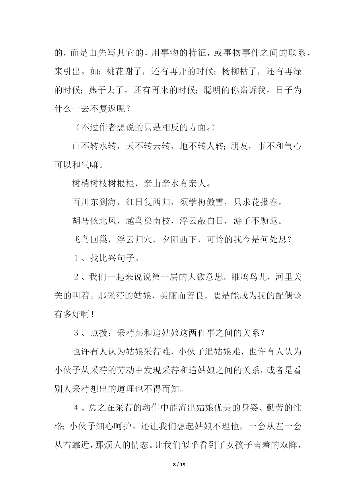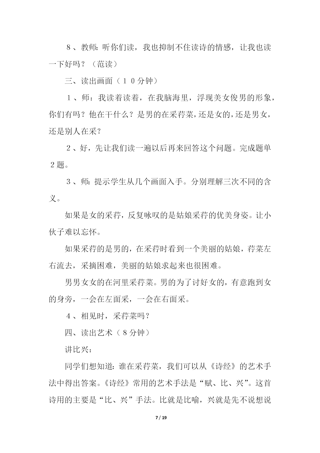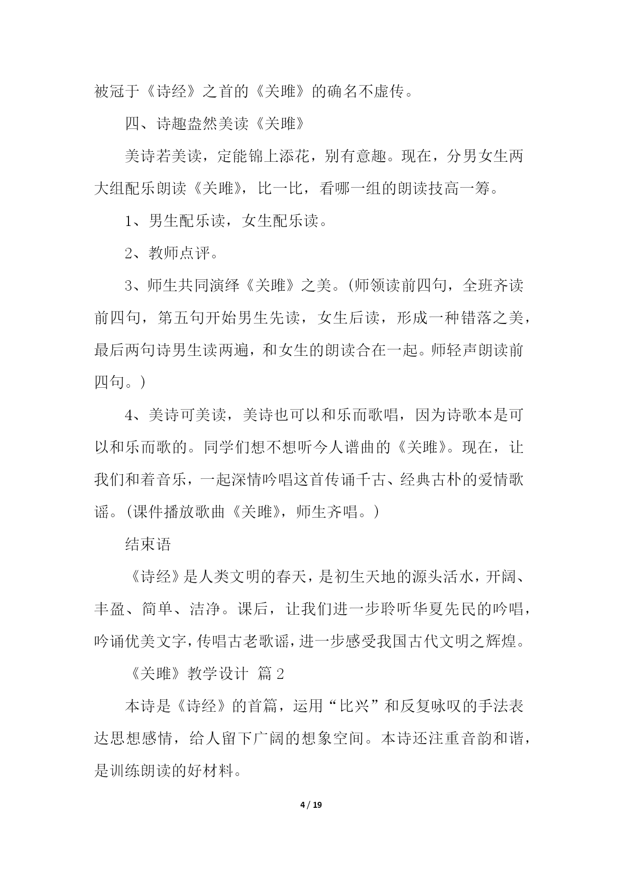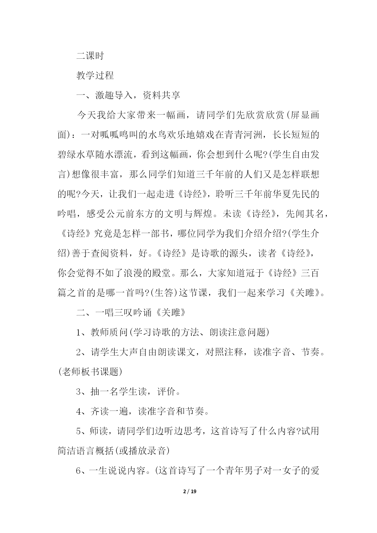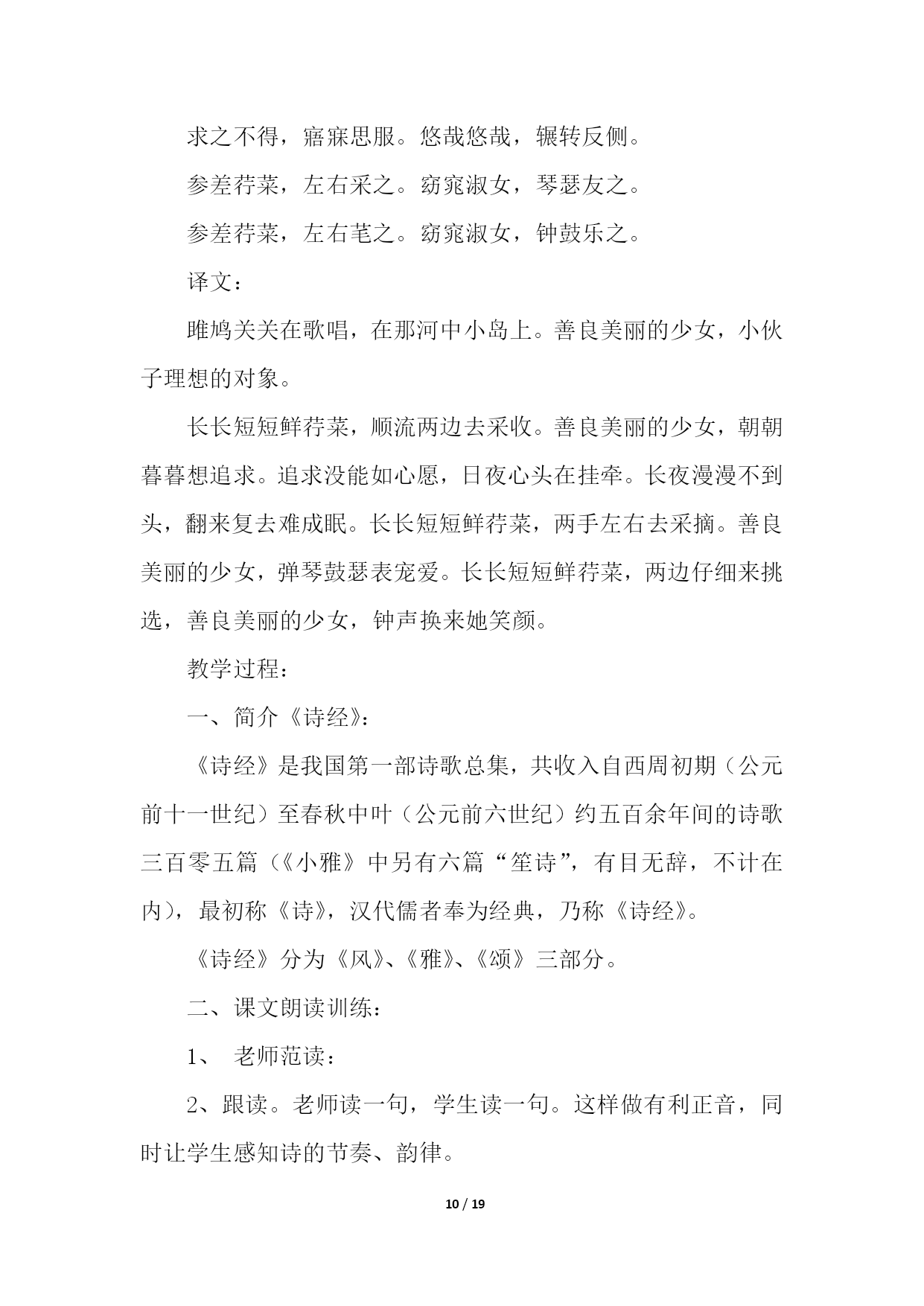 PAGE19/NUMPAGES19《关雎》教学设计《关雎》教学设计篇1教学内容知识与能力1、初步了解诗经2、了解比兴手法3、体会作品表达的思想感情。过程与方法1、反复朗读;感知诗歌大意2、采用提问质疑共同讨论等方法分析关键句子,理解意境。3、朗读背诵,积累名句。情感态度价值观正确认识古代劳动人民对美好爱情生活的追求和向往。教学重点:朗读背诵教学难点:1、对每句诗的理解2、体会整首诗表达的思想感情教具准备课件及音频资料教学课时:二课时教学过程一、激趣导入,资料共享今天我给大家带来一幅画,请同学们先欣赏欣赏(屏显画面):一对呱呱鸣叫的水鸟欢乐地嬉戏在青青河洲,长长短短的碧绿水草随水漂流,看到这幅画,你会想到什么呢?(学生自由发言)想像很丰富,那么同学们知道三千年前的人们又是怎样联想的呢?今天,让我们一起走进《诗经》,聆听三千年前华夏先民的吟唱,感受公元前东方的文明与辉煌。未读《诗经》,先闻其名,《诗经》究竟是怎样一部书,哪位同学为我们介绍介绍?(学生介绍)善于查阅资料,好。《诗经》是诗歌的源头,读者《诗经》,你会觉得不如了浪漫的殿堂。那么,大家知道冠于《诗经》三百篇之首的是哪一首吗?(生答)这节课,我们一起来学习《关雎》。二、一唱三叹吟诵《关雎》1、教师质问(学习诗歌的方法、朗读注意问题)2、请学生大声自由朗读课文,对照注释,读准字音、节奏。(老师板书课题)3、抽一名学生读,评价。4、齐读一遍,读准字音和节奏。5、师读,请同学们边听边思考,这首诗写了什么内容?试用简洁语言概括(或播放录音)6、一生说说内容。(这首诗写了一个青年男子对一女子的爱慕、追求而又求之不得的过程。)7、这首诗为我们讲述了一个优美动人的爱情故事,请同学们选择你喜欢的读书方式,可以大声读,可以小声吟诵,还可以闭目沉思,想象故事中一幅幅画面。老师先给同学们做个示范,起到抛砖引玉——我在读“关关雎鸠,在河之洲”这句诗时,眼前不禁浮现出这样的情景:碧蓝如洗的天空下,一条玉带似的河流静静流淌。和中的小岛上,芳草如茵,一对对雎鸠鸟在草丛里、河水边悠然自得地玩耍嬉戏…….你的眼里心里会出现什么情景呢?请同学们边读边想。8、学生边读边想,然后抽三名学生说说,请全班学生有感情的齐读这首诗。三、美不胜收品味《关雎》1、好诗不厌百回读,同学们一遍比一遍读得好,可见入情才能入境。古人说:奇文共欣赏,疑义相与析。请同学们深入研读这首诗,小组讨论交流,以“我从这一句、这几句或这首诗中,品出了《关雎》的美”的句式,说一说你的思考和发现。2、最后全班交流。教师根据学生发言形成板书(人物美;语言美;意境美;情感美)3、教师小结(从字里行间,同学们品出了《关雎》的人物美,语言美,意境美,情感美。其实,它的魅力,它的佳处,远远不止这些。这首诗既写了对爱情求而不得的相思之苦,但又不限于自拔的低沉哀吟,难怪孔子说它“乐而不淫,哀而不伤”,看来,被冠于《诗经》之首的《关雎》的确名不虚传。四、诗趣盎然美读《关雎》美诗若美读,定能锦上添花,别有意趣。现在,分男女生两大组配乐朗读《关雎》,比一比,看哪一组的朗读技高一筹。1、男生配乐读,女生配乐读。2、教师点评。3、师生共同演绎《关雎》之美。(师领读前四句,全班齐读前四句,第五句开始男生先读,女生后读,形成一种错落之美,最后两句诗男生读两遍,和女生的朗读合在一起。师轻声朗读前四句。)4、美诗可美读,美诗也可以和乐而歌唱,因为诗歌本是可以和乐而歌的。同学们想不想听今人谱曲的《关雎》。现在,让我们和着音乐,一起深情吟唱这首传诵千古、经典古朴的爱情歌谣。(课件播放歌曲《关雎》,师生齐唱。)结束语《诗经》是人类文明的春天,是初生天地的源头活水,开阔、丰盈、简单、洁净。课后,让我们进一步聆听华夏先民的吟唱,吟诵优美文字,传唱古老歌谣,进一步感受我国古代文明之辉煌。《关雎》教学设计篇2本诗是《诗经》的首篇,运用“比兴”和反复咏叹的手法表达思想感情,给人留下广阔的想象空间。本诗还注重音韵和谐,是训练朗读的好材料。1、用自己的感情去体会诗歌。2、感受诗中的劳动美。3、学习《诗经》中的比兴手法。一、唱出情感(3分钟)师:同学们好,今天我们来唱歌,唱爱“情歌”。我唱一句,你们能唱的跟着唱。“今夜我来到你的窗外,窗帘上的影子多么可爱,悄悄的爱你这么多年,从没有向你表白。”还有没有能唱其它歌的?“我宁愿你冷酷到底,”多么深情的男子,多么动情的诉说,让我们想起那盏悠悠地窗灯下,彷徨的影子,深情忧郁的眼晴,那双手合十默默祝福的心语。现代男人的情歌如此动人,故代男人的情歌又是怎样的一种滋味呢?让我们一起来学习一首倾诉男人相思的情歌《关睢》。二、读出情味(9分钟)1、是咱们男人的情歌,就让男同学先读。女同学听,找出他们读得不当的地方。2、女同学举手发言。女同学如有不对的地