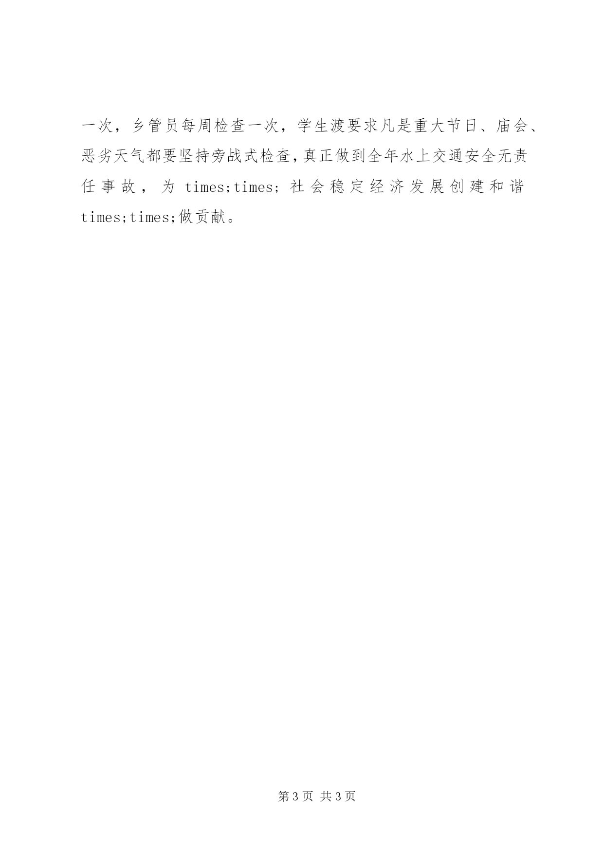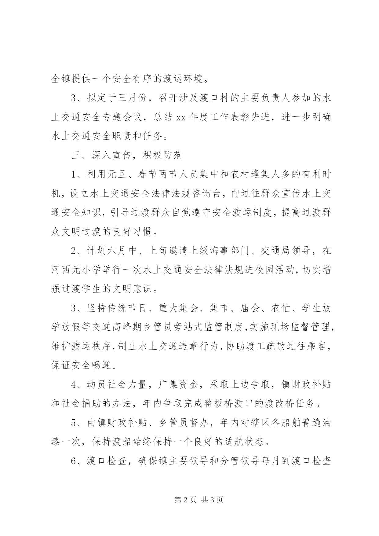 第PAGE\*Arabic\*MERGEFORMAT3页共NUMPAGES\*MERGEFORMAT3页水上交通安全工作计划为了加强内河交通安全管理,切实维护渡运安全秩序,保障人民群众生命、财产安全,严格执行省政府154号令和市、区政府关于加强水上交通安全管理的整体规划,结合我镇渡运安全实际情况,制定以下工作计划。一、指导思想以贯彻落实三个代表重要思想和科学发展观为根本,以全面执行各级政府制定的水上交通安全法规为载体,认真落实安全生产各项措施,深入宣传安全第一、预防为主、方便群众、依法管理的基本原则,真正做到强化管理,消除隐患,保障水上交通安全、有序、畅通,确保年内不发生水上交通安全责任事故。二、加强领导,健全网络1、每月召开一次水上交通领导成员、乡管员、涉及有渡口村的村书记及每渡口一名渡工参加的水上交通安全例会,意在摸清安全隐患及时总结本月水上交通安全经验。传达上级政府及主管部门补充制定或下达的新的工作任务,布置我镇安全渡运工作任务,逐时提出新的工作任务及管理方法。2、按照渡口座落位置,落实水上交通安全责任制,签定安全渡运责任书,并且依据所辖范围定期或不定期的组织水上交通安全领导小组全体成员,对辖区各渡口水上交通安全工作进行检查督促、排查事故及隐患,及时解决检查中发现的各种问题,为全镇提供一个安全有序的渡运环境。3、拟定于三月份,召开涉及渡口村的主要负责人参加的水上交通安全专题会议,总结xx年度工作表彰先进,进一步明确水上交通安全职责和任务。三、深入宣传,积极防范1、利用元旦、春节两节人员集中和农村逢集人多的有利时机,设立水上交通安全法律法规咨询台,向过往群众宣传水上交通安全知识,引导过渡群众自觉遵守安全渡运制度,提高过渡群众文明过渡的良好习惯。2、计划六月中、上旬邀请上级海事部门、交通局领导,在河西元小学举行一次水上交通安全法律法规进校园活动,切实增强过渡学生的文明意识。3、坚持传统节日、重大集会、集市、庙会、农忙、学生放学放假等交通高峰期乡管员旁站式监管制度,实施现场监督管理,维护渡运秩序,制止水上交通违章行为,协助渡工疏散过往乘客,保证安全畅通。4、动员社会力量,广集资金,采取上边争取,镇财政补贴和社会捐助的办法,年内争取完成蒋板桥渡口的渡改桥任务。5、由镇财政补贴、乡管员督办,年内对辖区各船舶普遍油漆一次,保持渡船始终保持一个良好的适航状态。6、渡口检查,确保镇主要领导和分管领导每月到渡口检查一次,乡管员每周检查一次,学生渡要求凡是重大节日、庙会、恶劣天气都要坚持旁战式检查,真正做到全年水上交通安全无责任事故,为times;times;社会稳定经济发展创建和谐times;times;做贡献。