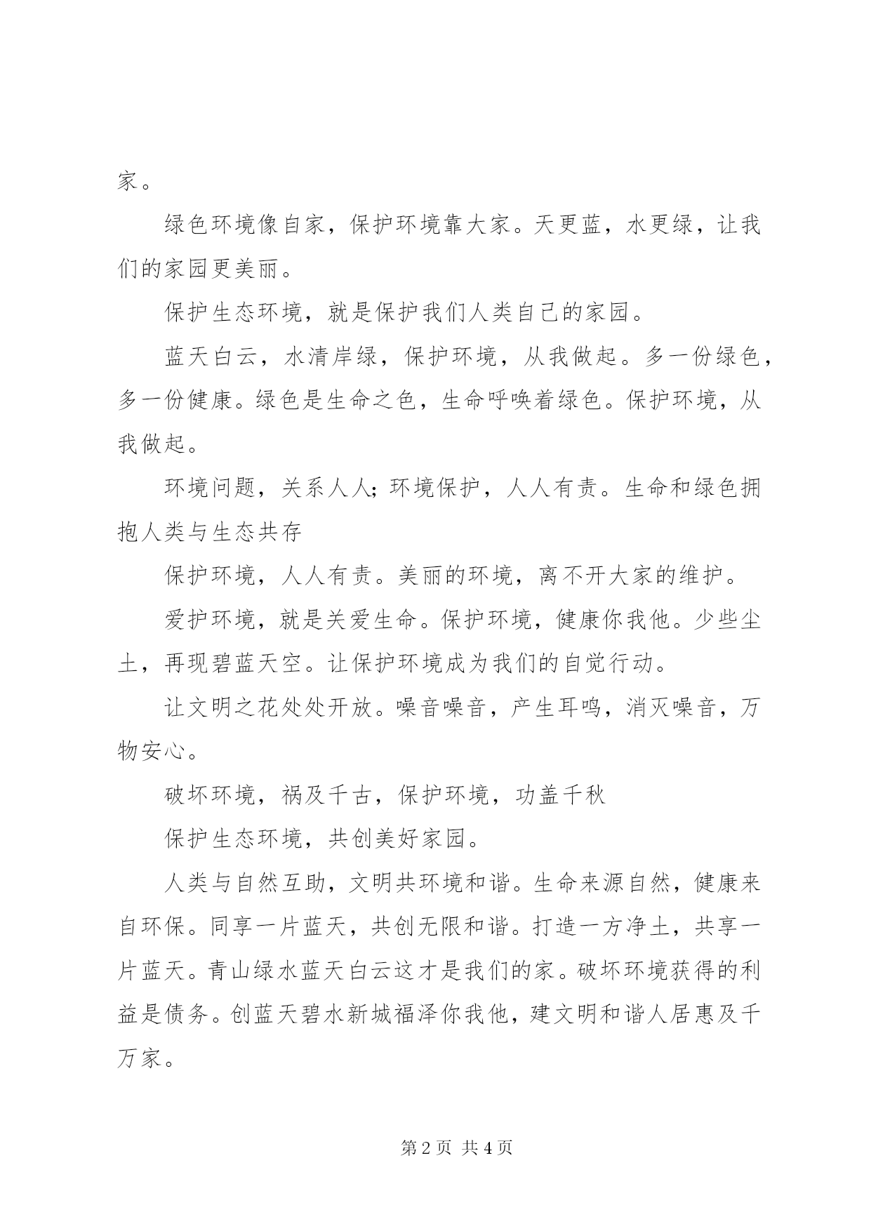 第PAGE\*Arabic\*MERGEFORMAT4页共NUMPAGES\*MERGEFORMAT4页环保道德宣传标语环保宣传标语人类与自然互助,文明共环境和谐。生命来源自然,健康来自环保。同享一片蓝天,共创无限和谐。打造一方净土,共享一片蓝天。青山绿水蓝天白云这才是我们的家。破坏环境获得的利益是债务。创蓝天碧水新城福泽你我他,建文明和谐人居惠及千万家。让环保扎根现在,用绿色昭示未来。把蓝天留给你我,让绿水环绕人间。实行清洁生产综合利用资源打造绿色竞争力绿色贵在保持,环保重在行动。打开蓝天的窗,扣开青山的门,走进环保世界,共享美丽人生。以法保护自然环境,以德创建社会文明。文明贵在一言一行,环保重在一点一滴。构建和谐社会大环境,倡导文明环保新气象。与绿色相约,与环保同行。让绿色走进家园,使生命远离污染。千方百计治理污染,齐心协力保护环境。手拉手,创造美好环境;心连心,构建和谐社会。加强污染防治工作,共同构建和谐淳安。保护环境就是保护人类自己。自然在身边,保护在心中。爱护大自然,建设美好家园。绿色,是自然之美,是心灵之声,是人类的依靠。关注环境,就是关注未来。环境保护你我他,蓝天碧水伴大家。绿色环境像自家,保护环境靠大家。天更蓝,水更绿,让我们的家园更美丽。保护生态环境,就是保护我们人类自己的家园。蓝天白云,水清岸绿,保护环境,从我做起。多一份绿色,多一份健康。绿色是生命之色,生命呼唤着绿色。保护环境,从我做起。环境问题,关系人人;环境保护,人人有责。生命和绿色拥抱人类与生态共存保护环境,人人有责。美丽的环境,离不开大家的维护。爱护环境,就是关爱生命。保护环境,健康你我他。少些尘土,再现碧蓝天空。让保护环境成为我们的自觉行动。让文明之花处处开放。噪音噪音,产生耳鸣,消灭噪音,万物安心。破坏环境,祸及千古,保护环境,功盖千秋保护生态环境,共创美好家园。人类与自然互助,文明共环境和谐。生命来源自然,健康来自环保。同享一片蓝天,共创无限和谐。打造一方净土,共享一片蓝天。青山绿水蓝天白云这才是我们的家。破坏环境获得的利益是债务。创蓝天碧水新城福泽你我他,建文明和谐人居惠及千万家。让环保扎根现在,用绿色昭示未来。把蓝天留给你我,让绿水环绕人间。实行清洁生产综合利用资源打造绿色竞争力绿色贵在保持,环保重在行动。打开蓝天的窗,扣开青山的门,走进环保世界,共享美丽人生。以法保护自然环境,以德创建社会文明。文明贵在一言一行,环保重在一点一滴。构建和谐社会大环境,倡导文明环保新气象。与绿色相约,与环保同行。让绿色走进家园,使生命远离污染。千方百计治理污染,齐心协力保护环境。手拉手,创造美好环境;心连心,构建和谐社会。加强污染防治工作,共同构建和谐淳安。保护环境就是保护人类自己。自然在身边,保护在心中。爱护大自然,建设美好家园。绿色,是自然之美,是心灵之声,是人类的依靠。关注环境,就是关注未来。环境保护你我他,蓝天碧水伴大家。绿色环境像自家,保护环境靠大家。天更蓝,水更绿,让我们的家园更美丽。保护生态环境,就是保护我们人类自己的家园。蓝天白云,水清岸绿,保护环境,从我做起。多一份绿色,多一份健康。绿色是生命之色,生命呼唤着绿色。保护环境,从我做起。环境问题,关系人人;环境保护,人人有责。生命和绿色拥抱人类与生态共存保护环境,人人有责。美丽的环境,离不开大家的维护。爱护环境,就是关爱生命。保护环境,健康你我他。少些尘土,再现碧蓝天空。让保护环境成为我们的自觉行动。让文明之花处处开放。噪音噪音,产生耳鸣,消灭噪音,万物安心。破坏环境,祸及千古,保护环境,功盖千秋保护生态环境,共创美好家园。