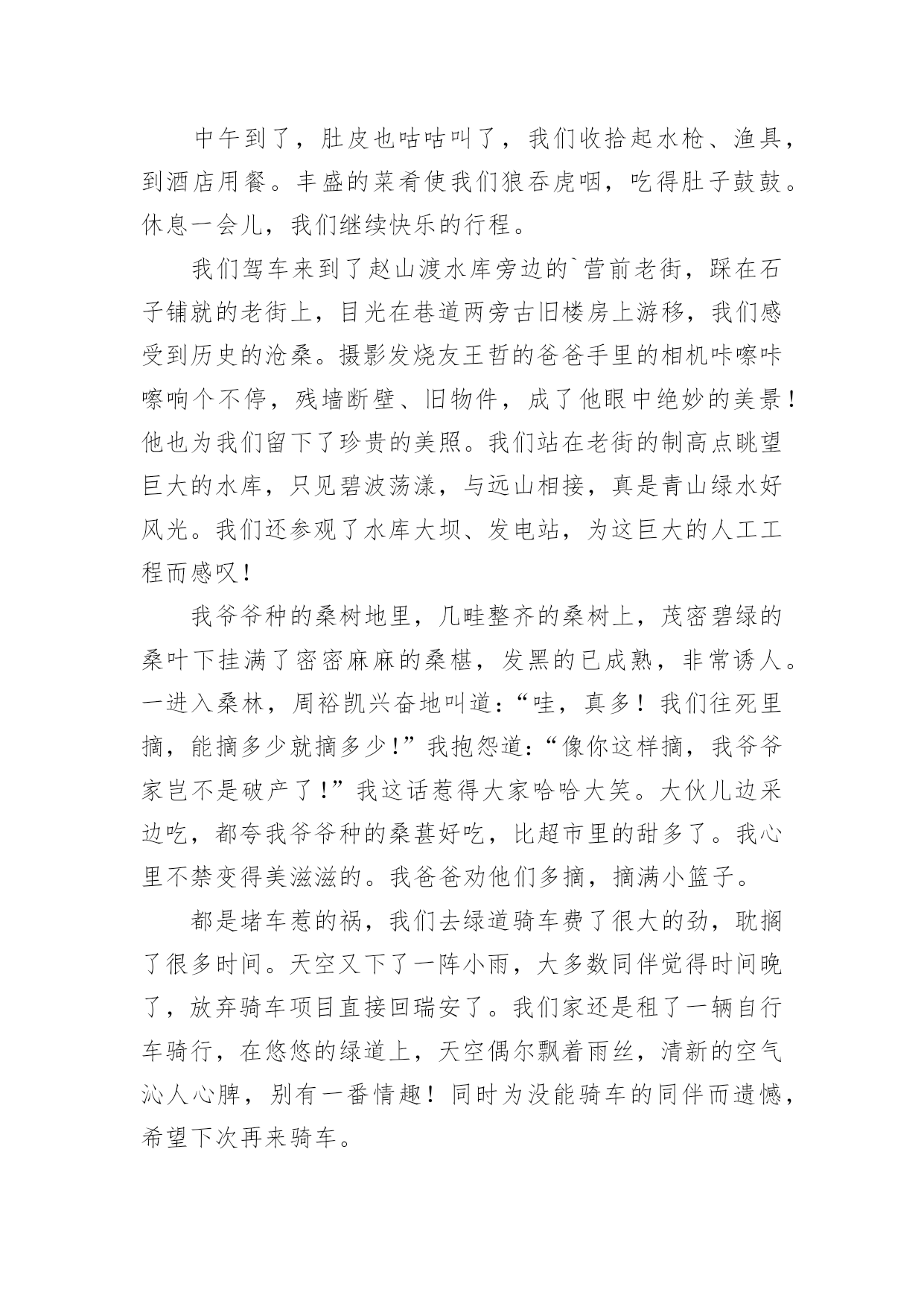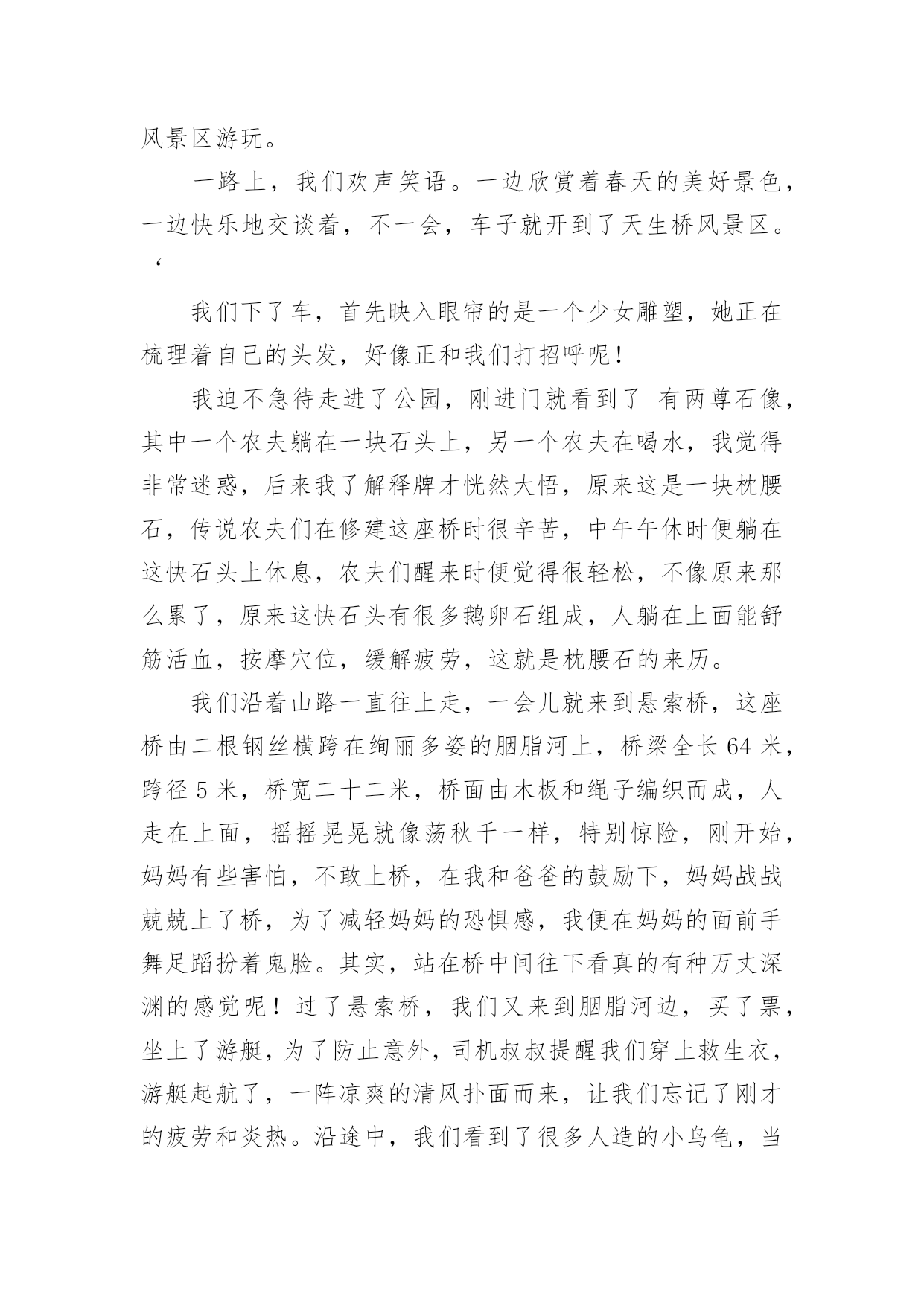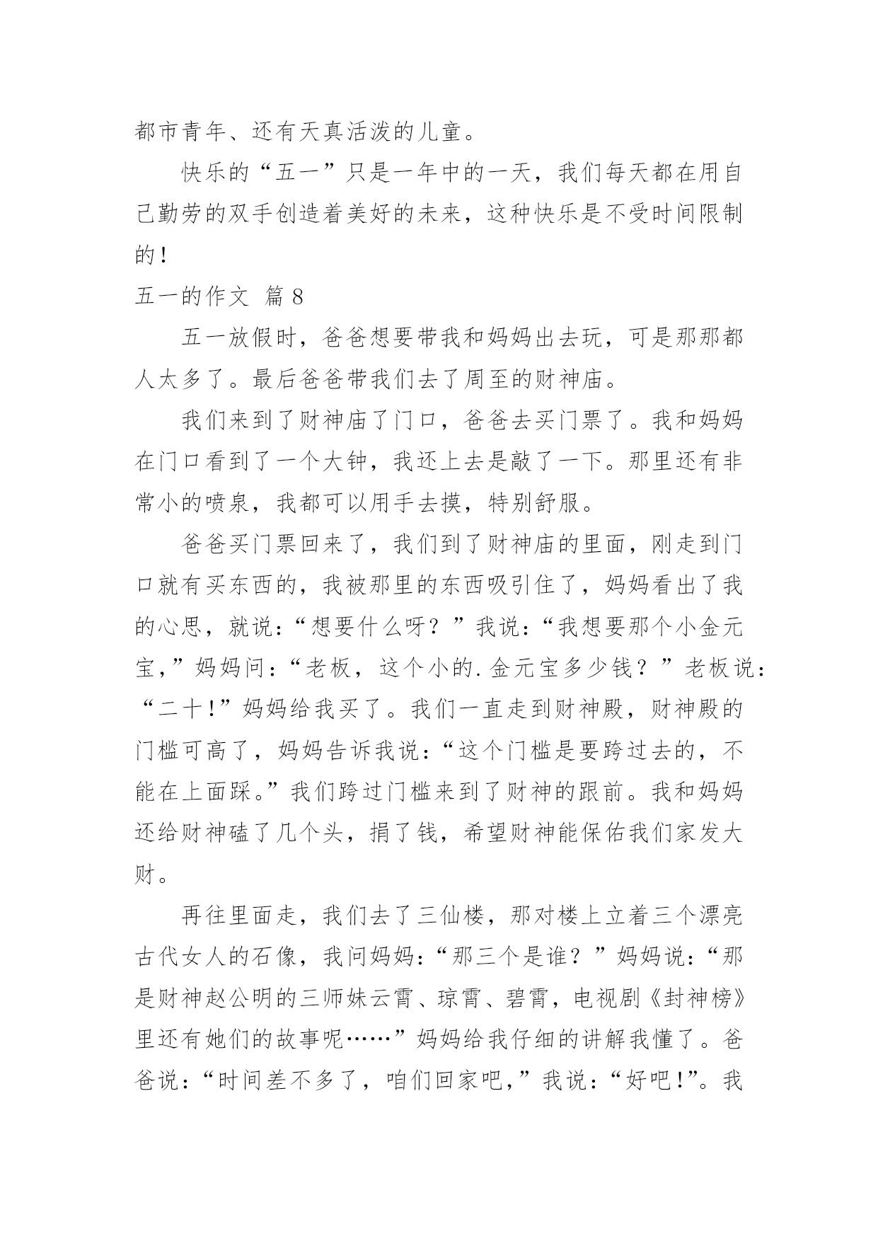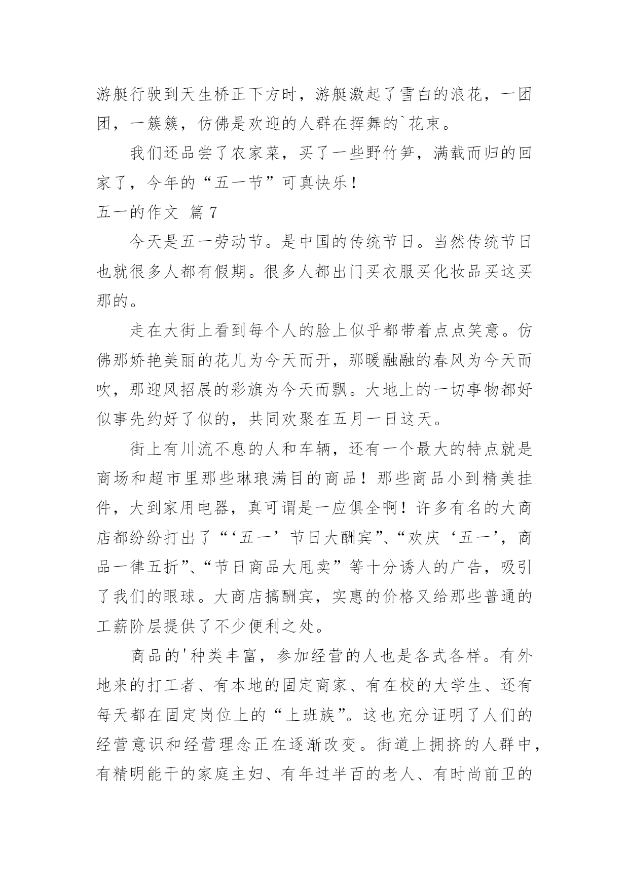 五一的作文五一的作文9篇【必备】在学习、工作、生活中,大家都跟作文打过交道吧,借助作文可以宣泄心中的情感,调节自己的心情。相信许多人会觉得作文很难写吧,下面是小编为大家收集的五一的作文9篇,欢迎阅读,希望大家能够喜欢。五一的作文篇1五一劳动节到了,我很兴奋,因为我们可以放下沉重的书包连休三天。于是,我家和王哲、曾钰等几家相约一起去高楼来一次亲近自然的郊游。因为我老家在高楼,大家一致推举由我和爸爸来当导游,做主安排游玩的项目和路线。我激动无比,接受这光荣的任务,这可是我第一次当导游哇!我和爸爸做了精心的策划,要为大家安排丰富的游玩内容,做好后勤服务。5月1日,起了个大早,简单地收拾了下行装,我们就驱车向高楼进发。节日的公路上好“热闹”呀,原本不到一小时的车程花了两小时多。漫长的行车终于结束了,我迫不及待地跳下车,一头“栽”进清澈溪流的怀抱。伙伴们也陆续到达了,我们光着脚丫尽情地在清流里戏水玩耍,摸漂亮的小石头,捞小鱼儿,打水漂。最有趣的是玩水枪,同伴们的水枪比我的手臂还长,我的是小水枪,比手掌还短,射程很近。他们唰唰地射出长水龙,我只能射出细细的毛毛雨,可还是玩得不亦乐乎!中午到了,肚皮也咕咕叫了,我们收拾起水枪、渔具,到酒店用餐。丰盛的菜肴使我们狼吞虎咽,吃得肚子鼓鼓。休息一会儿,我们继续快乐的行程。我们驾车来到了赵山渡水库旁边的`营前老街,踩在石子铺就的老街上,目光在巷道两旁古旧楼房上游移,我们感受到历史的沧桑。摄影发烧友王哲的爸爸手里的相机咔嚓咔嚓响个不停,残墙断壁、旧物件,成了他眼中绝妙的美景!他也为我们留下了珍贵的美照。我们站在老街的制高点眺望巨大的水库,只见碧波荡漾,与远山相接,真是青山绿水好风光。我们还参观了水库大坝、发电站,为这巨大的人工工程而感叹!我爷爷种的桑树地里,几畦整齐的桑树上,茂密碧绿的桑叶下挂满了密密麻麻的桑椹,发黑的已成熟,非常诱人。一进入桑林,周裕凯兴奋地叫道:“哇,真多!我们往死里摘,能摘多少就摘多少!”我抱怨道:“像你这样摘,我爷爷家岂不是破产了!”我这话惹得大家哈哈大笑。大伙儿边采边吃,都夸我爷爷种的桑葚好吃,比超市里的甜多了。我心里不禁变得美滋滋的。我爸爸劝他们多摘,摘满小篮子。都是堵车惹的祸,我们去绿道骑车费了很大的劲,耽搁了很多时间。天空又下了一阵小雨,大多数同伴觉得时间晚了,放弃骑车项目直接回瑞安了。我们家还是租了一辆自行车骑行,在悠悠的绿道上,天空偶尔飘着雨丝,清新的空气沁人心脾,别有一番情趣!同时为没能骑车的同伴而遗憾,希望下次再来骑车。在夜幕下的回家路上,我的心情还无法平静,为我做主的丰富多彩的这一天!五一的作文篇2今天是国际劳动节,学校放假,我可以不去上学。为了感谢爸爸妈妈,我决定过一个有特殊意义的劳动节。平日里,爸爸妈妈辛苦工作,还要照顾我饮食起居,今天我给爸爸妈妈放假,准备为他们做一次早餐。酸奶鸡蛋饼是我最爱的早餐,一般都是妈妈做的,平时看着妈妈忙来忙去的,我也想尝试一番。这个劳动节妈妈竟然同意让我做早餐,我喜出望外,赶紧行动起来。第一步:我拿出一个碗,接着打入二个鸡蛋,把酸奶、面粉放入碗中,来回搅拌均匀;第二步:在模具上刷一层植物油,把这些面糊倒入小模具里,面糊不能太多,也不能太少,倒至模具的三分之二处;第三步:盖上模具盖子,煎上十分钟,等待美味。不到十分钟,就闻到了酸奶鸡蛋饼的味道了,一个个漂亮的`酸奶鸡蛋饼就诞生了,有小狗形状的、小树形状的、贝壳形状的,简直是艺术品。我拿了一小块并尝了尝,哎呀,第一次做,没有经验,全烤糊了。我把酸奶鸡蛋饼放到餐桌上,让奶奶尝了一尝,奶奶说:“做的还不错”。我想,奶奶大概是安慰我吧。虽然我把酸奶鸡蛋饼烤糊了,但是我还是很开心,也明白了一些道理。妈妈告诉我:做什么事情都需要不断的尝试和改进,做饼也一样慢慢掌握了做饼的火候和技巧,就会做的越来越好!五一的作文篇3快乐的五一在盼望中到来了,看到“五岳归来不看山,黄山归来不看岳。”大家会想到什么地方呢?没错,我快乐的五一就是去了闻名中外的黄山。去黄山,大家一定能想到奇松、怪石、云海、温泉,这“天下四绝”吧!我这次去黄山主要去看怪石。我好期待呀!“妙笔生花”是一个怪石,之所以叫“妙笔生花”就是它的形状好象一支笔,笔尖上长了一棵树。“五指山”好像一只手露出了五个手指头。“仙人指路”好像一位仙人伸着手在指路。黄山真是人山人海呀!上山坐缆车等了一个小时,下山光要走路都堵了好久!这次五一去黄山不仅让我看到了许多的美景,学到了很多的知识,也让我度过了一个快乐的五一,留下了美好的`回忆。五一的作文篇4时间对于每个人来说,都是公平的,它总是不快不慢,一分一秒的流逝。但快乐的时光,总让人觉得过得特别快。转眼间,两个月的寒假就这样过去了。今年寒假,我去了许多好玩的地方。比如萧山的极地海洋公园、德清的莫干山、绍