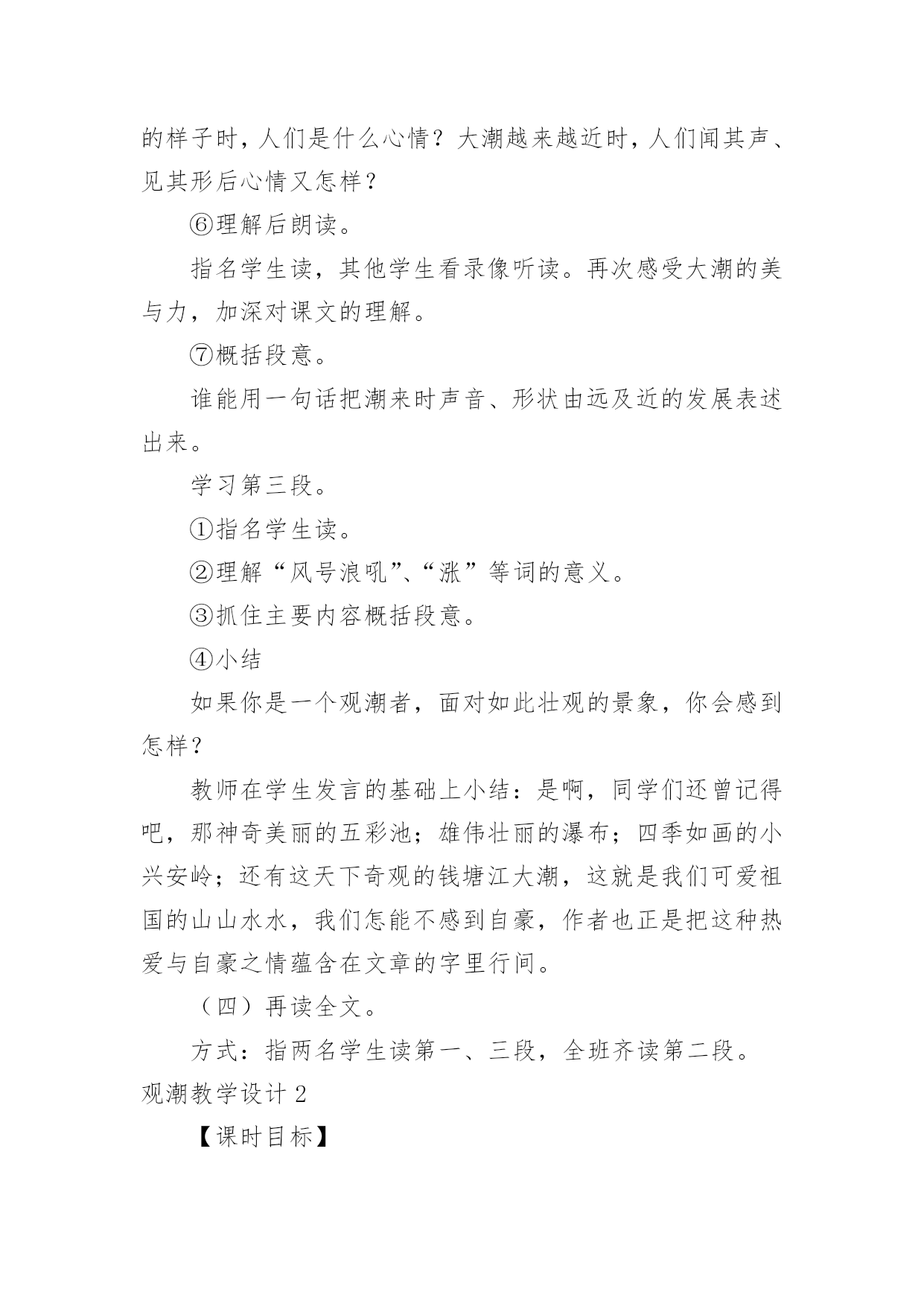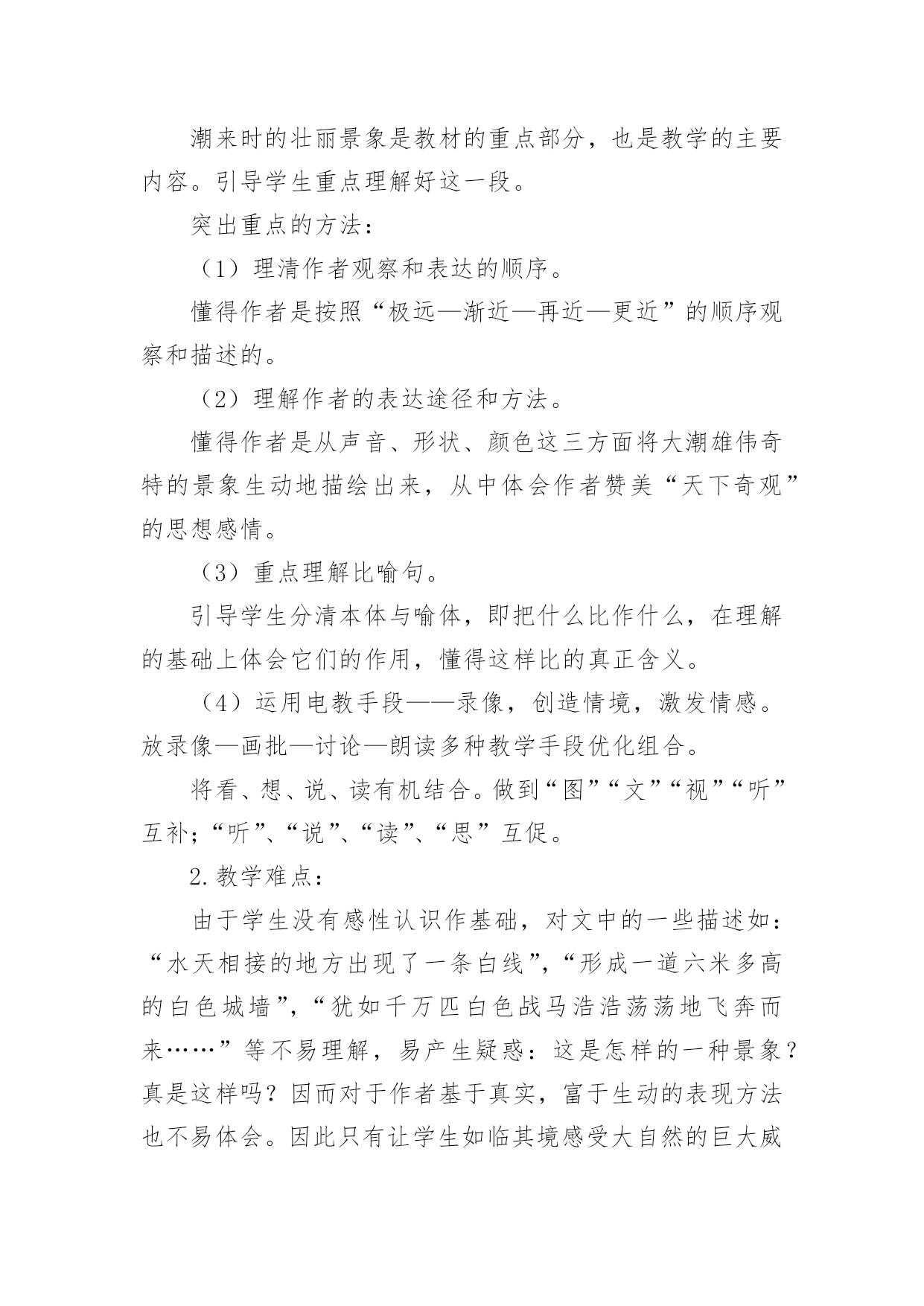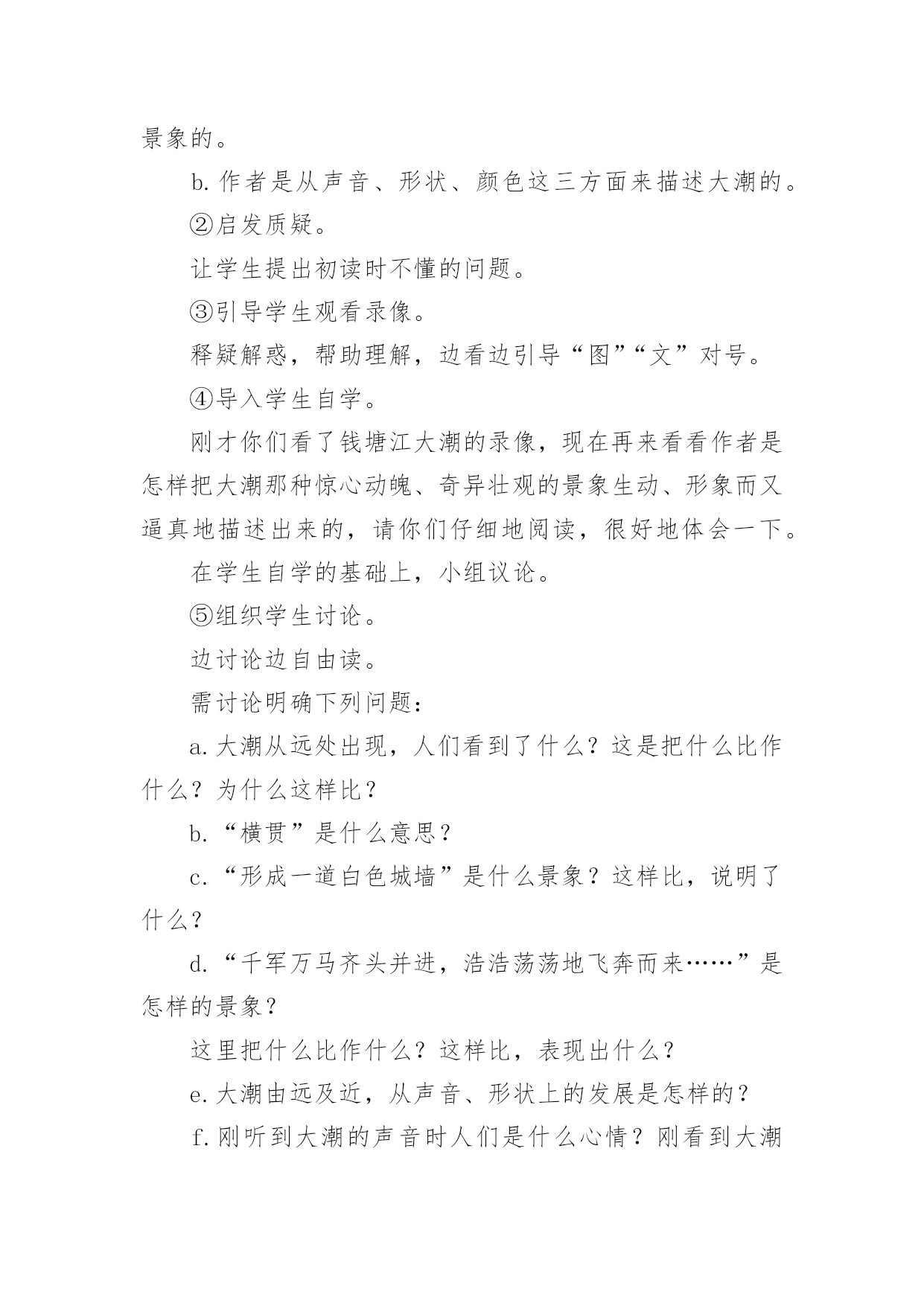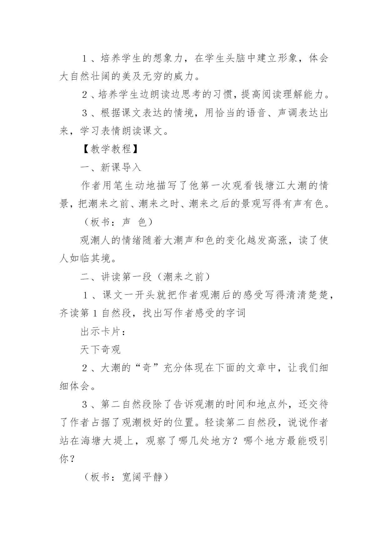 观潮教学设计观潮教学设计在教学工作者实际的教学活动中,编写教学设计是必不可少的,教学设计是连接基础理论与实践的桥梁,对于教学理论与实践的紧密结合具有沟通作用。那么什么样的教学设计才是好的呢?下面是小编为大家收集的观潮教学设计,欢迎大家分享。观潮教学设计1一、教材分析《观潮》是一篇文质兼优的写景文章。作者寓情于景,通过对农历八月十八日的钱塘江大潮雄奇壮丽,气势非凡,景观的描绘,抒发了热爱祖国壮丽山河的思想感情。本文的教学,不但要使学生增长见识,学习作者的观察及表达方法,受到语文能力的训练,还要激发学生热爱大自然,热爱祖国壮美河山的思想感情。(一)课始,以“声”激情诱趣。好的作品默默地看与朗朗地读又与有音乐烘托伴奏的朗诵,对人的感官的刺激作用,带给人的内心体验都是不同的。文章描绘了钱塘江大潮来前的风平浪静与潮来时的惊涛浪吼形成鲜明对比,尤其绘声绘色地描述了潮水由远推近,有如排山倒海之势,雷霆万钧之力。为了充分发挥作品的感染力,用雄浑有力的交响乐伴以激情昂然的朗诵,使学生入其境,动其情。准备一段由缓慢抒情到急促激越再到平缓渐弱的交响曲。以“舒展缓慢”吻合潮来前的平静;以“欢乐抒情”衬托人们观潮的喜悦心情;以“雄壮激昂”,烘托大潮的磅礴气势。(二)课中以“像”释疑解惑。学生生活在繁华的城市,许多孩子没有到过海边,更无从目睹这样雄伟壮丽的大潮之景观。对于没有见过的事物,又无类似经历可以借鉴,不仅给理解课文带来障碍,也给展开想象造成困难。因此,需运用电教手段,声像同步,视听结合,创设情境,提供感知,发展情感,促进理解。根据课文内容,从《神州风采》里的“海宁观潮”一片中截取有关片断,按潮来时开始还是风平浪静到有声无“形”,然后“水天相接的地方出现一条白线”;渐近,拉长变粗,横贯江面”;再近,白浪翻滚,如同一道城墙”;更近,犹如“战马飞奔”的顺序组接。录制两遍。第一遍按由远及近,将潮水的“如线”、“横贯江面”、“如墙”、如“万马奔腾”的四个画面各定格6秒,以便使学生有时间看清楚并将实际景象与课文里的文字描述在头脑中“衔接对号”。第二遍不定格,使学生对大潮由远及近的推进变化、发展有一个连贯、完整的印象,以加深感受。(三)以“读”促思通文。朗读是理解内容的基础,也是检查理解的.手段,更是以文悟道的途径。《观潮》从声、形、色三方面描绘赞美了被称为天下奇观的钱塘江大潮,形象鲜明,富于感染力。有感情地诵读既有助于理解课文,又能更好地受到感染。读,应求形式多样,不同的读法有不同的作用和效果,要根据不同段落的学习内容、训练任务、教学目的选择适当的读法。默读,利于思考;朗读,助于理解;齐读,训练面大;自由读,灵活主动;个别读,“以点带面”便于指导。读,又不能走形式,明确读的目的,提出读的要求,求得读的成效。要以读引思,以思促读,读思结合。这堂课的教学,采用下列读法:课始:教师范读激情;课中:自学时默读,理解中自由读,理解后感情朗读;课尾:个别读、齐读相结合。(四)优化课堂结构。教学结构力求体现“教为主导、生为主体、学为基础、思为核心、‘道’贯其中”的整体优化结构型。教学过程中充分发挥学生的主体作用和充分调动学生的学习主观能动性,做到“三动”和“三个保证”。三动:动脑思考;动口读说;动手画批。三个保证:在学习的中心阶段,即高潮处,关键处,难点、重点处,保证有充分的时间让学生去读、去思、去议;保证学生各抒己见,畅所欲言;保证学生自始至终在课堂上过着愉快的精神生活。(五)教学的重点、难点及处理方法。1.教学重点:潮来时的壮丽景象是教材的重点部分,也是教学的主要内容。引导学生重点理解好这一段。突出重点的方法:(1)理清作者观察和表达的顺序。懂得作者是按照“极远—渐近—再近—更近”的顺序观察和描述的。(2)理解作者的表达途径和方法。懂得作者是从声音、形状、颜色这三方面将大潮雄伟奇特的景象生动地描绘出来,从中体会作者赞美“天下奇观”的思想感情。(3)重点理解比喻句。引导学生分清本体与喻体,即把什么比作什么,在理解的基础上体会它们的作用,懂得这样比的真正含义。(4)运用电教手段——录像,创造情境,激发情感。放录像—画批—讨论—朗读多种教学手段优化组合。将看、想、说、读有机结合。做到“图”“文”“视”“听”互补;“听”、“说”、“读”、“思”互促。2.教学难点:由于学生没有感性认识作基础,对文中的一些描述如:“水天相接的地方出现了一条白线”,“形成一道六米多高的白色城墙”,“犹如千万匹白色战马浩浩荡荡地飞奔而来……”等不易理解,易产生疑惑:这是怎样的一种景象?真是这样吗?因而对于作者基于真实,富于生动的表现方法也不易体会。因此只有让学生如临其境感受大自然的巨大威力,才能很好地理解体会作者生动形象的语言表现力。突破难点的方法:(1)借助录像,提供感性材料,帮助理解内容,释