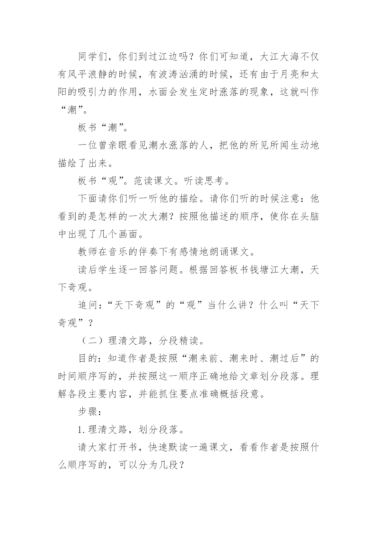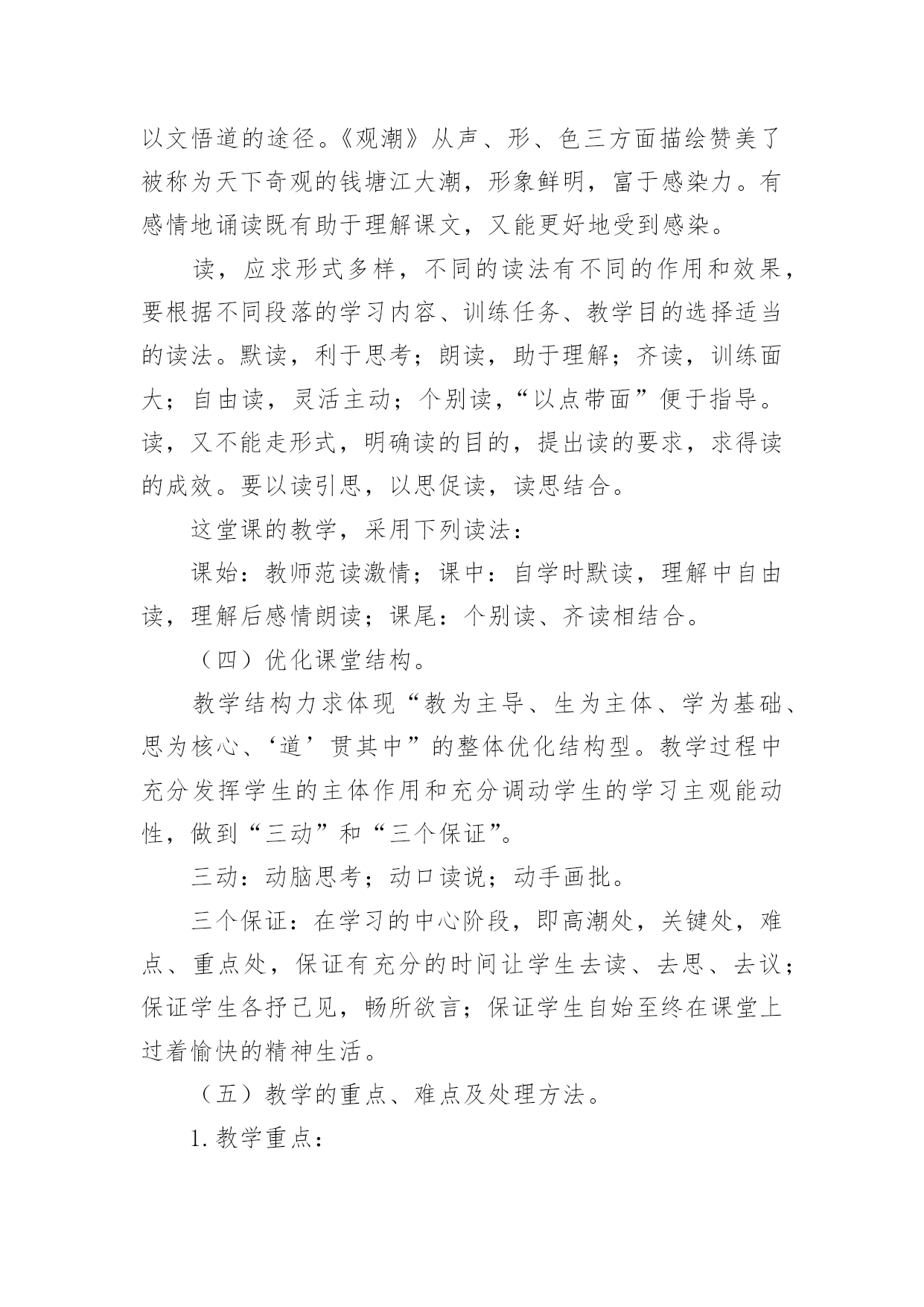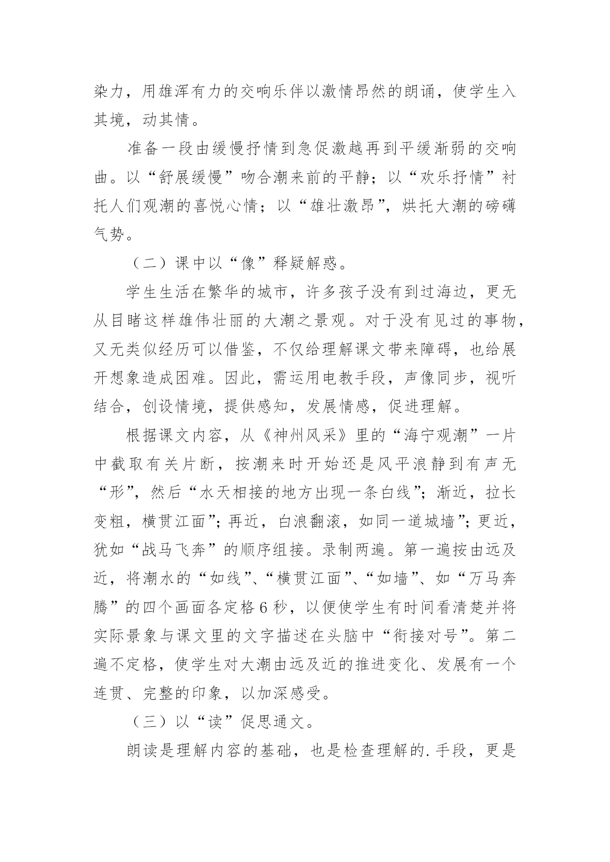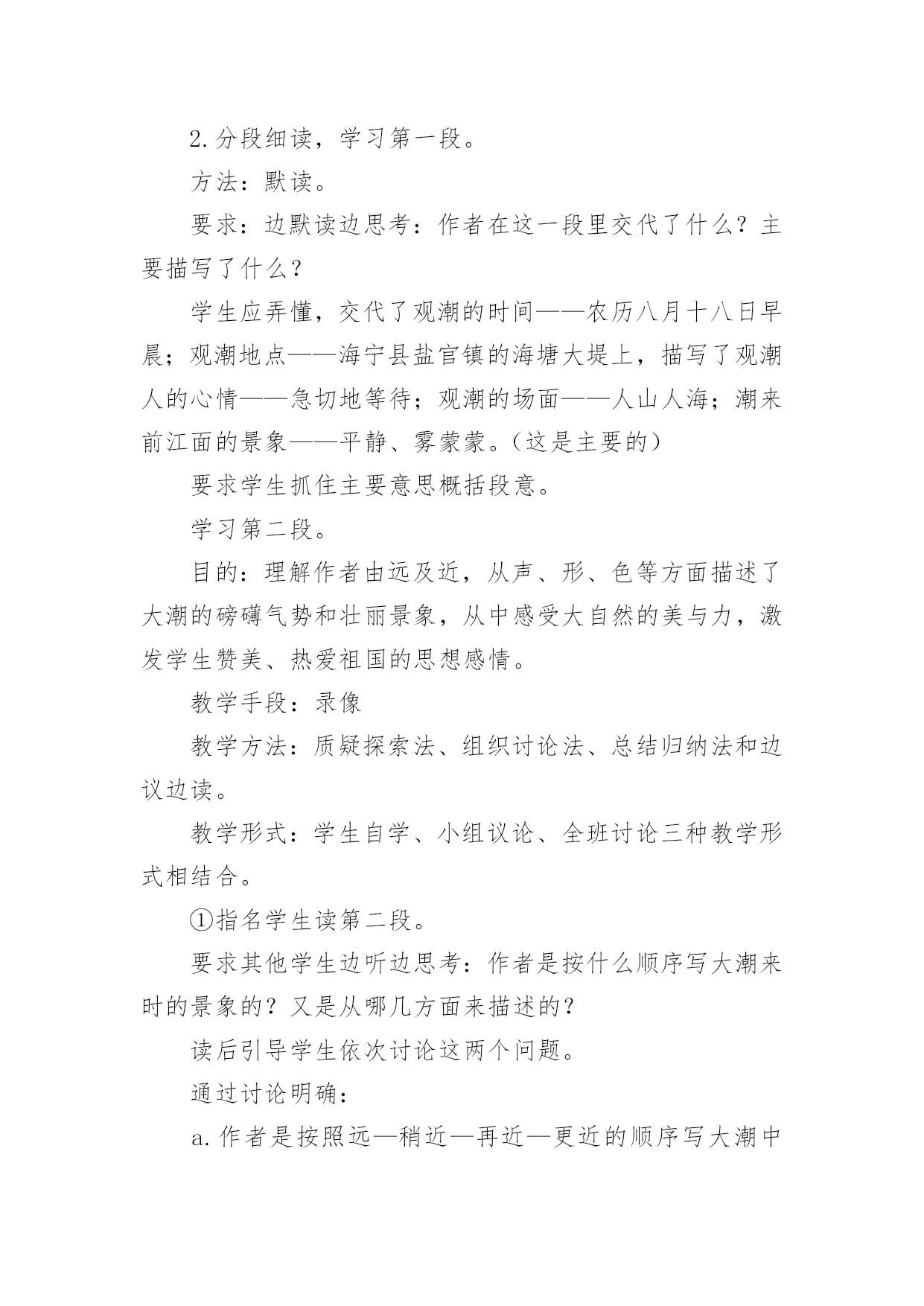 观潮教学设计观潮教学设计在教学工作者实际的教学活动中,编写教学设计是必不可少的,教学设计是连接基础理论与实践的桥梁,对于教学理论与实践的紧密结合具有沟通作用。那么什么样的教学设计才是好的呢?下面是小编为大家收集的观潮教学设计,欢迎大家分享。观潮教学设计1一、教材分析《观潮》是一篇文质兼优的写景文章。作者寓情于景,通过对农历八月十八日的钱塘江大潮雄奇壮丽,气势非凡,景观的描绘,抒发了热爱祖国壮丽山河的思想感情。本文的教学,不但要使学生增长见识,学习作者的观察及表达方法,受到语文能力的训练,还要激发学生热爱大自然,热爱祖国壮美河山的思想感情。(一)课始,以“声”激情诱趣。好的作品默默地看与朗朗地读又与有音乐烘托伴奏的朗诵,对人的感官的刺激作用,带给人的内心体验都是不同的。文章描绘了钱塘江大潮来前的风平浪静与潮来时的惊涛浪吼形成鲜明对比,尤其绘声绘色地描述了潮水由远推近,有如排山倒海之势,雷霆万钧之力。为了充分发挥作品的感染力,用雄浑有力的交响乐伴以激情昂然的朗诵,使学生入其境,动其情。准备一段由缓慢抒情到急促激越再到平缓渐弱的交响曲。以“舒展缓慢”吻合潮来前的平静;以“欢乐抒情”衬托人们观潮的喜悦心情;以“雄壮激昂”,烘托大潮的磅礴气势。(二)课中以“像”释疑解惑。学生生活在繁华的城市,许多孩子没有到过海边,更无从目睹这样雄伟壮丽的大潮之景观。对于没有见过的事物,又无类似经历可以借鉴,不仅给理解课文带来障碍,也给展开想象造成困难。因此,需运用电教手段,声像同步,视听结合,创设情境,提供感知,发展情感,促进理解。根据课文内容,从《神州风采》里的“海宁观潮”一片中截取有关片断,按潮来时开始还是风平浪静到有声无“形”,然后“水天相接的地方出现一条白线”;渐近,拉长变粗,横贯江面”;再近,白浪翻滚,如同一道城墙”;更近,犹如“战马飞奔”的顺序组接。录制两遍。第一遍按由远及近,将潮水的“如线”、“横贯江面”、“如墙”、如“万马奔腾”的四个画面各定格6秒,以便使学生有时间看清楚并将实际景象与课文里的文字描述在头脑中“衔接对号”。第二遍不定格,使学生对大潮由远及近的推进变化、发展有一个连贯、完整的印象,以加深感受。(三)以“读”促思通文。朗读是理解内容的基础,也是检查理解的.手段,更是以文悟道的途径。《观潮》从声、形、色三方面描绘赞美了被称为天下奇观的钱塘江大潮,形象鲜明,富于感染力。有感情地诵读既有助于理解课文,又能更好地受到感染。读,应求形式多样,不同的读法有不同的作用和效果,要根据不同段落的学习内容、训练任务、教学目的选择适当的读法。默读,利于思考;朗读,助于理解;齐读,训练面大;自由读,灵活主动;个别读,“以点带面”便于指导。读,又不能走形式,明确读的目的,提出读的要求,求得读的成效。要以读引思,以思促读,读思结合。这堂课的教学,采用下列读法:课始:教师范读激情;课中:自学时默读,理解中自由读,理解后感情朗读;课尾:个别读、齐读相结合。(四)优化课堂结构。教学结构力求体现“教为主导、生为主体、学为基础、思为核心、‘道’贯其中”的整体优化结构型。教学过程中充分发挥学生的主体作用和充分调动学生的学习主观能动性,做到“三动”和“三个保证”。三动:动脑思考;动口读说;动手画批。三个保证:在学习的中心阶段,即高潮处,关键处,难点、重点处,保证有充分的时间让学生去读、去思、去议;保证学生各抒己见,畅所欲言;保证学生自始至终在课堂上过着愉快的精神生活。(五)教学的重点、难点及处理方法。1.教学重点:潮来时的壮丽景象是教材的重点部分,也是教学的主要内容。引导学生重点理解好这一段。突出重点的方法:(1)理清作者观察和表达的顺序。懂得作者是按照“极远—渐近—再近—更近”的顺序观察和描述的。(2)理解作者的表达途径和方法。懂得作者是从声音、形状、颜色这三方面将大潮雄伟奇特的景象生动地描绘出来,从中体会作者赞美“天下奇观”的思想感情。(3)重点理解比喻句。引导学生分清本体与喻体,即把什么比作什么,在理解的基础上体会它们的作用,懂得这样比的真正含义。(4)运用电教手段——录像,创造情境,激发情感。放录像—画批—讨论—朗读多种教学手段优化组合。将看、想、说、读有机结合。做到“图”“文”“视”“听”互补;“听”、“说”、“读”、“思”互促。2.教学难点:由于学生没有感性认识作基础,对文中的一些描述如:“水天相接的地方出现了一条白线”,“形成一道六米多高的白色城墙”,“犹如千万匹白色战马浩浩荡荡地飞奔而来……”等不易理解,易产生疑惑:这是怎样的一种景象?真是这样吗?因而对于作者基于真实,富于生动的表现方法也不易体会。因此只有让学生如临其境感受大自然的巨大威力,才能很好地理解体会作者生动形象的语言表现力。突破难点的方法:(1)借助录像,提供感性材料,帮助理解内容,释