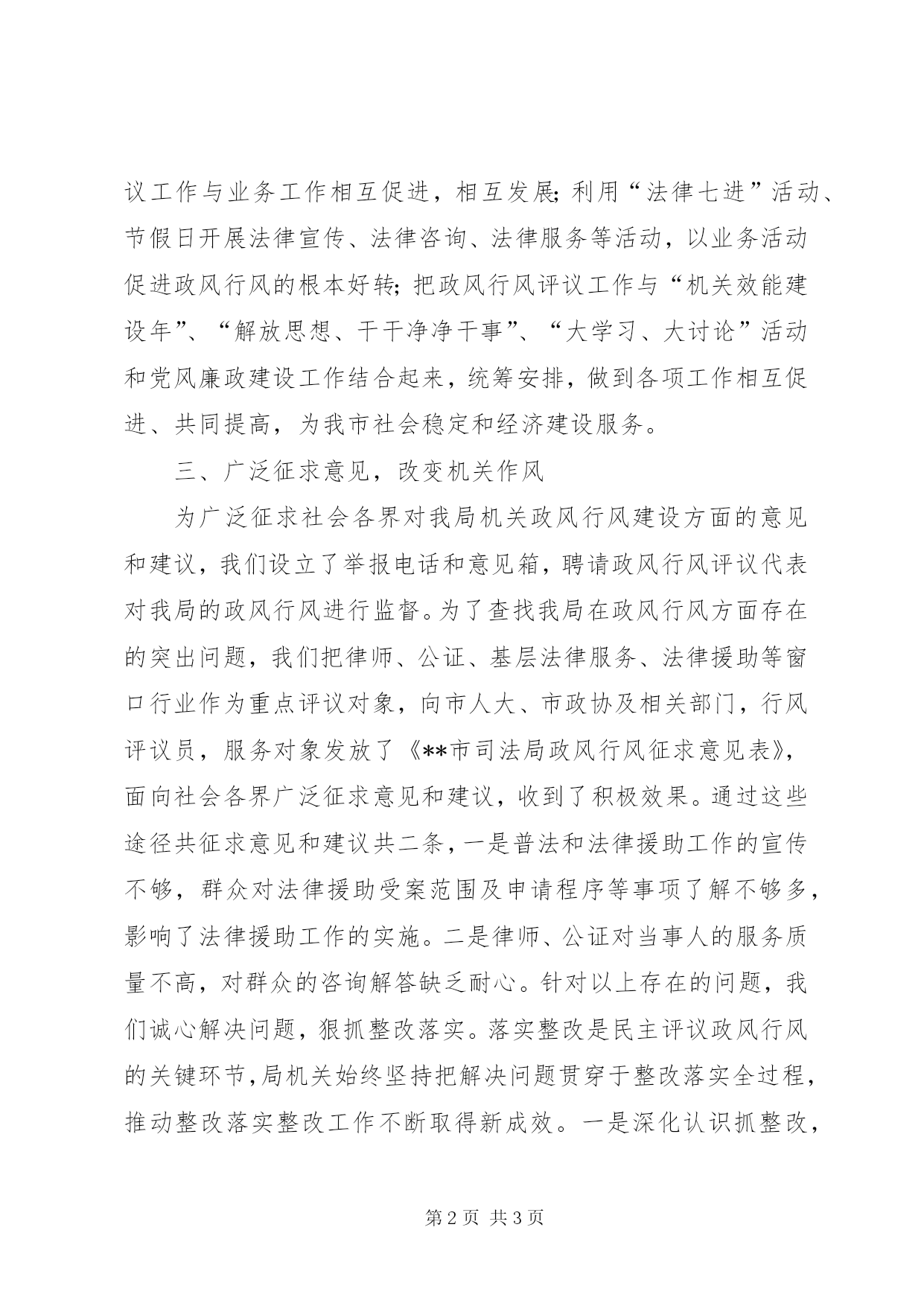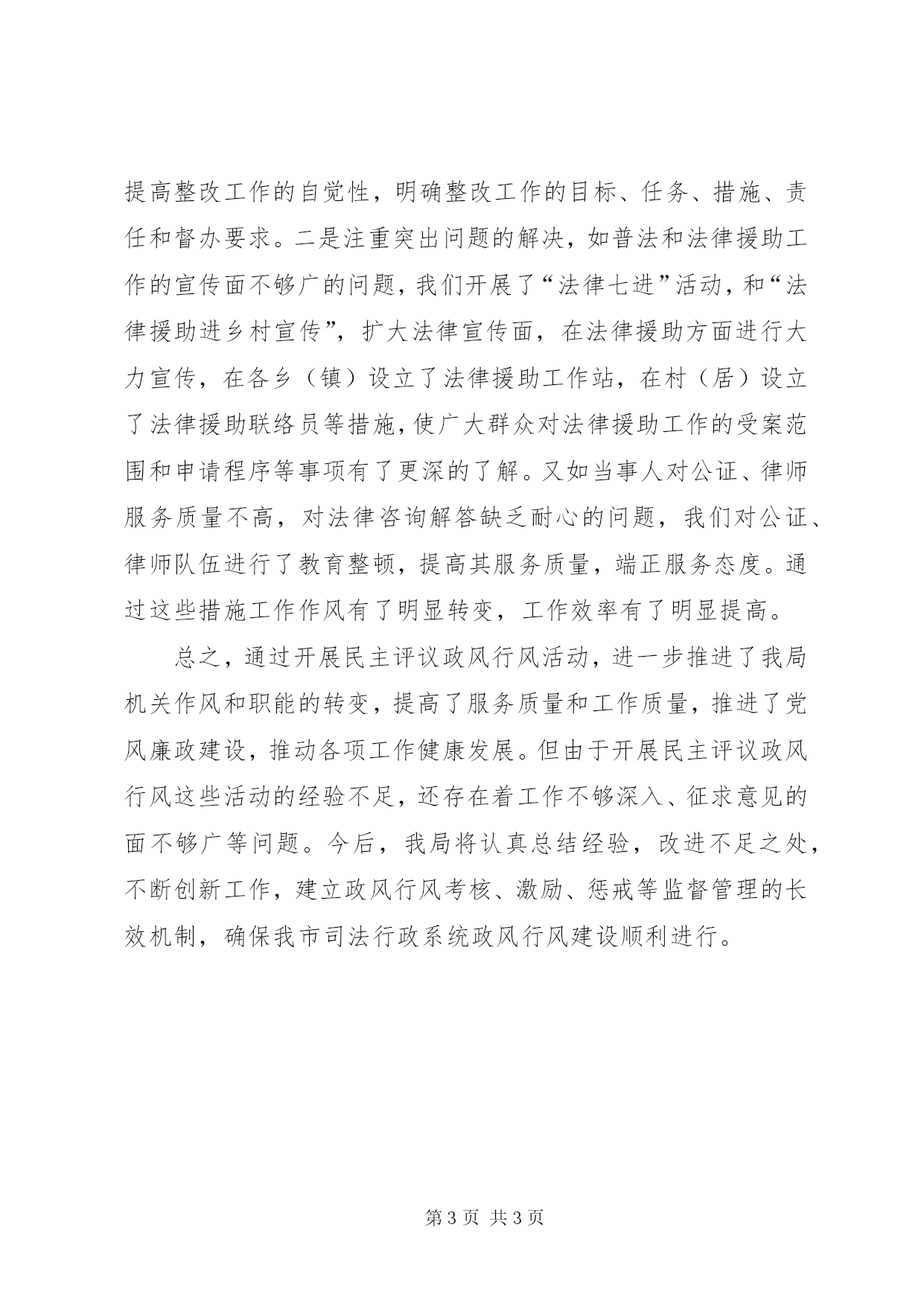 第PAGE\*Arabic\*MERGEFORMAT3页共NUMPAGES\*MERGEFORMAT3页市司法局政风行风工作总结一、建立机构,加强组织领导为扎实开展我局的政风行风工作,局党组研究决定成立局长虎慨桓同志担任组长、副局长杨耀峰、李海同志担任副组长,各县(区)司法局长为成员的民主评议政风行风工作领导小组,下设办公室,负责政风行风的具体工作,形成了主要领导亲自抓、负总责,分管领导具体抓、负直接责任,一级抓一级,层层抓落实的领导机制和工作格局,为民主评议政风行风工作顺利开展提供了强有力的组织保证。二、召开动员大会,提高干部职工的思想认识为了切实加强我局政风行风建设,树立行业形象,2008年4月14日召开了民主评议政风行风动员会议,会上组织学习了关于印发《**市2008年民主评议政风行风工作实施方案>的通知》(固纪发[2008]14)号、《**市司法局2008年民主评议政风行风工作实施方案》(固司党组[2008]15号)文件精神,对我局的民主评议政风行风工作提出了具体的实施意见,确定了民主评议政风行风工作的指导思想、基本原则、评议对象和内容、组织实施、方法步骤、工作要求,要求局机关干部职工立足岗位,以人民满意为标准,把政风行风评议工作与开展业务工作结合起来,以开展民主评议政风行风为契机,有效推进各项业务工作的顺利完成,以业务工作的成果来检验政风行风评议的效果,做到政风行风评议工作与业务工作相互促进,相互发展;利用“法律七进”活动、节假日开展法律宣传、法律咨询、法律服务等活动,以业务活动促进政风行风的根本好转;把政风行风评议工作与“机关效能建设年”、“解放思想、干干净净干事”、“大学习、大讨论”活动和党风廉政建设工作结合起来,统筹安排,做到各项工作相互促进、共同提高,为我市社会稳定和经济建设服务。三、广泛征求意见,改变机关作风为广泛征求社会各界对我局机关政风行风建设方面的意见和建议,我们设立了举报电话和意见箱,聘请政风行风评议代表对我局的政风行风进行监督。为了查找我局在政风行风方面存在的突出问题,我们把律师、公证、基层法律服务、法律援助等窗口行业作为重点评议对象,向市人大、市政协及相关部门,行风评议员,服务对象发放了《**市司法局政风行风征求意见表》,面向社会各界广泛征求意见和建议,收到了积极效果。通过这些途径共征求意见和建议共二条,一是普法和法律援助工作的宣传不够,群众对法律援助受案范围及申请程序等事项了解不够多,影响了法律援助工作的实施。二是律师、公证对当事人的服务质量不高,对群众的咨询解答缺乏耐心。针对以上存在的问题,我们诚心解决问题,狠抓整改落实。落实整改是民主评议政风行风的关键环节,局机关始终坚持把解决问题贯穿于整改落实全过程,推动整改落实整改工作不断取得新成效。一是深化认识抓整改,提高整改工作的自觉性,明确整改工作的目标、任务、措施、责任和督办要求。二是注重突出问题的解决,如普法和法律援助工作的宣传面不够广的问题,我们开展了“法律七进”活动,和“法律援助进乡村宣传”,扩大法律宣传面,在法律援助方面进行大力宣传,在各乡(镇)设立了法律援助工作站,在村(居)设立了法律援助联络员等措施,使广大群众对法律援助工作的受案范围和申请程序等事项有了更深的了解。又如当事人对公证、律师服务质量不高,对法律咨询解答缺乏耐心的问题,我们对公证、律师队伍进行了教育整顿,提高其服务质量,端正服务态度。通过这些措施工作作风有了明显转变,工作效率有了明显提高。总之,通过开展民主评议政风行风活动,进一步推进了我局机关作风和职能的转变,提高了服务质量和工作质量,推进了党风廉政建设,推动各项工作健康发展。但由于开展民主评议政风行风这些活动的经验不足,还存在着工作不够深入、征求意见的面不够广等问题。今后,我局将认真总结经验,改进不足之处,不断创新工作,建立政风行风考核、激励、惩戒等监督管理的长效机制,确保我市司法行政系统政风行风建设顺利进行。
