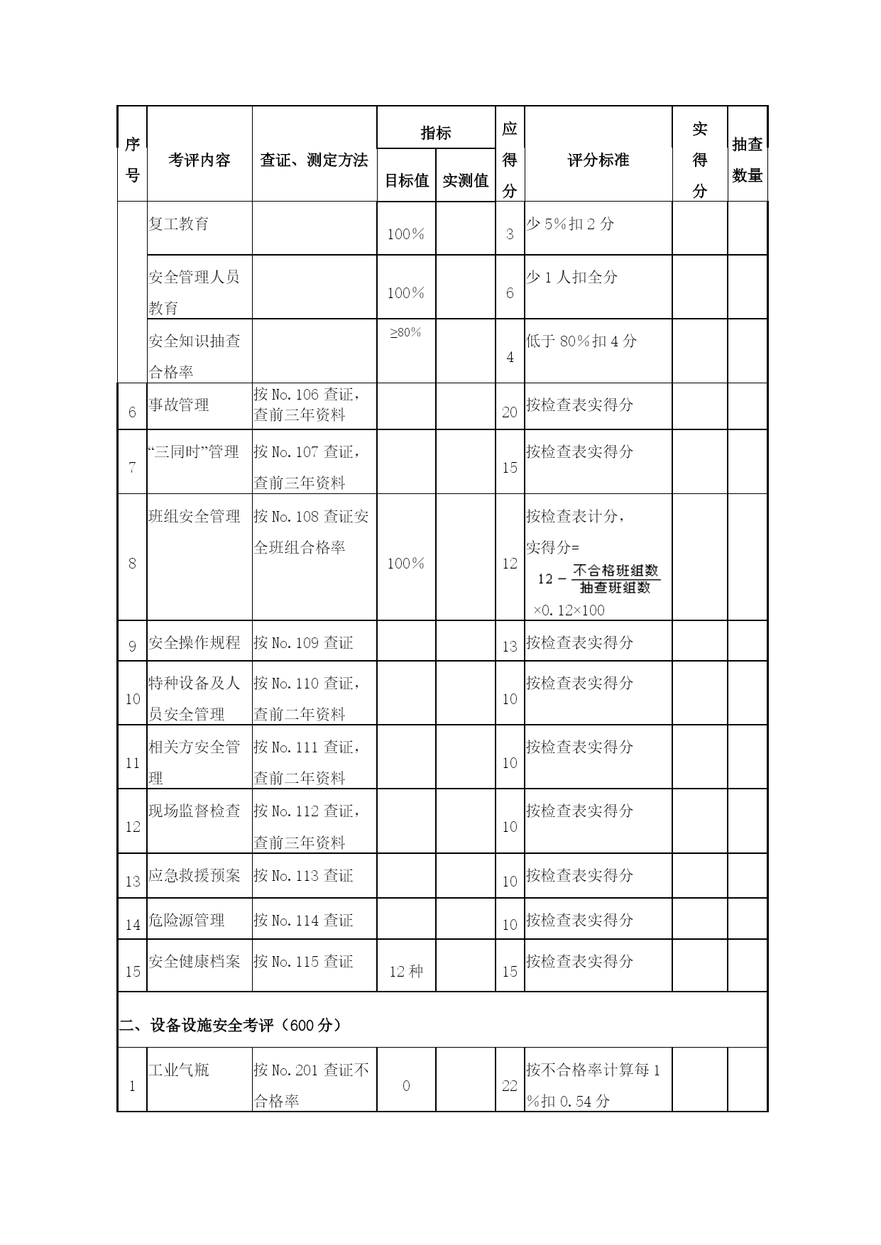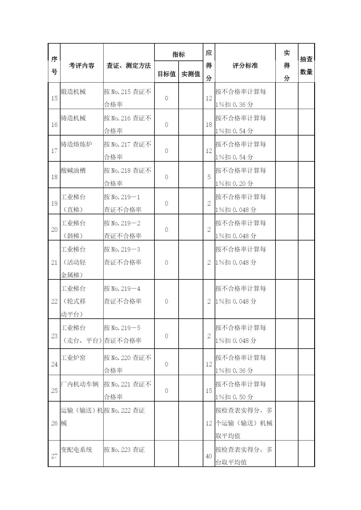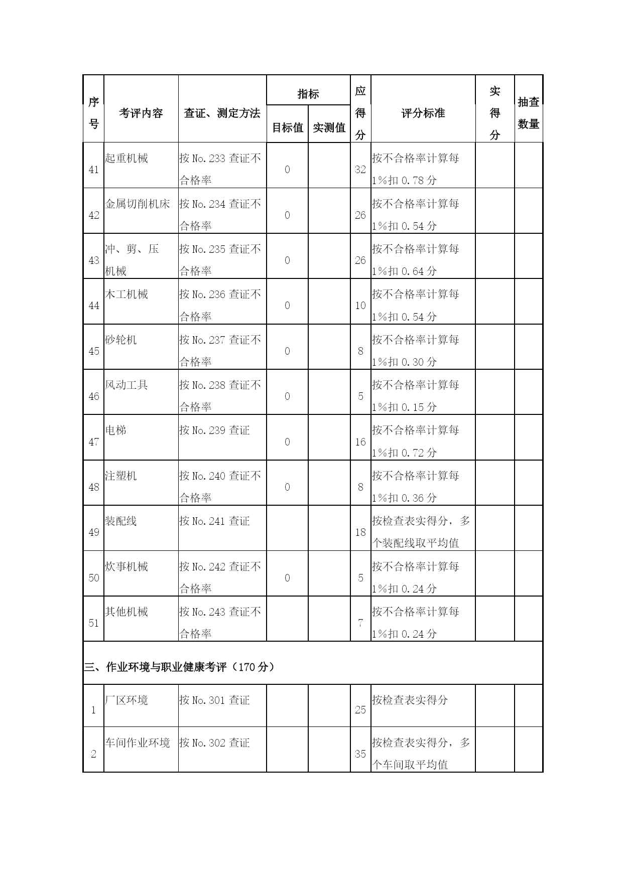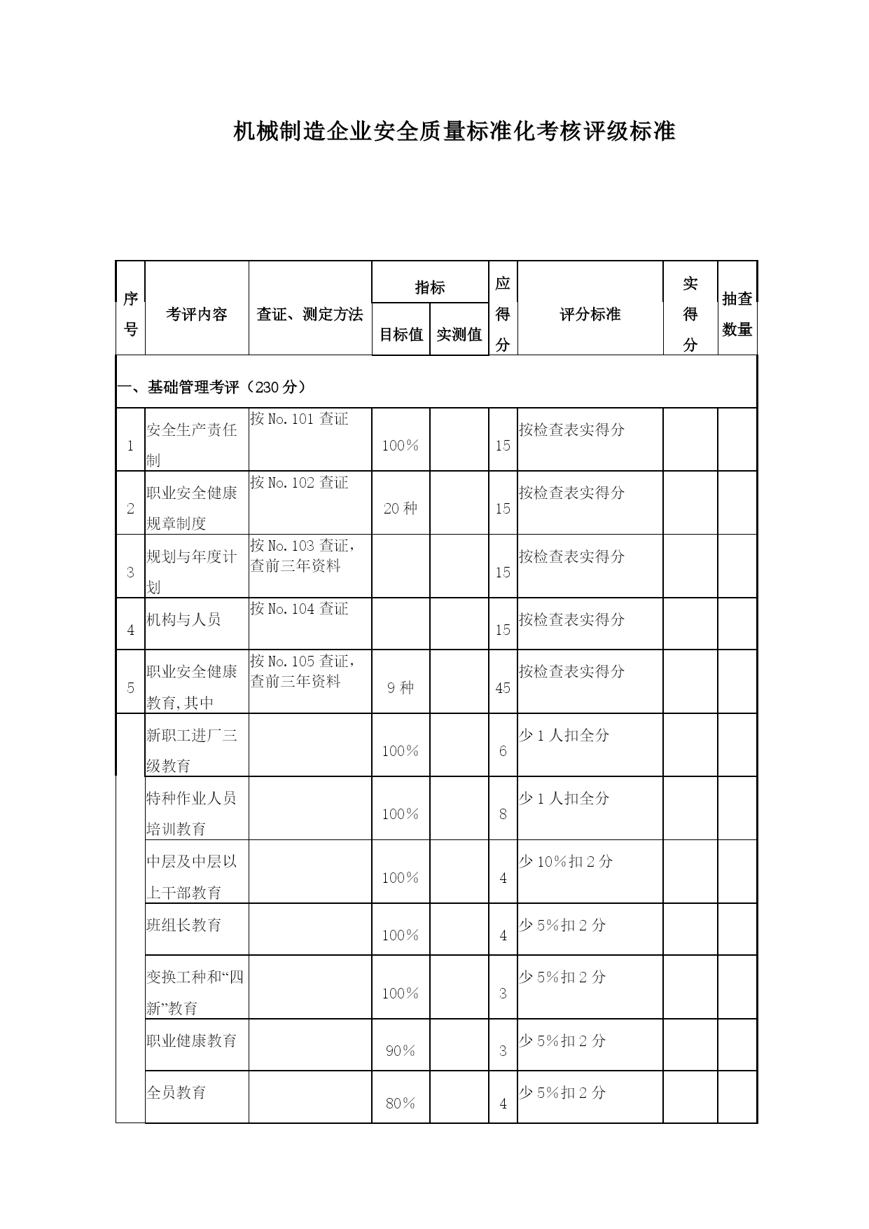 机械制造企业安全质量标准化考核评级标准优质资料(可以直接使用,可编辑优质资料,欢迎下载)机械制造企业安全质量标准化考核评级标准序号考评内容查证、测定方法指标应得分评分标准实得分抽查数量目标值实测值一、基础管理考评(230分)1安全生产责任制按No.101查证100%15按检查表实得分2职业安全健康规章制度按No.102查证20种15按检查表实得分3规划与年度计划按No.103查证,查前三年资料15按检查表实得分4机构与人员按No.104查证15按检查表实得分5职业安全健康教育,其中按No.105查证,查前三年资料9种45按检查表实得分新职工进厂三级教育100%6少1人扣全分特种作业人员培训教育100%8少1人扣全分中层及中层以上干部教育100%4少10%扣2分班组长教育100%4少5%扣2分变换工种和“四新”教育100%3少5%扣2分职业健康教育90%3少5%扣2分全员教育80%4少5%扣2分复工教育100%3少5%扣2分安全管理人员教育100%6少1人扣全分安全知识抽查合格率≥80%4低于80%扣4分6事故管理按No.106查证,查前三年资料20按检查表实得分7“三同时”管理按No.107查证,查前三年资料15按检查表实得分8班组安全管理按No.108查证安全班组合格率100%12按检查表计分,实得分=×0.12×1009安全操作规程按No.109查证13按检查表实得分10特种设备及人员安全管理按No.110查证,查前二年资料10按检查表实得分11相关方安全管理按No.111查证,查前二年资料10按检查表实得分12现场监督检查按No.112查证,查前三年资料10按检查表实得分13应急救援预案按No.113查证10按检查表实得分14危险源管理按No.114查证10按检查表实得分15安全健康档案按No.115查证12种15按检查表实得分二、设备设施安全考评(600分)1工业气瓶按No.201查证不合格率022按不合格率计算每1%扣0.54分2危险化学品库按No.202查证10按检查表实得分,多个危险化学品库取平均值3油库、油罐按No.203查证20按检查表实得分,多个油库取平均值4液化气站按No.204查证12按检查表实得分,多个液化气站取平均值5煤气站按No.205查证10按检查表实得分6制氧站按No.206查证10按检查表实得分7压力容器按No.207查证不合格率016按不合格率计算每1%扣0.50分8乙炔发生站按No.208查证不合格率15按检查表计分,多个站房按不合格率计算每1%扣0.60分9锅炉与辅机按No.209查证不合格率024按不合格率计算每1%扣0.80分10空压机按No.210查证16按检查表实得分,多台空压机取平均值11工业管道按No.211查证8按检查表实得分12木料场所按No.212查证8按检查表实得分,多个木料场所取平均值13工厂建筑按No.213查证不合格率010按不合格率计算每1%扣0.40分14涂装作业场所按No.214查证15按检查表实得分,多处场所取平均值15锻造机械按No.215查证不合格率012按不合格率计算每1%扣0.36分16铸造机械按No.216查证不合格率018按不合格率计算每1%扣0.54分17铸造熔炼炉按No.217查证不合格率012按不合格率计算每1%扣0.54分18酸碱油槽按No.218查证不合格率05按不合格率计算每1%扣0.20分19工业梯台(直梯)按No.219-1查证不合格率02按不合格率计算每1%扣0.048分20工业梯台(斜梯)按No.219-2查证不合格率02按不合格率计算每1%扣0.048分21工业梯台(活动轻金属梯)按No.219-3查证不合格率02按不合格率计算每1%扣0.048分22工业梯台(轮式移动平台)按No.219-4查证不合格率02按不合格率计算每1%扣0.048分23工业梯台(走台、平台)按No.219-5查证不合格率02按不合格率计算每1%扣0.048分24工业炉窑按No.220查证不合格率012按不合格率计算每1%扣0.36分25厂内机动车辆按No.221查证不合格率015按不合格率计算每1%扣0.50分26运输(输送)机械按No.222查证12按检查表实得分,多个运输(输送)机械取平均值27变配电系统按No.223查证40按检查表实得分,多台取平均值28低压电气线路(固定线路)按No.224-1查证不合格率05按不合格率计算每1%扣0.18分29低压电气线路(临时线路)按No.224-2查证不合格率05按不合格率计算每1%扣0.18分30动力(照明)配电箱(柜、板)按No.225查证不合格率020按不合格率计算每1%扣0.72分31电网接地系统按No.