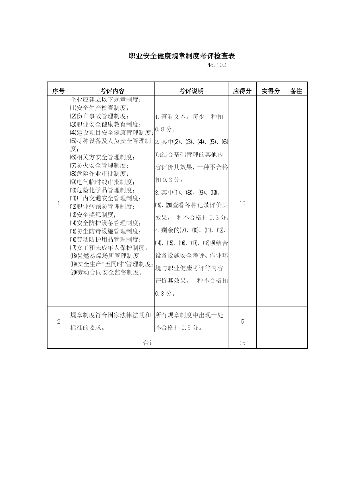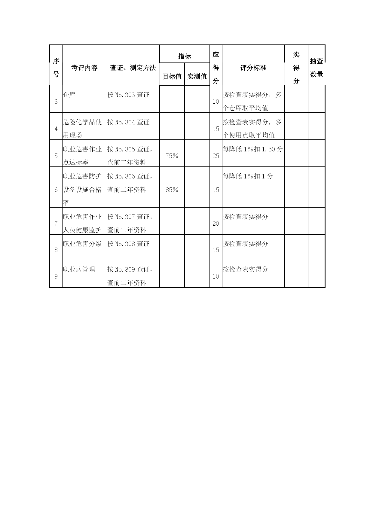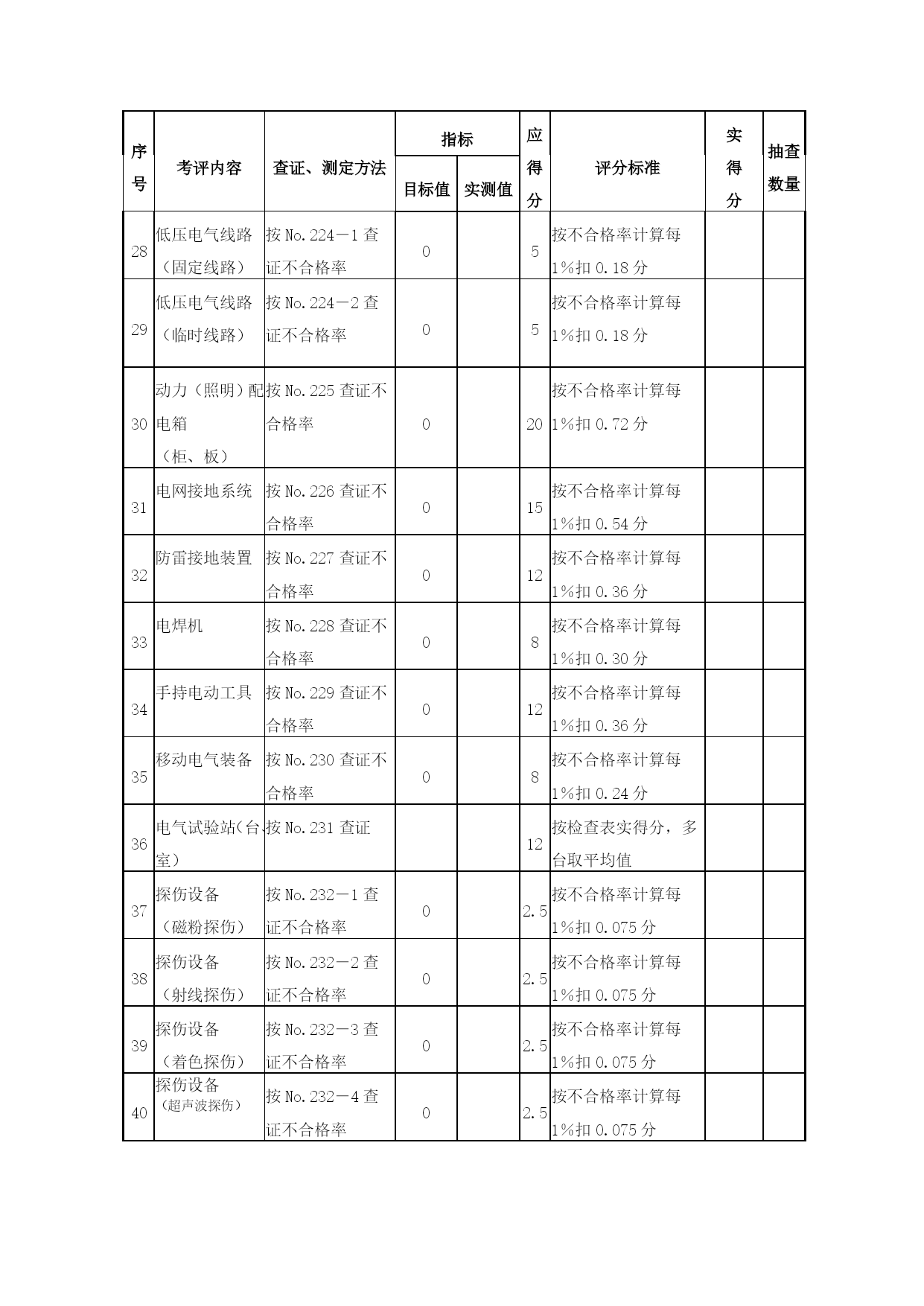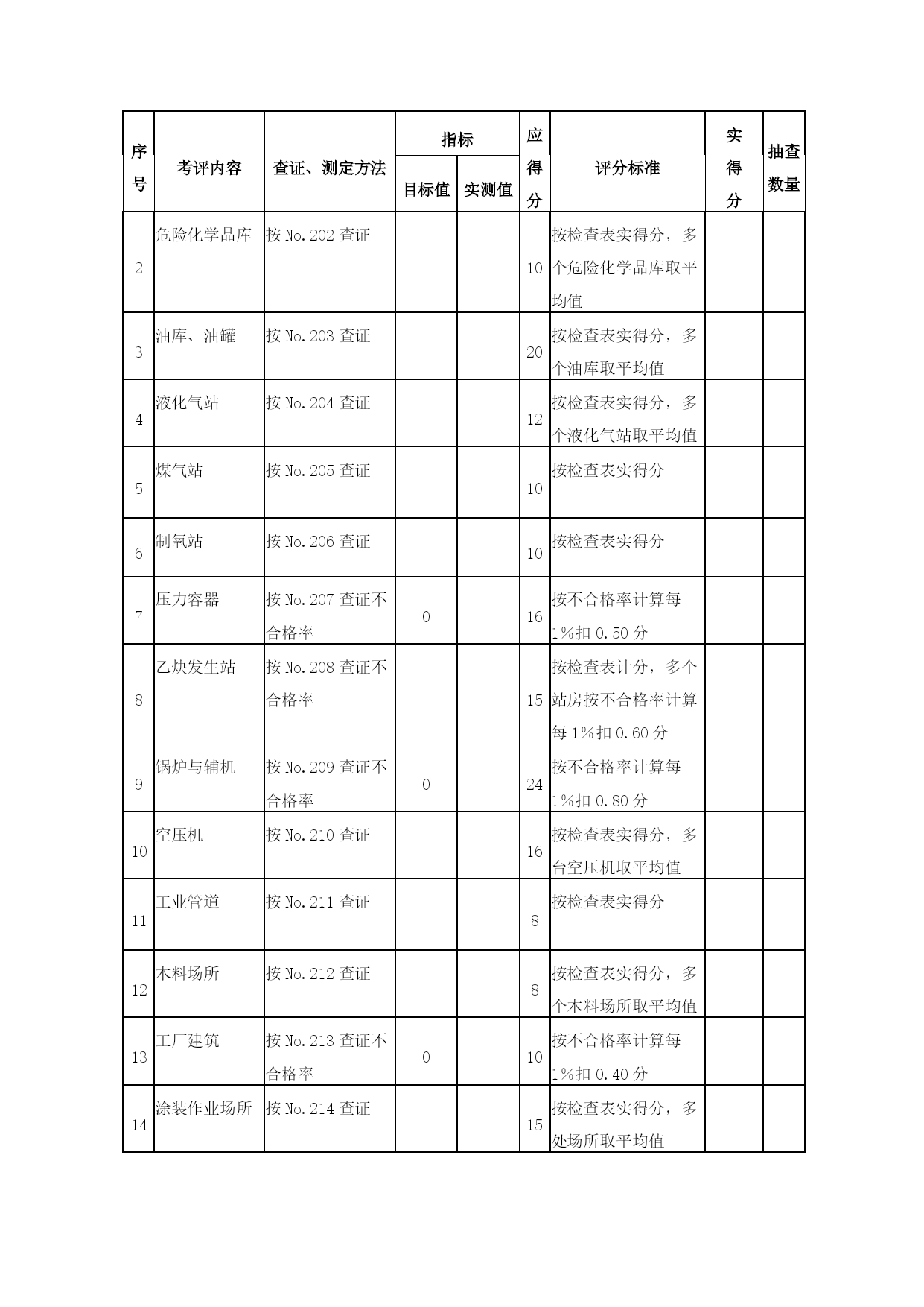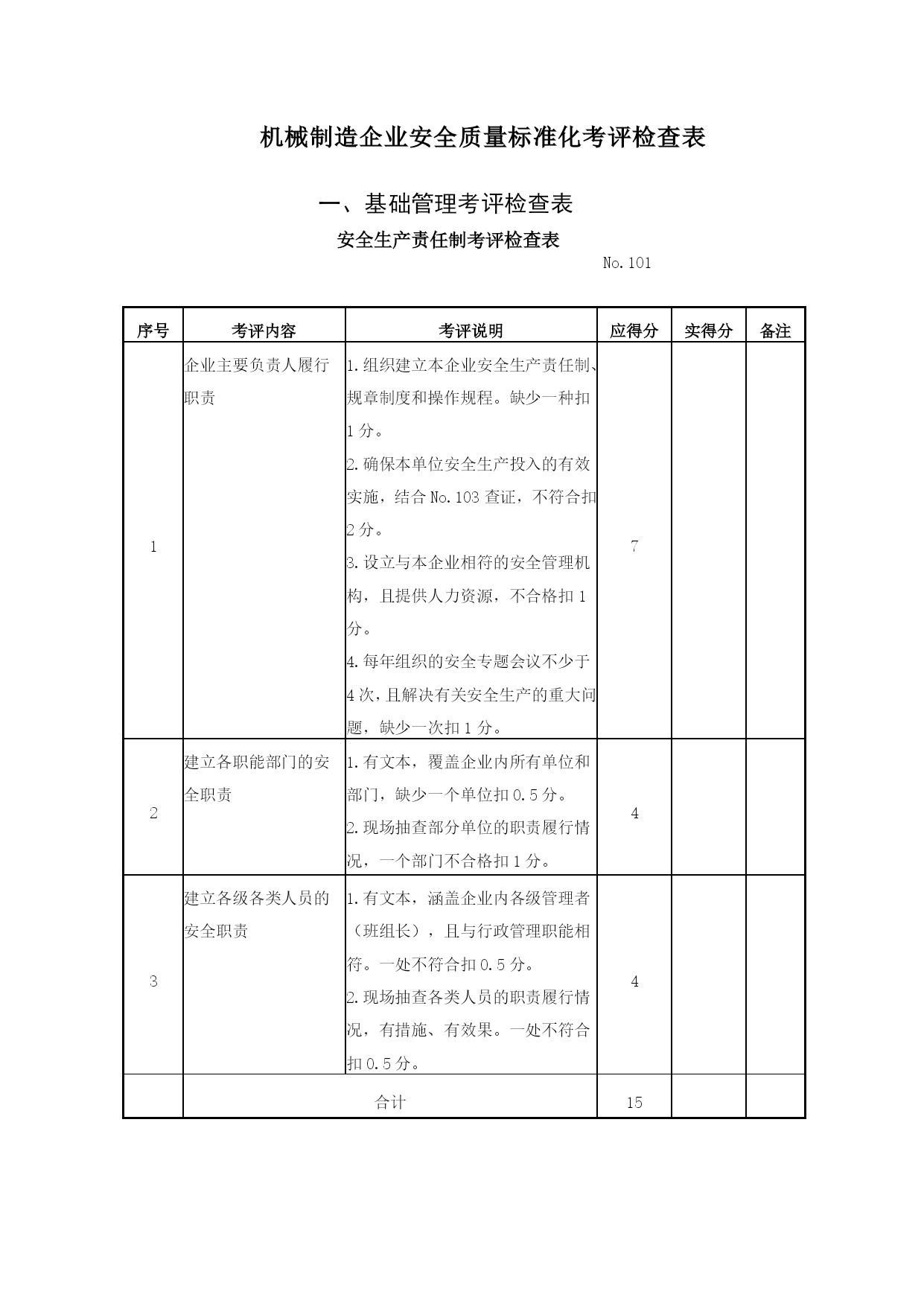 机械制造企业安全质量标准化考核评级标准优质资料(可以直接使用,可编辑优质资料,欢迎下载)机械制造企业安全质量标准化考核评级标准序号考评内容查证、测定方法指标应得分评分标准实得分抽查数量目标值实测值一、基础管理考评(230分)1安全生产责任制按No.101查证100%15按检查表实得分2职业安全健康规章制度按No.102查证20种15按检查表实得分3规划与年度计划按No.103查证,查前三年资料15按检查表实得分4机构与人员按No.104查证15按检查表实得分5职业安全健康教育,其中按No.105查证,查前三年资料9种45按检查表实得分新职工进厂三级教育100%6少1人扣全分特种作业人员培训教育100%8少1人扣全分中层及中层以上干部教育100%4少10%扣2分班组长教育100%4少5%扣2分变换工种和“四新”教育100%3少5%扣2分职业健康教育90%3少5%扣2分全员教育80%4少5%扣2分复工教育100%3少5%扣2分安全管理人员教育100%6少1人扣全分安全知识抽查合格率≥80%4低于80%扣4分6事故管理按No.106查证,查前三年资料20按检查表实得分7“三同时”管理按No.107查证,查前三年资料15按检查表实得分8班组安全管理按No.108查证安全班组合格率100%12按检查表计分,实得分=×0.12×1009安全操作规程按No.109查证13按检查表实得分10特种设备及人员安全管理按No.110查证,查前二年资料10按检查表实得分11相关方安全管理按No.111查证,查前二年资料10按检查表实得分12现场监督检查按No.112查证,查前三年资料10按检查表实得分13应急救援预案按No.113查证10按检查表实得分14危险源管理按No.114查证10按检查表实得分15安全健康档案按No.115查证12种15按检查表实得分二、设备设施安全考评(600分)1工业气瓶按No.201查证不合格率022按不合格率计算每1%扣0.54分2危险化学品库按No.202查证10按检查表实得分,多个危险化学品库取平均值3油库、油罐按No.203查证20按检查表实得分,多个油库取平均值4液化气站按No.204查证12按检查表实得分,多个液化气站取平均值5煤气站按No.205查证10按检查表实得分6制氧站按No.206查证10按检查表实得分7压力容器按No.207查证不合格率016按不合格率计算每1%扣0.50分8乙炔发生站按No.208查证不合格率15按检查表计分,多个站房按不合格率计算每1%扣0.60分9锅炉与辅机按No.209查证不合格率024按不合格率计算每1%扣0.80分10空压机按No.210查证16按检查表实得分,多台空压机取平均值11工业管道按No.211查证8按检查表实得分12木料场所按No.212查证8按检查表实得分,多个木料场所取平均值13工厂建筑按No.213查证不合格率010按不合格率计算每1%扣0.40分14涂装作业场所按No.214查证15按检查表实得分,多处场所取平均值15锻造机械按No.215查证不合格率012按不合格率计算每1%扣0.36分16铸造机械按No.216查证不合格率018按不合格率计算每1%扣0.54分17铸造熔炼炉按No.217查证不合格率012按不合格率计算每1%扣0.54分18酸碱油槽按No.218查证不合格率05按不合格率计算每1%扣0.20分19工业梯台(直梯)按No.219-1查证不合格率02按不合格率计算每1%扣0.048分20工业梯台(斜梯)按No.219-2查证不合格率02按不合格率计算每1%扣0.048分21工业梯台(活动轻金属梯)按No.219-3查证不合格率02按不合格率计算每1%扣0.048分22工业梯台(轮式移动平台)按No.219-4查证不合格率02按不合格率计算每1%扣0.048分23工业梯台(走台、平台)按No.219-5查证不合格率02按不合格率计算每1%扣0.048分24工业炉窑按No.220查证不合格率012按不合格率计算每1%扣0.36分25厂内机动车辆按No.221查证不合格率015按不合格率计算每1%扣0.50分26运输(输送)机械按No.222查证12按检查表实得分,多个运输(输送)机械取平均值27变配电系统按No.223查证40按检查表实得分,多台取平均值28低压电气线路(固定线路)按No.224-1查证不合格率05按不合格率计算每1%扣0.18分29低压电气线路(临时线路)按No.224-2查证不合格率05按不合格率计算每1%扣0.18分30动力(照明)配电箱(柜、板)按No.225查证不合格率020按不合格率计算每1%扣0.72分31电网接地系统按No.