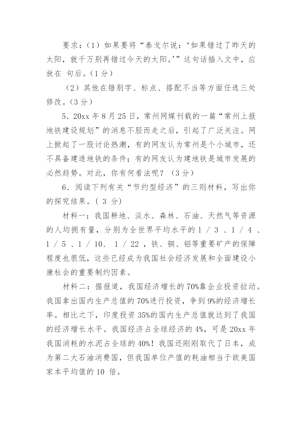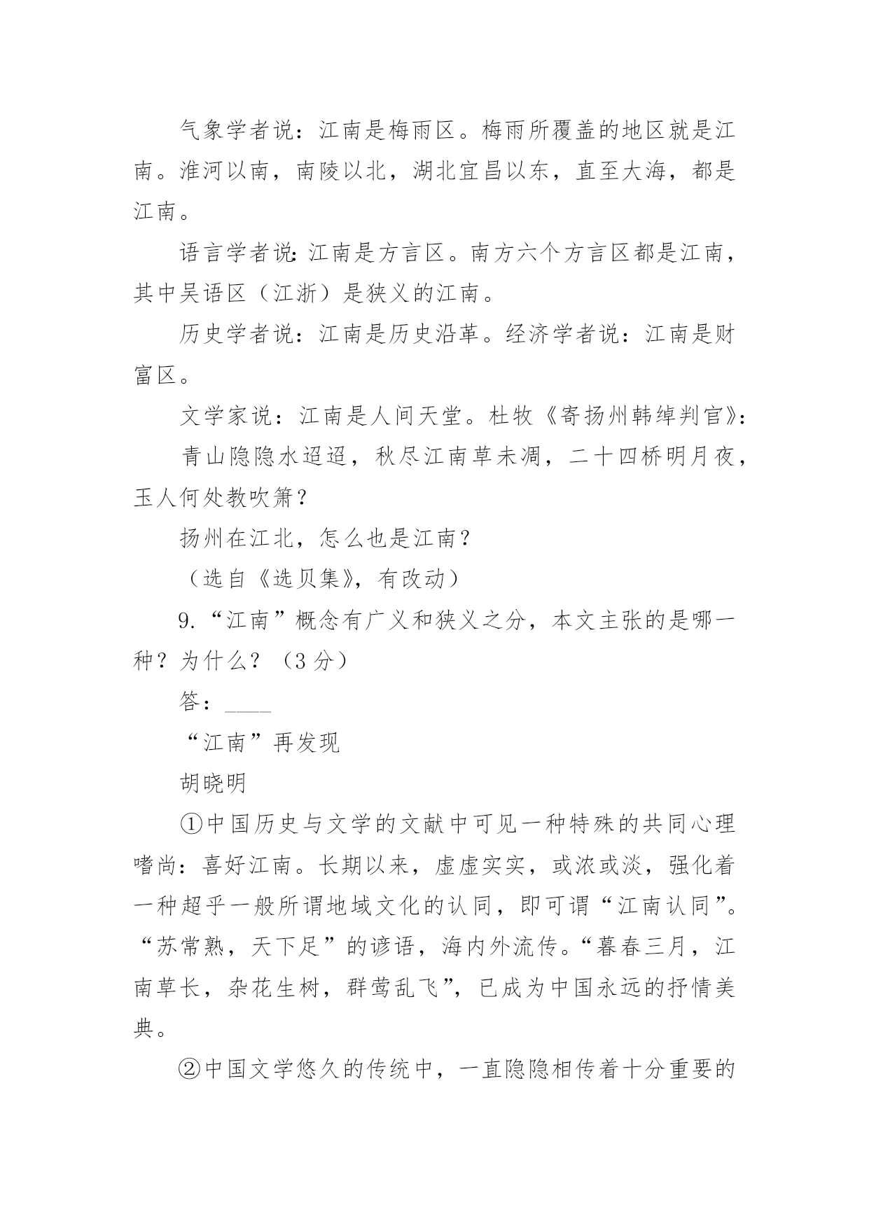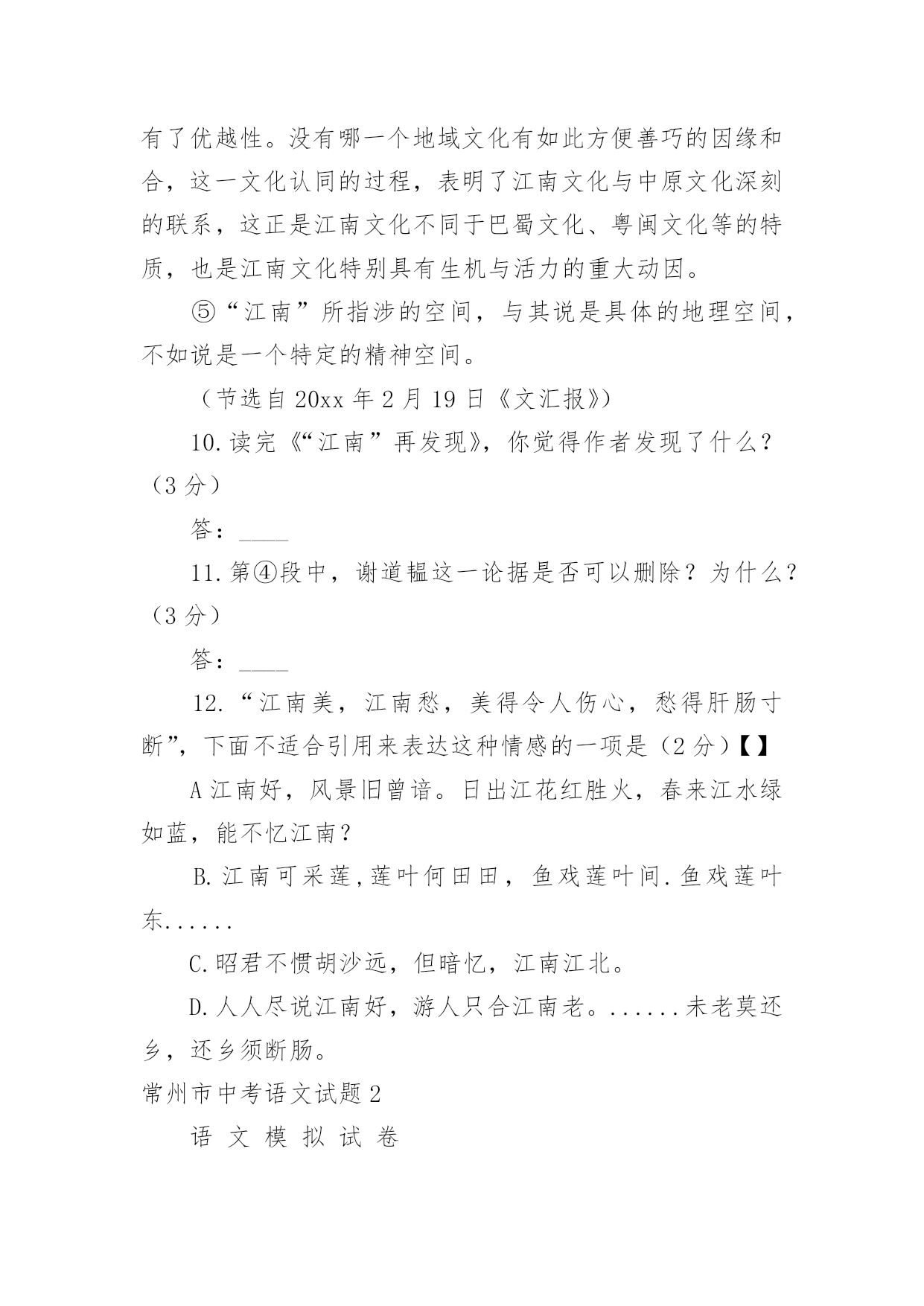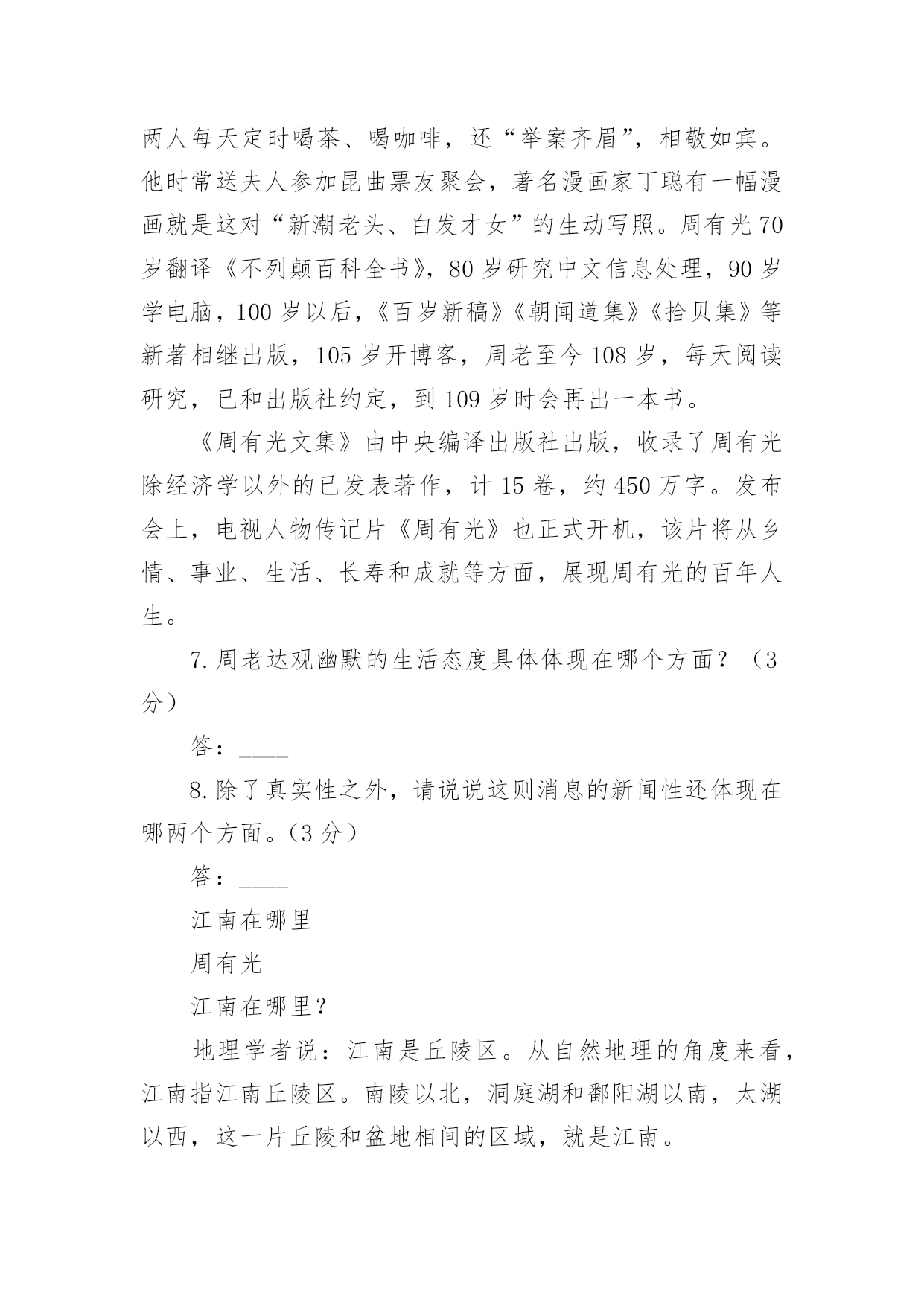 常州市中考语文试题常州市中考语文试题无论是在学校还是在社会中,我们都离不开试题,借助试题可以检验考试者是否已经具备获得某种资格的基本能力。一份好的试题都具备什么特点呢?以下是小编收集整理的常州市中考语文试题,欢迎大家借鉴与参考,希望对大家有所帮助。常州市中考语文试题1二、阅读理解(共40分)(一)阅读下面一组短文,完成7~12题。(共17分)《周有光文集》首发式在常州举行常州26日消息,20xx年5月25日,“周有光与中国语文现代化”学术研讨会暨《周有光文集》首发、电视片《周有光》开机仪式在周有光故乡江苏常州举行。发布会当天,108岁高龄的周有光先生未能到场,他在视频中感激常州带给他的快乐童年。周有光是著名语言学家、文学家、经济学家。早年在美工作期间自学拼音学,曾与爱因斯坦面谈。解放后,主持设计汉语拼音方案,被誉为汉语拼音之父,有“周百科”的雅号。周有光生于清朝光绪年间的1906年,朋友称他为“古人”,是名副其实的“四朝元老”。他回应:“上帝太忙,把我忘掉了。”周老达观幽默,学识渊博。夫人张允和在世时,两人每天定时喝茶、喝咖啡,还“举案齐眉”,相敬如宾。他时常送夫人参加昆曲票友聚会,著名漫画家丁聪有一幅漫画就是这对“新潮老头、白发才女”的生动写照。周有光70岁翻译《不列颠百科全书》,80岁研究中文信息处理,90岁学电脑,100岁以后,《百岁新稿》《朝闻道集》《拾贝集》等新著相继出版,105岁开博客,周老至今108岁,每天阅读研究,已和出版社约定,到109岁时会再出一本书。《周有光文集》由中央编译出版社出版,收录了周有光除经济学以外的已发表著作,计15卷,约450万字。发布会上,电视人物传记片《周有光》也正式开机,该片将从乡情、事业、生活、长寿和成就等方面,展现周有光的百年人生。7.周老达观幽默的生活态度具体体现在哪个方面?(3分)答:____8.除了真实性之外,请说说这则消息的新闻性还体现在哪两个方面。(3分)答:____江南在哪里周有光江南在哪里?地理学者说:江南是丘陵区。从自然地理的角度来看,江南指江南丘陵区。南陵以北,洞庭湖和鄱阳湖以南,太湖以西,这一片丘陵和盆地相间的区域,就是江南。气象学者说:江南是梅雨区。梅雨所覆盖的地区就是江南。淮河以南,南陵以北,湖北宜昌以东,直至大海,都是江南。语言学者说:江南是方言区。南方六个方言区都是江南,其中吴语区(江浙)是狭义的江南。历史学者说:江南是历史沿革。经济学者说:江南是财富区。文学家说:江南是人间天堂。杜牧《寄扬州韩绰判官》:青山隐隐水迢迢,秋尽江南草未凋,二十四桥明月夜,玉人何处教吹箫?扬州在江北,怎么也是江南?(选自《选贝集》,有改动)9.“江南”概念有广义和狭义之分,本文主张的是哪一种?为什么?(3分)答:____“江南”再发现胡晓明①中国历史与文学的文献中可见一种特殊的共同心理嗜尚:喜好江南。长期以来,虚虚实实,或浓或淡,强化着一种超乎一般所谓地域文化的认同,即可谓“江南认同”。“苏常熟,天下足”的谚语,海内外流传。“暮春三月,江南草长,杂花生树,群莺乱飞”,已成为中国永远的抒情美典。②中国文学悠久的传统中,一直隐隐相传着十分重要的江南意象。入骨的相思,永续的乡愁,是江南不变的芬芳迷魅。男女之思,友朋之念,进而寄托家国君臣之思,相互重叠着、涵化着,渐成江南意象的深层含义。苏东坡诗:“犹做江南未归客”,姜夔“昭君不谙胡沙远,但暗忆,江南江北”,以及吴梅村“世间何物是江南”才有了厚重的文化内涵。因此,江南意象是江南认同的一个重要的部分。作为江南认同的江南意象,含蓄而动人地揭示了江南认同的底蕴:家国之爱。③中国最早的地域认同是中原认同,从西周时代即已经有中原中心的意识。一直到三国时代,江东孙吴,三分天下有其一,江南地域才正式登上了历史的舞台。到了东晋,政治中心南移,士人大批南渡,政治合法性的权威在江南地域渐趋稳固。④所谓江南文化,实际上分为两个部分,一是北来的,是发源于洛阳而被侨民带到江南的文化,这是中原移民文化。如谢道韫(东晋才女,谢安侄女,王羲之儿媳)祖籍河南,自其祖南迁以后到她已是第三代侨民,一生都在江南,她的作品自然归在南方文学里了,但她继承的其实是在北方就已形成的'强大的家族文学传统。二是南方人向由政治中心迁来的大批北方人学习的结果,几代以后便渐渐置换成江南意识,是经过模仿、交融、选择、消化的文化习得。这似乎可称之为江南文化之二源。两部分之间形成一种奇妙的张力:一方面是在地的、生根的、非异己的,另一方面又是有本的、深厚的、高级的;前者使文化免除了排他性,后者使文化具有了优越性。没有哪一个地域文化有如此方便善巧的因缘和合,这一文化认同的过程,表明了江南文化与中原文化深刻的联系,这正是江南文化不同于巴蜀文化、粤闽文化等的特质,也是江南文化特别具有生机与活力的重大动