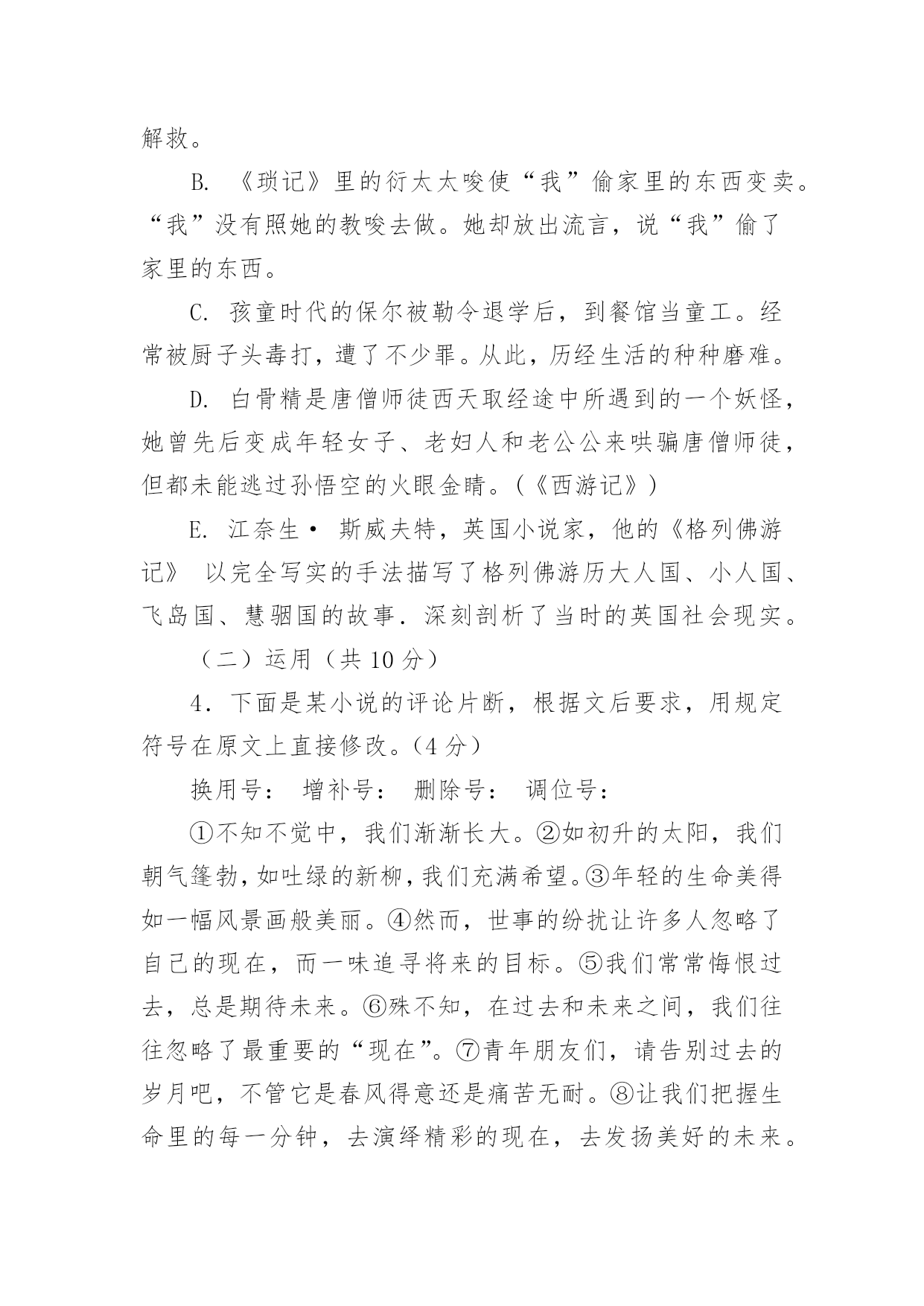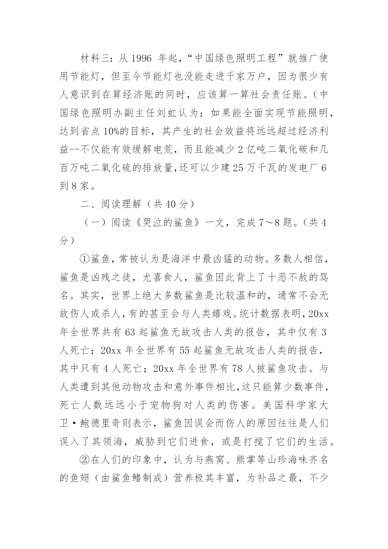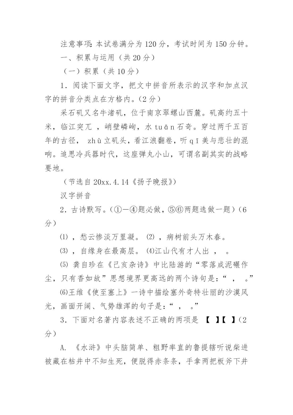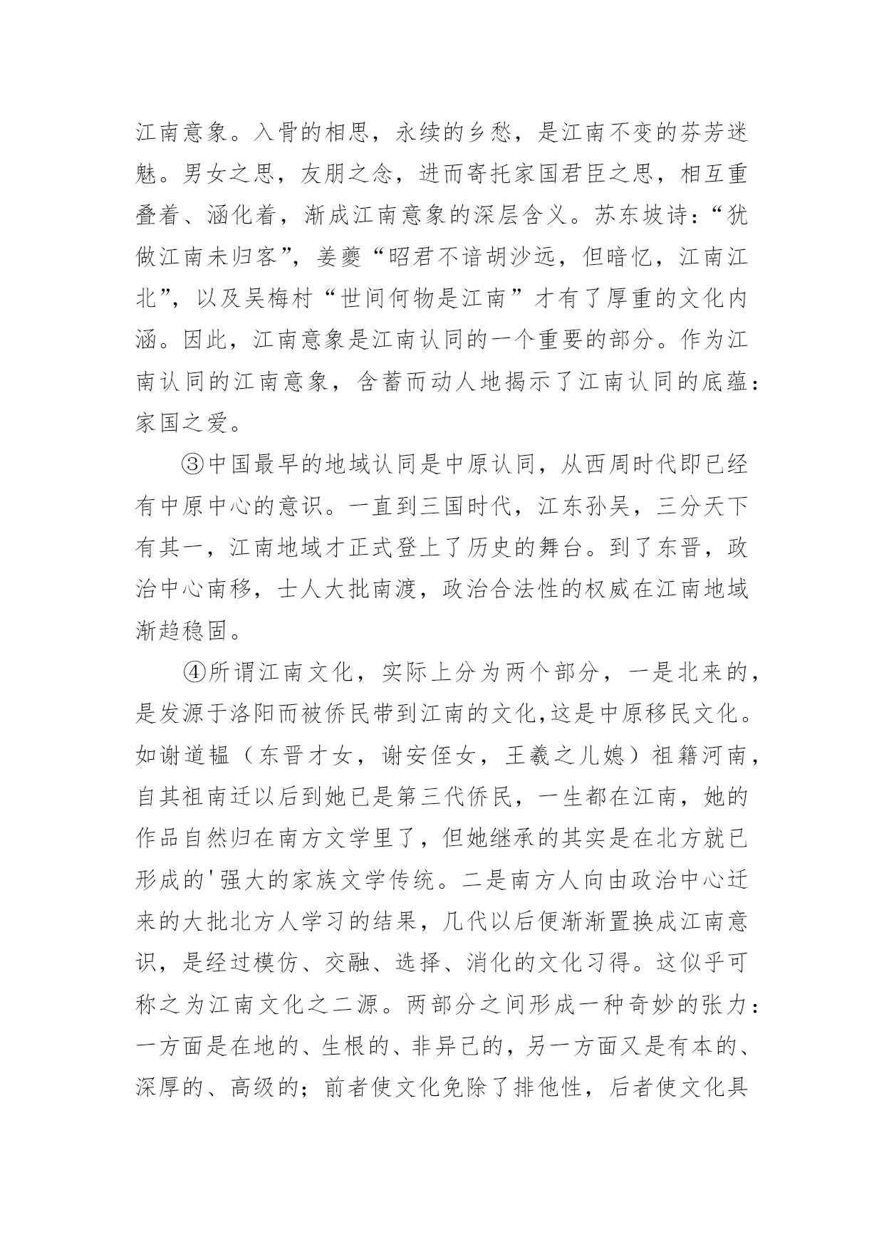 常州市中考语文试题常州市中考语文试题无论是在学校还是在社会中,我们都离不开试题,借助试题可以检验考试者是否已经具备获得某种资格的基本能力。一份好的试题都具备什么特点呢?以下是小编收集整理的常州市中考语文试题,欢迎大家借鉴与参考,希望对大家有所帮助。常州市中考语文试题1二、阅读理解(共40分)(一)阅读下面一组短文,完成7~12题。(共17分)《周有光文集》首发式在常州举行常州26日消息,20xx年5月25日,“周有光与中国语文现代化”学术研讨会暨《周有光文集》首发、电视片《周有光》开机仪式在周有光故乡江苏常州举行。发布会当天,108岁高龄的周有光先生未能到场,他在视频中感激常州带给他的快乐童年。周有光是著名语言学家、文学家、经济学家。早年在美工作期间自学拼音学,曾与爱因斯坦面谈。解放后,主持设计汉语拼音方案,被誉为汉语拼音之父,有“周百科”的雅号。周有光生于清朝光绪年间的1906年,朋友称他为“古人”,是名副其实的“四朝元老”。他回应:“上帝太忙,把我忘掉了。”周老达观幽默,学识渊博。夫人张允和在世时,两人每天定时喝茶、喝咖啡,还“举案齐眉”,相敬如宾。他时常送夫人参加昆曲票友聚会,著名漫画家丁聪有一幅漫画就是这对“新潮老头、白发才女”的生动写照。周有光70岁翻译《不列颠百科全书》,80岁研究中文信息处理,90岁学电脑,100岁以后,《百岁新稿》《朝闻道集》《拾贝集》等新著相继出版,105岁开博客,周老至今108岁,每天阅读研究,已和出版社约定,到109岁时会再出一本书。《周有光文集》由中央编译出版社出版,收录了周有光除经济学以外的已发表著作,计15卷,约450万字。发布会上,电视人物传记片《周有光》也正式开机,该片将从乡情、事业、生活、长寿和成就等方面,展现周有光的百年人生。7.周老达观幽默的生活态度具体体现在哪个方面?(3分)答:____8.除了真实性之外,请说说这则消息的新闻性还体现在哪两个方面。(3分)答:____江南在哪里周有光江南在哪里?地理学者说:江南是丘陵区。从自然地理的角度来看,江南指江南丘陵区。南陵以北,洞庭湖和鄱阳湖以南,太湖以西,这一片丘陵和盆地相间的区域,就是江南。气象学者说:江南是梅雨区。梅雨所覆盖的地区就是江南。淮河以南,南陵以北,湖北宜昌以东,直至大海,都是江南。语言学者说:江南是方言区。南方六个方言区都是江南,其中吴语区(江浙)是狭义的江南。历史学者说:江南是历史沿革。经济学者说:江南是财富区。文学家说:江南是人间天堂。杜牧《寄扬州韩绰判官》:青山隐隐水迢迢,秋尽江南草未凋,二十四桥明月夜,玉人何处教吹箫?扬州在江北,怎么也是江南?(选自《选贝集》,有改动)9.“江南”概念有广义和狭义之分,本文主张的是哪一种?为什么?(3分)答:____“江南”再发现胡晓明①中国历史与文学的文献中可见一种特殊的共同心理嗜尚:喜好江南。长期以来,虚虚实实,或浓或淡,强化着一种超乎一般所谓地域文化的认同,即可谓“江南认同”。“苏常熟,天下足”的谚语,海内外流传。“暮春三月,江南草长,杂花生树,群莺乱飞”,已成为中国永远的抒情美典。②中国文学悠久的传统中,一直隐隐相传着十分重要的江南意象。入骨的相思,永续的乡愁,是江南不变的芬芳迷魅。男女之思,友朋之念,进而寄托家国君臣之思,相互重叠着、涵化着,渐成江南意象的深层含义。苏东坡诗:“犹做江南未归客”,姜夔“昭君不谙胡沙远,但暗忆,江南江北”,以及吴梅村“世间何物是江南”才有了厚重的文化内涵。因此,江南意象是江南认同的一个重要的部分。作为江南认同的江南意象,含蓄而动人地揭示了江南认同的底蕴:家国之爱。③中国最早的地域认同是中原认同,从西周时代即已经有中原中心的意识。一直到三国时代,江东孙吴,三分天下有其一,江南地域才正式登上了历史的舞台。到了东晋,政治中心南移,士人大批南渡,政治合法性的权威在江南地域渐趋稳固。④所谓江南文化,实际上分为两个部分,一是北来的,是发源于洛阳而被侨民带到江南的文化,这是中原移民文化。如谢道韫(东晋才女,谢安侄女,王羲之儿媳)祖籍河南,自其祖南迁以后到她已是第三代侨民,一生都在江南,她的作品自然归在南方文学里了,但她继承的其实是在北方就已形成的'强大的家族文学传统。二是南方人向由政治中心迁来的大批北方人学习的结果,几代以后便渐渐置换成江南意识,是经过模仿、交融、选择、消化的文化习得。这似乎可称之为江南文化之二源。两部分之间形成一种奇妙的张力:一方面是在地的、生根的、非异己的,另一方面又是有本的、深厚的、高级的;前者使文化免除了排他性,后者使文化具有了优越性。没有哪一个地域文化有如此方便善巧的因缘和合,这一文化认同的过程,表明了江南文化与中原文化深刻的联系,这正是江南文化不同于巴蜀文化、粤闽文化等的特质,也是江南文化特别具有生机与活力的重大动