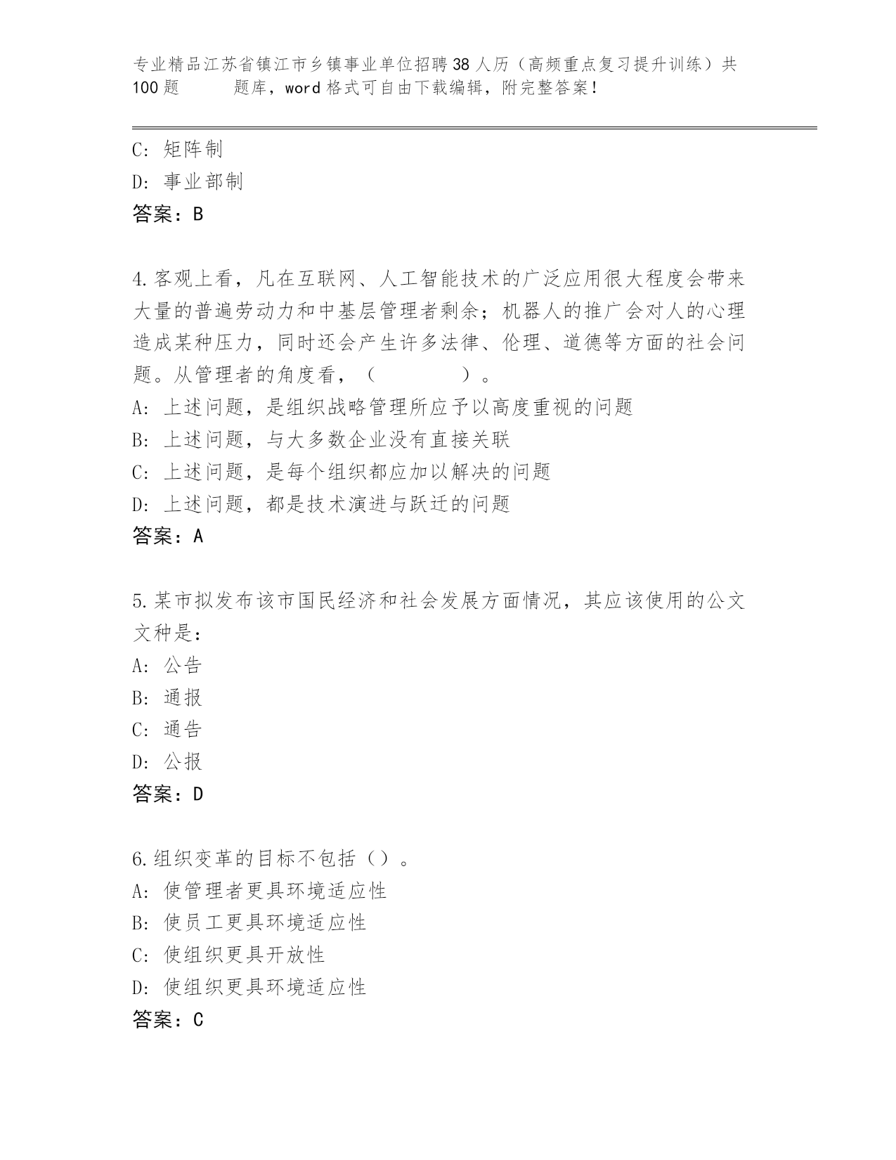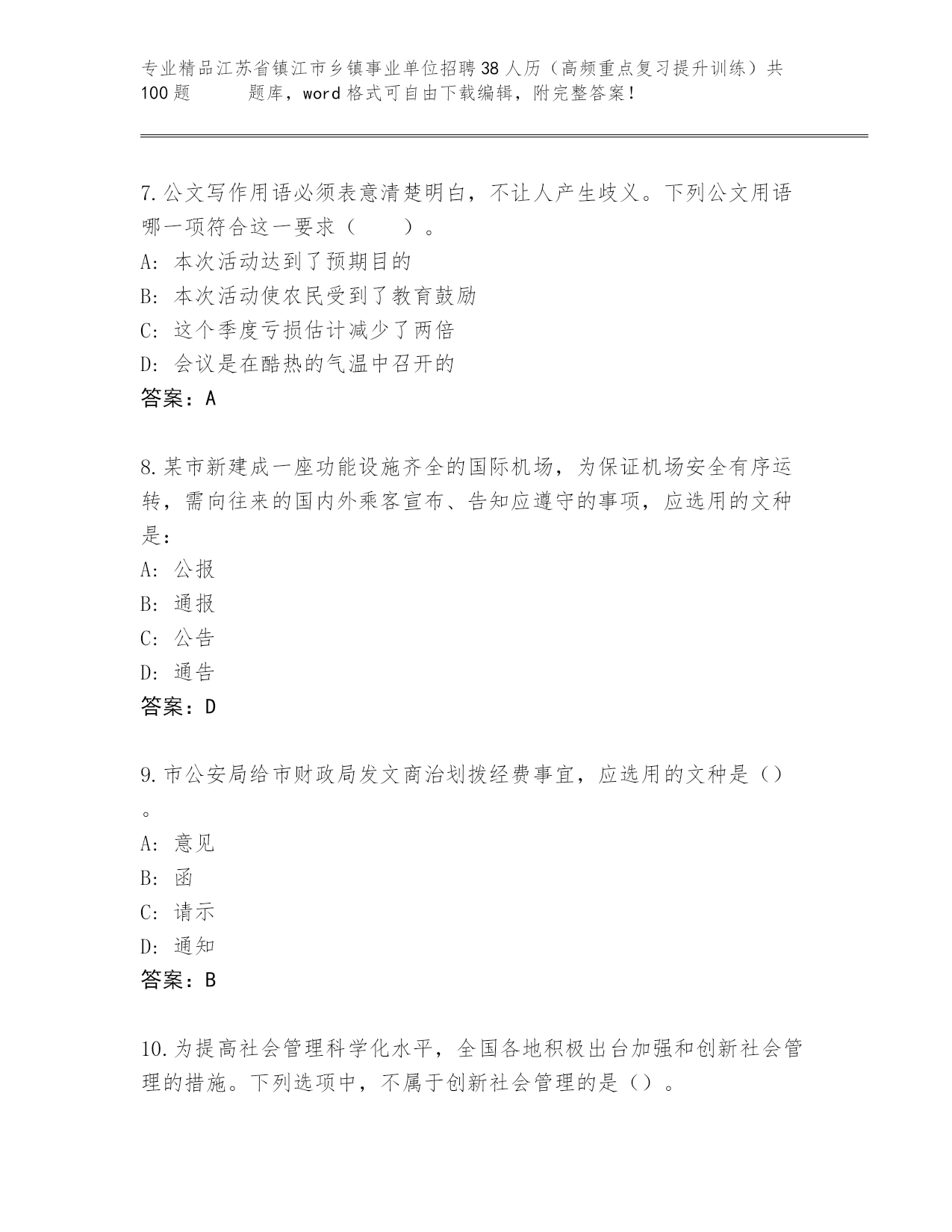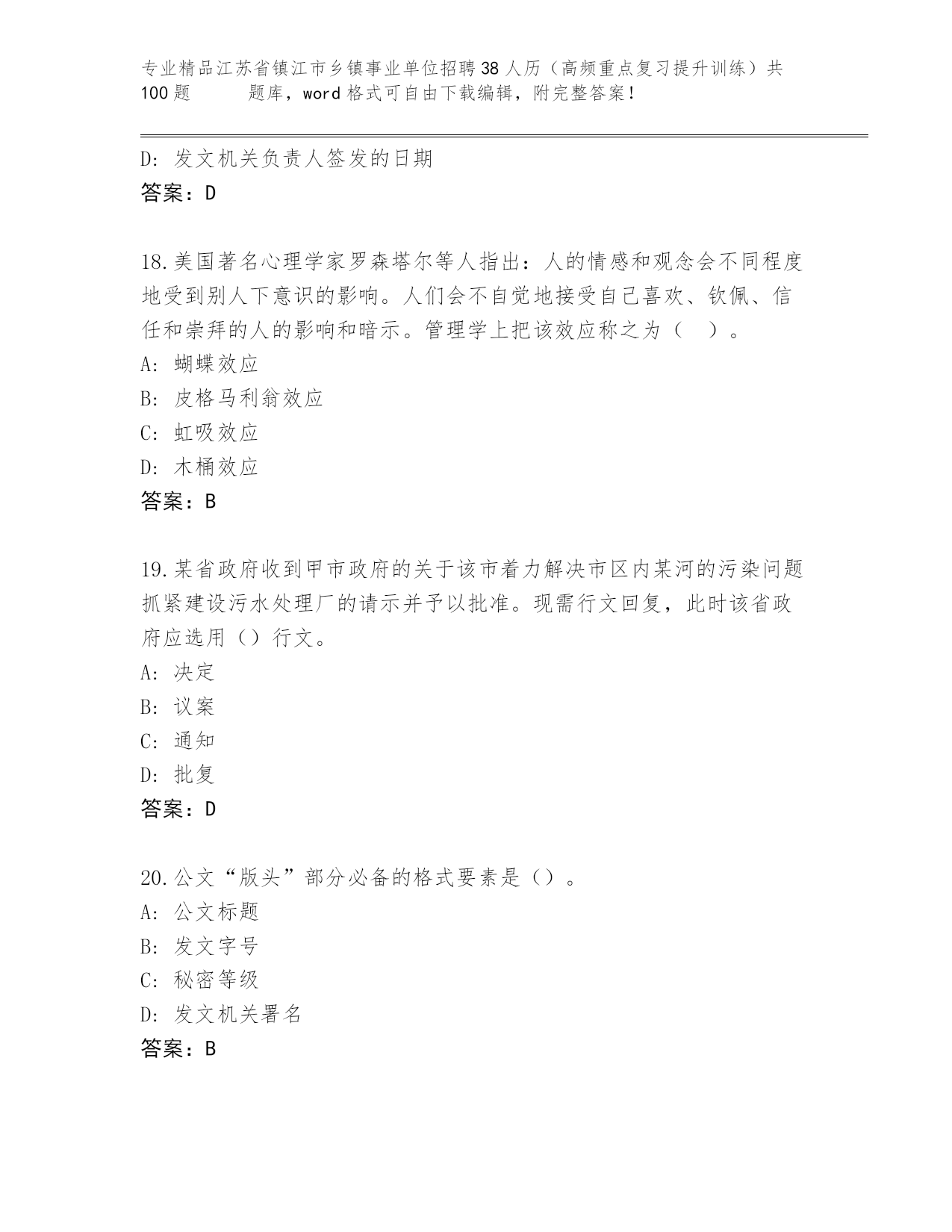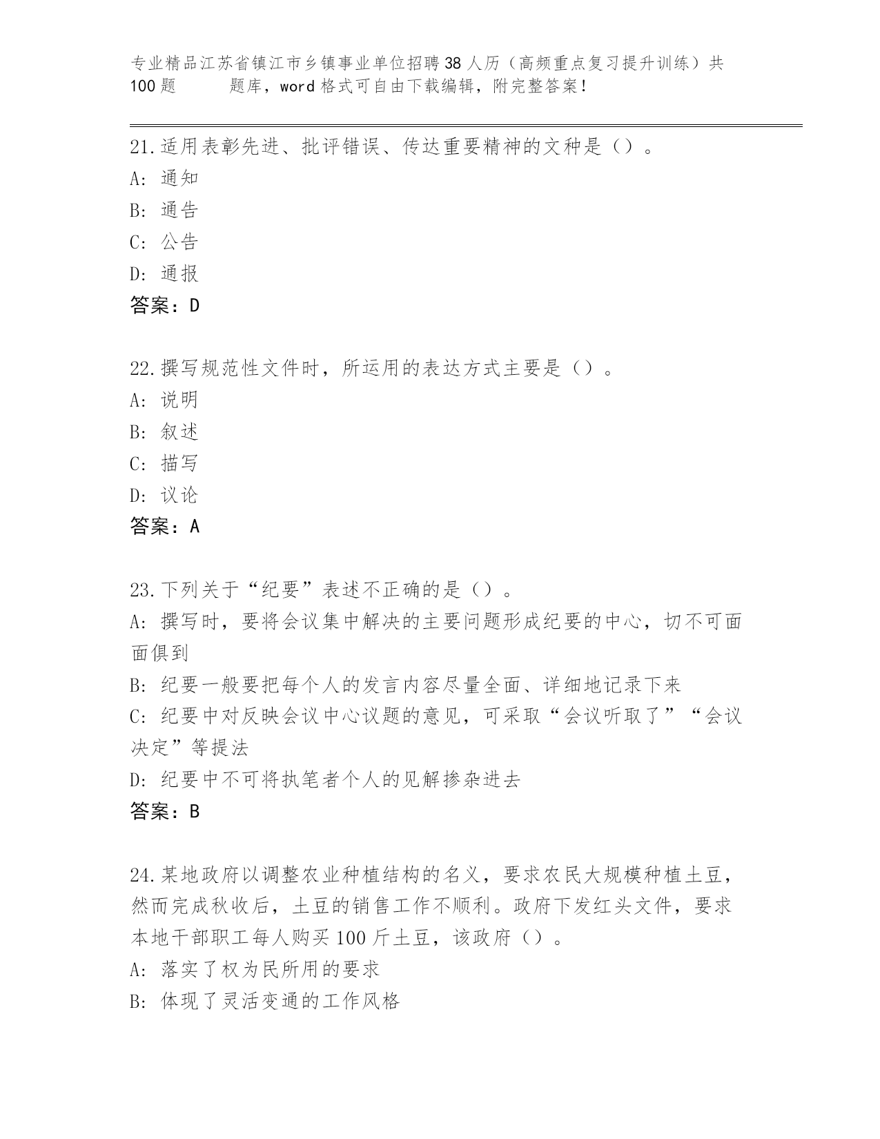 精品江苏省镇江市乡镇事业单位招聘38人历(高频重点复习提升训练)共100题 真题精品加答案