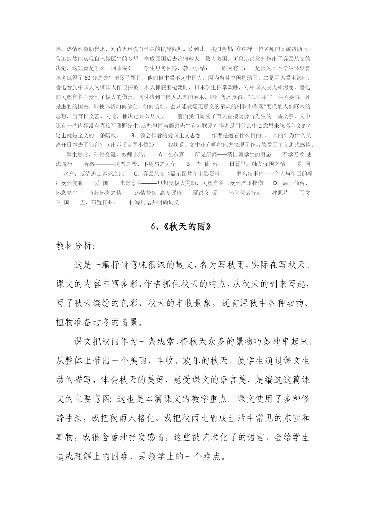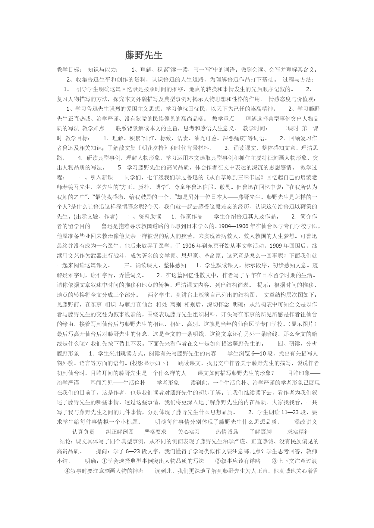 藤野先生教学目标:知识与能力:1、理解、积累“读一读,写一写”中的词语。做到会读、会写并理解其含义。2、收集鲁迅生平和创作的资料,认识鲁迅的人生道路,为理解鲁迅作品打下基础。过程与方法:1、引导学生明确这篇回忆录是按照时间的推移、地点的转换和事情发生的先后顺序记叙的。2、复习人物描写的方法,探究本文外貌描写及典型事例对揭示人物思想和性格的作用。情感态度与价值观:1、学习鲁迅先生强烈的爱国主义思想,学习他忧国忧民、以天下为己任的崇高精神。2、学习藤野先生正直热诚、治学严谨、没有狭隘的民族偏见的高尚品格。教学重点理解选择典型事例突出人物品质的写法教学难点联系背景解读本文的主旨,思考和感悟人生意义。教学时间:二课时第一课时教学目标:1.理解、积累“绯红、标致、诘责、油光可鉴、深恶痛疾”等词语。2.回顾复习作者鲁迅及相关知识;了解散文集《朝花夕拾》和时代背景材料。3.诵读课文,整体感知文意,理清思路。4.研读典型事例,理解人物形象。学习运用本文选取典型事例和抓住主要特征刻画人物形象、突出人物品质的写法。5.学习藤野先生的高尚品质,体会作者在文中表达的深沉的思想感情。教学过程:一、引入新课同学们,七年级我们学过鲁迅的《从百草原到三味书屋》回忆起自己的启蒙老师寿镜吾先生,老先生的“方正、质朴、博学”,令童年鲁迅信服、敬畏。但鲁迅在回忆中说:“在我所认为我师的之中”,“最使我感激,给我鼓励的一个。”却是另外一位日本人——藤野先生。藤野先生是怎样的一个人?是什么让鲁迅这样深情感念呢?今天,我们就一起去感受这段难忘的经历、认识这位给鲁迅以鞭策的先生。(出示文题、作者)二、资料助读1.作家作品学生介绍鲁迅其人及作品。2.简介作者的留学目的鲁迅是抱着寻求救国道路的心愿到日本学医的。1904—1906年在仙台医学专门学校学医,他原准备毕业回来救治像他父亲一样被误的病人的疾苦,来实现治病救人,救人救国的人生梦想。可鲁迅最终并没有成为一名医生,他后来放弃了医学,于1906年到东京开始从事文学活动,1909年回国后,继续用文艺作为武器进行战斗,成为著名的文学家、思想家、革命家。这究竟是怎么一回事呢?下面我们就一起来阅读这篇课文。三、诵读课文,整体感知1.学生默读课文,标示段序,初步感知文意。疏解疑难字词,读准字音,弄懂词义。2.在这篇回忆性散文中,作者写了早年在日本留学时期的生活。请你依据文章叙述中时间的推移和地点的转换,理清课文内容,列出结构简表。提示:根据时间的推移、地点的转换将全文分成三个部分。两名学生,到讲台上板演自己列出的结构图。文章结构层次图如下:见藤野前,在东京相识与藤野在仙台相处离别相别后,深切怀念明确:从结构表中可知全文是以作者与藤野先生的交往为叙事线索的,围绕表现藤野先生组织材料。开头写在东京的所见所感是作者往仙台的缘由,接着写到仙台后与藤野先生的相识、相处、离别。这就是当年的仙台医学专门学校。(显示图片)最后写离开仙台后对藤野先生的怀念。这是全文的一条明线。这篇文章还有另外一条暗线,那么全文的暗线是什么呢?我们先按下暂且不表。下面先来看作者在文中是如何描述藤野先生的。四、研读,分析藤野形象1.学生采用跳读方式。阅读有关写藤野先生的内容学生浏览6—10段,找出有关描写人物外貌、语言等方面的语句。(投影显示如下)跳读课文,找出文中作者关于藤野先生的描写,说说作者初到仙台时,目睹耳闻的藤野先生是一个什么样的人课文如何描写藤野先生的形象?目睹印象——治学严谨耳闻亲见——生活俭朴学者形象读到此,一个生活俭朴、治学严谨的学者形象已展现在我们的目前了,这是作者,也是我们读者对藤野先生的初步了解。让我们继续读下去,看作者为我们叙述了藤野先生的哪些事情,透过这些事情,我们将更深入地了解藤野先生的内在品质。大家找找看,一共写了我与藤野先生之间的几件事情,分别体现了藤野先生什么思想品质。2.学生朗读11—23段,要求学生给每件事情拟一个小标题。明确每件事情分别体现了藤野先生什么思想品质。添改讲义———认真负责纠正解剖图——严格要求关心实习———热情诚恳了解裹脚———求实精神结论:课文具体写了四个典型事例,从不同的侧面表现了藤野先生治学严谨、正直热诚、没有民族偏见的高贵品质。提问:学了6—23段文字,我们懂得了学写类似作文要注意哪几点?学生思考回答,教师小结。明确:①学会选择典型事例突出人物品质的写法②叙事应该有详略③上下文注意过渡④叙事时要注意刻画人物的神态读到此,我们更深地了解到藤野先生为人正直,他真诚地关心着鲁迅,热情地帮助鲁迅,对待鲁迅没有丝毫的民族偏见。读到此,我们会想:在这样一位老师的真诚帮助下,鲁迅定然能实现自己做医生的梦想,学成回国后去治病救人,救人救国。可鲁迅最终却作出了弃医从文的决定,这究竟是怎么一回事呢?学生思考回答,教师小结:原因有