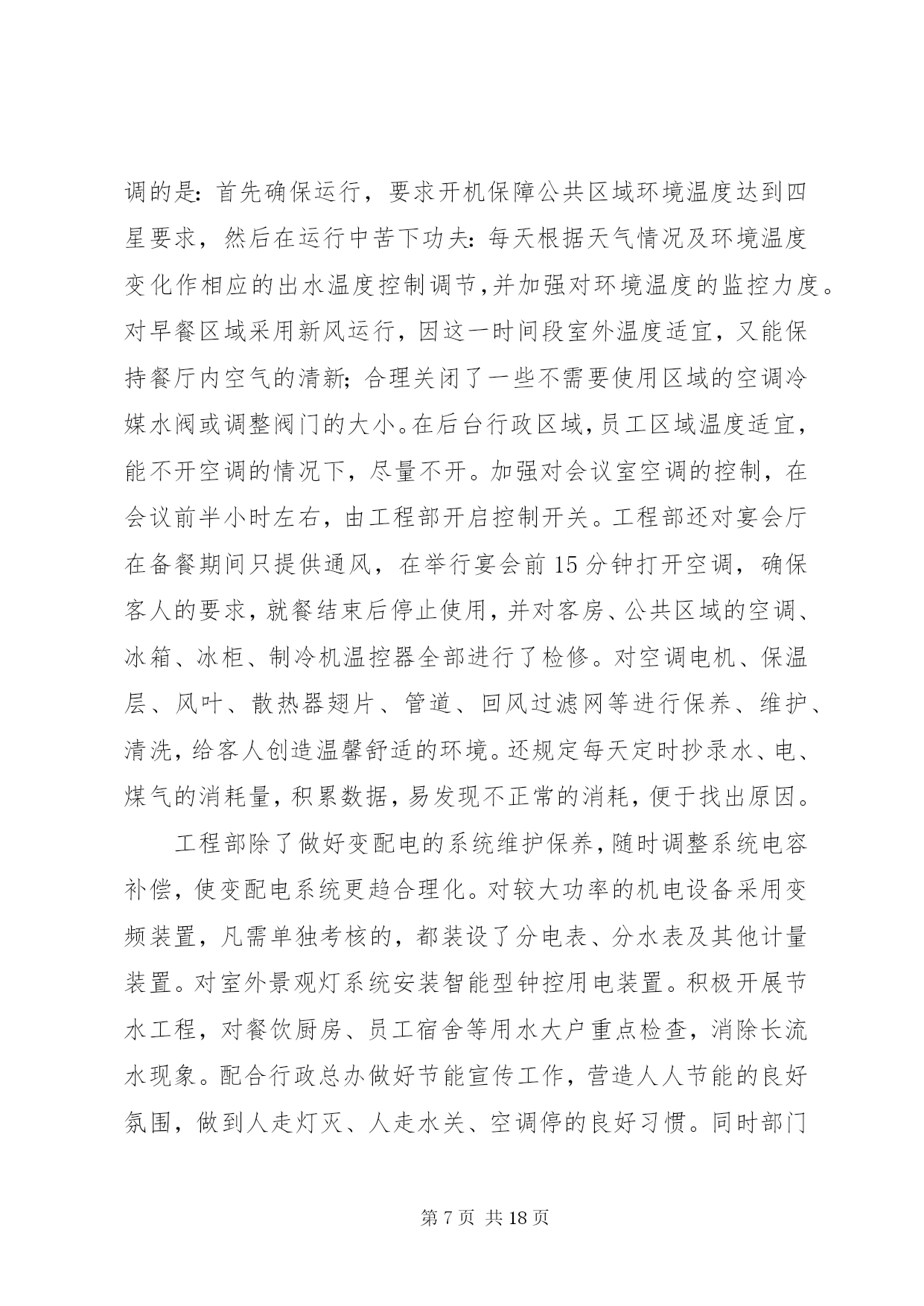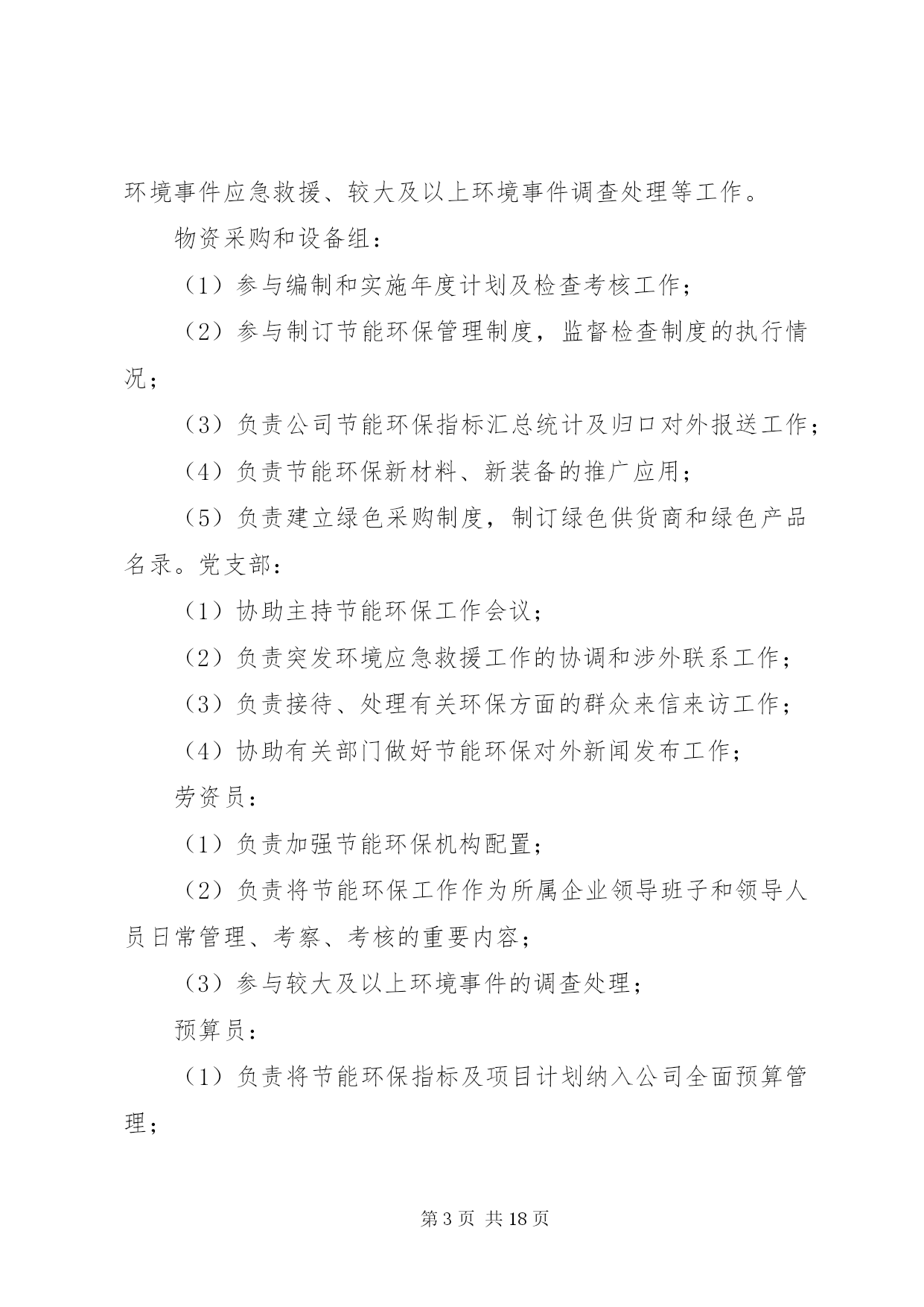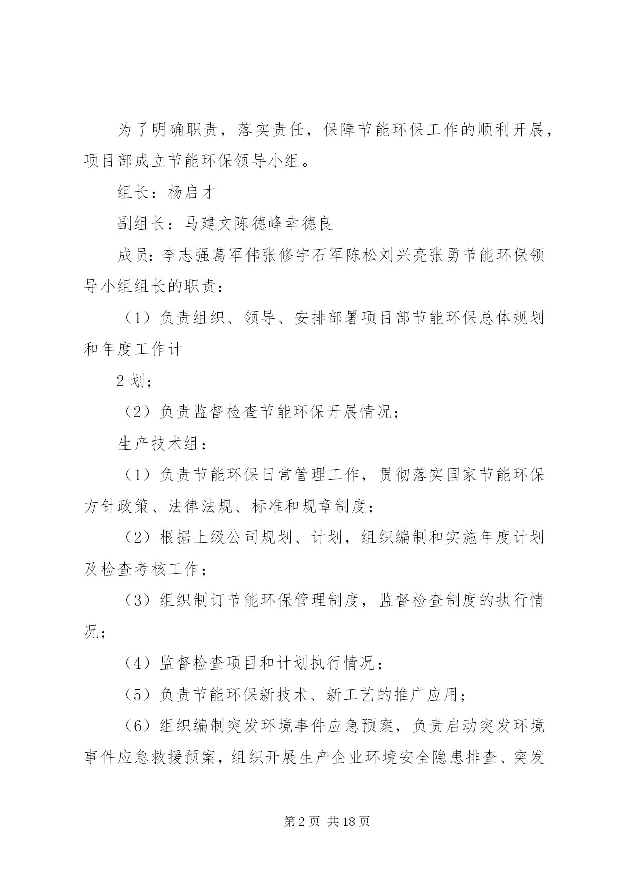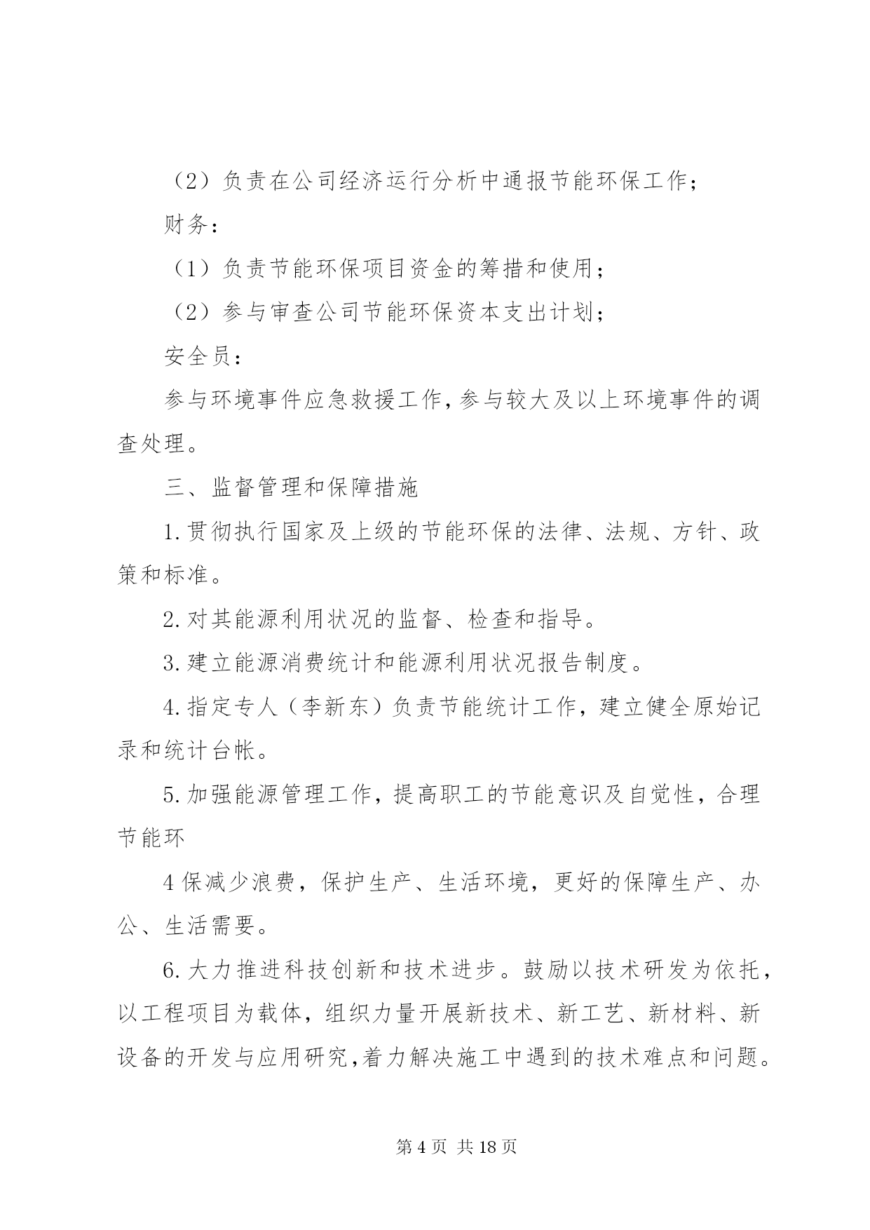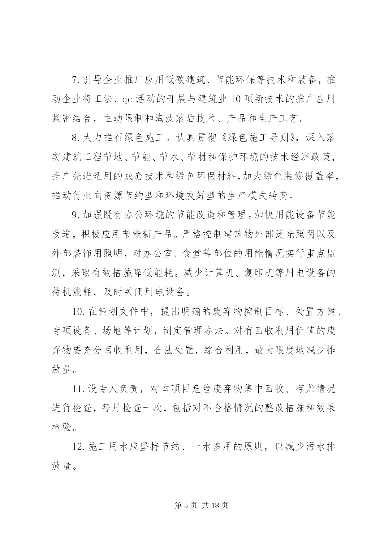 第PAGE\*Arabic\*MERGEFORMAT18页共NUMPAGES\*MERGEFORMAT18页节能环保工作措施审批人:日期:月日1富甲项目部节能环保措施富甲项目部节能环保措施一、节能环保的目的及指导思想为贯彻落实国家节能环保有关政策要求、上级公司有关制度要求,建设“资源节约型”和“环境友好型”项目部,实现环境一流目标,持续提高节能环保工作水平,按照合理用能的原则,加强节能管理,推进技术进步,提高能源利用效率,推行清洁文明生产,降低成本,提高效益,减少有害物质的排放,预防环境污染和其它公害。特制订本措施。指导思想。全面贯彻落实科学发展观,坚持节能降耗减污增效的原则,以大幅提高能源利用效率,降低能源、资源消耗,减少污染物排放为核心,以加快技术进步为根本,以法治为保障,不断夯实基础管理,建立严格的管理制度、有效的激励和约束机制,规范能源统计,完善能源计量,强化节能环保宣传,依靠科技加快节能环保技术开发和维护,坚持经济与环境保护协调发展,促进企业的健康发展,实现安全高效和谐发展新局面,全面贯彻落实资源节约的基本国策。二、领导小组及职责为了明确职责,落实责任,保障节能环保工作的顺利开展,项目部成立节能环保领导小组。组长:杨启才副组长:马建文陈德峰幸德良成员:李志强葛军伟张修宇石军陈松刘兴亮张勇节能环保领导小组组长的职责:(1)负责组织、领导、安排部署项目部节能环保总体规划和年度工作计2划;(2)负责监督检查节能环保开展情况;生产技术组:(1)负责节能环保日常管理工作,贯彻落实国家节能环保方针政策、法律法规、标准和规章制度;(2)根据上级公司规划、计划,组织编制和实施年度计划及检查考核工作;(3)组织制订节能环保管理制度,监督检查制度的执行情况;(4)监督检查项目和计划执行情况;(5)负责节能环保新技术、新工艺的推广应用;(6)组织编制突发环境事件应急预案,负责启动突发环境事件应急救援预案,组织开展生产企业环境安全隐患排查、突发环境事件应急救援、较大及以上环境事件调查处理等工作。物资采购和设备组:(1)参与编制和实施年度计划及检查考核工作;(2)参与制订节能环保管理制度,监督检查制度的执行情况;(3)负责公司节能环保指标汇总统计及归口对外报送工作;(4)负责节能环保新材料、新装备的推广应用;(5)负责建立绿色采购制度,制订绿色供货商和绿色产品名录。党支部:(1)协助主持节能环保工作会议;(2)负责突发环境应急救援工作的协调和涉外联系工作;(3)负责接待、处理有关环保方面的群众来信来访工作;(4)协助有关部门做好节能环保对外新闻发布工作;劳资员:(1)负责加强节能环保机构配置;(2)负责将节能环保工作作为所属企业领导班子和领导人员日常管理、考察、考核的重要内容;(3)参与较大及以上环境事件的调查处理;预算员:(1)负责将节能环保指标及项目计划纳入公司全面预算管理;(2)负责在公司经济运行分析中通报节能环保工作;财务:(1)负责节能环保项目资金的筹措和使用;(2)参与审查公司节能环保资本支出计划;安全员:参与环境事件应急救援工作,参与较大及以上环境事件的调查处理。三、监督管理和保障措施1.贯彻执行国家及上级的节能环保的法律、法规、方针、政策和标准。2.对其能源利用状况的监督、检查和指导。3.建立能源消费统计和能源利用状况报告制度。4.指定专人(李新东)负责节能统计工作,建立健全原始记录和统计台帐。5.加强能源管理工作,提高职工的节能意识及自觉性,合理节能环4保减少浪费,保护生产、生活环境,更好的保障生产、办公、生活需要。6.大力推进科技创新和技术进步。鼓励以技术研发为依托,以工程项目为载体,组织力量开展新技术、新工艺、新材料、新设备的开发与应用研究,着力解决施工中遇到的技术难点和问题。7.引导企业推广应用低碳建筑、节能环保等技术和装备,推动企业将工法、qc活动的开展与建筑业10项新技术的推广应用紧密结合,主动限制和淘汰落后技术、产品和生产工艺。8.大力推行绿色施工。认真贯彻《绿色施工导则》,深入落实建筑工程节地、节能、节水、节材和保护环境的技术经济政策,推广先进适用的成套技术和绿色环保材料,加大绿色装修覆盖率,推动行业向资源节约型和环境友好型的生产模式转变。9.加强既有办公环境的节能改造和管理。加快用能设备节能改造,积极应用节能新产品。严格控制建筑物外部泛光照明以及外部装饰用照明,对办公室、食堂等部位的用能情况实行重点监测,采取有效措施降低能耗。减少计算机、复印机等用电设备的待机能耗,及时关闭用电设备。10.在策划文件中,提出明确的废弃物控制目标、处置方案、专项设备、场地等计划,制定管理办法。对有回收利用价值的废弃物要充分回收利用,合法处置,综合利用,最大限度地减少排放量。11.设专人负责,对本项目危险