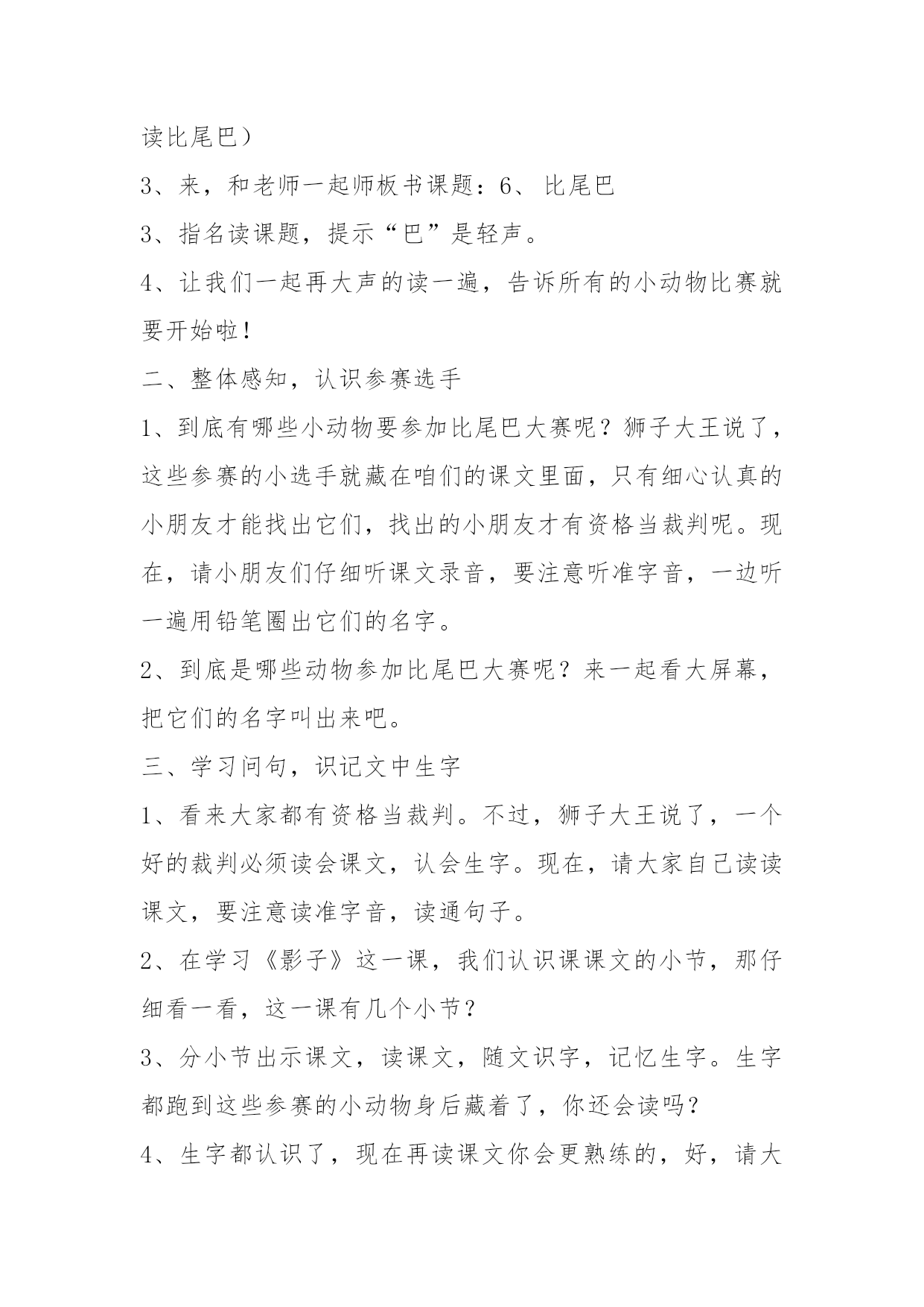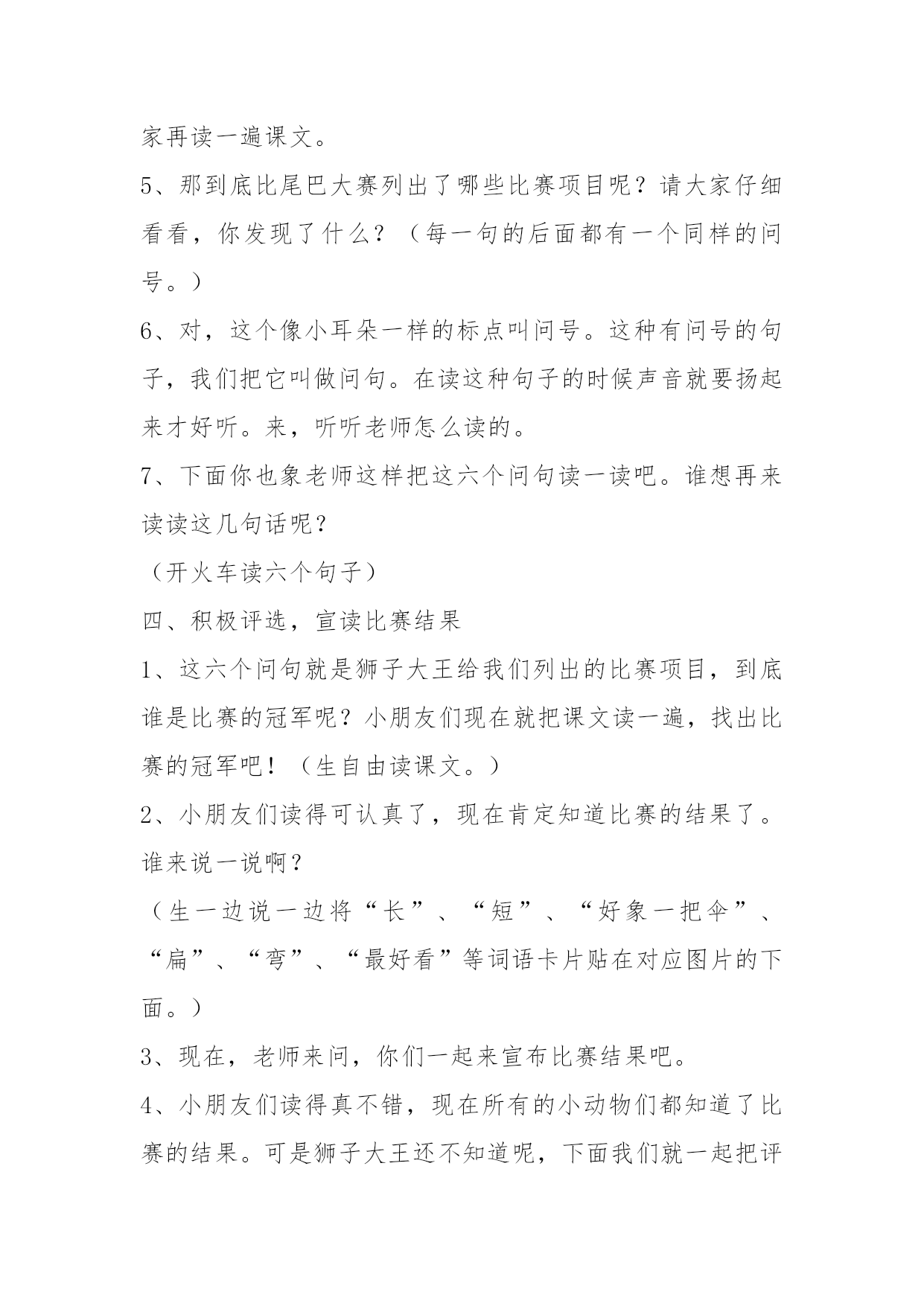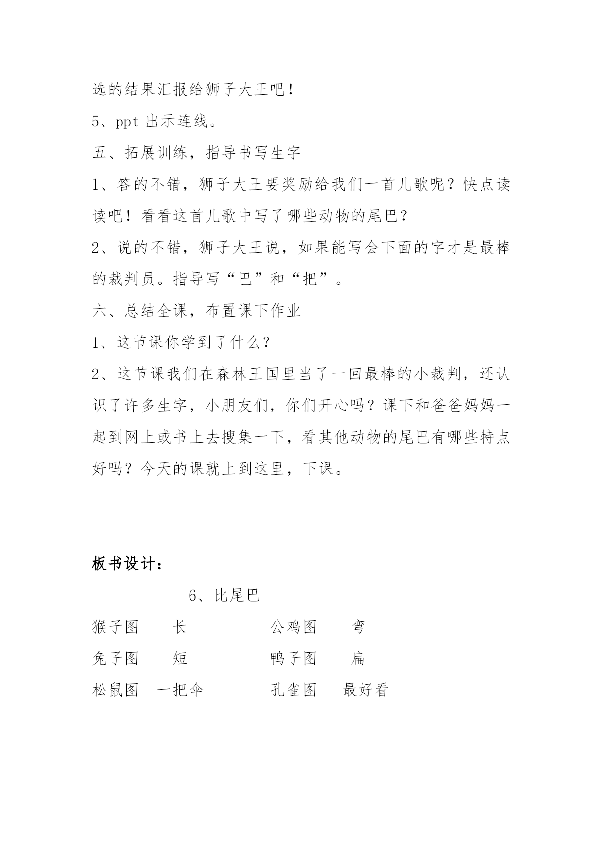 比尾巴石嘴山市第十五小学李晶教学目标:认识“比、尾”等11个生字和提手旁、八字头2个偏旁;会写“长、比”等4个字和竖提一个笔画。朗读课文,读好问句的语气。背诵课文,了解一些动物尾巴的特点。4、模仿课文一问一答得形式做问答游戏,积累语言表达。教学重点:朗读课文,背诵课文。教学难点:读好问句的语气;注意人字头和八字头的区别。课前准备:六种动物的图片,词语、生字卡片。HYPERLINK"http://www.zengmin.net/"\t"http://blog.sina.com.cn/s/_blank"教学过程:一、创设情境,揭示课文题目1、上课!告诉大家一个好消息,昨天晚上,森林王国里的狮子大王给我打来电话,它说森林王国里今天要进行一场特别的比赛,想请咱们小朋友做小裁判,你们想去吗?(生:想)2、咱们现在就出发吧!你们看,小动物们要比什么呢?(齐读比尾巴)3、来,和老师一起师板书课题:6、比尾巴3、指名读课题,提示“巴”是轻声。4、让我们一起再大声的读一遍,告诉所有的小动物比赛就要开始啦!二、整体感知,认识参赛选手1、到底有哪些小动物要参加比尾巴大赛呢?狮子大王说了,这些参赛的小选手就藏在咱们的课文里面,只有细心认真的小朋友才能找出它们,找出的小朋友才有资格当裁判呢。现在,请小朋友们仔细听课文录音,要注意听准字音,一边听一遍用铅笔圈出它们的名字。2、到底是哪些动物参加比尾巴大赛呢?来一起看大屏幕,把它们的名字叫出来吧。三、学习问句,识记文中生字1、看来大家都有资格当裁判。不过,狮子大王说了,一个好的裁判必须读会课文,认会生字。现在,请大家自己读读课文,要注意读准字音,读通句子。2、在学习《影子》这一课,我们认识课课文的小节,那仔细看一看,这一课有几个小节?3、分小节出示课文,读课文,随文识字,记忆生字。生字都跑到这些参赛的小动物身后藏着了,你还会读吗?4、生字都认识了,现在再读课文你会更熟练的,好,请大家再读一遍课文。5、那到底比尾巴大赛列出了哪些比赛项目呢?请大家仔细看看,你发现了什么?(每一句的后面都有一个同样的问号。)6、对,这个像小耳朵一样的标点叫问号。这种有问号的句子,我们把它叫做问句。在读这种句子的时候声音就要扬起来才好听。来,听听老师怎么读的。7、下面你也象老师这样把这六个问句读一读吧。谁想再来读读这几句话呢?(开火车读六个句子)四、积极评选,宣读比赛结果1、这六个问句就是狮子大王给我们列出的比赛项目,到底谁是比赛的冠军呢?小朋友们现在就把课文读一遍,找出比赛的冠军吧!(生自由读课文。)2、小朋友们读得可认真了,现在肯定知道比赛的结果了。谁来说一说啊?(生一边说一边将“长”、“短”、“好象一把伞”、“扁”、“弯”、“最好看”等词语卡片贴在对应图片的下面。)3、现在,老师来问,你们一起来宣布比赛结果吧。4、小朋友们读得真不错,现在所有的小动物们都知道了比赛的结果。可是狮子大王还不知道呢,下面我们就一起把评选的结果汇报给狮子大王吧!5、ppt出示连线。五、拓展训练,指导书写生字1、答的不错,狮子大王要奖励给我们一首儿歌呢?快点读读吧!看看这首儿歌中写了哪些动物的尾巴?2、说的不错,狮子大王说,如果能写会下面的字才是最棒的裁判员。指导写“巴”和“把”。六、总结全课,布置课下作业1、这节课你学到了什么?2、这节课我们在森林王国里当了一回最棒的小裁判,还认识了许多生字,小朋友们,你们开心吗?课下和爸爸妈妈一起到网上或书上去搜集一下,看其他动物的尾巴有哪些特点好吗?今天的课就上到这里,下课。板书设计:6、比尾巴猴子图长公鸡图弯兔子图短鸭子图扁松鼠图一把伞孔雀图最好看