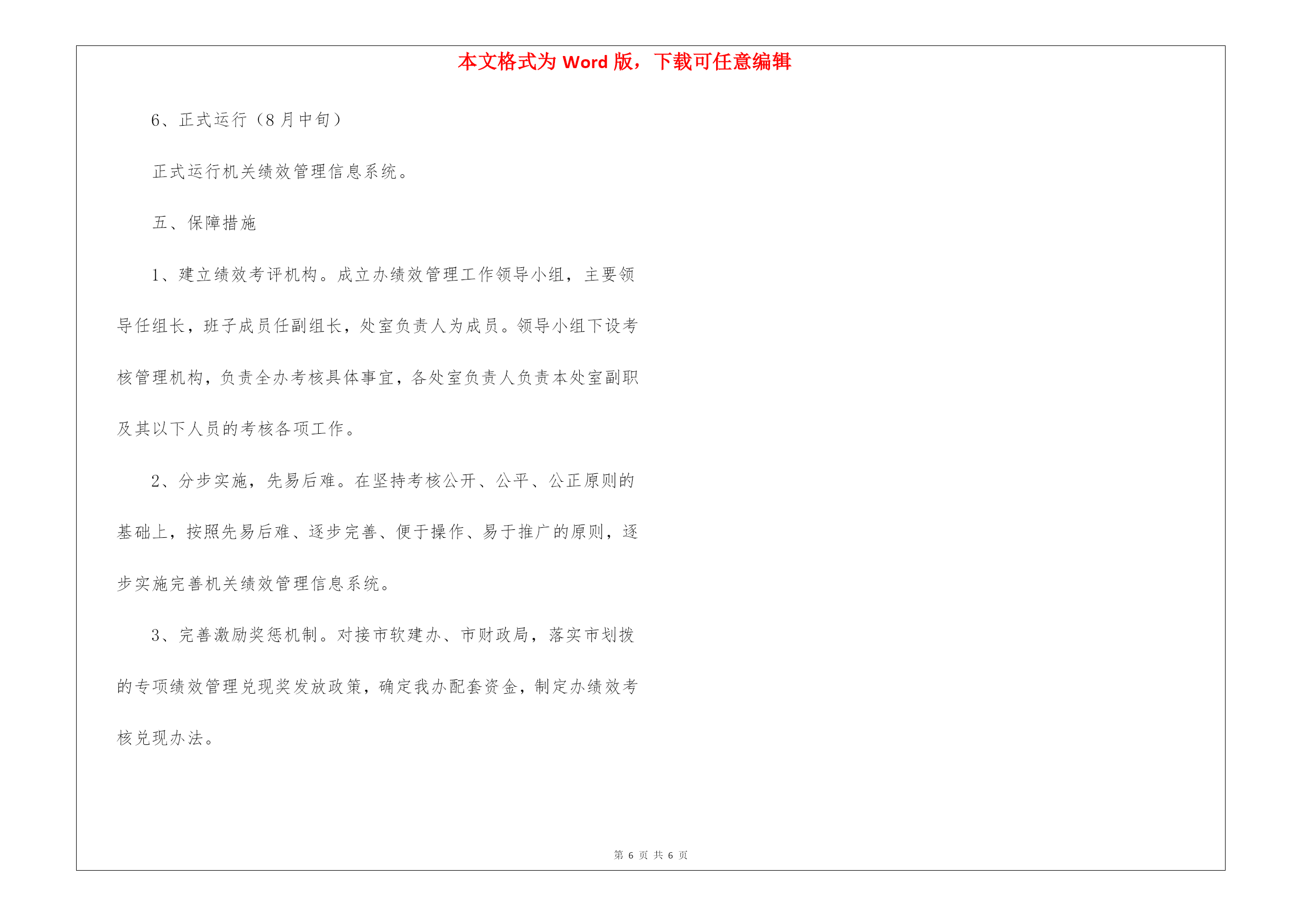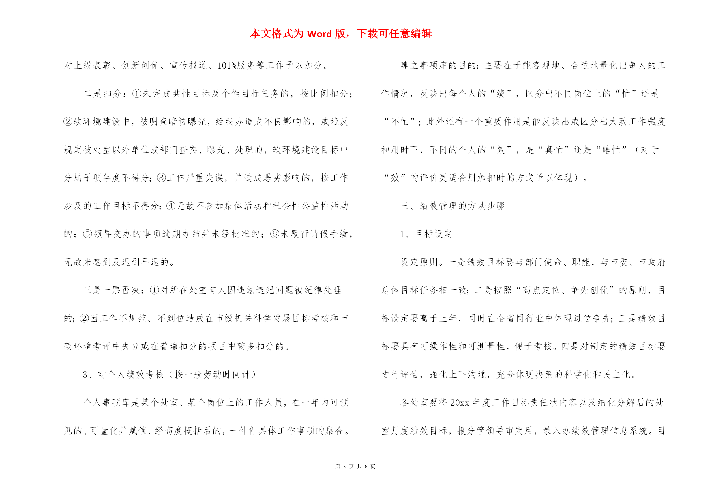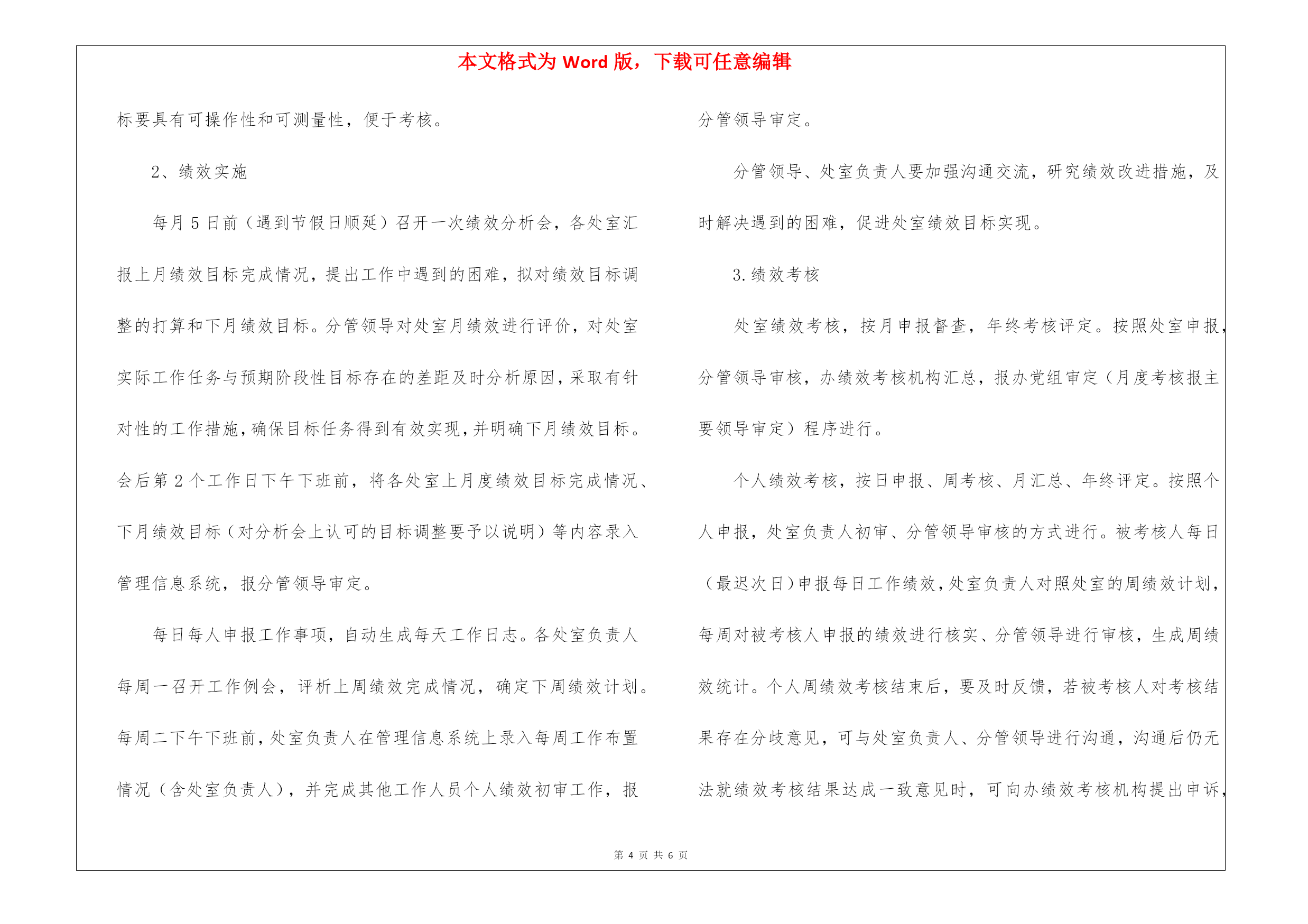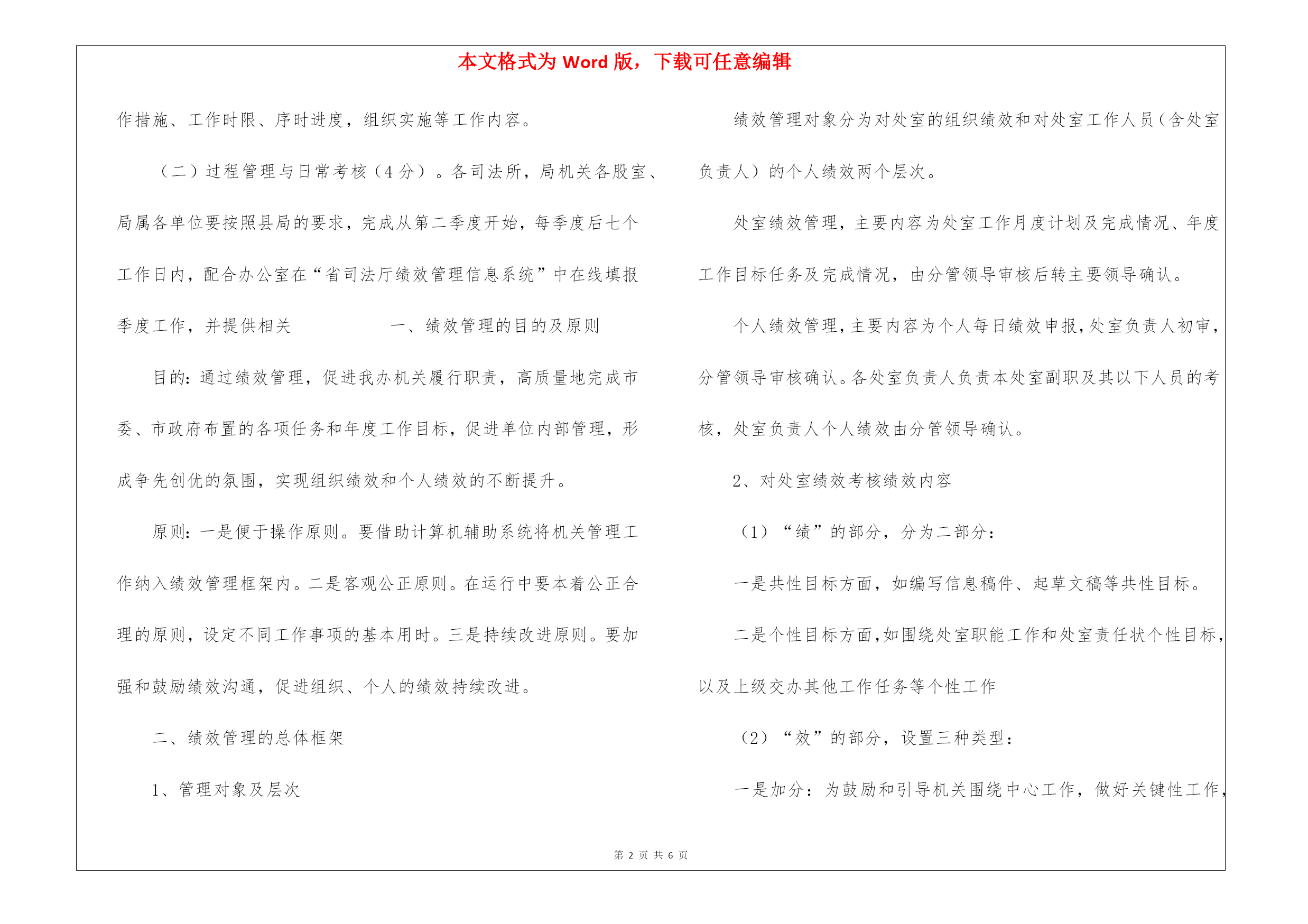 本文格式为Word版,下载可任意编辑第PAGE\*MERGEFORMAT6页共NUMPAGES\*MERGEFORMAT6页司法绩效管理的工作方案(2600字)根据省、市《20xx年度绩效管理考核工作方案》的工作部署和要求,结合我县司法行政工作实际,制定本工作方案。一、指导思想按照今年省、市政府廉政工作会议上提出的的要求,紧密结合全县司法行政工作实际,切实加强全系统的绩效管理,充分发挥司法行政职能,进一步优化发展环境,提升全县司法行政机关服务全县经济社会发展的能力和水平。二、考核对象各司法所,局机关各股室、局属各单位。三、绩效管理工作内容(60分)各司法所,局机关各股室、局属各单位20xx年度绩效管理考核的主要内容(详见《附件》),各司法所,局机关各股室、局属各单位要根据方案要求全面高效完成各项工作任务。1、着眼平安,致力维护社会稳定。各司法所,基层股、社区矫正股。2、着眼法治,致力推进法律服务。各司法所,法宣股、律师公证司法鉴定股、法律援助中心。3、着眼创新方法,致力激发发展活力。全县司法行政系统所有部门、单位。4、着眼规范管理,致力提升发展水平。各司法所,律师事务所、公证处、基层股、法律援助中心、律师公证司法鉴定管理股。5、着眼强基固本,致力推动重心下移。各司法所,办公室。6、着眼能力建设,致力打造一流队伍。各司法所,法宣股、局机关各股室、局属各单位、办公室。四、效能建设内容(40分)(一)制定绩效管理工作方案(2分)。要按照省市绩效管理考核工作方案,制定20xx年度绩效管理工作办法,明确工作内容、工作措施、工作时限、序时进度,组织实施等工作内容。(二)过程管理与日常考核(4分)。各司法所,局机关各股室、局属各单位要按照县局的要求,完成从第二季度开始,每季度后七个工作日内,配合办公室在“省司法厅绩效管理信息系统”中在线填报季度工作,并提供相关一、绩效管理的目的及原则目的:通过绩效管理,促进我办机关履行职责,高质量地完成市委、市政府布置的各项任务和年度工作目标,促进单位内部管理,形成争先创优的氛围,实现组织绩效和个人绩效的不断提升。原则:一是便于操作原则。要借助计算机辅助系统将机关管理工作纳入绩效管理框架内。二是客观公正原则。在运行中要本着公正合理的原则,设定不同工作事项的基本用时。三是持续改进原则。要加强和鼓励绩效沟通,促进组织、个人的绩效持续改进。二、绩效管理的总体框架1、管理对象及层次绩效管理对象分为对处室的组织绩效和对处室工作人员(含处室负责人)的个人绩效两个层次。处室绩效管理,主要内容为处室工作月度计划及完成情况、年度工作目标任务及完成情况,由分管领导审核后转主要领导确认。个人绩效管理,主要内容为个人每日绩效申报,处室负责人初审,分管领导审核确认。各处室负责人负责本处室副职及其以下人员的考核,处室负责人个人绩效由分管领导确认。2、对处室绩效考核绩效内容(1)“绩”的部分,分为二部分:一是共性目标方面,如编写信息稿件、起草文稿等共性目标。二是个性目标方面,如围绕处室职能工作和处室责任状个性目标,以及上级交办其他工作任务等个性工作(2)“效”的部分,设置三种类型:一是加分:为鼓励和引导机关围绕中心工作,做好关键性工作,对上级表彰、创新创优、宣传报道、101%服务等工作予以加分。二是扣分:①未完成共性目标及个性目标任务的,按比例扣分;②软环境建设中,被明查暗访曝光,给我办造成不良影响的,或违反规定被处室以外单位或部门查实、曝光、处理的,软环境建设目标中分属子项年度不得分;③工作严重失误,并造成恶劣影响的,按工作涉及的工作目标不得分;④无故不参加集体活动和社会性公益性活动的;⑤领导交办的事项逾期办结并未经批准的;⑥未履行请假手续,无故未签到及迟到早退的。三是一票否决:①对所在处室有人因违法违纪问题被纪律处理的;②因工作不规范、不到位造成在市级机关科学发展目标考核和市软环境考评中失分或在普遍扣分的项目中较多扣分的。3、对个人绩效考核(按一般劳动时间计)个人事项库是某个处室、某个岗位上的工作人员,在一年内可预见的、可量化并赋值、经高度概括后的,一件件具体工作事项的集合。建立事项库的目的:主要在于能客观地、合适地量化出每人的工作情况,反映出每个人的“绩”,区分出不同岗位上的“忙”还是“不忙”;此外还有一个重要作用是能反映出或区分出大致工作强度和用时下,不同的个人的“效”,是“真忙”还是“瞎忙”(对于“效”的评价更适合用加扣时的方式予以体现)。三、绩效管理的方法步骤1、目标设定设定原则。一是绩效目标要与部门使命、职能,与市委、市政府总体目标任务相一致;二是按照“高点定位、争先创优”的原则,目标设定要高于上年,同时在全省同行业中体现进位争先;三是绩效目标要具有可操作性和可测量性,便于考核。四是对制定的绩效目标要进
