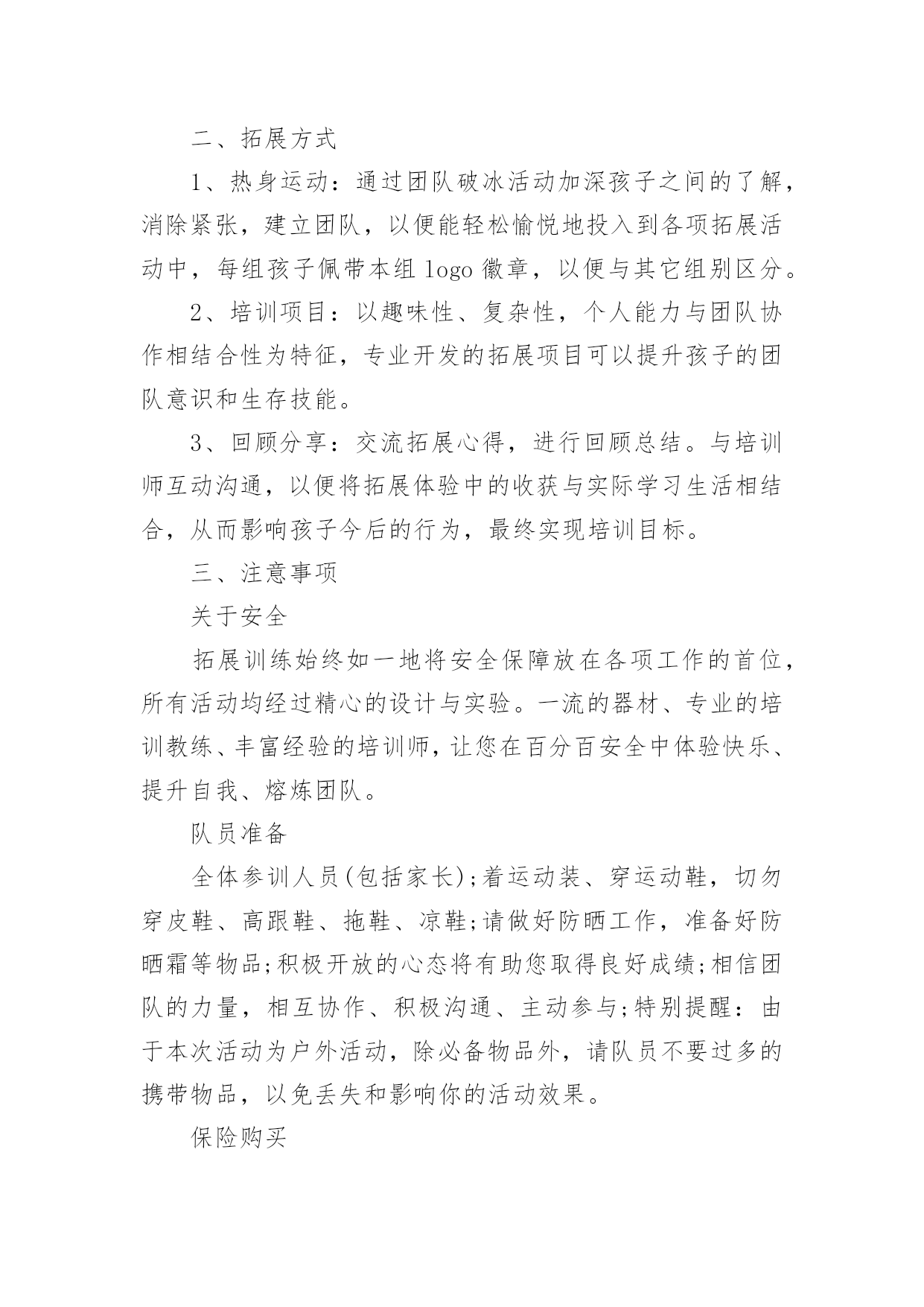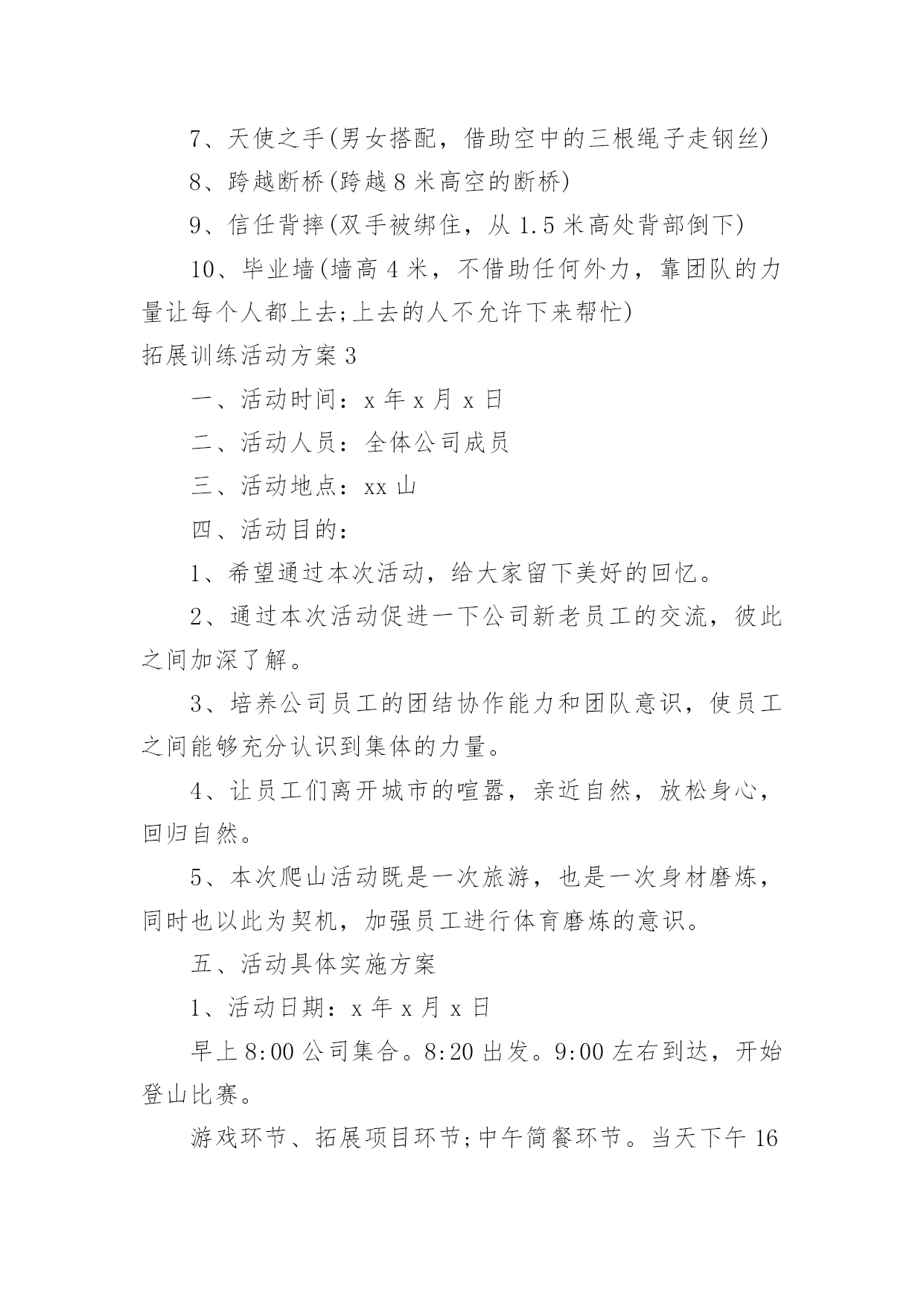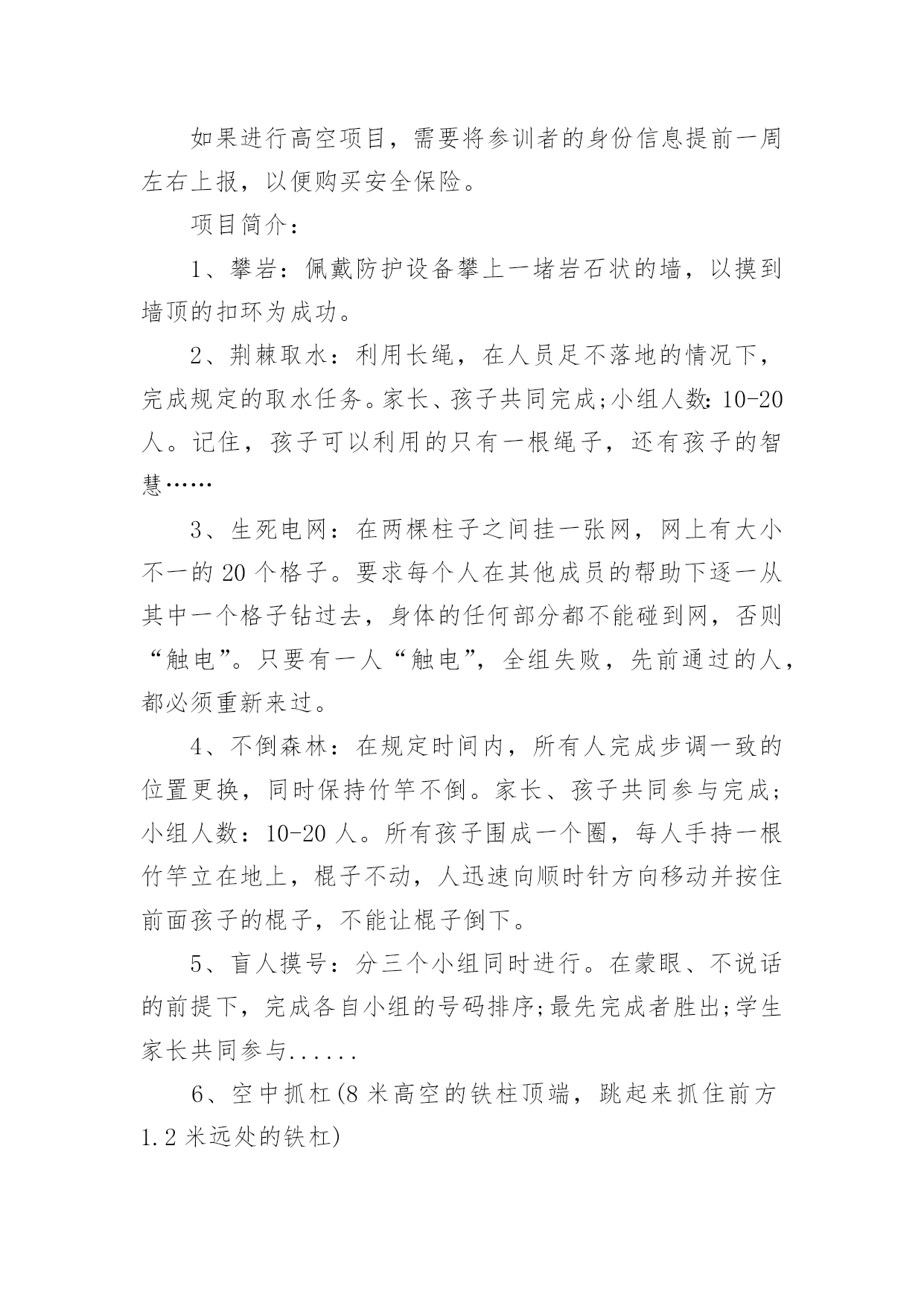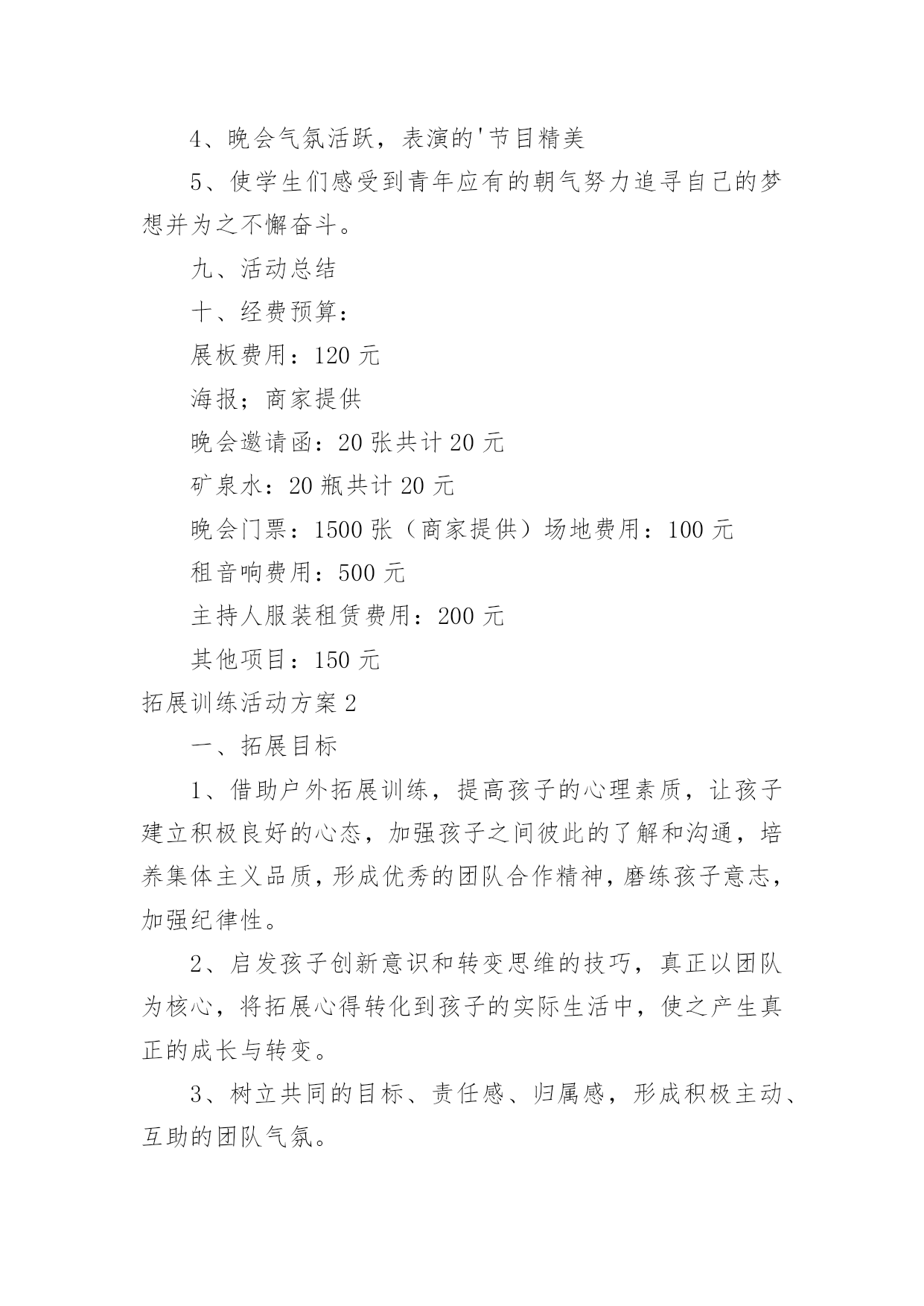 拓展训练活动方案拓展训练活动方案为确保事情或工作高质量高水平开展,常常需要预先准备方案,方案是有很强可操作性的书面计划。方案应该怎么制定呢?下面是小编收集整理的拓展训练活动方案,欢迎大家分享。拓展训练活动方案1一、活动背景:五月,鲜花怒放;五月,百鸟声喧。我们迎来了一年一度的五四国际青年节。九十三年前―1919年5月4日,满腔热血的华夏青年掀起了伟大的反帝反封建的"五四"运动,这是中国青年运动的开端,拉开了新民主主义革命的帷幕。此后中国社会主义青年团不断壮大,积极投身于中国反帝反封建运动;放眼九十年后的今天,赋有时代使命的共青团员奋战在建设祖国的第一线,把自己最好的青春献给了这片960万平方公里的热土。属于中国的伟大时代到来了!二、活动目的:纪念"五四"运动九十三周年,重温光荣岁月,激发青年团员的爱国爱团的热情,颂扬民族精神,使得共青团员和青年学生们铭记历史,不忘五四"爱国、进步、民主、科学"的精神,沿着先辈的光荣路程,为完成自己的青春使命不断努力;展现我校共青团员和青年学生的全方位的文化底蕴和素养,展现我校素质教育的优秀成果,丰富学生们的课余文化生活,使学生们德智体美劳全面发展;三、活动主办单位:南华大学青志总队四、活动承办单位:南华大学各青志分队五、活动对象:南华大学全体学生六、活动时间:二零一二年三月三十日至五月五日七、活动流程:1、筹备阶段:时间:3月30日至4月12日A:召开第一次筹备会议:由主办方负责召集校艺术团及各院文艺负责人召开会议。会上应听取各学院负责人的意见和建议,对策划中尚不完善之处进行修改,力求完美;同时,根据各学院不同的优势和想法确定其表演的节目形式内容的大概方向,并开始排练。B:活动宣传:(1)口头宣传:各院接到通知后,积极向全院学生进行宣传,动员学生认真准备参加;(2)媒介宣传:主要以校团委和我院宣传部制作的精美宣传海报,以及喷绘,包括商家提供的宣传板以及网上公告的形式为途径,达到活动前期预热效果。C:主持人的确定:可由各院推荐的主持候选人中间进行选拔。主持人应在本期间着手准备主持词,并由专人进行训练,以求晚会当天达到最佳效果。2、审查阶段:时间:4月16日至5月2日4月16日:对所有表演的节目进行初审。期间,筹备会成员及专业嘉宾、导演可对表演的节目提出可行性建议。4月27日:对所有表演的节目进行复审,并审查主持人。主要是对表演的节目的质量上以及表演的节目之间的主持词串联进行严格的审核,确保整台晚会的最终效果。4月29日:确定最后上场的表演的节目及表演的节目的顺序。4月29日―5月1日:落实舞台、舞美、道具、灯光、背景等方面的准备工作情况;进行后勤保障工作,包括演出当晚会场布置用品的采购等。3、晚会阶段:彩排:5月3日晚7:00全体演职人员到场,并要求演员妆容及服装均到位。正式演出:5月4日晚7:00,晚会正式开始。八、活动预期效果:1、各项准备工作扎实落实2、各分队积极配合3、各学院学生积极配合4、晚会气氛活跃,表演的'节目精美5、使学生们感受到青年应有的朝气努力追寻自己的梦想并为之不懈奋斗。九、活动总结十、经费预算:展板费用:120元海报;商家提供晚会邀请函:20张共计20元矿泉水:20瓶共计20元晚会门票:1500张(商家提供)场地费用:100元租音响费用:500元主持人服装租赁费用:200元其他项目:150元拓展训练活动方案2一、拓展目标1、借助户外拓展训练,提高孩子的心理素质,让孩子建立积极良好的心态,加强孩子之间彼此的了解和沟通,培养集体主义品质,形成优秀的团队合作精神,磨练孩子意志,加强纪律性。2、启发孩子创新意识和转变思维的技巧,真正以团队为核心,将拓展心得转化到孩子的实际生活中,使之产生真正的成长与转变。3、树立共同的目标、责任感、归属感,形成积极主动、互助的团队气氛。二、拓展方式1、热身运动:通过团队破冰活动加深孩子之间的了解,消除紧张,建立团队,以便能轻松愉悦地投入到各项拓展活动中,每组孩子佩带本组logo徽章,以便与其它组别区分。2、培训项目:以趣味性、复杂性,个人能力与团队协作相结合性为特征,专业开发的拓展项目可以提升孩子的团队意识和生存技能。3、回顾分享:交流拓展心得,进行回顾总结。与培训师互动沟通,以便将拓展体验中的收获与实际学习生活相结合,从而影响孩子今后的行为,最终实现培训目标。三、注意事项关于安全拓展训练始终如一地将安全保障放在各项工作的首位,所有活动均经过精心的设计与实验。一流的器材、专业的培训教练、丰富经验的培训师,让您在百分百安全中体验快乐、提升自我、熔炼团队。队员准备全体参训人员(包括家长);着运动装、穿运动鞋,切勿穿皮鞋、高跟鞋、拖鞋、凉鞋;请做好防晒工作,准备好防晒霜等物品;积极开放的心态将有助您取得良好成绩;相信团队的力量,相互协作、积极沟通、