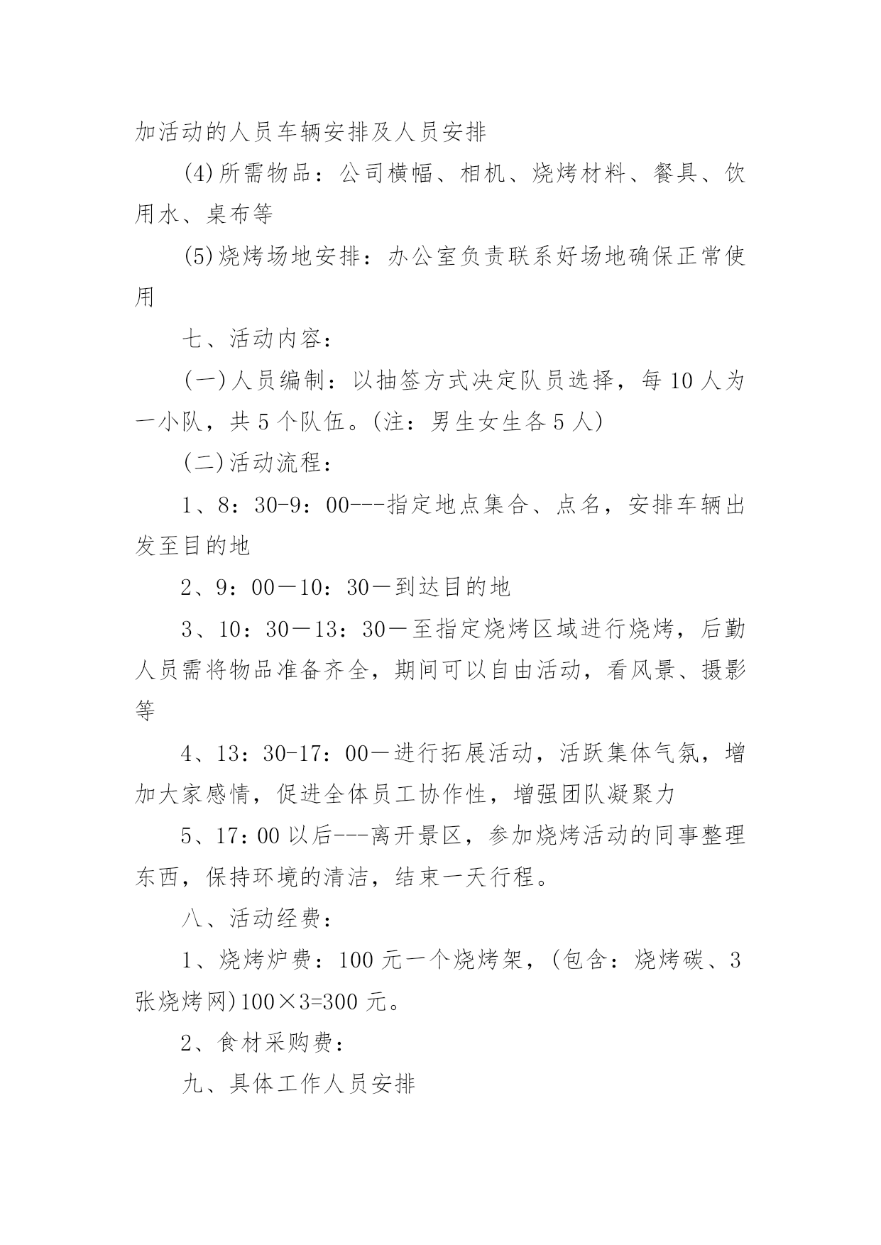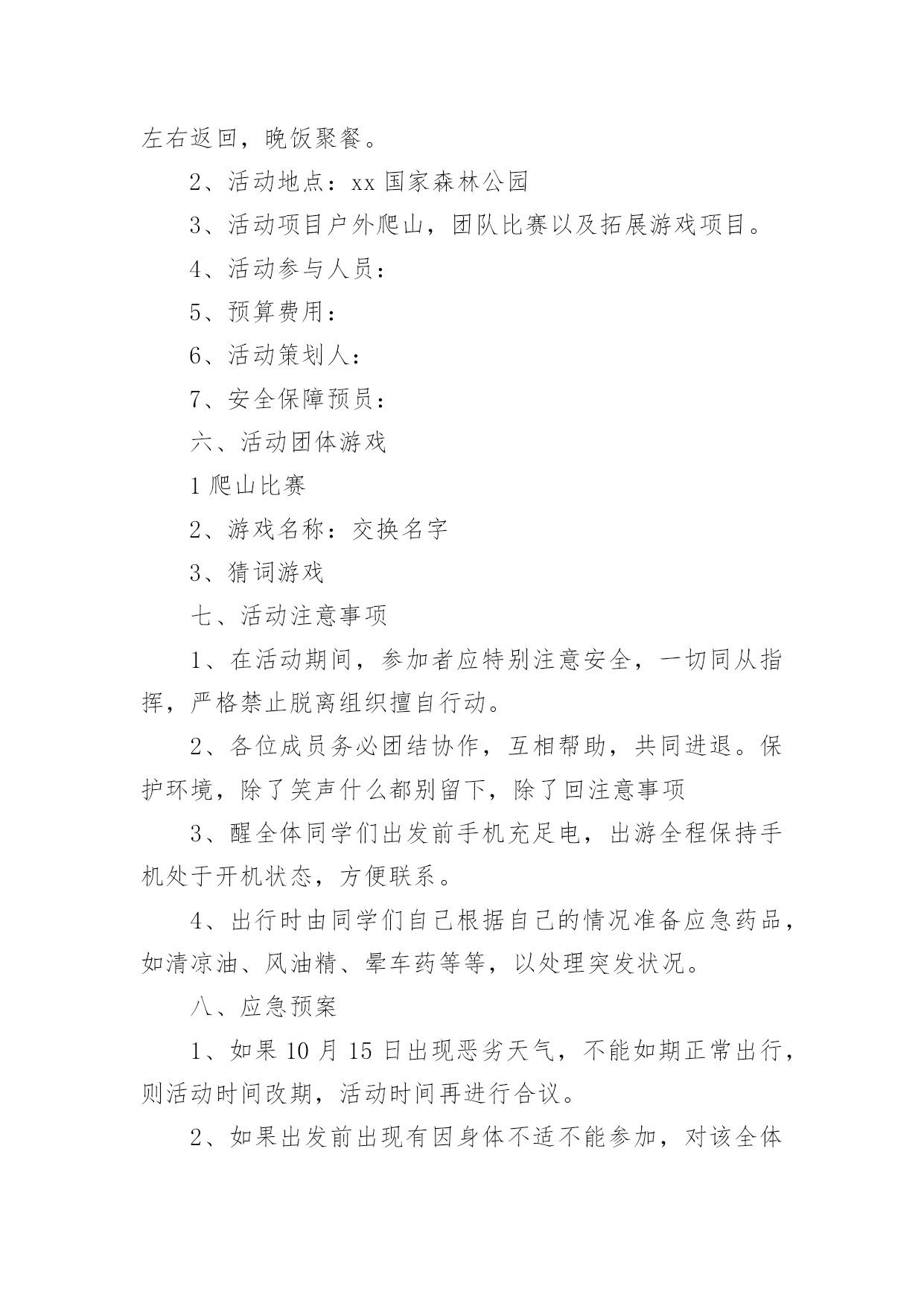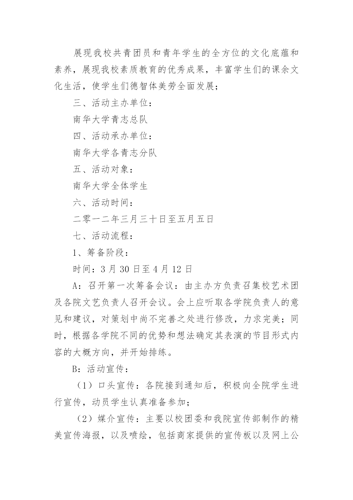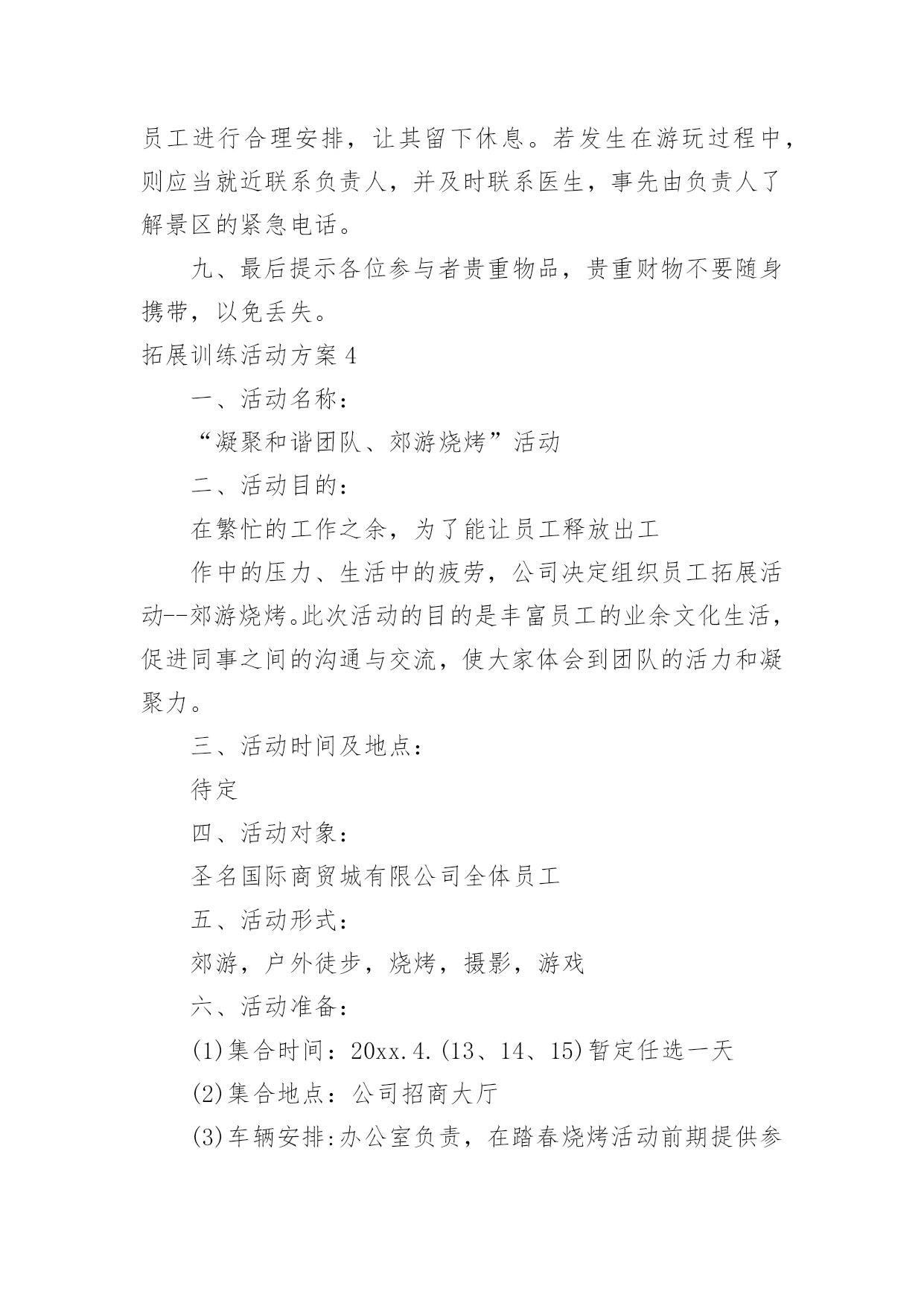 拓展训练活动方案拓展训练活动方案为确保事情或工作高质量高水平开展,常常需要预先准备方案,方案是有很强可操作性的书面计划。方案应该怎么制定呢?下面是小编收集整理的拓展训练活动方案,欢迎大家分享。拓展训练活动方案1一、活动背景:五月,鲜花怒放;五月,百鸟声喧。我们迎来了一年一度的五四国际青年节。九十三年前―1919年5月4日,满腔热血的华夏青年掀起了伟大的反帝反封建的"五四"运动,这是中国青年运动的开端,拉开了新民主主义革命的帷幕。此后中国社会主义青年团不断壮大,积极投身于中国反帝反封建运动;放眼九十年后的今天,赋有时代使命的共青团员奋战在建设祖国的第一线,把自己最好的青春献给了这片960万平方公里的热土。属于中国的伟大时代到来了!二、活动目的:纪念"五四"运动九十三周年,重温光荣岁月,激发青年团员的爱国爱团的热情,颂扬民族精神,使得共青团员和青年学生们铭记历史,不忘五四"爱国、进步、民主、科学"的精神,沿着先辈的光荣路程,为完成自己的青春使命不断努力;展现我校共青团员和青年学生的全方位的文化底蕴和素养,展现我校素质教育的优秀成果,丰富学生们的课余文化生活,使学生们德智体美劳全面发展;三、活动主办单位:南华大学青志总队四、活动承办单位:南华大学各青志分队五、活动对象:南华大学全体学生六、活动时间:二零一二年三月三十日至五月五日七、活动流程:1、筹备阶段:时间:3月30日至4月12日A:召开第一次筹备会议:由主办方负责召集校艺术团及各院文艺负责人召开会议。会上应听取各学院负责人的意见和建议,对策划中尚不完善之处进行修改,力求完美;同时,根据各学院不同的优势和想法确定其表演的节目形式内容的大概方向,并开始排练。B:活动宣传:(1)口头宣传:各院接到通知后,积极向全院学生进行宣传,动员学生认真准备参加;(2)媒介宣传:主要以校团委和我院宣传部制作的精美宣传海报,以及喷绘,包括商家提供的宣传板以及网上公告的形式为途径,达到活动前期预热效果。C:主持人的确定:可由各院推荐的主持候选人中间进行选拔。主持人应在本期间着手准备主持词,并由专人进行训练,以求晚会当天达到最佳效果。2、审查阶段:时间:4月16日至5月2日4月16日:对所有表演的节目进行初审。期间,筹备会成员及专业嘉宾、导演可对表演的节目提出可行性建议。4月27日:对所有表演的节目进行复审,并审查主持人。主要是对表演的节目的质量上以及表演的节目之间的主持词串联进行严格的审核,确保整台晚会的最终效果。4月29日:确定最后上场的表演的节目及表演的节目的顺序。4月29日―5月1日:落实舞台、舞美、道具、灯光、背景等方面的准备工作情况;进行后勤保障工作,包括演出当晚会场布置用品的采购等。3、晚会阶段:彩排:5月3日晚7:00全体演职人员到场,并要求演员妆容及服装均到位。正式演出:5月4日晚7:00,晚会正式开始。八、活动预期效果:1、各项准备工作扎实落实2、各分队积极配合3、各学院学生积极配合4、晚会气氛活跃,表演的'节目精美5、使学生们感受到青年应有的朝气努力追寻自己的梦想并为之不懈奋斗。九、活动总结十、经费预算:展板费用:120元海报;商家提供晚会邀请函:20张共计20元矿泉水:20瓶共计20元晚会门票:1500张(商家提供)场地费用:100元租音响费用:500元主持人服装租赁费用:200元其他项目:150元拓展训练活动方案2一、拓展目标1、借助户外拓展训练,提高孩子的心理素质,让孩子建立积极良好的心态,加强孩子之间彼此的了解和沟通,培养集体主义品质,形成优秀的团队合作精神,磨练孩子意志,加强纪律性。2、启发孩子创新意识和转变思维的技巧,真正以团队为核心,将拓展心得转化到孩子的实际生活中,使之产生真正的成长与转变。3、树立共同的目标、责任感、归属感,形成积极主动、互助的团队气氛。二、拓展方式1、热身运动:通过团队破冰活动加深孩子之间的了解,消除紧张,建立团队,以便能轻松愉悦地投入到各项拓展活动中,每组孩子佩带本组logo徽章,以便与其它组别区分。2、培训项目:以趣味性、复杂性,个人能力与团队协作相结合性为特征,专业开发的拓展项目可以提升孩子的团队意识和生存技能。3、回顾分享:交流拓展心得,进行回顾总结。与培训师互动沟通,以便将拓展体验中的收获与实际学习生活相结合,从而影响孩子今后的行为,最终实现培训目标。三、注意事项关于安全拓展训练始终如一地将安全保障放在各项工作的首位,所有活动均经过精心的设计与实验。一流的器材、专业的培训教练、丰富经验的培训师,让您在百分百安全中体验快乐、提升自我、熔炼团队。队员准备全体参训人员(包括家长);着运动装、穿运动鞋,切勿穿皮鞋、高跟鞋、拖鞋、凉鞋;请做好防晒工作,准备好防晒霜等物品;积极开放的心态将有助您取得良好成绩;相信团队的力量,相互协作、积极沟通、