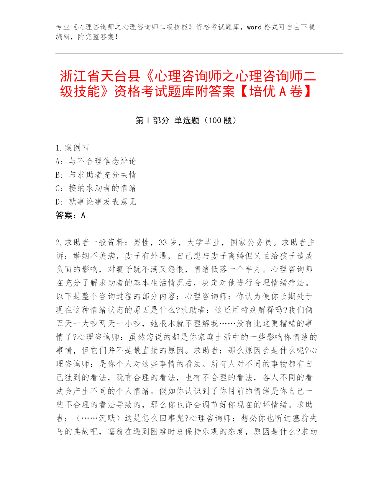 2024年浙江省天台县《心理咨询师之心理咨询师二级技能》考试必考200题完整版附参考答案(培优)
