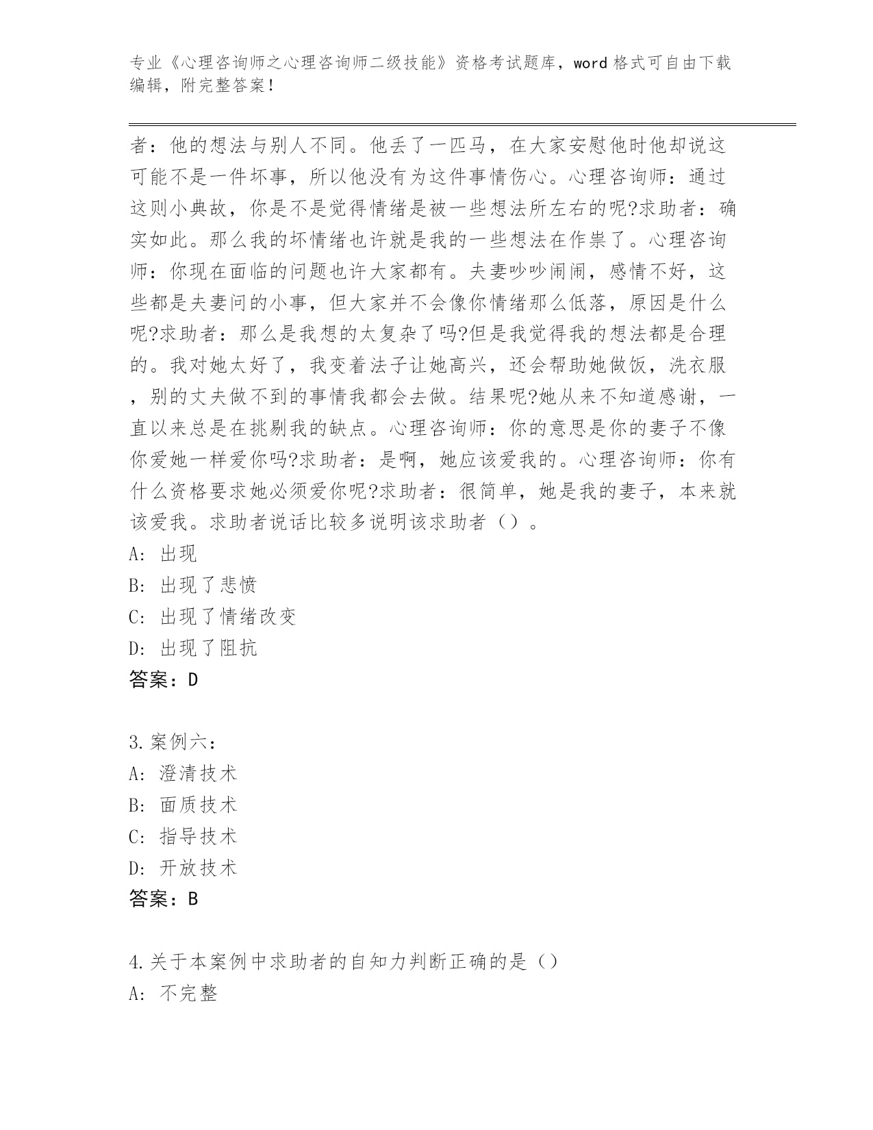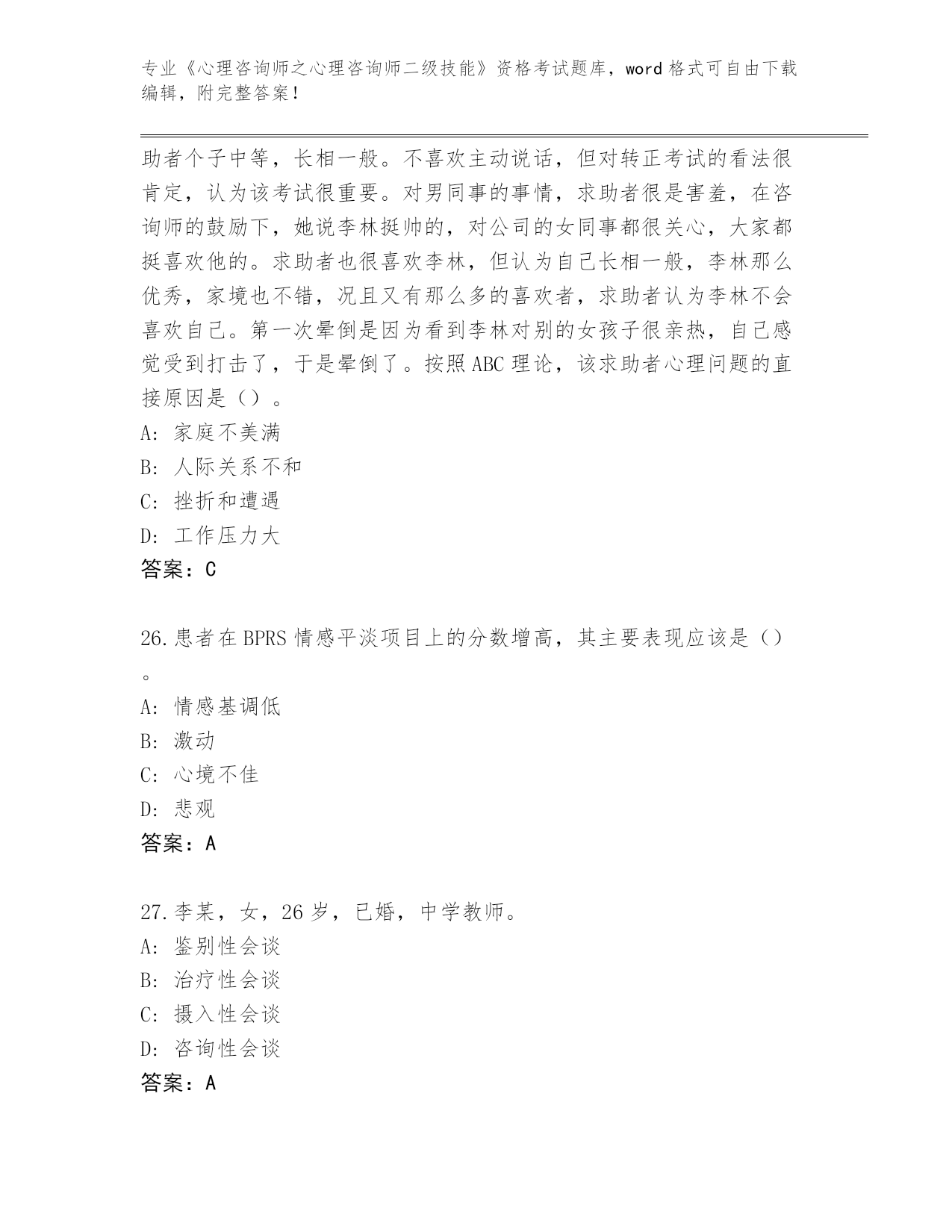 浙江省2024《心理咨询师之心理咨询师二级技能》资格考试题库带答案(培优A卷)