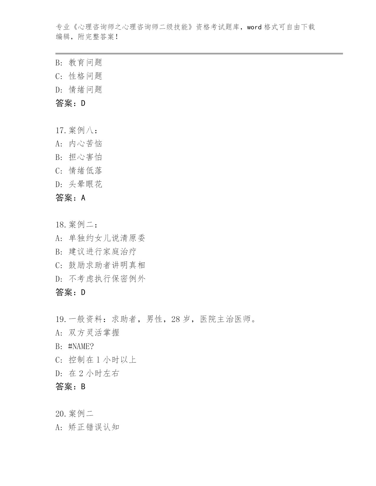 浙江省天台县《心理咨询师之心理咨询师二级技能》考试必考200题真题题库带答案(研优卷)