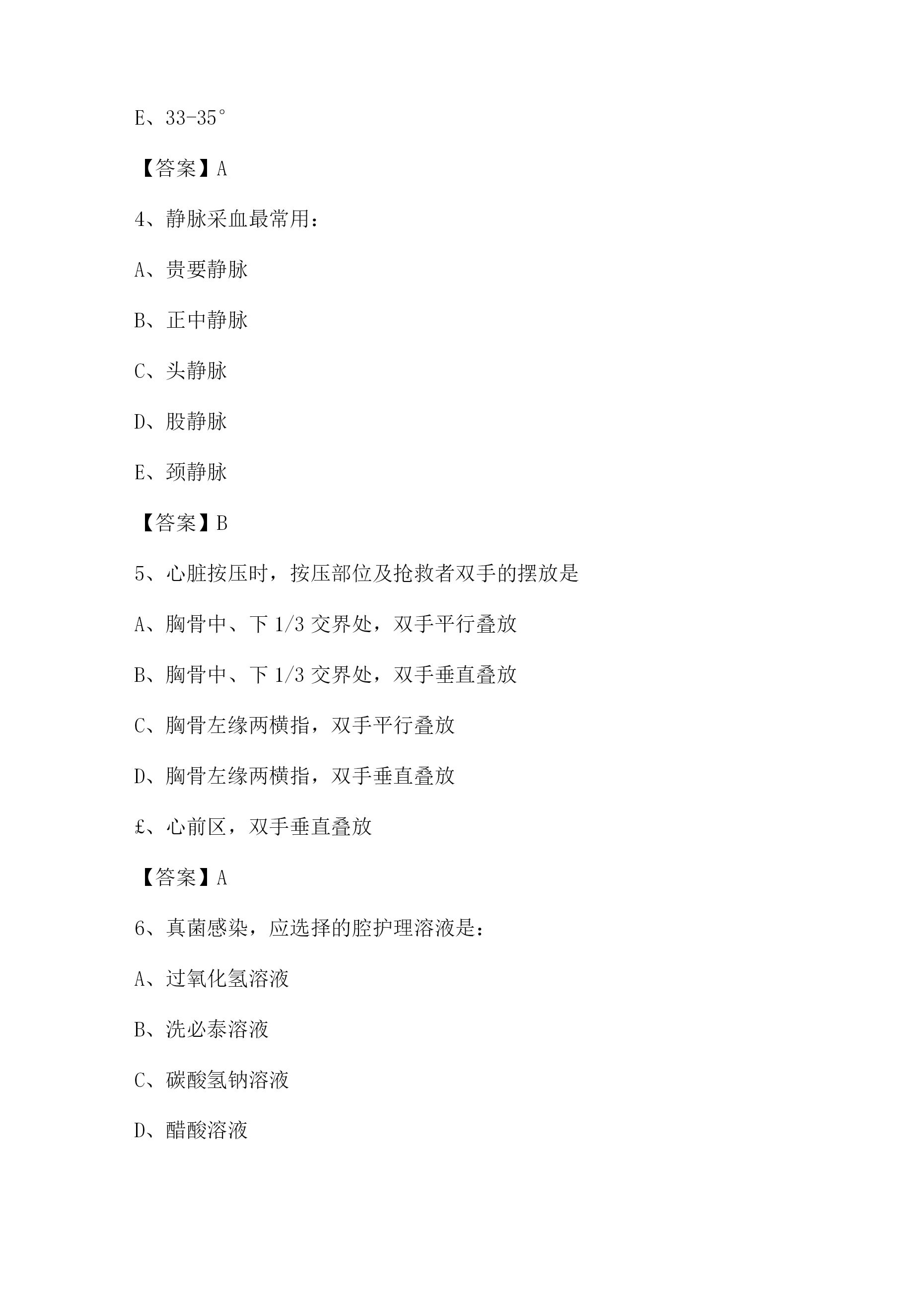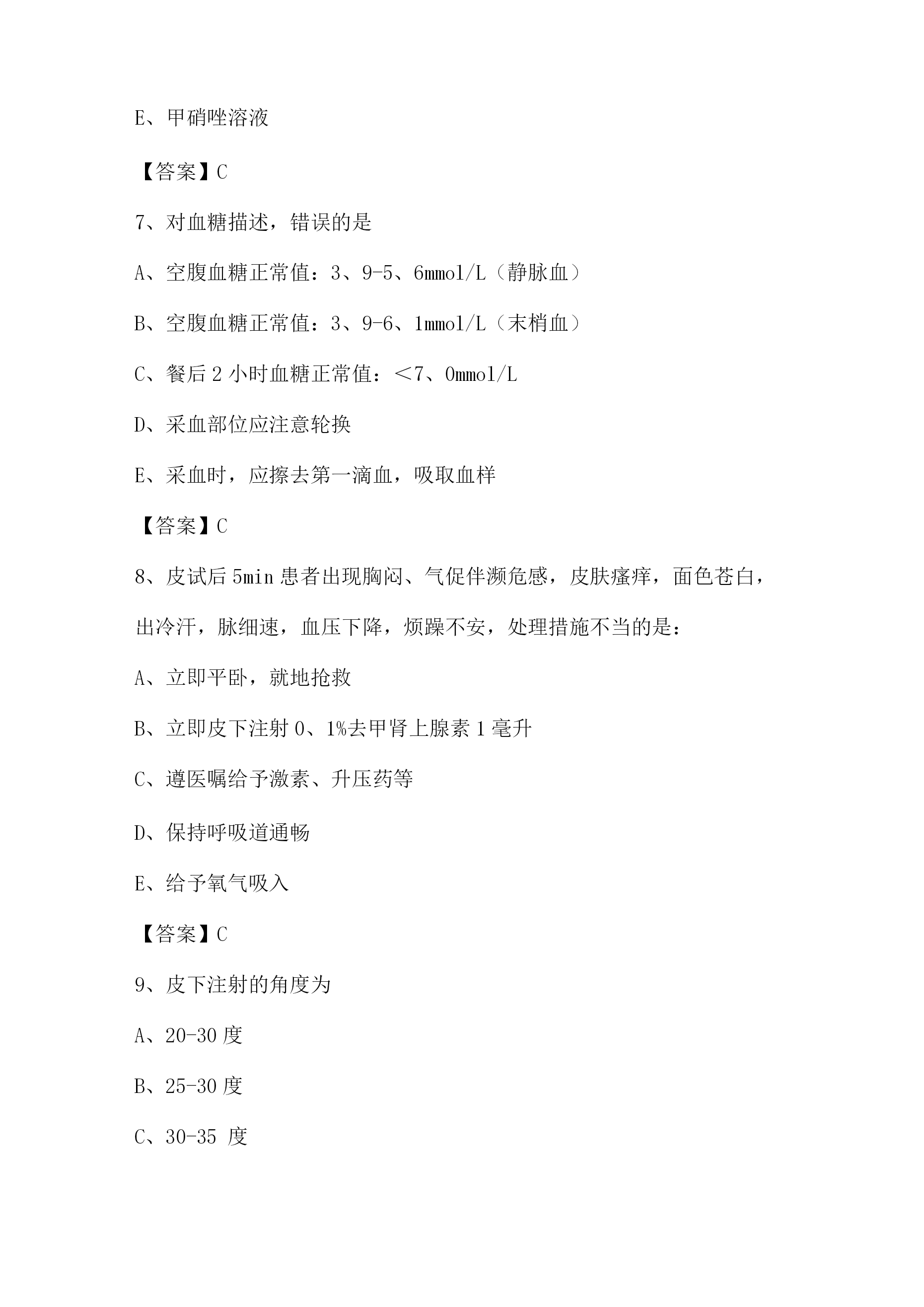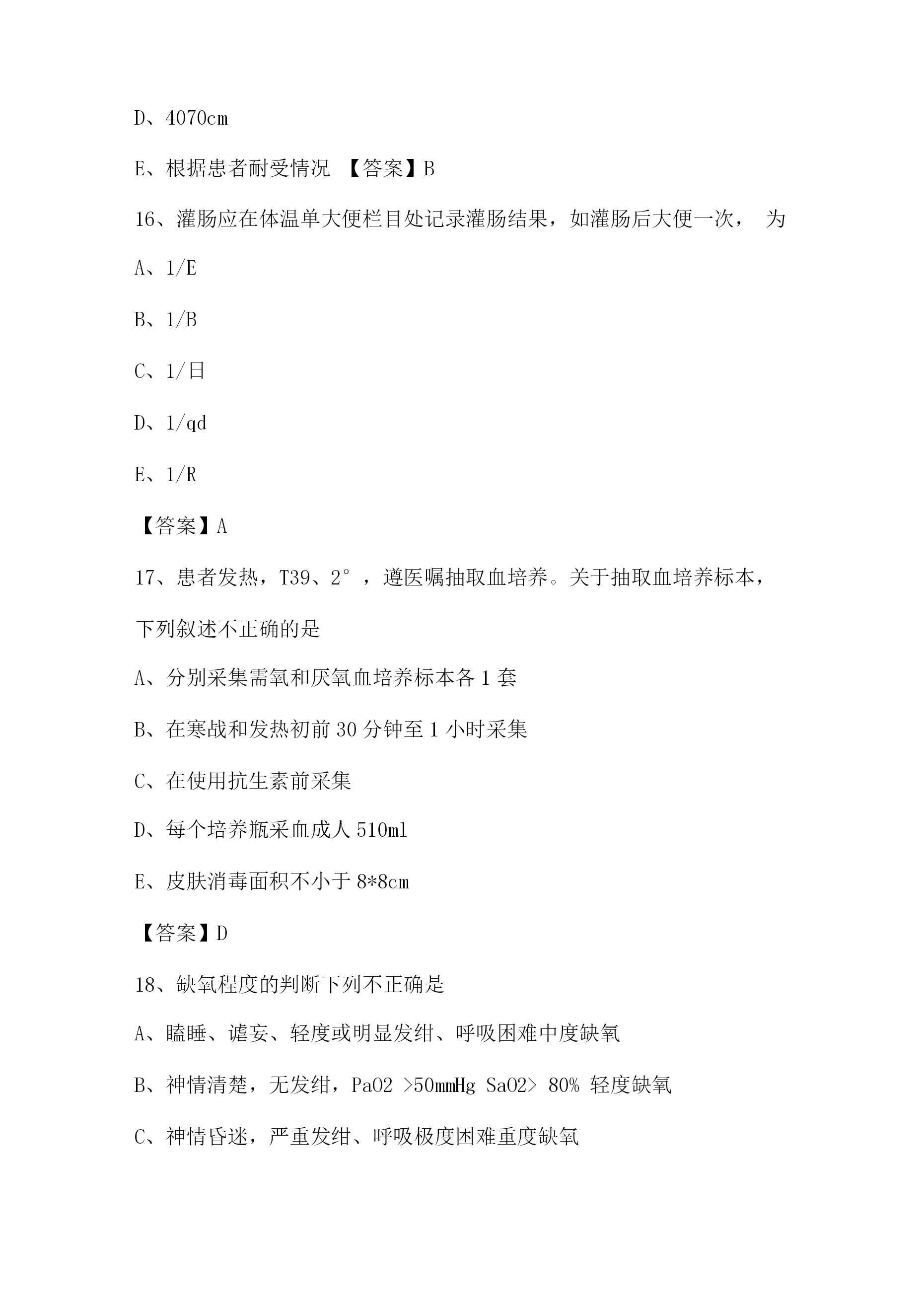 内科系统公共操作理论试题及答案一、单选题1、检查患者有无胃潴留,回抽胃内容物,超过多少毫升时,应当通知医生减量或暂停鼻饲。TOC\o"1-5"\h\zA、250mlB、2mlC、150mlD、1mlE、50ml【答案】C2、长期鼻饲的患者应每日进行腔护理()次,并定期更换胃管,普通胃管每()更换1次、硅胶胃管每()更换1次。A、1、月、周B、2、日、周C、2、周、月D、1、周、月E、1、日、月【答案】C3、鼻饲液的温度是:A、38—40°B、40—42°C、42—44°D、36-38°E、33-35°【答案】A4、静脉采血最常用:A、贵要静脉B、正中静脉C、头静脉D、股静脉E、颈静脉【答案】B5、心脏按压时,按压部位及抢救者双手的摆放是A、胸骨中、下1/3交界处,双手平行叠放B、胸骨中、下1/3交界处,双手垂直叠放C、胸骨左缘两横指,双手平行叠放D、胸骨左缘两横指,双手垂直叠放£、心前区,双手垂直叠放【答案】A6、真菌感染,应选择的腔护理溶液是:A、过氧化氢溶液B、洗必泰溶液C、碳酸氢钠溶液D、醋酸溶液E、甲硝唑溶液【答案】C7、对血糖描述,错误的是A、空腹血糖正常值:3、9-5、6mmol/L(静脉血)B、空腹血糖正常值:3、9-6、1mmol/L(末梢血)C、餐后2小时血糖正常值:<7、0mmol/LD、采血部位应注意轮换E、采血时,应擦去第一滴血,吸取血样【答案】C8、皮试后5min患者出现胸闷、气促伴濒危感,皮肤瘙痒,面色苍白,出冷汗,脉细速,血压下降,烦躁不安,处理措施不当的是:A、立即平卧,就地抢救B、立即皮下注射0、1%去甲肾上腺素1毫升C、遵医嘱给予激素、升压药等D、保持呼吸道通畅E、给予氧气吸入【答案】C9、皮下注射的角度为A、20-30度B、25-30度C、30-35度D、30-40度E、35-40度【答案】D10、膀胱冲洗液的温度、速度是A、30°40——60滴TOC\o"1-5"\h\zB、32°80——1滴C、35°80——1滴D、40°80——120滴E、42°60——1滴【答案】C11、关于吸痰操作,描述错误的是A、吸痰是清除患者呼吸道分泌物,保持呼吸道通畅B、吸痰时间不超过15秒C、痰液多,需再次吸痰,应间隔1-2分钟D、如患者发生紫绀、心率下降等,应立即停止吸痰E、一般成年人选择12-14号吸痰管【答案】C12、对静脉输血,描述错误的是A、为患者补充血容量,改善血液循环B、血液内不得加入其它药物C、两份血液之间输入生理盐水,防止发生反应D、输血袋用后需在血库低温保存12小时E、输注全血的输血器宜4小时更换1次【答案】D13、对动脉血气采集,描述错误的是A、常规消毒穿刺部位8*8cmB、穿刺完毕按压3-5分钟C、血标本颠倒混匀1-2次。、有出血倾向的患者慎做动脉采血E、标本应在30分钟内完成检测【答案】C14、肌内注射的常用注射部位不包括A、臀大肌B、臀中肌C、臀小肌D、上臂三角肌E、大腿外侧【答案】E15大量不保留灌肠时,筒内液体面应高于肛门约TOC\o"1-5"\h\zA、3040cmB、4060cmC、5070cmD、4070cmE、根据患者耐受情况【答案】B16、灌肠应在体温单大便栏目处记录灌肠结果,如灌肠后大便一次,为TOC\o"1-5"\h\zA、1/EB、1/BC、1/日D、1/qdE、1/R【答案】A17、患者发热,T39、2°,遵医嘱抽取血培养。关于抽取血培养标本,下列叙述不正确的是A、分别采集需氧和厌氧血培养标本各1套B、在寒战和发热初前30分钟至1小时采集C、在使用抗生素前采集D、每个培养瓶采血成人510mlE、皮肤消毒面积不小于8*8cm【答案】D18、缺氧程度的判断下列不正确是A、瞌睡、谑妄、轻度或明显发绀、呼吸困难中度缺氧B、神情清楚,无发绀,PaO2>50mmHgSaO2>80%轻度缺氧C、神情昏迷,严重发绀、呼吸极度困难重度缺氧D、PaO230—50mmHg中度缺氧E、神情昏迷,三凹征、PaO2<30mmHgSaO2<50%重度缺氧【答案】E19、尿标本的留取叙述不正确的是A、晨尿:留取晨起后第一次尿液的中段尿B、餐后尿:留取进餐后2h的尿液C、尿定量:将规定时间内的尿液装入灭菌容器内,混匀后记录总量,取12ml送检D、尿胆原检测:以留取14:——16:期间的尿液为宜E、尿培养:用清水充分清洗会阴部,再用灭菌水冲洗尿道,排尿,将前端尿弃去,留取中段尿10ml,置于灭菌容器内