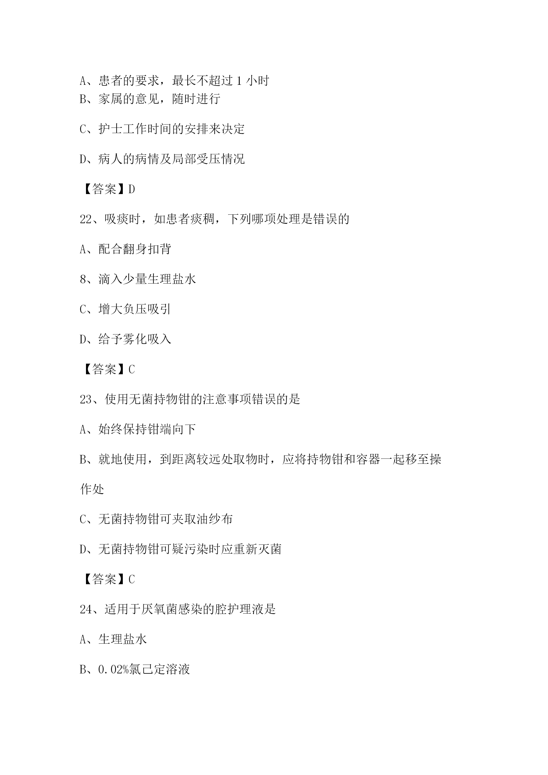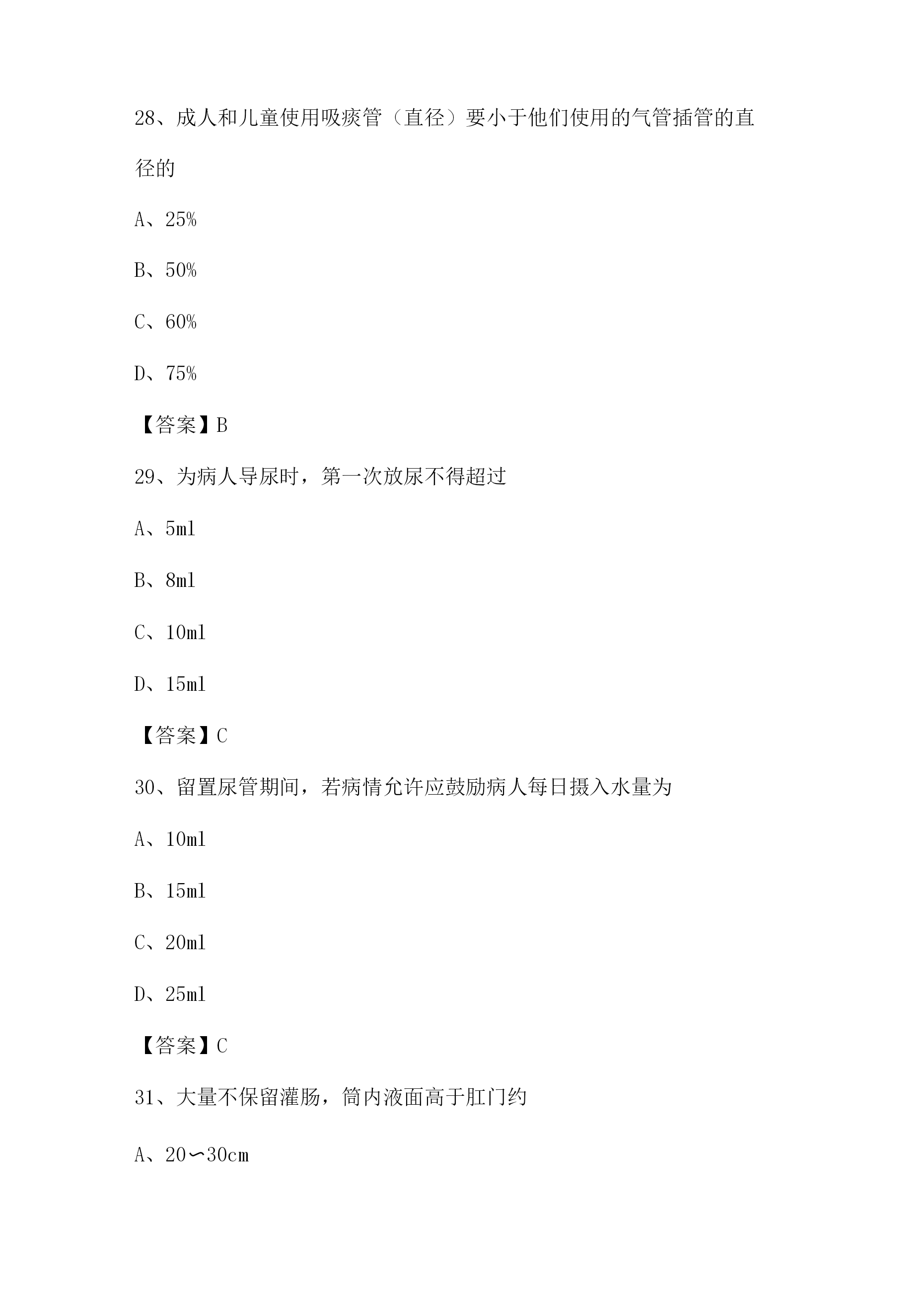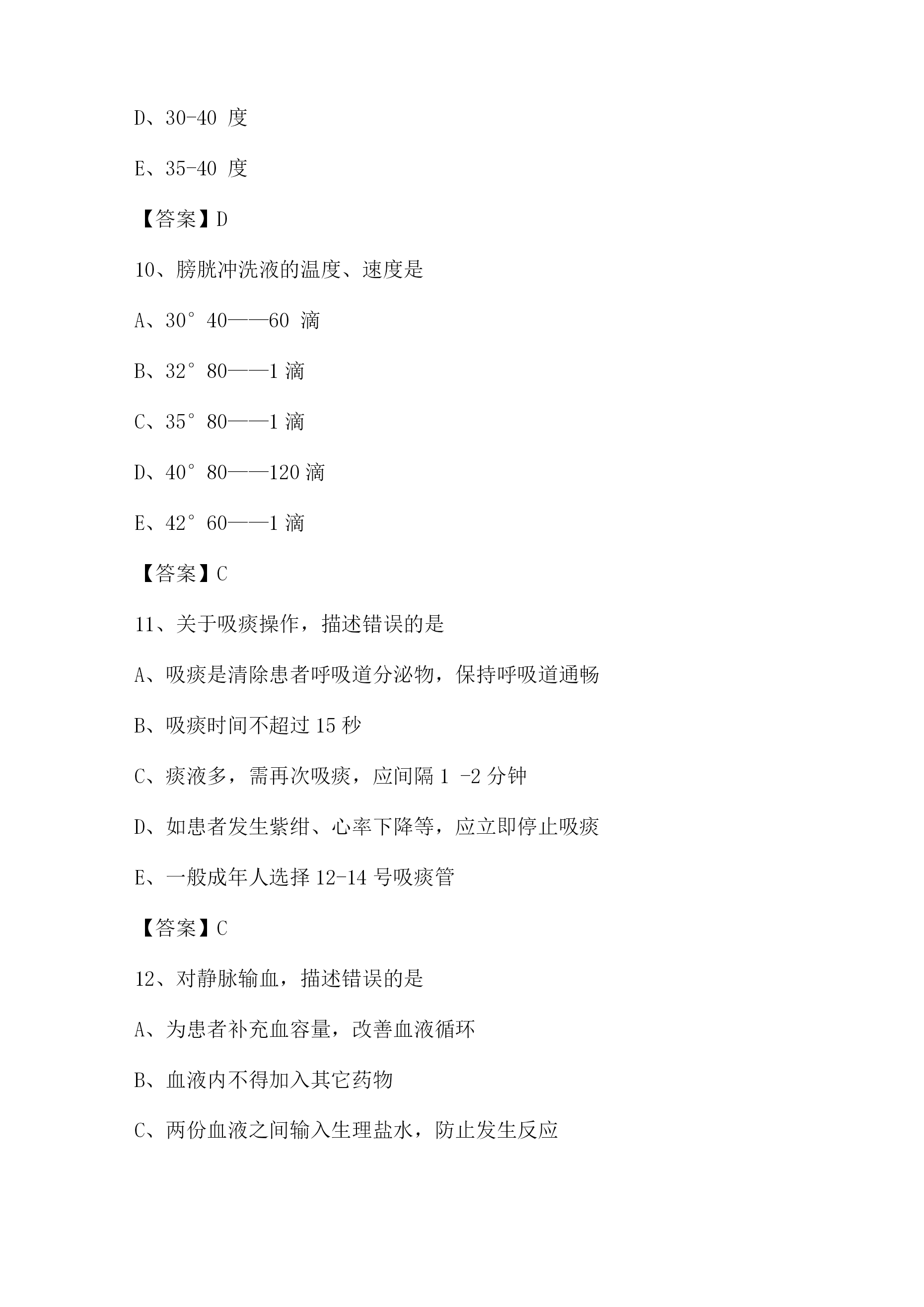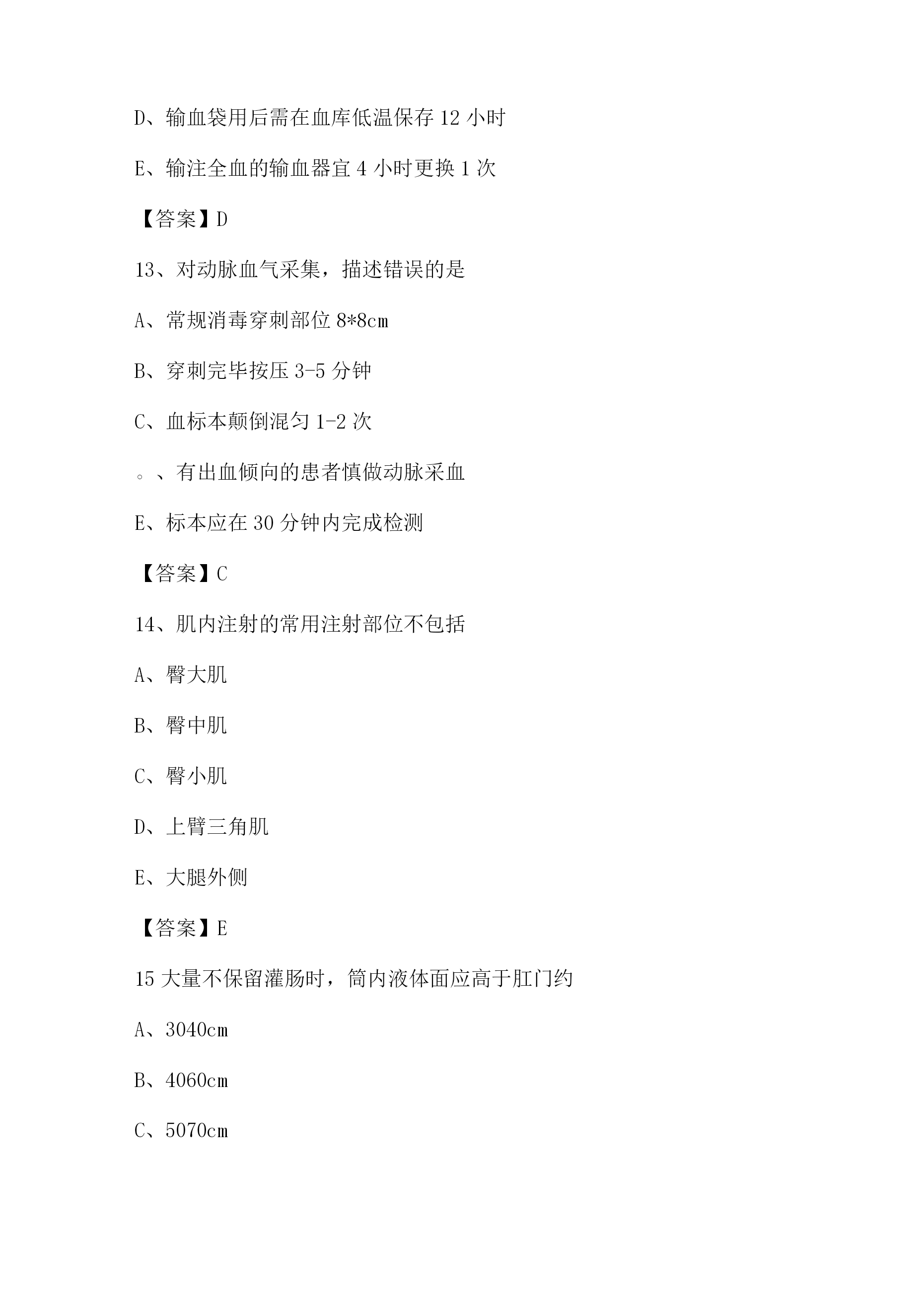 内科系统公共操作理论试题及答案一、单选题1、检查患者有无胃潴留,回抽胃内容物,超过多少毫升时,应当通知医生减量或暂停鼻饲。TOC\o"1-5"\h\zA、250mlB、2mlC、150mlD、1mlE、50ml【答案】C2、长期鼻饲的患者应每日进行腔护理()次,并定期更换胃管,普通胃管每()更换1次、硅胶胃管每()更换1次。A、1、月、周B、2、日、周C、2、周、月D、1、周、月E、1、日、月【答案】C3、鼻饲液的温度是:A、38—40°B、40—42°C、42—44°D、36-38°E、33-35°【答案】A4、静脉采血最常用:A、贵要静脉B、正中静脉C、头静脉D、股静脉E、颈静脉【答案】B5、心脏按压时,按压部位及抢救者双手的摆放是A、胸骨中、下1/3交界处,双手平行叠放B、胸骨中、下1/3交界处,双手垂直叠放C、胸骨左缘两横指,双手平行叠放D、胸骨左缘两横指,双手垂直叠放£、心前区,双手垂直叠放【答案】A6、真菌感染,应选择的腔护理溶液是:A、过氧化氢溶液B、洗必泰溶液C、碳酸氢钠溶液D、醋酸溶液E、甲硝唑溶液【答案】C7、对血糖描述,错误的是A、空腹血糖正常值:3、9-5、6mmol/L(静脉血)B、空腹血糖正常值:3、9-6、1mmol/L(末梢血)C、餐后2小时血糖正常值:<7、0mmol/LD、采血部位应注意轮换E、采血时,应擦去第一滴血,吸取血样【答案】C8、皮试后5min患者出现胸闷、气促伴濒危感,皮肤瘙痒,面色苍白,出冷汗,脉细速,血压下降,烦躁不安,处理措施不当的是:A、立即平卧,就地抢救B、立即皮下注射0、1%去甲肾上腺素1毫升C、遵医嘱给予激素、升压药等D、保持呼吸道通畅E、给予氧气吸入【答案】C9、皮下注射的角度为A、20-30度B、25-30度C、30-35度D、30-40度E、35-40度【答案】D10、膀胱冲洗液的温度、速度是A、30°40——60滴TOC\o"1-5"\h\zB、32°80——1滴C、35°80——1滴D、40°80——120滴E、42°60——1滴【答案】C11、关于吸痰操作,描述错误的是A、吸痰是清除患者呼吸道分泌物,保持呼吸道通畅B、吸痰时间不超过15秒C、痰液多,需再次吸痰,应间隔1-2分钟D、如患者发生紫绀、心率下降等,应立即停止吸痰E、一般成年人选择12-14号吸痰管【答案】C12、对静脉输血,描述错误的是A、为患者补充血容量,改善血液循环B、血液内不得加入其它药物C、两份血液之间输入生理盐水,防止发生反应D、输血袋用后需在血库低温保存12小时E、输注全血的输血器宜4小时更换1次【答案】D13、对动脉血气采集,描述错误的是A、常规消毒穿刺部位8*8cmB、穿刺完毕按压3-5分钟C、血标本颠倒混匀1-2次。、有出血倾向的患者慎做动脉采血E、标本应在30分钟内完成检测【答案】C14、肌内注射的常用注射部位不包括A、臀大肌B、臀中肌C、臀小肌D、上臂三角肌E、大腿外侧【答案】E15大量不保留灌肠时,筒内液体面应高于肛门约TOC\o"1-5"\h\zA、3040cmB、4060cmC、5070cmD、4070cmE、根据患者耐受情况【答案】B16、灌肠应在体温单大便栏目处记录灌肠结果,如灌肠后大便一次,为TOC\o"1-5"\h\zA、1/EB、1/BC、1/日D、1/qdE、1/R【答案】A17、患者发热,T39、2°,遵医嘱抽取血培养。关于抽取血培养标本,下列叙述不正确的是A、分别采集需氧和厌氧血培养标本各1套B、在寒战和发热初前30分钟至1小时采集C、在使用抗生素前采集D、每个培养瓶采血成人510mlE、皮肤消毒面积不小于8*8cm【答案】D18、缺氧程度的判断下列不正确是A、瞌睡、谑妄、轻度或明显发绀、呼吸困难中度缺氧B、神情清楚,无发绀,PaO2>50mmHgSaO2>80%轻度缺氧C、神情昏迷,严重发绀、呼吸极度困难重度缺氧D、PaO230—50mmHg中度缺氧E、神情昏迷,三凹征、PaO2<30mmHgSaO2<50%重度缺氧【答案】E19、尿标本的留取叙述不正确的是A、晨尿:留取晨起后第一次尿液的中段尿B、餐后尿:留取进餐后2h的尿液C、尿定量:将规定时间内的尿液装入灭菌容器内,混匀后记录总量,取12ml送检D、尿胆原检测:以留取14:——16:期间的尿液为宜E、尿培养:用清水充分清洗会阴部,再用灭菌水冲洗尿道,排尿,将前端尿弃去,留取中段尿10ml,置于灭菌容器内