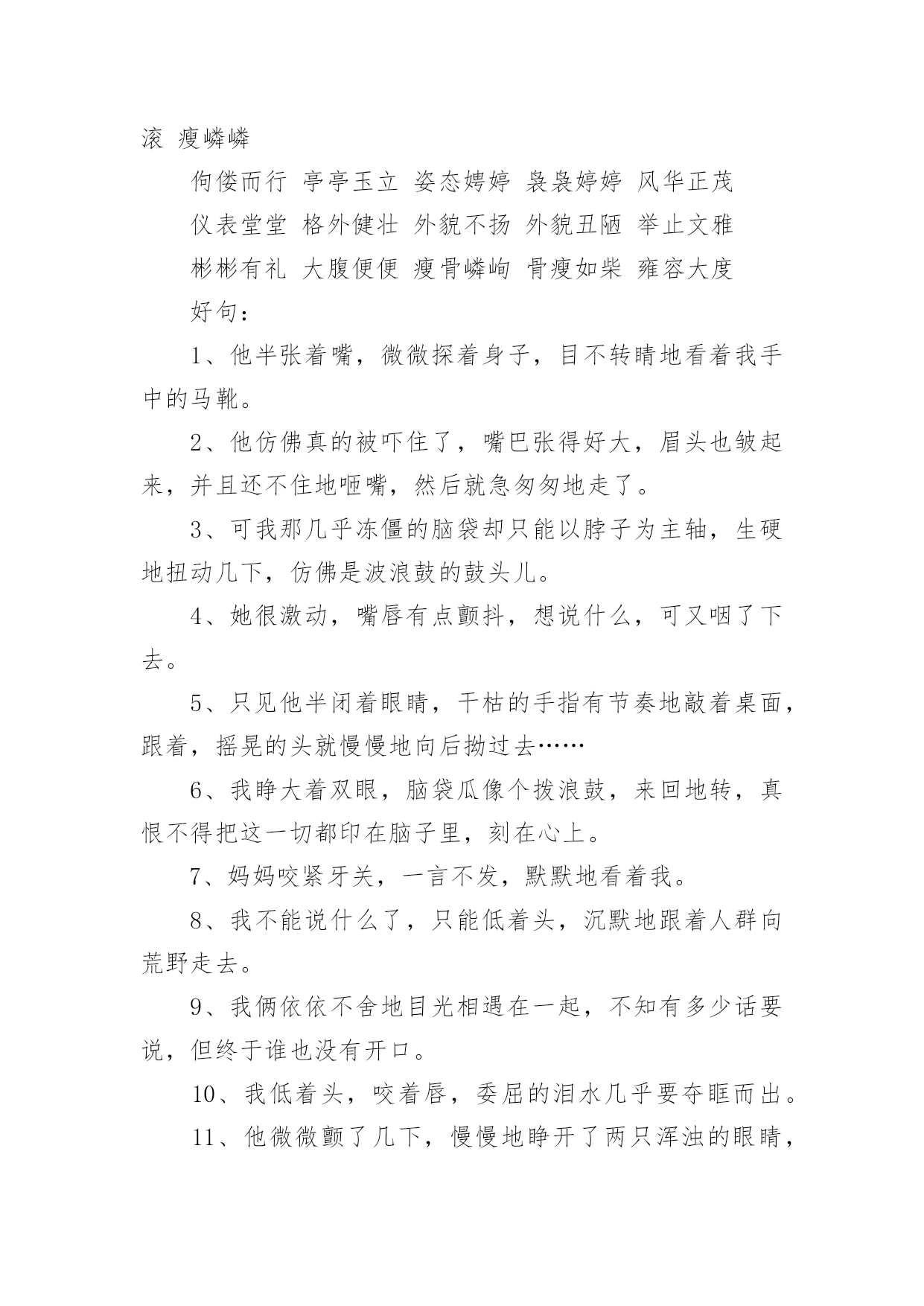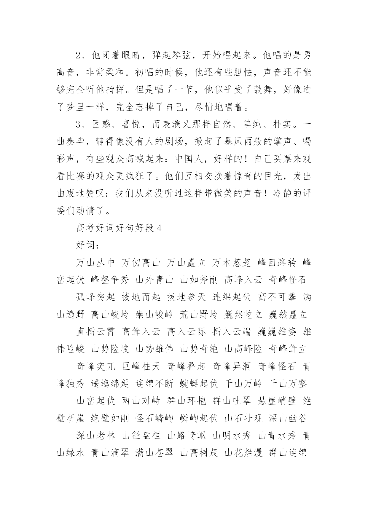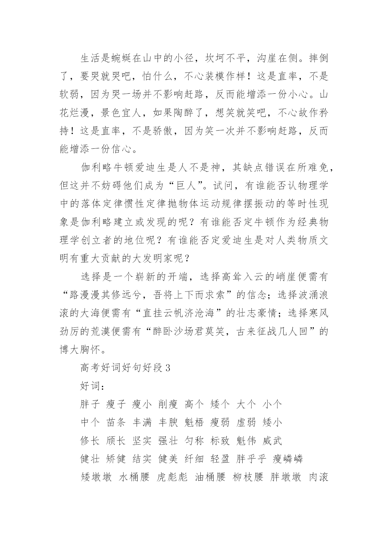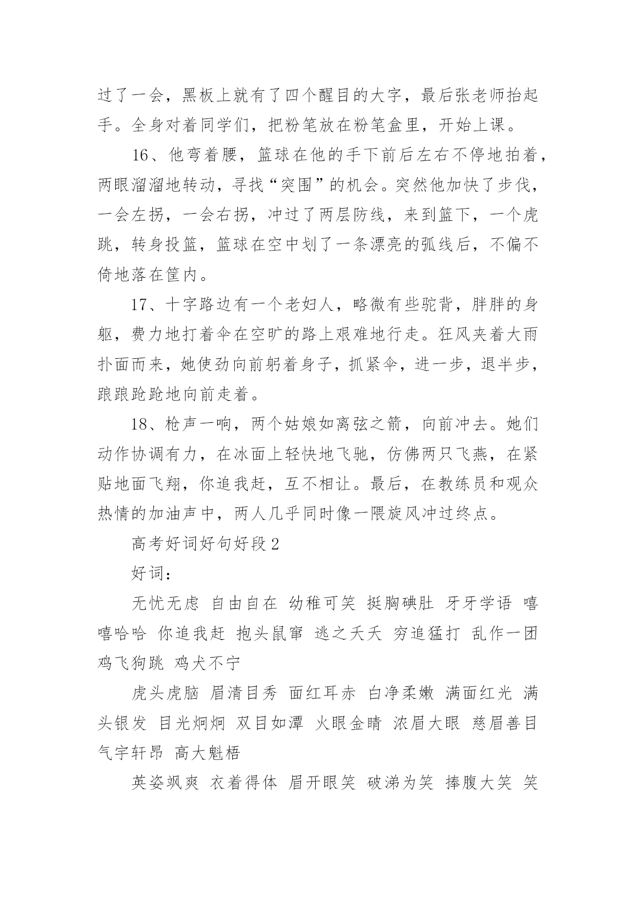 高考好词好句好段高考好词好句好段无论是在学校还是在社会中,大家总免不了要接触或使用好词好句吧,把语言优美,值得品析,值得学习的好词好句记录到本子上,闲暇时拿出来翻阅。什么样的好词好句才经典呢?以下是小编帮大家整理的高考好词好句好段,希望能够帮助到大家。高考好词好句好段1好词:戳、转、滑、喂、摸、削、剥、捞、刮、切、掏、架、臭骂、抵挡、着魔、凝视、翻腾、浸湿、欣慰、笨手笨脚、一扫而光、不亦乐乎、情不自禁、井井有条、九牛二虎之力、迅雷不及掩耳之势好句:1、我向前冲了几步,有力地一跳,那矫健而倒立的身影在空中迅速旋转着,又迅速落入了水中。2、我把鱼骨头一根一根地用牙齿咬,用手拨,总算啃掉了半个鱼头,一点鱼肉都没吃到。3、我把游泳圈一甩,“扑通”一声跳进了奔腾的湘江,像小泥鳅似的游了起来。4、我把拖把在水池里涮了又涮,再拧干,然后弯下腰,前腿弓起,后退绷着,“哼哧哼哧”拖起地来。5、宁佳音跑到跳高架的横杆前,又脚踏地,双臂猛摆,身体就像小燕子一样飞过了横杆。6、我将搭在背上的书包拽下来,低着头,一步半寸地挪到老师跟前,头不抬,眼皮不跳,气呼呼地站着。7、我点了点头,像个小地鼠似的钻进了西瓜地.8、我先在锅里倒入少量的油,等油冒烟的时候,我赶紧把鸡蛋倒入锅中,只听见“嚓”地一声,鸡蛋在油锅里迅速泛起,它地边缘多像小姑娘裙子上的花边。9、她往窗玻璃上呵一口气,再用指甲蹭一蹭,一连串动作干净利落。10、我倒了盆水,先用毛巾湿湿脸,再打上香皂,用劲地抓呀、搓呀,不一会儿就满脸香皂沫了。好段:11、那是由两个十二三岁的小姑娘表演的转伞杂技。节目开始了,只见一个小女子蹲下,另一个女孩稳稳地踩在肩上。蹲下去的女孩慢慢地直起身,两个人手依然保持平衡的样子。只见,下面的小女孩慢慢拿起伞递给了踩在自己肩上的小女孩,凌空转起了伞。就这样,一支、两支……伞在她们的手里又一次转了起来,旋转的小伞就像一支支翩翩起舞的彩蝶,两个纤细的身躯轻盈地移动变换着各种姿势恰似优柔的柳枝,蝶绕枝飞,是那样的和谐,完美。12、那个运动员,在沙坑前做着准备活动,弯弯腰,踢踢腿,做两个开蹲。脸上洋溢着自信的笑容。“下一位”,裁判叫道。那位运动员走到起跑线上,左脚在前,右脚在后,形成“弓”字步,双手托地。眼睛睁得大大的,像一只猎豺找到了猎物,准备进攻。“砰”的一声,运动员似箭般冲了出去,才开始是慢慢地,稳重的慢跑。到了中间那条红白相间的线,他的后面似乎有人在推,开始加速,脸上的笑容也不见了,换成一副严肃的表情。到了最后一条红白相间的线,用尽全力,脚上像了动翅膀,飞奔踏板。在左脚踏上踏板的时候,时间似乎凝住了,所有人都屏住呼吸,只见他用力在踏板上一蹬,随即蹦高半米,在空中划过一个漂亮的圆弧,坠入沙坑,双腿弯曲整个人蹲在那里,双手握拳在腰旁。13、轮到我们钉了。我迫不及待地把线浸了唾沫,捻了捻。可是我一捻,把那几个小毛头捻得又细又长,穿针得时候,穿来穿去就是穿不进去。我只好把毛头拽下来才穿进去。接着,我在线得末端打上结,由于线上有唾沫,打结得时候,老是粘住手指,好不容易才把结打好。14、今天,我家里摆了一张乒乓球桌,请了我的伙伴杨鑫来打乒乓球。先是我发球了,我想:“我发‘抬空球’”,他一定会抽过来,于是我发了一个较低的抬空球,不想,他猛地抽过来了,我没接过来,唉,真是自作自受。轮到杨鑫发球。只见他脸绷得紧紧的,眼睛盯着我慢慢地举起球拍,突然他身子一沉,右手闪电似的一击,球像一道白光蹿向我方的球台,我后退不及。慌忙一挡,哎呀,球飞出界了,我输了。15、张老师首先轻轻的拿起粉笔,然后慢慢地转过身,把右手高高的举起,放在黑板上,头对着同学们,眼睛目不转睛的盯着那个小朋友,安静了,张老师才转过头开始写字,过了一会,黑板上就有了四个醒目的大字,最后张老师抬起手。全身对着同学们,把粉笔放在粉笔盒里,开始上课。16、他弯着腰,篮球在他的手下前后左右不停地拍着,两眼溜溜地转动,寻找“突围”的机会。突然他加快了步伐,一会左拐,一会右拐,冲过了两层防线,来到篮下,一个虎跳,转身投篮,篮球在空中划了一条漂亮的弧线后,不偏不倚地落在筐内。17、十字路边有一个老妇人,略微有些驼背,胖胖的身躯,费力地打着伞在空旷的路上艰难地行走。狂风夹着大雨扑面而来,她使劲向前躬着身子,抓紧伞,进一步,退半步,踉踉跄跄地向前走着。18、枪声一响,两个姑娘如离弦之箭,向前冲去。她们动作协调有力,在冰面上轻快地飞驰,仿佛两只飞燕,在紧贴地面飞翔,你追我赶,互不相让。最后,在教练员和观众热情的加油声中,两人几乎同时像一隈旋风冲过终点。高考好词好句好段2好词:无忧无虑自由自在幼稚可笑挺胸碘肚牙牙学语嘻嘻哈哈你追我赶抱头鼠窜逃之夭夭穷追猛打乱作一团鸡飞狗跳鸡犬不宁虎头虎脑眉清目秀面红耳赤白净柔嫩满面红光满头银发目光炯炯双目如潭火眼金睛浓
