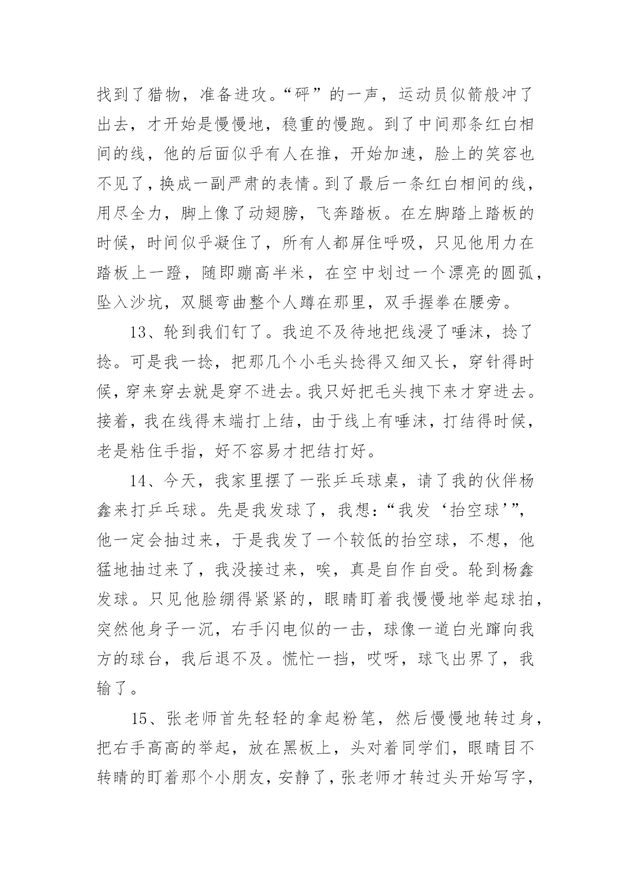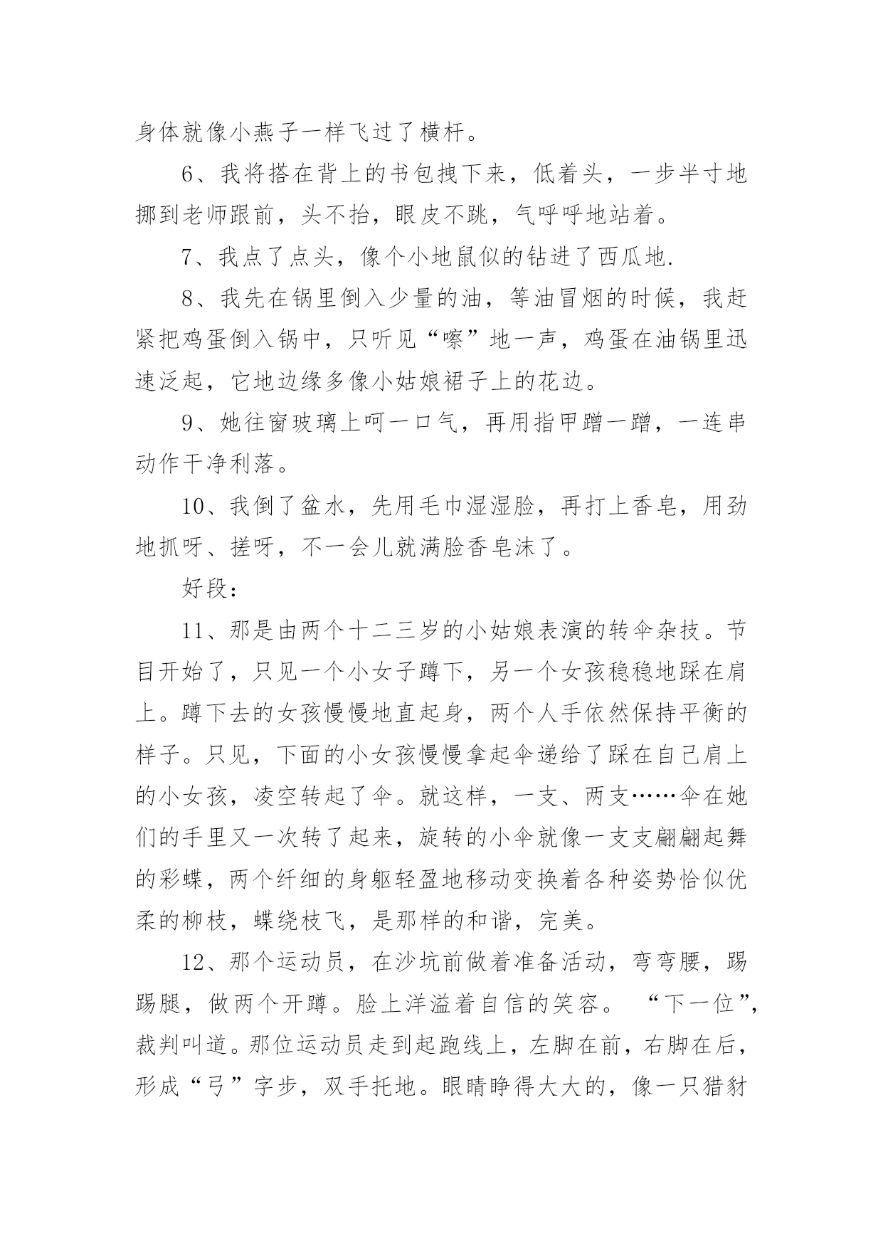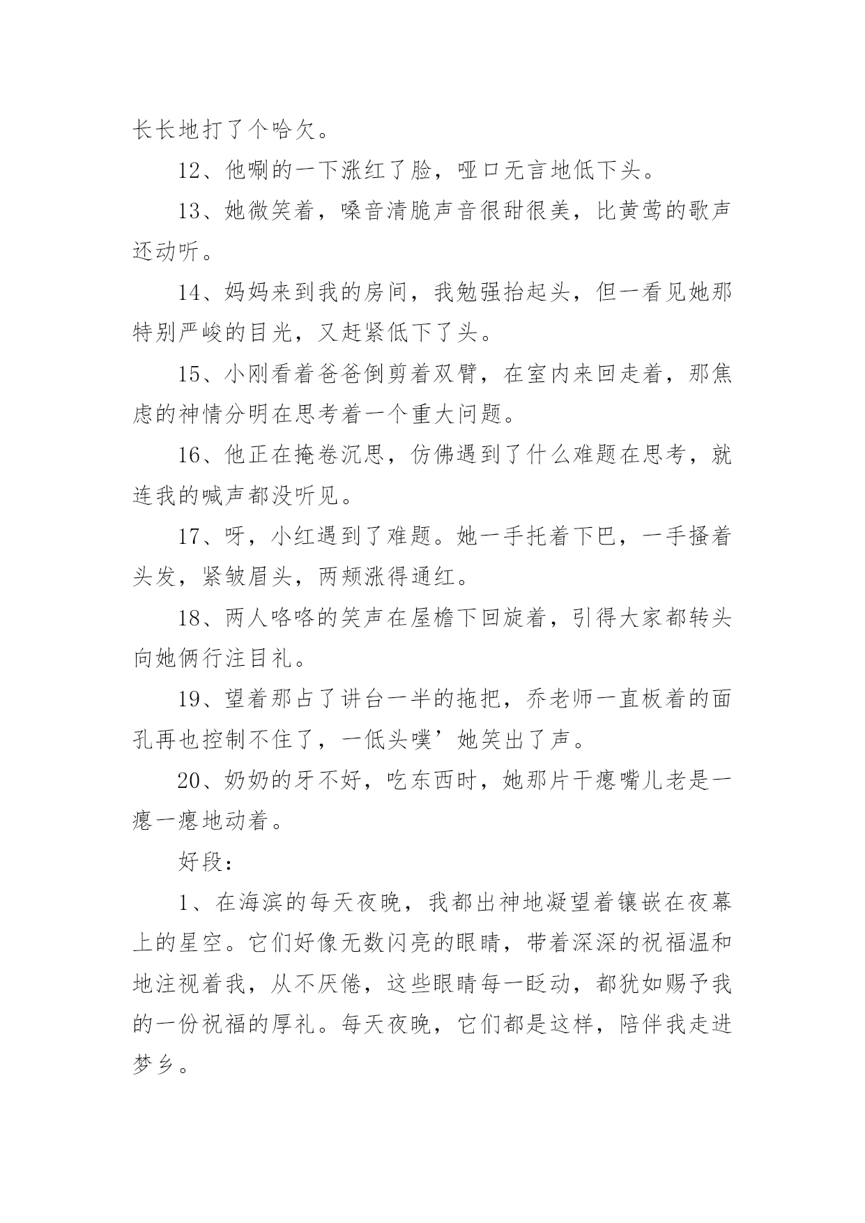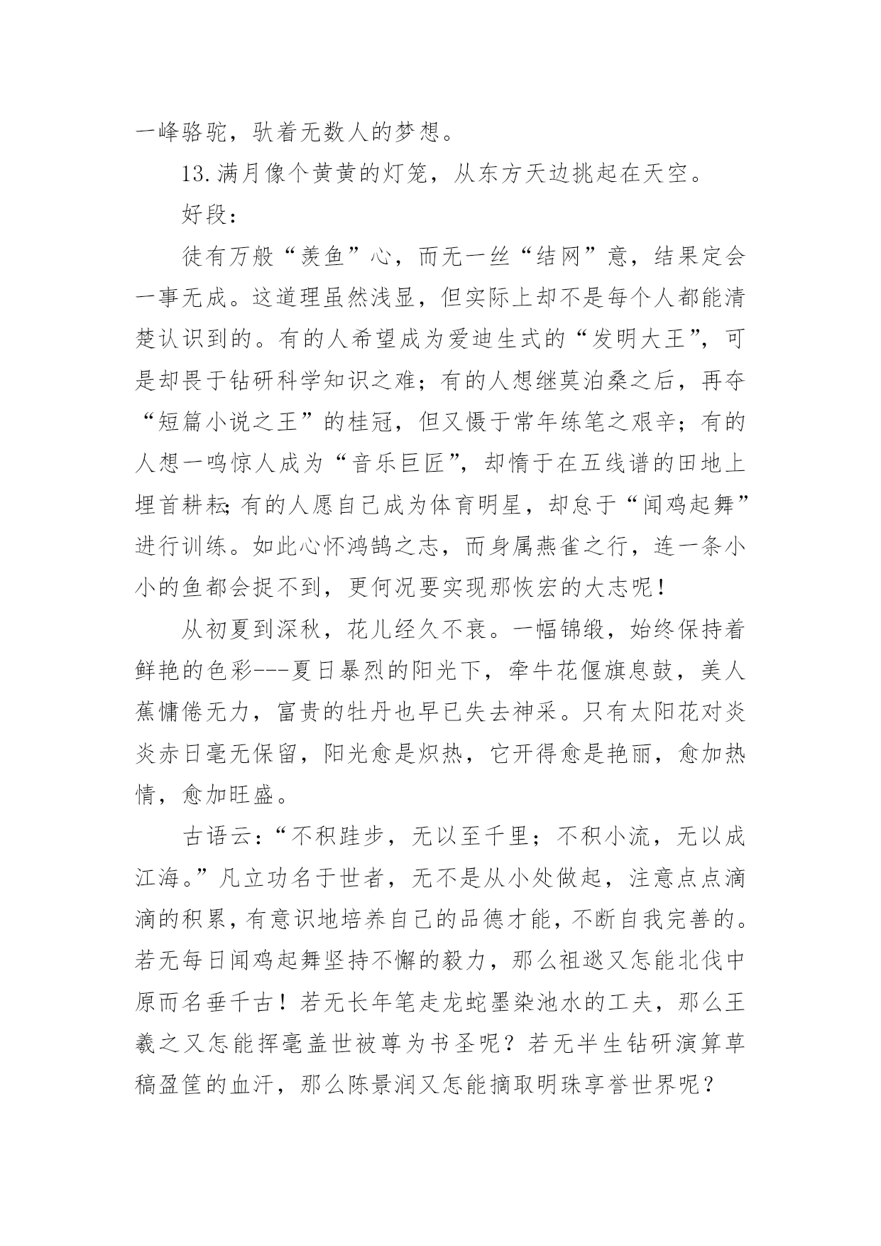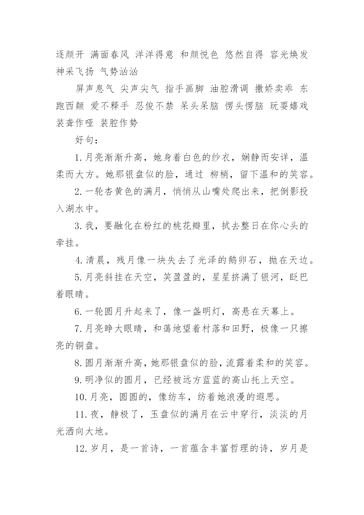 高考好词好句好段高考好词好句好段无论是在学校还是在社会中,大家总免不了要接触或使用好词好句吧,把语言优美,值得品析,值得学习的好词好句记录到本子上,闲暇时拿出来翻阅。什么样的好词好句才经典呢?以下是小编帮大家整理的高考好词好句好段,希望能够帮助到大家。高考好词好句好段1好词:戳、转、滑、喂、摸、削、剥、捞、刮、切、掏、架、臭骂、抵挡、着魔、凝视、翻腾、浸湿、欣慰、笨手笨脚、一扫而光、不亦乐乎、情不自禁、井井有条、九牛二虎之力、迅雷不及掩耳之势好句:1、我向前冲了几步,有力地一跳,那矫健而倒立的身影在空中迅速旋转着,又迅速落入了水中。2、我把鱼骨头一根一根地用牙齿咬,用手拨,总算啃掉了半个鱼头,一点鱼肉都没吃到。3、我把游泳圈一甩,“扑通”一声跳进了奔腾的湘江,像小泥鳅似的游了起来。4、我把拖把在水池里涮了又涮,再拧干,然后弯下腰,前腿弓起,后退绷着,“哼哧哼哧”拖起地来。5、宁佳音跑到跳高架的横杆前,又脚踏地,双臂猛摆,身体就像小燕子一样飞过了横杆。6、我将搭在背上的书包拽下来,低着头,一步半寸地挪到老师跟前,头不抬,眼皮不跳,气呼呼地站着。7、我点了点头,像个小地鼠似的钻进了西瓜地.8、我先在锅里倒入少量的油,等油冒烟的时候,我赶紧把鸡蛋倒入锅中,只听见“嚓”地一声,鸡蛋在油锅里迅速泛起,它地边缘多像小姑娘裙子上的花边。9、她往窗玻璃上呵一口气,再用指甲蹭一蹭,一连串动作干净利落。10、我倒了盆水,先用毛巾湿湿脸,再打上香皂,用劲地抓呀、搓呀,不一会儿就满脸香皂沫了。好段:11、那是由两个十二三岁的小姑娘表演的转伞杂技。节目开始了,只见一个小女子蹲下,另一个女孩稳稳地踩在肩上。蹲下去的女孩慢慢地直起身,两个人手依然保持平衡的样子。只见,下面的小女孩慢慢拿起伞递给了踩在自己肩上的小女孩,凌空转起了伞。就这样,一支、两支……伞在她们的手里又一次转了起来,旋转的小伞就像一支支翩翩起舞的彩蝶,两个纤细的身躯轻盈地移动变换着各种姿势恰似优柔的柳枝,蝶绕枝飞,是那样的和谐,完美。12、那个运动员,在沙坑前做着准备活动,弯弯腰,踢踢腿,做两个开蹲。脸上洋溢着自信的笑容。“下一位”,裁判叫道。那位运动员走到起跑线上,左脚在前,右脚在后,形成“弓”字步,双手托地。眼睛睁得大大的,像一只猎豺找到了猎物,准备进攻。“砰”的一声,运动员似箭般冲了出去,才开始是慢慢地,稳重的慢跑。到了中间那条红白相间的线,他的后面似乎有人在推,开始加速,脸上的笑容也不见了,换成一副严肃的表情。到了最后一条红白相间的线,用尽全力,脚上像了动翅膀,飞奔踏板。在左脚踏上踏板的时候,时间似乎凝住了,所有人都屏住呼吸,只见他用力在踏板上一蹬,随即蹦高半米,在空中划过一个漂亮的圆弧,坠入沙坑,双腿弯曲整个人蹲在那里,双手握拳在腰旁。13、轮到我们钉了。我迫不及待地把线浸了唾沫,捻了捻。可是我一捻,把那几个小毛头捻得又细又长,穿针得时候,穿来穿去就是穿不进去。我只好把毛头拽下来才穿进去。接着,我在线得末端打上结,由于线上有唾沫,打结得时候,老是粘住手指,好不容易才把结打好。14、今天,我家里摆了一张乒乓球桌,请了我的伙伴杨鑫来打乒乓球。先是我发球了,我想:“我发‘抬空球’”,他一定会抽过来,于是我发了一个较低的抬空球,不想,他猛地抽过来了,我没接过来,唉,真是自作自受。轮到杨鑫发球。只见他脸绷得紧紧的,眼睛盯着我慢慢地举起球拍,突然他身子一沉,右手闪电似的一击,球像一道白光蹿向我方的球台,我后退不及。慌忙一挡,哎呀,球飞出界了,我输了。15、张老师首先轻轻的拿起粉笔,然后慢慢地转过身,把右手高高的举起,放在黑板上,头对着同学们,眼睛目不转睛的盯着那个小朋友,安静了,张老师才转过头开始写字,过了一会,黑板上就有了四个醒目的大字,最后张老师抬起手。全身对着同学们,把粉笔放在粉笔盒里,开始上课。16、他弯着腰,篮球在他的手下前后左右不停地拍着,两眼溜溜地转动,寻找“突围”的机会。突然他加快了步伐,一会左拐,一会右拐,冲过了两层防线,来到篮下,一个虎跳,转身投篮,篮球在空中划了一条漂亮的弧线后,不偏不倚地落在筐内。17、十字路边有一个老妇人,略微有些驼背,胖胖的身躯,费力地打着伞在空旷的路上艰难地行走。狂风夹着大雨扑面而来,她使劲向前躬着身子,抓紧伞,进一步,退半步,踉踉跄跄地向前走着。18、枪声一响,两个姑娘如离弦之箭,向前冲去。她们动作协调有力,在冰面上轻快地飞驰,仿佛两只飞燕,在紧贴地面飞翔,你追我赶,互不相让。最后,在教练员和观众热情的加油声中,两人几乎同时像一隈旋风冲过终点。高考好词好句好段2好词:无忧无虑自由自在幼稚可笑挺胸碘肚牙牙学语嘻嘻哈哈你追我赶抱头鼠窜逃之夭夭穷追猛打乱作一团鸡飞狗跳鸡犬不宁虎头虎脑眉清目秀面红耳赤白净柔嫩满面红光满头银发目光炯炯双目如潭火眼金睛浓