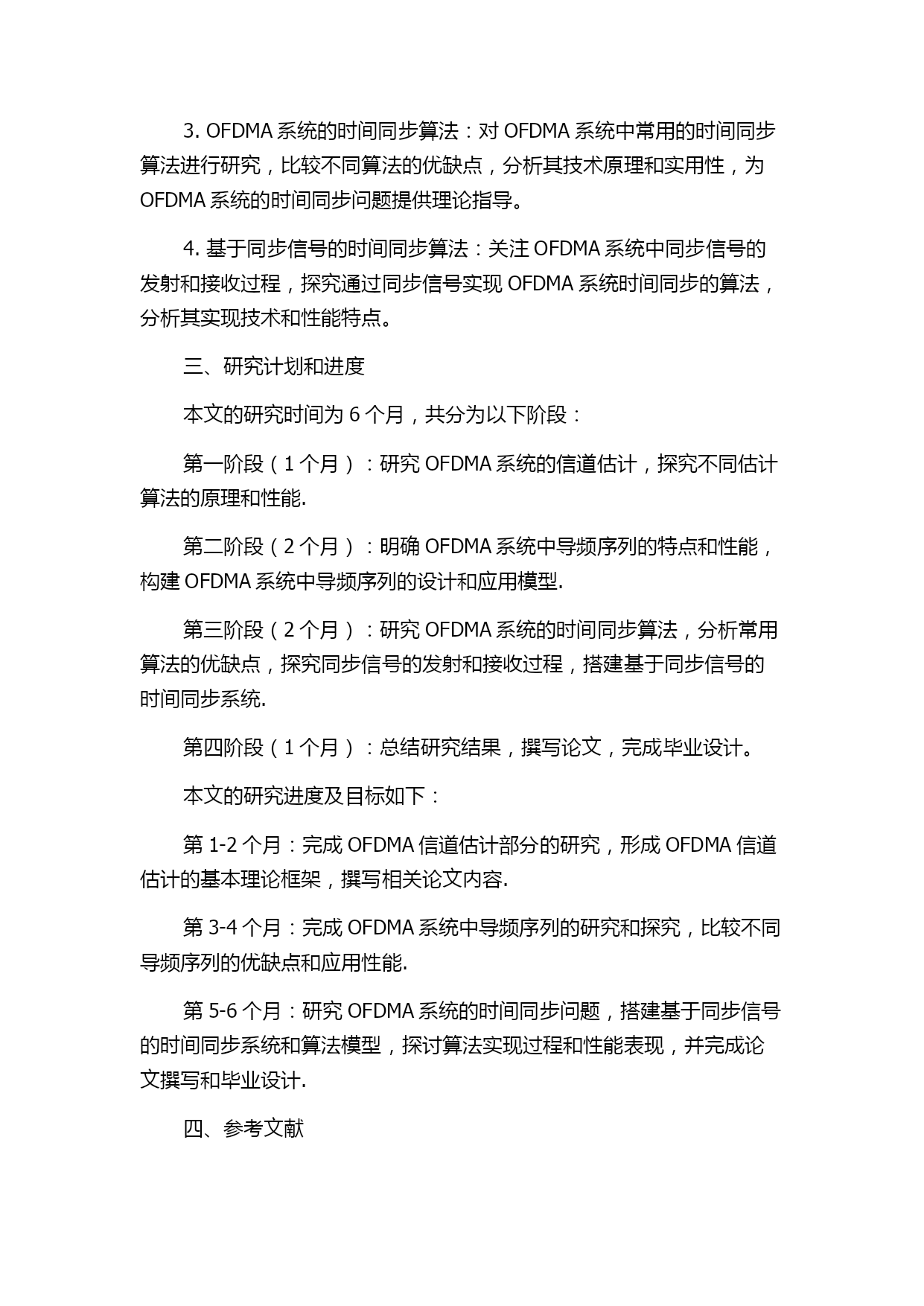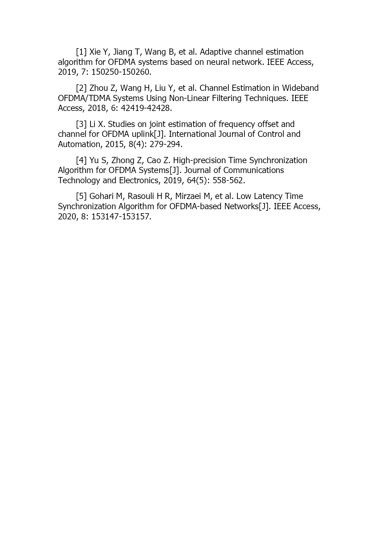 OFDMA系统信道估计与时间同步的研究的开题报告题目:OFDMA系统信道估计与时间同步的研究一、研究背景和意义OFDMA技术是当前广泛应用于无线通信系统中的一种多载波调制技术,具有频谱利用率高、系统性能稳定等优势,适用于4G和5G移动通信系统等多种应用场景。而在OFDMA信号的发射和接收过程中,信道估计和时间同步是无线通信系统中的基础问题,对系统性能具有决定性作用。在OFDMA信道估计中,通过对分布在不同子载波上的导频序列的接收,可以实现高精度的信道估计,进而优化信号传输过程,降低信噪比的要求,提高系统的信噪比性能。而在OFDMA系统的时间同步问题中,若发射和接收方的时钟频率存在偏差,可能会导致信号失真和误码率增加,影响系统性能。因此,在OFDMA系统的信道估计和时间同步问题上开展研究,对于提高OFDMA技术在无线通信系统中的应用性能具有重要意义。二、研究目的和内容本文旨在探究OFDMA系统信道估计方法和时间同步算法,针对研究的目标,主要有以下内容:1.OFDMA系统的信道估计方法:通过研究OFDMA系统的信道估计方法,探究其技术实现和性能特点,比较不同估计算法的优缺点,为实现高精度、高效率的OFDMA信道估计提供理论基础。2.基于导频序列的信道估计方法:针对OFDMA系统中导频序列的发射和接收过程,分析其原理,构建OFDMA系统中导频序列的设计和应用模型,研究其对信道估计性能的影响。3.OFDMA系统的时间同步算法:对OFDMA系统中常用的时间同步算法进行研究,比较不同算法的优缺点,分析其技术原理和实用性,为OFDMA系统的时间同步问题提供理论指导。4.基于同步信号的时间同步算法:关注OFDMA系统中同步信号的发射和接收过程,探究通过同步信号实现OFDMA系统时间同步的算法,分析其实现技术和性能特点。三、研究计划和进度本文的研究时间为6个月,共分为以下阶段:第一阶段(1个月):研究OFDMA系统的信道估计,探究不同估计算法的原理和性能.第二阶段(2个月):明确OFDMA系统中导频序列的特点和性能,构建OFDMA系统中导频序列的设计和应用模型.第三阶段(2个月):研究OFDMA系统的时间同步算法,分析常用算法的优缺点,探究同步信号的发射和接收过程,搭建基于同步信号的时间同步系统.第四阶段(1个月):总结研究结果,撰写论文,完成毕业设计。本文的研究进度及目标如下:第1-2个月:完成OFDMA信道估计部分的研究,形成OFDMA信道估计的基本理论框架,撰写相关论文内容.第3-4个月:完成OFDMA系统中导频序列的研究和探究,比较不同导频序列的优缺点和应用性能.第5-6个月:研究OFDMA系统的时间同步问题,搭建基于同步信号的时间同步系统和算法模型,探讨算法实现过程和性能表现,并完成论文撰写和毕业设计.四、参考文献[1]XieY,JiangT,WangB,etal.AdaptivechannelestimationalgorithmforOFDMAsystemsbasedonneuralnetwork.IEEEAccess,2019,7:150250-150260.[2]ZhouZ,WangH,LiuY,etal.ChannelEstimationinWidebandOFDMA/TDMASystemsUsingNon-LinearFilteringTechniques.IEEEAccess,2018,6:42419-42428.[3]LiX.StudiesonjointestimationoffrequencyoffsetandchannelforOFDMAuplink[J].InternationalJournalofControlandAutomation,2015,8(4):279-294.[4]YuS,ZhongZ,CaoZ.High-precisionTimeSynchronizationAlgorithmforOFDMASystems[J].JournalofCommunicationsTechnologyandElectronics,2019,64(5):558-562.[5]GohariM,RasouliHR,MirzaeiM,etal.LowLatencyTimeSynchronizationAlgorithmforOFDMA-basedNetworks[J].IEEEAccess,2020,8:153147-153157.