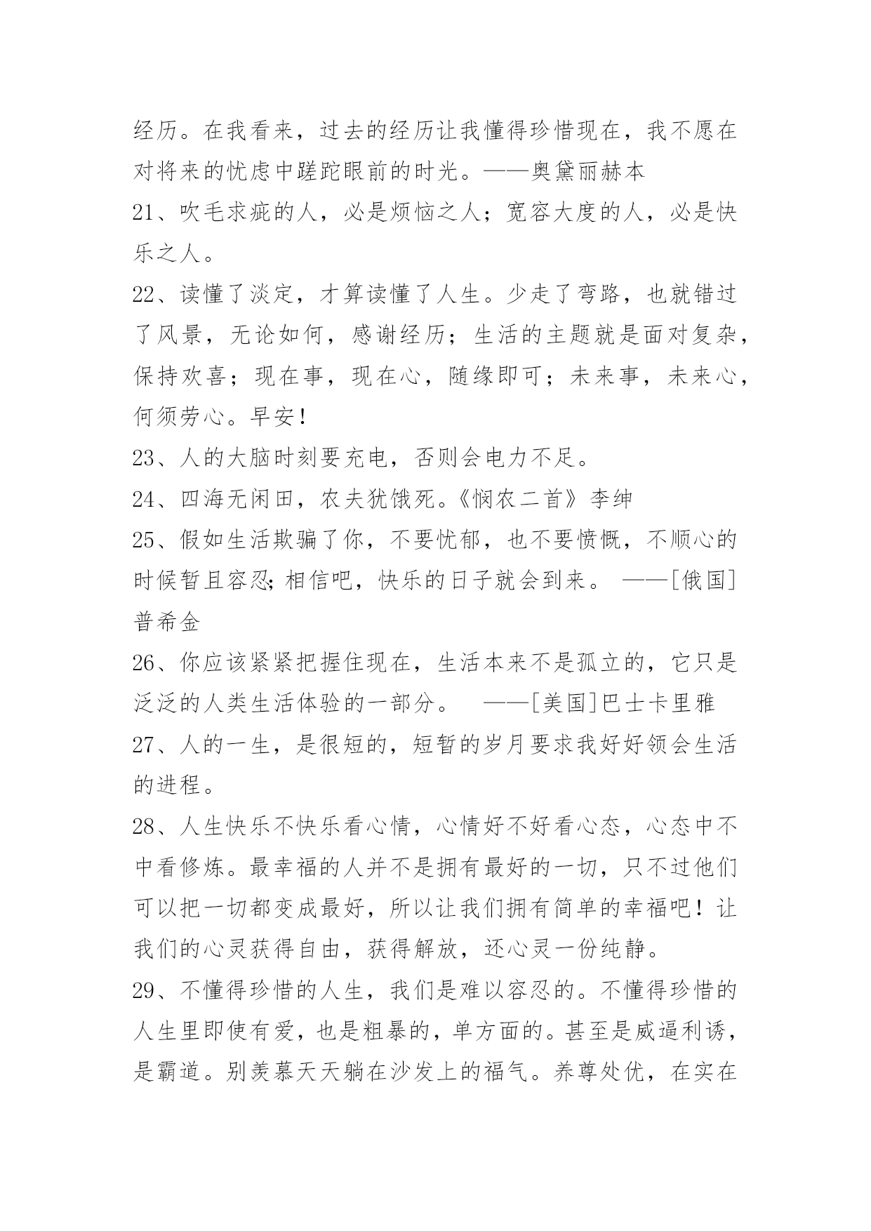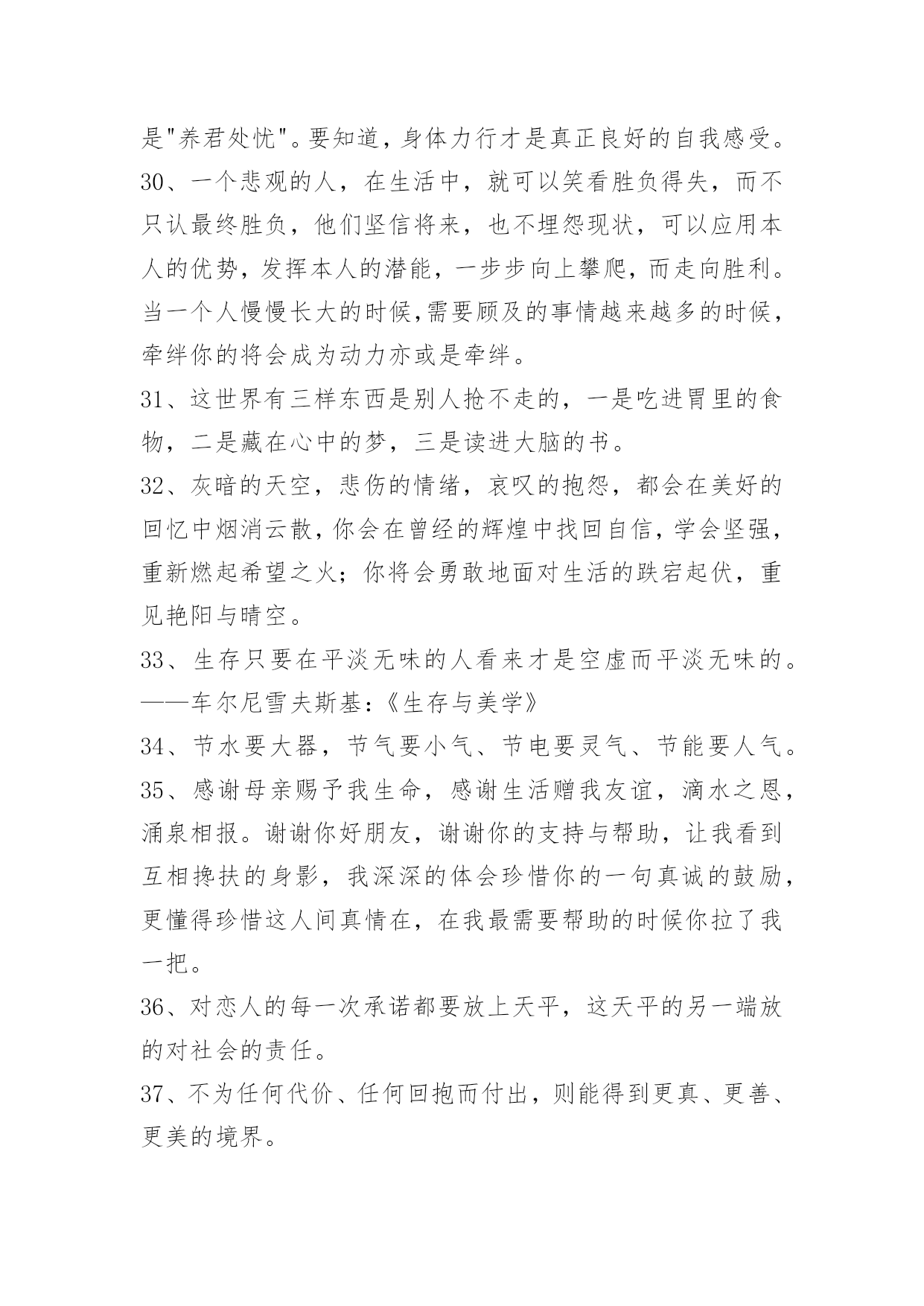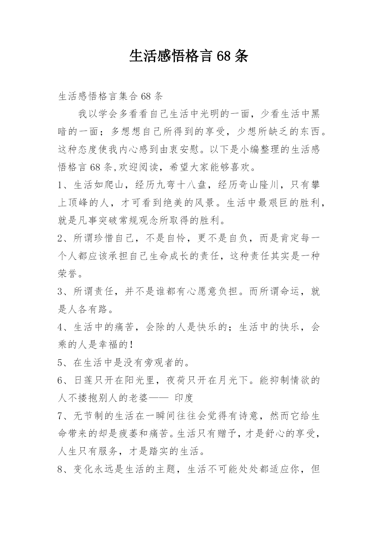 生活感悟格言68条生活感悟格言集合68条我以学会多看看自己生活中光明的一面,少看生活中黑暗的一面;多想想自己所得到的享受,少想所缺乏的东西。这种态度使我内心感到由衷安慰。以下是小编整理的生活感悟格言68条,欢迎阅读,希望大家能够喜欢。1、生活如爬山,经历九弯十八盘,经历奇山隆川,只有攀上顶峰的人,才可看到绝美的风景。生活中最艰巨的胜利,就是凡事突破常规观念所取得的胜利。2、所谓珍惜自己,不是自怜,更不是自负,而是肯定每一个人都应该承担自己生命成长的责任,这种责任其实是一种荣誉。3、所谓责任,并不是谁都有心愿意负担。而所谓命运,就是人各有路。4、生活中的痛苦,会除的人是快乐的;生活中的快乐,会乘的人是幸福的!5、在生活中是没有旁观者的。6、日莲只开在阳光里,夜荷只开在月光下。能抑制情欲的人不搂抱别人的老婆——印度7、无节制的生活在一瞬间往往会觉得有诗意,然而它给生命带来的却是疲萎和痛苦。生活只有赠予,才是舒心的享受,人生只有服务,才是踏实的生活。8、变化永远是生活的主题,生活不可能处处都适应你,但你却要学会处处适应生活。物竞天择,适者生存。9、永远我都会记得,在我肩上的双手,风起的时候,有多么温热;永远我都会记得,伴我成长的背影,用你的岁月换成我无忧的快乐!心情短语10、生活越紧张,越能显示人的生命力。——恩格斯11、生活是条难走的路,高低不平,坎坎坷坷,有喜悦也有忧伤,交替着向前演释。人就是在这样的环境中走向成熟,但不能逆来顺受,磨掉生活的梭角,要勇于奋进,知难而上,面对生活,感谢生命的情有独钟。12、生活中,谅解可以产生奇迹,谅解可以挽回感情上的损失,谅解犹如一个火把,能照亮由焦燥怨恨和复仇心理铺就的道路。13、善解风情的男人是好男人,不解风情的男人更是好男人。14、你不得不随遇而安,但是,你应该努力按照你向往的方式去生活。——坎贝尔15、与其说小说好像是生活,不如说生活就像是小说。16、我们习惯于以物质多寡衡量幸福长短。其实幸福只是一种改变命运和生活现状的虚幻力量。可以是充肌之饼,可以是雨后晴天,可以是天南地北素不相识的人们一条短信。17、谁要是不会爱,谁就不能理解生活。18、情欲犹如炭火,必须使它冷却,否则,那烈火会把心儿烧焦。19、人是未知数的仇敌。——土耳其20、珍惜生活,不管发生了什么,不管遇见谁都要享受这次经历。在我看来,过去的经历让我懂得珍惜现在,我不愿在对将来的忧虑中蹉跎眼前的时光。——奥黛丽赫本21、吹毛求疵的人,必是烦恼之人;宽容大度的人,必是快乐之人。22、读懂了淡定,才算读懂了人生。少走了弯路,也就错过了风景,无论如何,感谢经历;生活的主题就是面对复杂,保持欢喜;现在事,现在心,随缘即可;未来事,未来心,何须劳心。早安!23、人的大脑时刻要充电,否则会电力不足。24、四海无闲田,农夫犹饿死。《悯农二首》李绅25、假如生活欺骗了你,不要忧郁,也不要愤慨,不顺心的时候暂且容忍;相信吧,快乐的日子就会到来。——[俄国]普希金26、你应该紧紧把握住现在,生活本来不是孤立的,它只是泛泛的人类生活体验的一部分。——[美国]巴士卡里雅27、人的一生,是很短的,短暂的岁月要求我好好领会生活的进程。28、人生快乐不快乐看心情,心情好不好看心态,心态中不中看修炼。最幸福的人并不是拥有最好的一切,只不过他们可以把一切都变成最好,所以让我们拥有简单的幸福吧!让我们的心灵获得自由,获得解放,还心灵一份纯静。29、不懂得珍惜的人生,我们是难以容忍的。不懂得珍惜的人生里即使有爱,也是粗暴的,单方面的。甚至是威逼利诱,是霸道。别羡慕天天躺在沙发上的福气。养尊处优,在实在是"养君处忧"。要知道,身体力行才是真正良好的自我感受。30、一个悲观的人,在生活中,就可以笑看胜负得失,而不只认最终胜负,他们坚信将来,也不埋怨现状,可以应用本人的优势,发挥本人的潜能,一步步向上攀爬,而走向胜利。当一个人慢慢长大的时候,需要顾及的事情越来越多的时候,牵绊你的将会成为动力亦或是牵绊。31、这世界有三样东西是别人抢不走的,一是吃进胃里的食物,二是藏在心中的梦,三是读进大脑的书。32、灰暗的天空,悲伤的情绪,哀叹的抱怨,都会在美好的回忆中烟消云散,你会在曾经的辉煌中找回自信,学会坚强,重新燃起希望之火;你将会勇敢地面对生活的跌宕起伏,重见艳阳与晴空。33、生存只要在平淡无味的人看来才是空虚而平淡无味的。——车尔尼雪夫斯基:《生存与美学》34、节水要大器,节气要小气、节电要灵气、节能要人气。35、感谢母亲赐予我生命,感谢生活赠我友谊,滴水之恩,涌泉相报。谢谢你好朋友,谢谢你的支持与帮助,让我看到互相搀扶的身影,我深深的体会珍惜你的一句真诚的鼓励,更懂得珍惜这人间真情在,在我最需要帮助的时候你拉了我一把。36、对恋人的每一次承诺都要放上天平,这天平的另一
