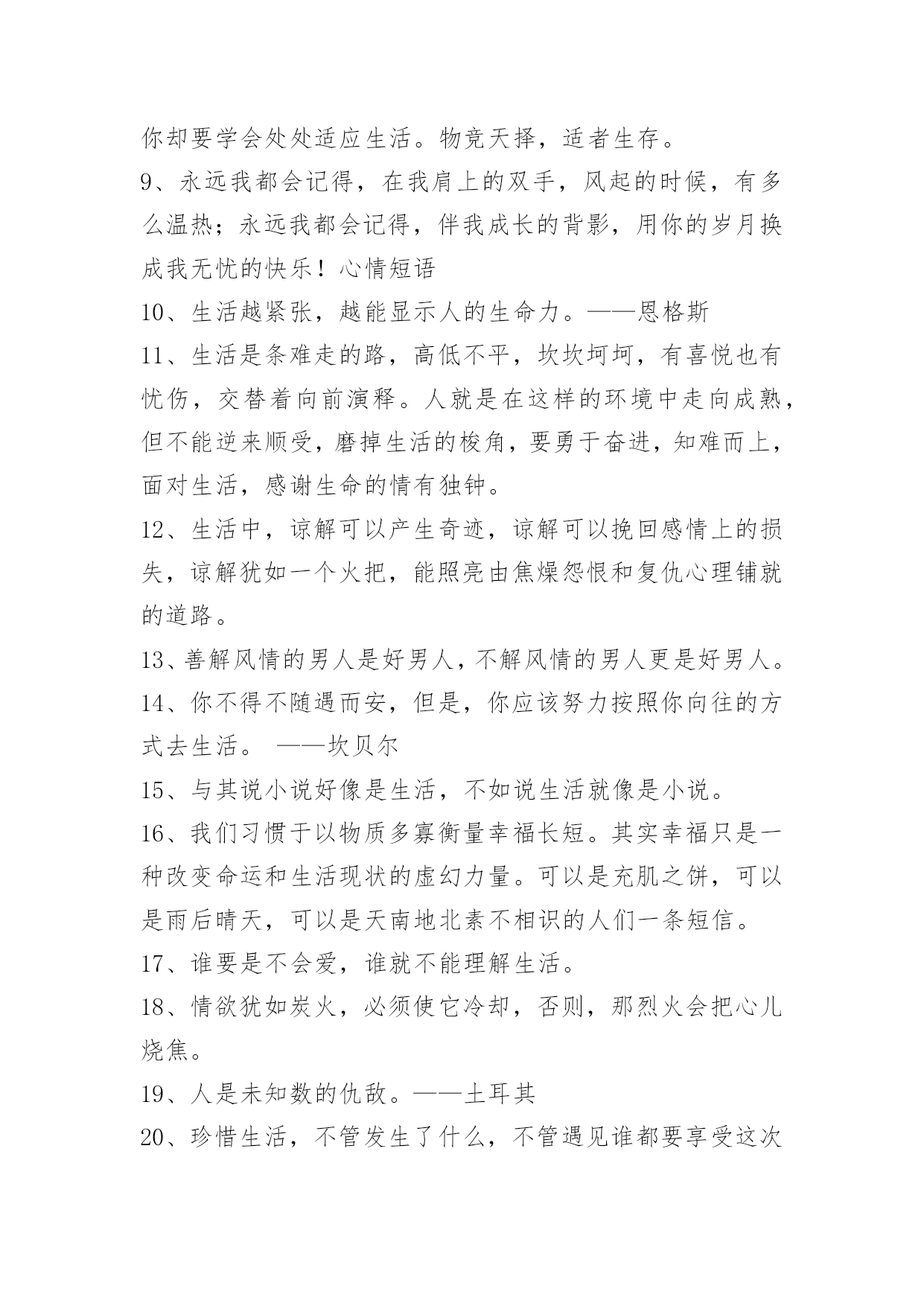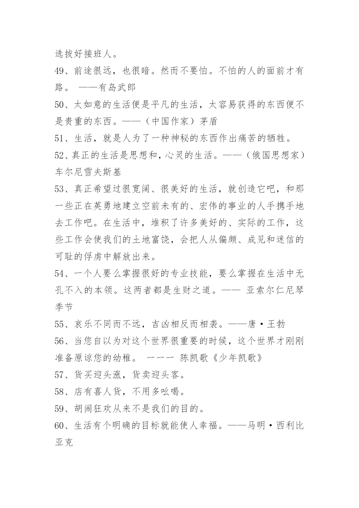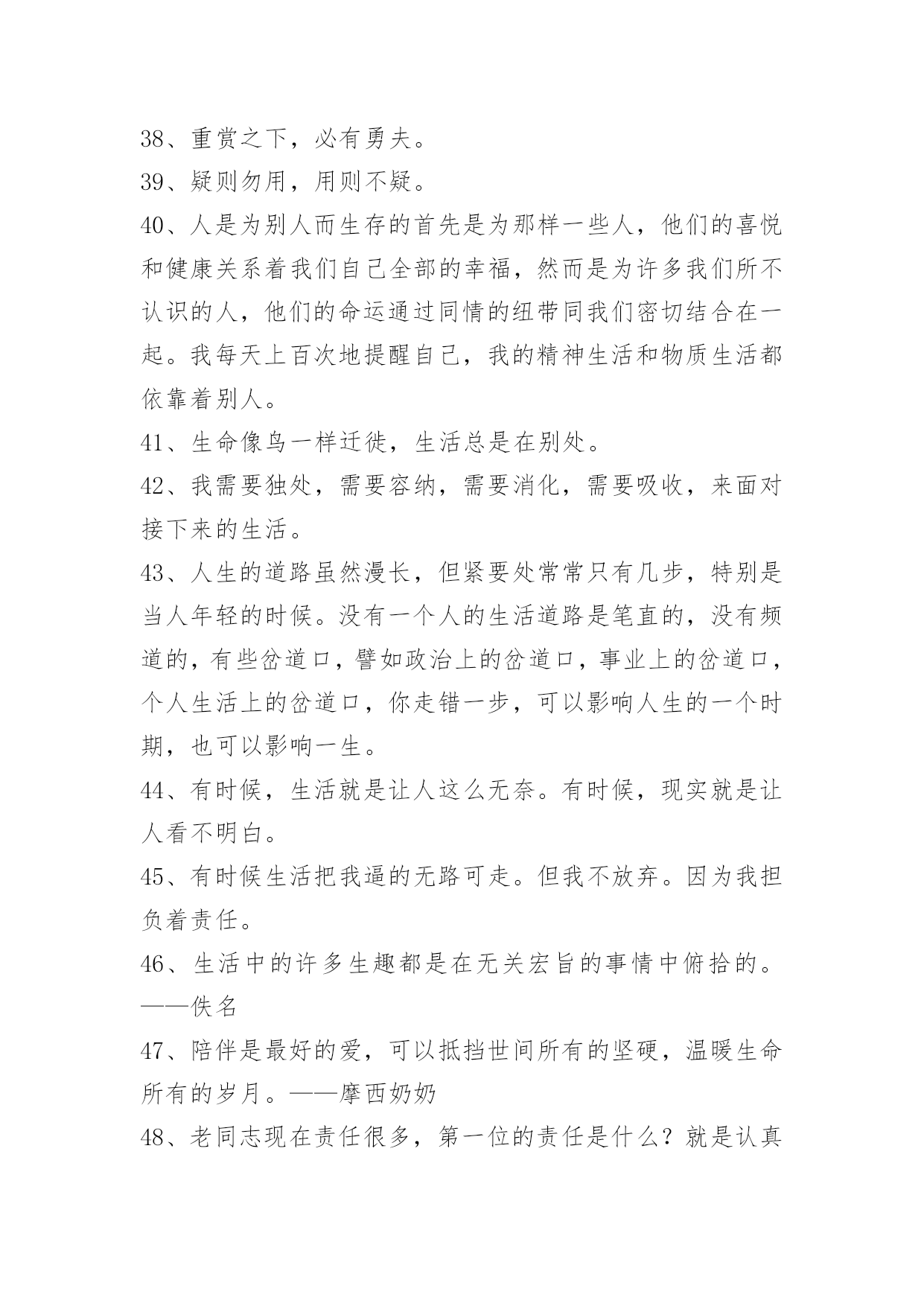 生活感悟格言68条生活感悟格言集合68条我以学会多看看自己生活中光明的一面,少看生活中黑暗的一面;多想想自己所得到的享受,少想所缺乏的东西。这种态度使我内心感到由衷安慰。以下是小编整理的生活感悟格言68条,欢迎阅读,希望大家能够喜欢。1、生活如爬山,经历九弯十八盘,经历奇山隆川,只有攀上顶峰的人,才可看到绝美的风景。生活中最艰巨的胜利,就是凡事突破常规观念所取得的胜利。2、所谓珍惜自己,不是自怜,更不是自负,而是肯定每一个人都应该承担自己生命成长的责任,这种责任其实是一种荣誉。3、所谓责任,并不是谁都有心愿意负担。而所谓命运,就是人各有路。4、生活中的痛苦,会除的人是快乐的;生活中的快乐,会乘的人是幸福的!5、在生活中是没有旁观者的。6、日莲只开在阳光里,夜荷只开在月光下。能抑制情欲的人不搂抱别人的老婆——印度7、无节制的生活在一瞬间往往会觉得有诗意,然而它给生命带来的却是疲萎和痛苦。生活只有赠予,才是舒心的享受,人生只有服务,才是踏实的生活。8、变化永远是生活的主题,生活不可能处处都适应你,但你却要学会处处适应生活。物竞天择,适者生存。9、永远我都会记得,在我肩上的双手,风起的时候,有多么温热;永远我都会记得,伴我成长的背影,用你的岁月换成我无忧的快乐!心情短语10、生活越紧张,越能显示人的生命力。——恩格斯11、生活是条难走的路,高低不平,坎坎坷坷,有喜悦也有忧伤,交替着向前演释。人就是在这样的环境中走向成熟,但不能逆来顺受,磨掉生活的梭角,要勇于奋进,知难而上,面对生活,感谢生命的情有独钟。12、生活中,谅解可以产生奇迹,谅解可以挽回感情上的损失,谅解犹如一个火把,能照亮由焦燥怨恨和复仇心理铺就的道路。13、善解风情的男人是好男人,不解风情的男人更是好男人。14、你不得不随遇而安,但是,你应该努力按照你向往的方式去生活。——坎贝尔15、与其说小说好像是生活,不如说生活就像是小说。16、我们习惯于以物质多寡衡量幸福长短。其实幸福只是一种改变命运和生活现状的虚幻力量。可以是充肌之饼,可以是雨后晴天,可以是天南地北素不相识的人们一条短信。17、谁要是不会爱,谁就不能理解生活。18、情欲犹如炭火,必须使它冷却,否则,那烈火会把心儿烧焦。19、人是未知数的仇敌。——土耳其20、珍惜生活,不管发生了什么,不管遇见谁都要享受这次经历。在我看来,过去的经历让我懂得珍惜现在,我不愿在对将来的忧虑中蹉跎眼前的时光。——奥黛丽赫本21、吹毛求疵的人,必是烦恼之人;宽容大度的人,必是快乐之人。22、读懂了淡定,才算读懂了人生。少走了弯路,也就错过了风景,无论如何,感谢经历;生活的主题就是面对复杂,保持欢喜;现在事,现在心,随缘即可;未来事,未来心,何须劳心。早安!23、人的大脑时刻要充电,否则会电力不足。24、四海无闲田,农夫犹饿死。《悯农二首》李绅25、假如生活欺骗了你,不要忧郁,也不要愤慨,不顺心的时候暂且容忍;相信吧,快乐的日子就会到来。——[俄国]普希金26、你应该紧紧把握住现在,生活本来不是孤立的,它只是泛泛的人类生活体验的一部分。——[美国]巴士卡里雅27、人的一生,是很短的,短暂的岁月要求我好好领会生活的进程。28、人生快乐不快乐看心情,心情好不好看心态,心态中不中看修炼。最幸福的人并不是拥有最好的一切,只不过他们可以把一切都变成最好,所以让我们拥有简单的幸福吧!让我们的心灵获得自由,获得解放,还心灵一份纯静。29、不懂得珍惜的人生,我们是难以容忍的。不懂得珍惜的人生里即使有爱,也是粗暴的,单方面的。甚至是威逼利诱,是霸道。别羡慕天天躺在沙发上的福气。养尊处优,在实在是"养君处忧"。要知道,身体力行才是真正良好的自我感受。30、一个悲观的人,在生活中,就可以笑看胜负得失,而不只认最终胜负,他们坚信将来,也不埋怨现状,可以应用本人的优势,发挥本人的潜能,一步步向上攀爬,而走向胜利。当一个人慢慢长大的时候,需要顾及的事情越来越多的时候,牵绊你的将会成为动力亦或是牵绊。31、这世界有三样东西是别人抢不走的,一是吃进胃里的食物,二是藏在心中的梦,三是读进大脑的书。32、灰暗的天空,悲伤的情绪,哀叹的抱怨,都会在美好的回忆中烟消云散,你会在曾经的辉煌中找回自信,学会坚强,重新燃起希望之火;你将会勇敢地面对生活的跌宕起伏,重见艳阳与晴空。33、生存只要在平淡无味的人看来才是空虚而平淡无味的。——车尔尼雪夫斯基:《生存与美学》34、节水要大器,节气要小气、节电要灵气、节能要人气。35、感谢母亲赐予我生命,感谢生活赠我友谊,滴水之恩,涌泉相报。谢谢你好朋友,谢谢你的支持与帮助,让我看到互相搀扶的身影,我深深的体会珍惜你的一句真诚的鼓励,更懂得珍惜这人间真情在,在我最需要帮助的时候你拉了我一把。36、对恋人的每一次承诺都要放上天平,这天平的另一
