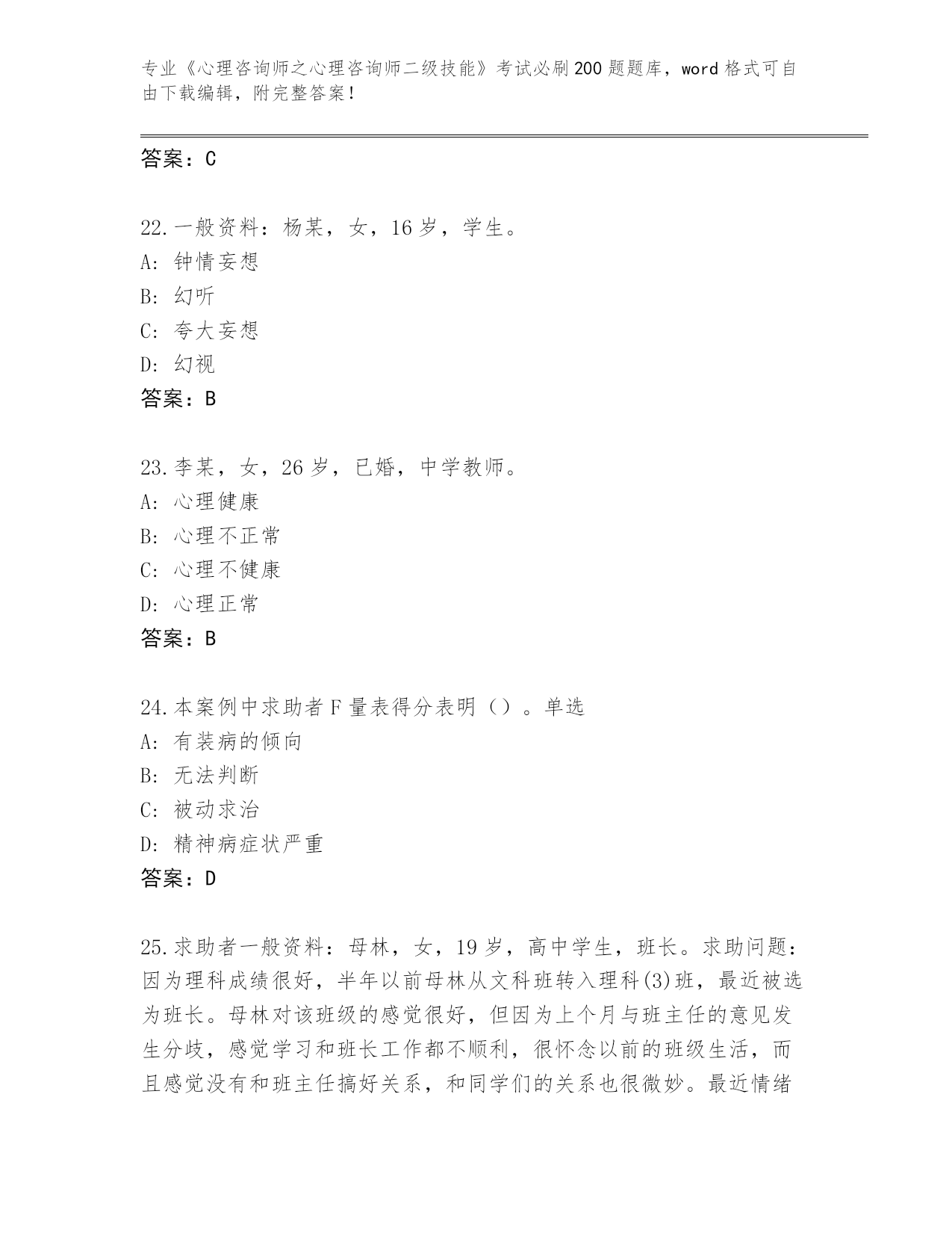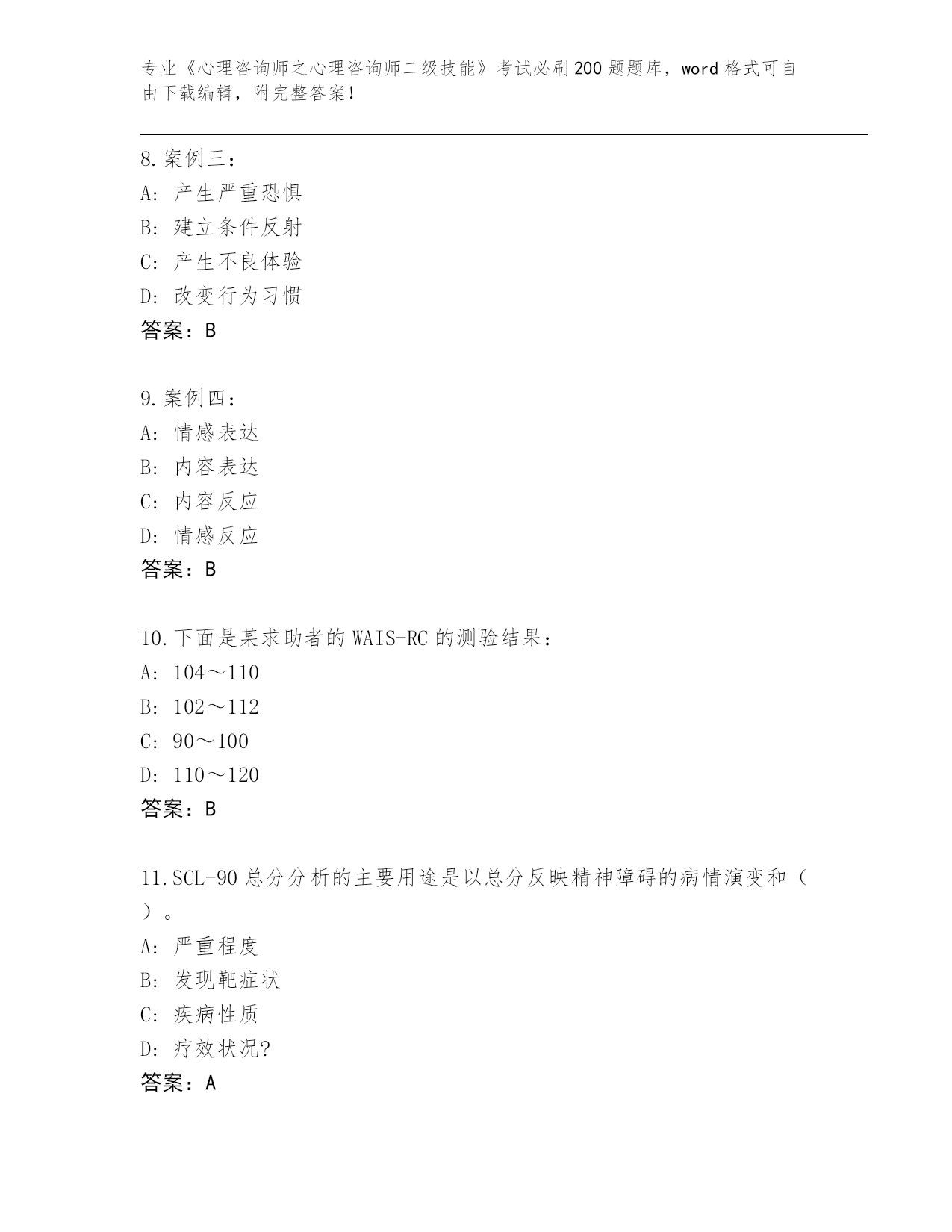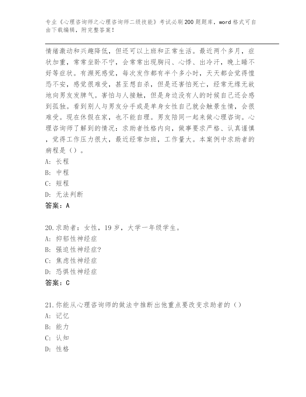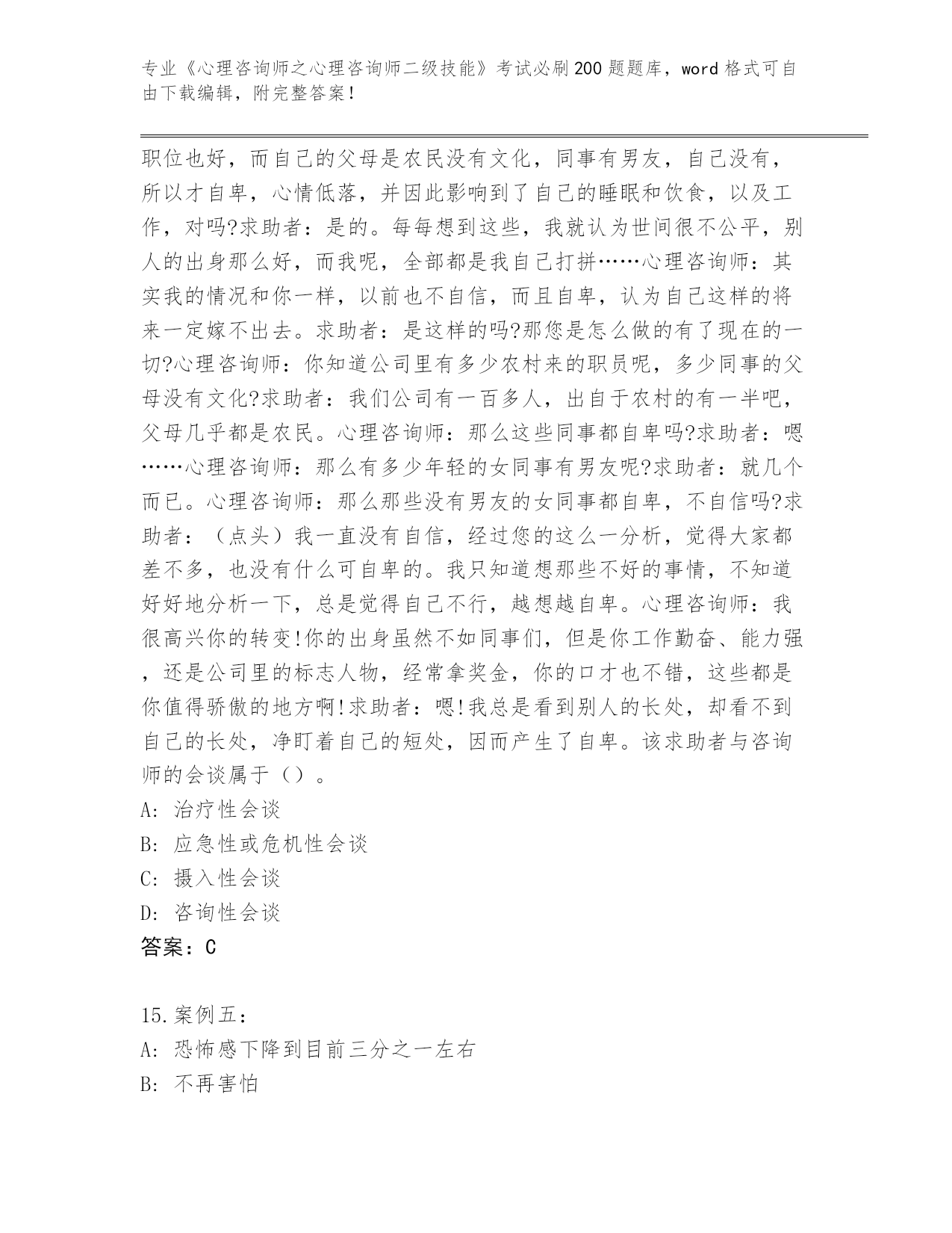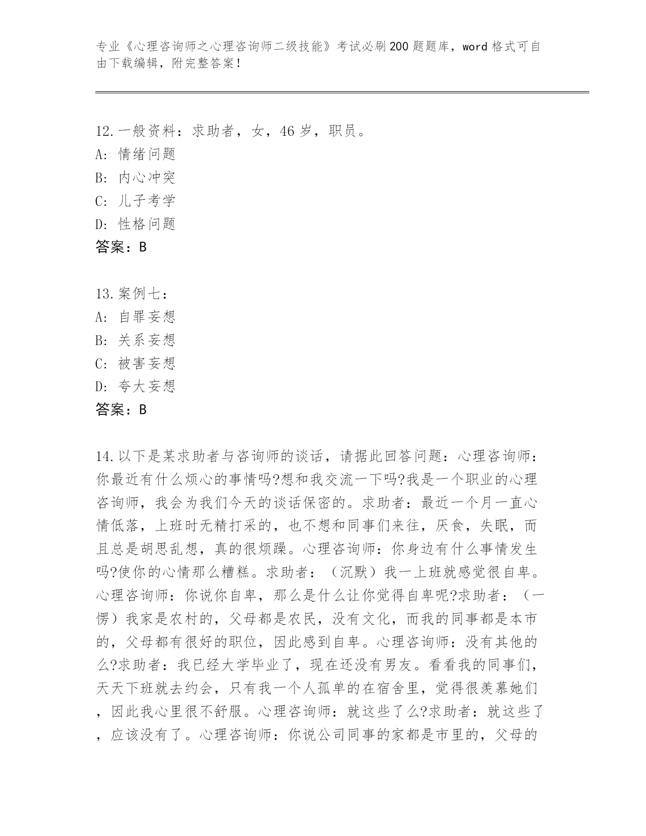 2024山西省《心理咨询师之心理咨询师二级技能》考试必刷200题题库及参考答案(典型题)