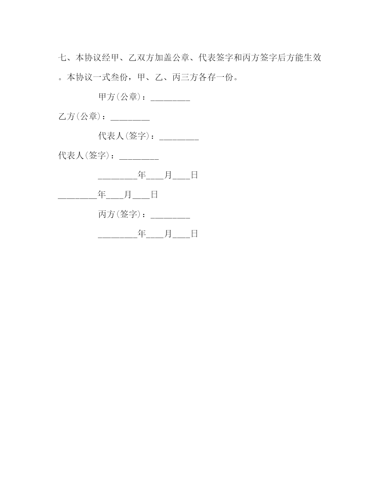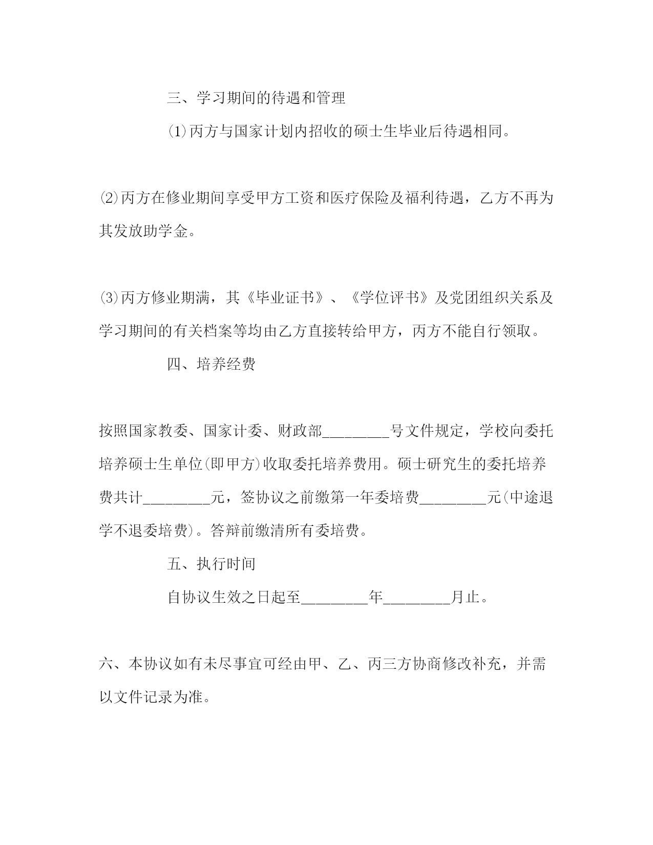 PAGE此资料由网络收集而来,如有侵权请告知上传者立即删除。资料共分享,我们负责传递知识。委托培养硕士研究生协议书根据_________号文件精神,我校将进一步推行研究生委托培养制度,为用人单位培养社会主义建设需要的高层次专门人才。为此,_________(以下简称乙方)受_________(以下简称甲方)委托在_________专业(学科)培养硕士生_________(以下简称丙方)壹人,经三方协商,达成如下协议。一、学制及修业期限学制:_________年修业期限:从_________年_________月起至_________年_________月止。二、培养要求(1)丙方修业期间应在规定时间内完成乙方的培养方案所确定的全部课程学习,课题调研、论文撰写、答辩和学位授予均按乙方的有关规定办理;(2)丙方在修业期间应遵守培养单位的规章制度,毕业后按协议回到原委托单位工作。三、学习期间的待遇和管理(1)丙方与国家计划内招收的硕士生毕业后待遇相同。(2)丙方在修业期间享受甲方工资和医疗保险及福利待遇,乙方不再为其发放助学金。(3)丙方修业期满,其《毕业证书》、《学位评书》及党团组织关系及学习期间的有关档案等均由乙方直接转给甲方,丙方不能自行领取。四、培养经费按照国家教委、国家计委、财政部_________号文件规定,学校向委托培养硕士生单位(即甲方)收取委托培养费用。硕士研究生的委托培养费共计_________元,签协议之前缴第一年委培费_________元(中途退学不退委培费)。答辩前缴清所有委培费。五、执行时间自协议生效之日起至_________年_________月止。六、本协议如有未尽事宜可经由甲、乙、丙三方协商修改补充,并需以文件记录为准。七、本协议经甲、乙双方加盖公章、代表签字和丙方签字后方能生效。本协议一式叁份,甲、乙、丙三方各存一份。甲方(公章):_________乙方(公章):_________代表人(签字):_________代表人(签字):__________________年____月____日_________年____月____日丙方(签字):__________________年____月____日