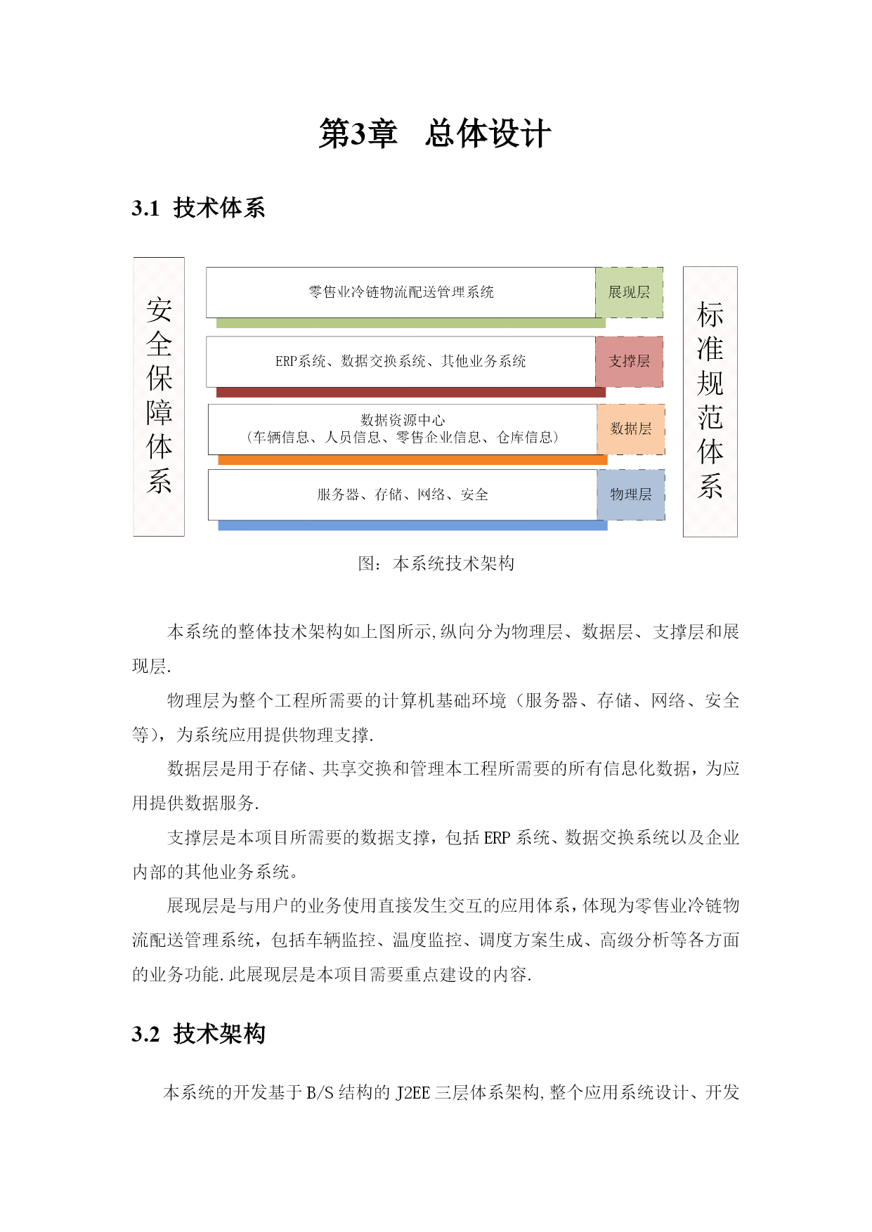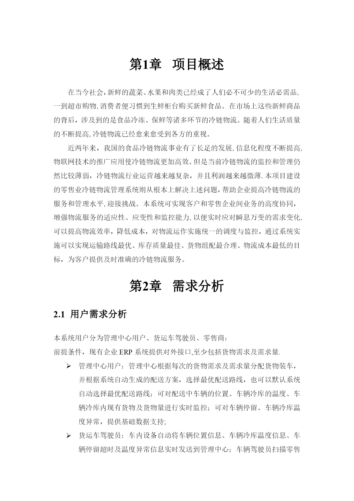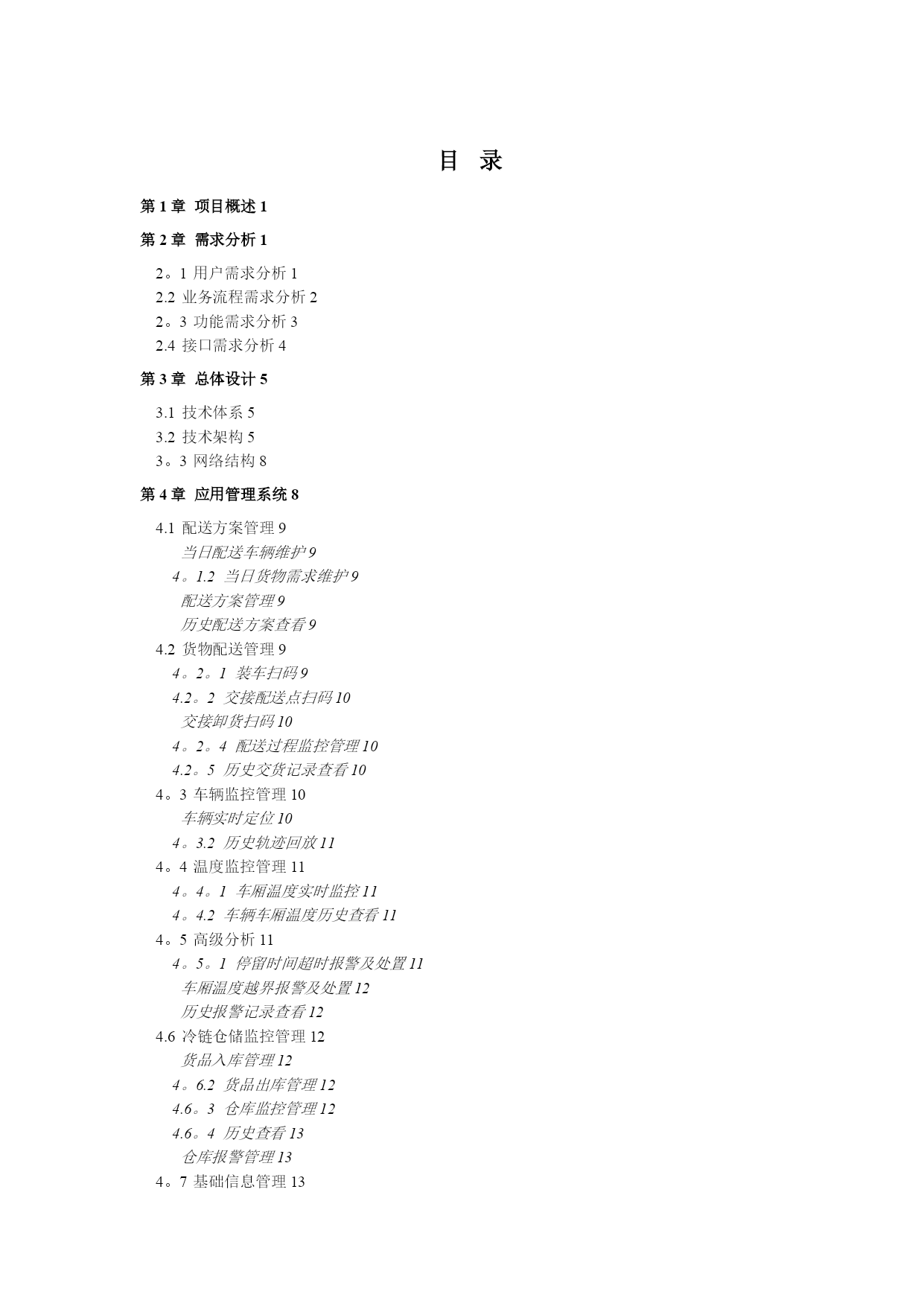 零售业冷链物流配送管理系统建设方案实用文档(实用文档,可以直接使用,可编辑优秀版资料,欢迎下载)零售业冷链物流配送管理系统建设方案二零一一年六月目录TOC\o"1-3"\h\z\uHYPERLINK\l"_Toc295909300”第1章项目概述PAGEREF_Toc295909300\h1HYPERLINK\l"_Toc295909301"第2章需求分析PAGEREF_Toc295909301\h1HYPERLINK\l"_Toc295909302"2。1用户需求分析PAGEREF_Toc295909302\h1HYPERLINK\l”_Toc295909303”2.2业务流程需求分析PAGEREF_Toc295909303\h2HYPERLINK\l”_Toc295909304”2。3功能需求分析PAGEREF_Toc295909304\h3HYPERLINK\l”_Toc295909305”2.4接口需求分析PAGEREF_Toc295909305\h4HYPERLINK\l"_Toc295909306"第3章总体设计PAGEREF_Toc295909306\h5HYPERLINK\l"_Toc295909307"3.1技术体系PAGEREF_Toc295909307\h5HYPERLINK\l”_Toc295909308”3.2技术架构PAGEREF_Toc295909308\h5HYPERLINK\l”_Toc295909309"3。3网络结构PAGEREF_Toc295909309\h8HYPERLINK\l”_Toc295909310”第4章应用管理系统PAGEREF_Toc295909310\h8HYPERLINK\l"_Toc295909311"4.1配送方案管理PAGEREF_Toc295909311\h9HYPERLINK\l”_Toc295909312"当日配送车辆维护PAGEREF_Toc295909312\h9HYPERLINK\l"_Toc295909313"4。1.2当日货物需求维护PAGEREF_Toc295909313\h9HYPERLINK\l”_Toc295909314”配送方案管理PAGEREF_Toc295909314\h9HYPERLINK\l"_Toc295909315"历史配送方案查看PAGEREF_Toc295909315\h9HYPERLINK\l”_Toc295909316"4.2货物配送管理PAGEREF_Toc295909316\h9HYPERLINK\l"_Toc295909317”4。2。1装车扫码PAGEREF_Toc295909317\h9HYPERLINK\l”_Toc295909318”4.2。2交接配送点扫码PAGEREF_Toc295909318\h10HYPERLINK\l”_Toc295909319”交接卸货扫码PAGEREF_Toc295909319\h10HYPERLINK\l"_Toc295909320”4。2。4配送过程监控管理PAGEREF_Toc295909320\h10HYPERLINK\l"_Toc295909321”4.2。5历史交货记录查看PAGEREF_Toc295909321\h10HYPERLINK\l"_Toc295909322"4。3车辆监控管理PAGEREF_Toc295909322\h10HYPERLINK\l"_Toc295909323"车辆实时定位PAGEREF_Toc295909323\h10HYPERLINK\l"_Toc295909324"4。3.2历史轨迹回放PAGEREF_Toc295909324\h11HYPERLINK\l"_Toc295909325”4。4温度监控管理PAGEREF_Toc295909325\h11HYPERLINK\l”_Toc295909326”4。4。1车厢温度实时监控PAGEREF_Toc295909326\h11HYPERLINK\l"_Toc295909327”4。4.2车辆车厢温度历史查看PAGEREF_Toc295909327\h11HYPERLINK\l"_Toc295909328"4。5高级分析PAGEREF_To