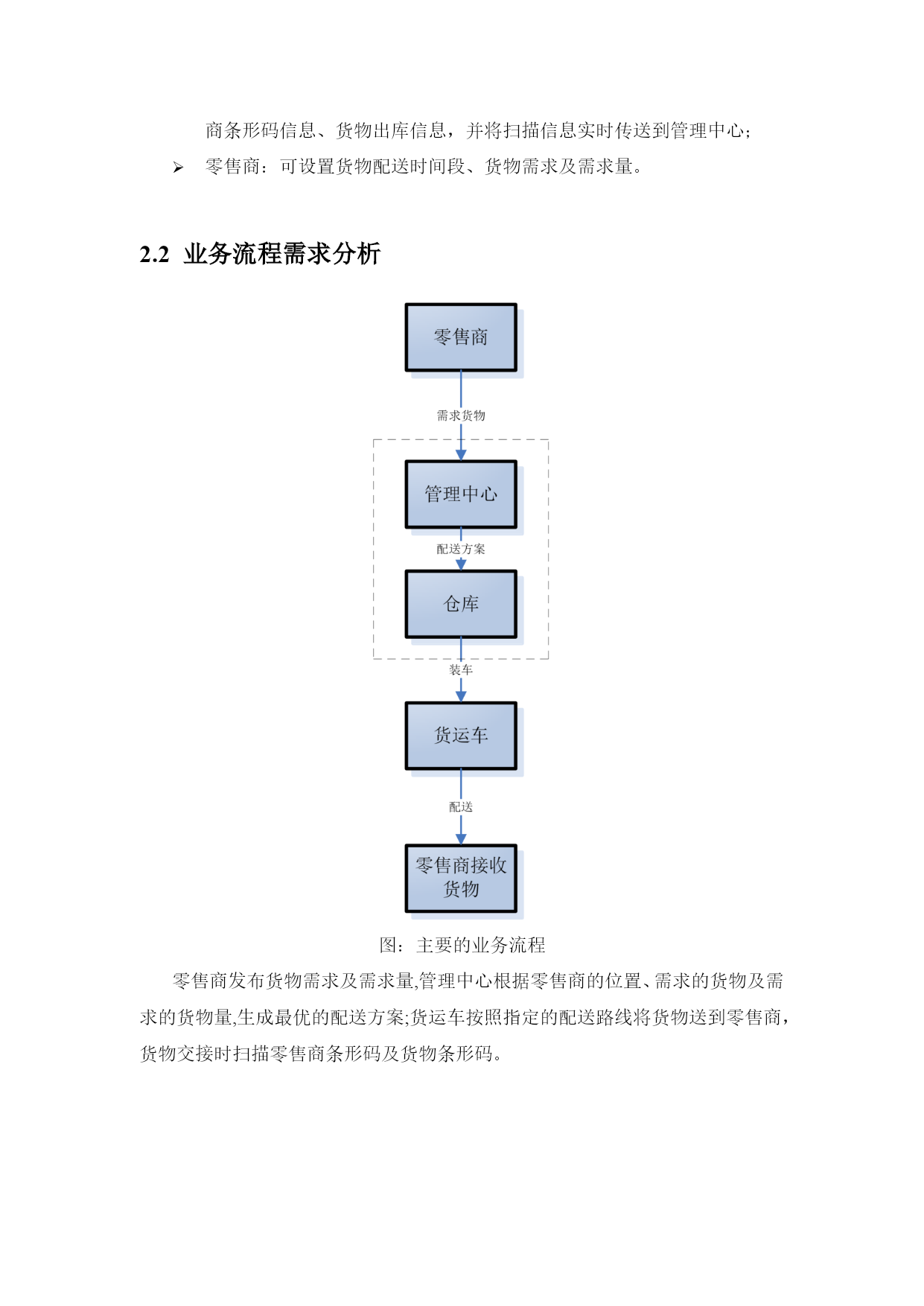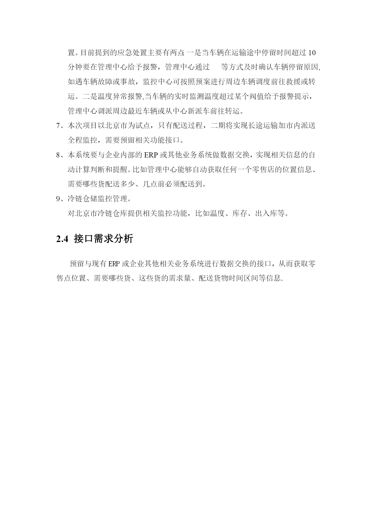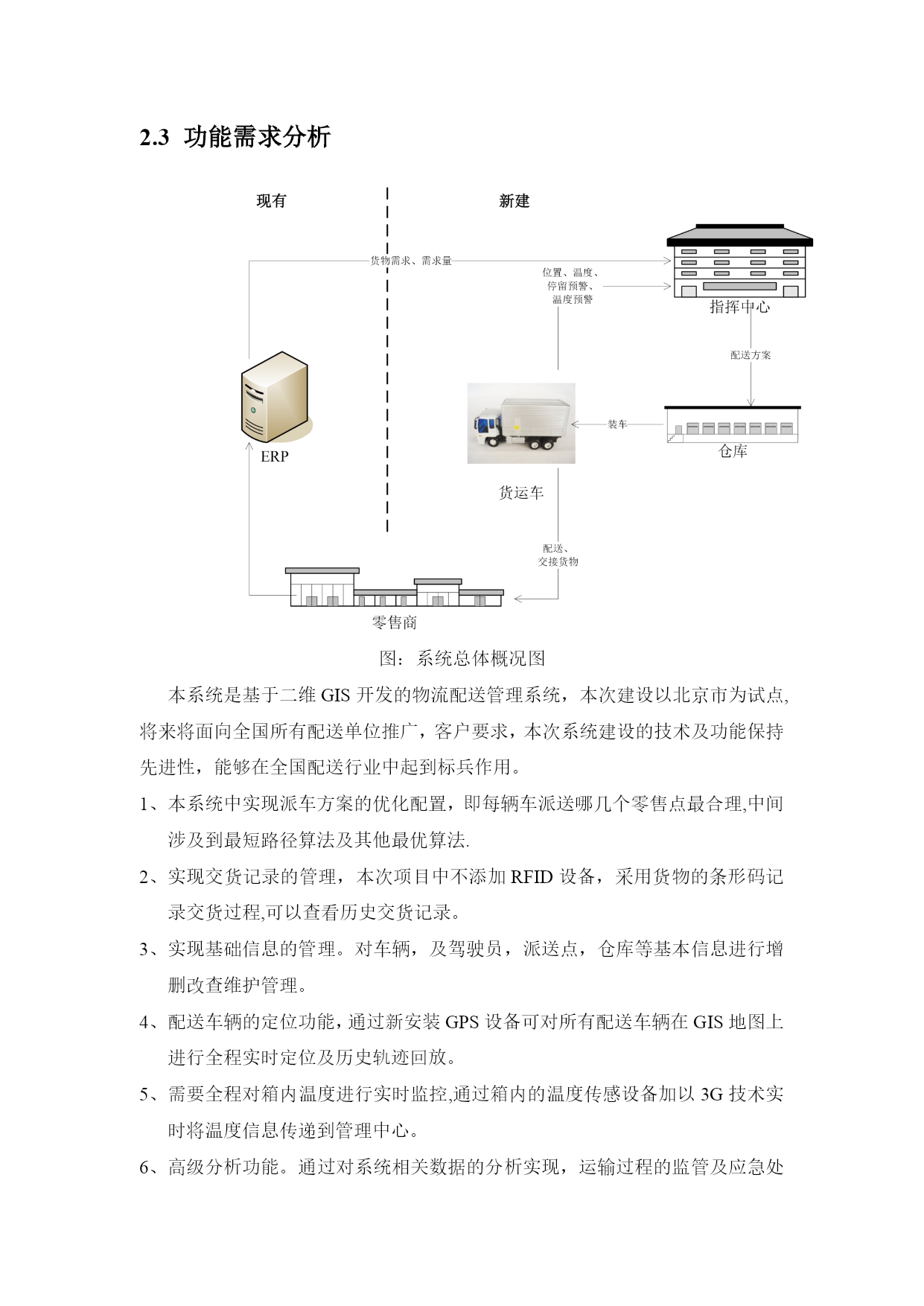 零售业冷链物流配送管理系统建设方案实用文档(实用文档,可以直接使用,可编辑优秀版资料,欢迎下载)零售业冷链物流配送管理系统建设方案二零一一年六月目录TOC\o"1-3"\h\z\uHYPERLINK\l"_Toc295909300”第1章项目概述PAGEREF_Toc295909300\h1HYPERLINK\l"_Toc295909301"第2章需求分析PAGEREF_Toc295909301\h1HYPERLINK\l"_Toc295909302"2。1用户需求分析PAGEREF_Toc295909302\h1HYPERLINK\l”_Toc295909303”2.2业务流程需求分析PAGEREF_Toc295909303\h2HYPERLINK\l”_Toc295909304”2。3功能需求分析PAGEREF_Toc295909304\h3HYPERLINK\l”_Toc295909305”2.4接口需求分析PAGEREF_Toc295909305\h4HYPERLINK\l"_Toc295909306"第3章总体设计PAGEREF_Toc295909306\h5HYPERLINK\l"_Toc295909307"3.1技术体系PAGEREF_Toc295909307\h5HYPERLINK\l”_Toc295909308”3.2技术架构PAGEREF_Toc295909308\h5HYPERLINK\l”_Toc295909309"3。3网络结构PAGEREF_Toc295909309\h8HYPERLINK\l”_Toc295909310”第4章应用管理系统PAGEREF_Toc295909310\h8HYPERLINK\l"_Toc295909311"4.1配送方案管理PAGEREF_Toc295909311\h9HYPERLINK\l”_Toc295909312"当日配送车辆维护PAGEREF_Toc295909312\h9HYPERLINK\l"_Toc295909313"4。1.2当日货物需求维护PAGEREF_Toc295909313\h9HYPERLINK\l”_Toc295909314”配送方案管理PAGEREF_Toc295909314\h9HYPERLINK\l"_Toc295909315"历史配送方案查看PAGEREF_Toc295909315\h9HYPERLINK\l”_Toc295909316"4.2货物配送管理PAGEREF_Toc295909316\h9HYPERLINK\l"_Toc295909317”4。2。1装车扫码PAGEREF_Toc295909317\h9HYPERLINK\l”_Toc295909318”4.2。2交接配送点扫码PAGEREF_Toc295909318\h10HYPERLINK\l”_Toc295909319”交接卸货扫码PAGEREF_Toc295909319\h10HYPERLINK\l"_Toc295909320”4。2。4配送过程监控管理PAGEREF_Toc295909320\h10HYPERLINK\l"_Toc295909321”4.2。5历史交货记录查看PAGEREF_Toc295909321\h10HYPERLINK\l"_Toc295909322"4。3车辆监控管理PAGEREF_Toc295909322\h10HYPERLINK\l"_Toc295909323"车辆实时定位PAGEREF_Toc295909323\h10HYPERLINK\l"_Toc295909324"4。3.2历史轨迹回放PAGEREF_Toc295909324\h11HYPERLINK\l"_Toc295909325”4。4温度监控管理PAGEREF_Toc295909325\h11HYPERLINK\l”_Toc295909326”4。4。1车厢温度实时监控PAGEREF_Toc295909326\h11HYPERLINK\l"_Toc295909327”4。4.2车辆车厢温度历史查看PAGEREF_Toc295909327\h11HYPERLINK\l"_Toc295909328"4。5高级分析PAGEREF_To