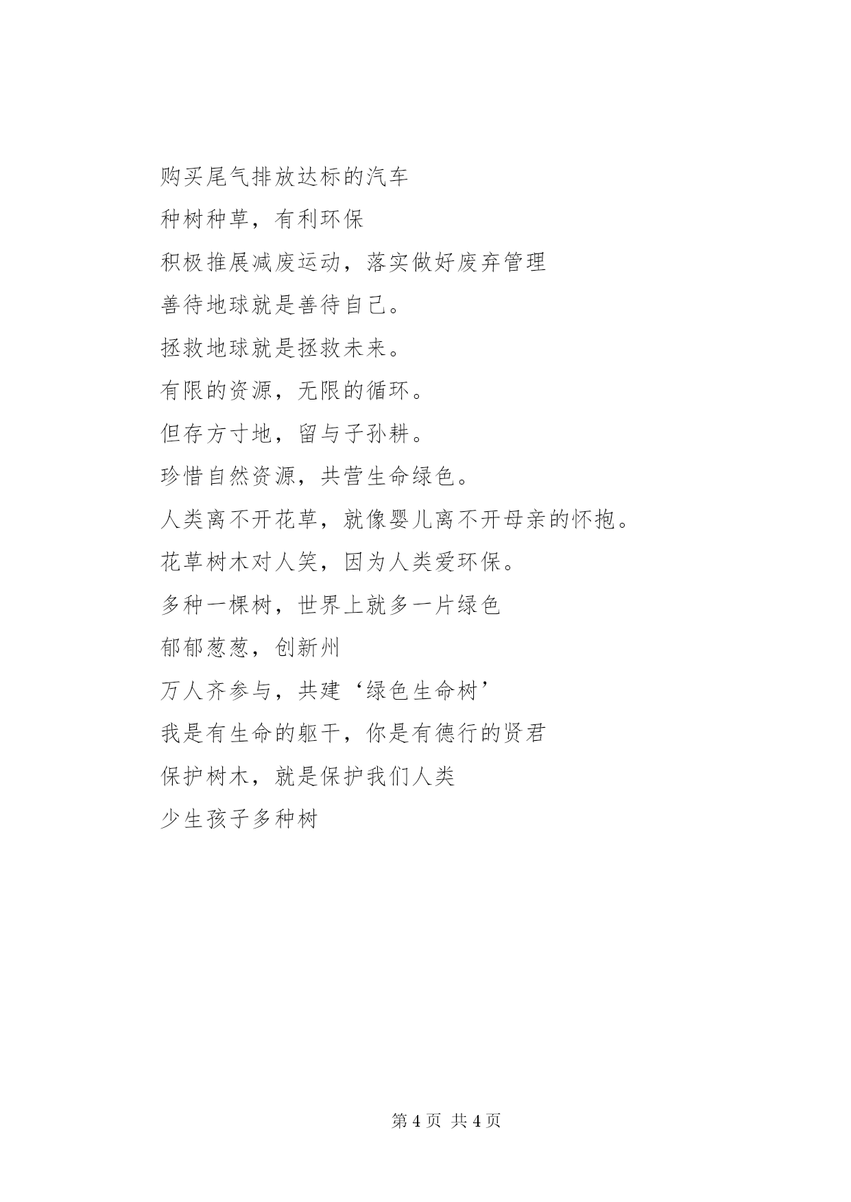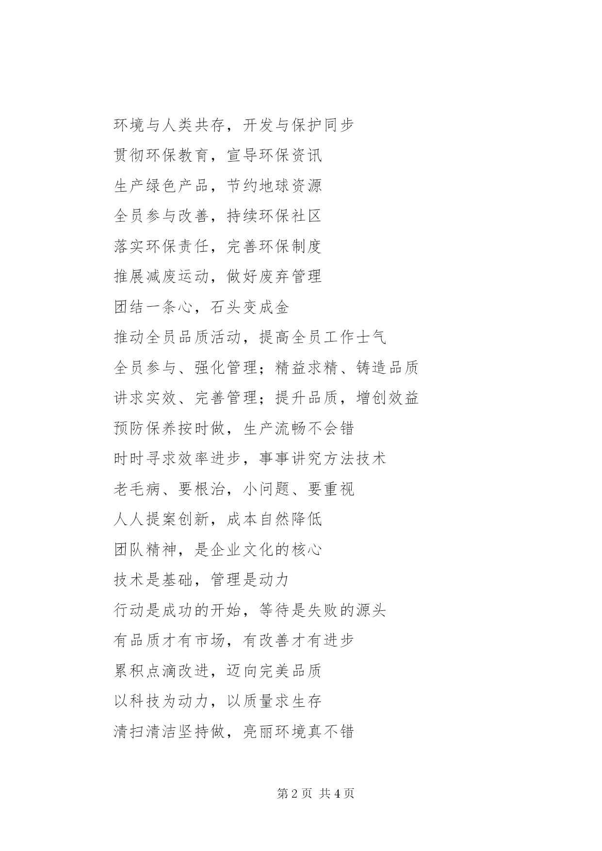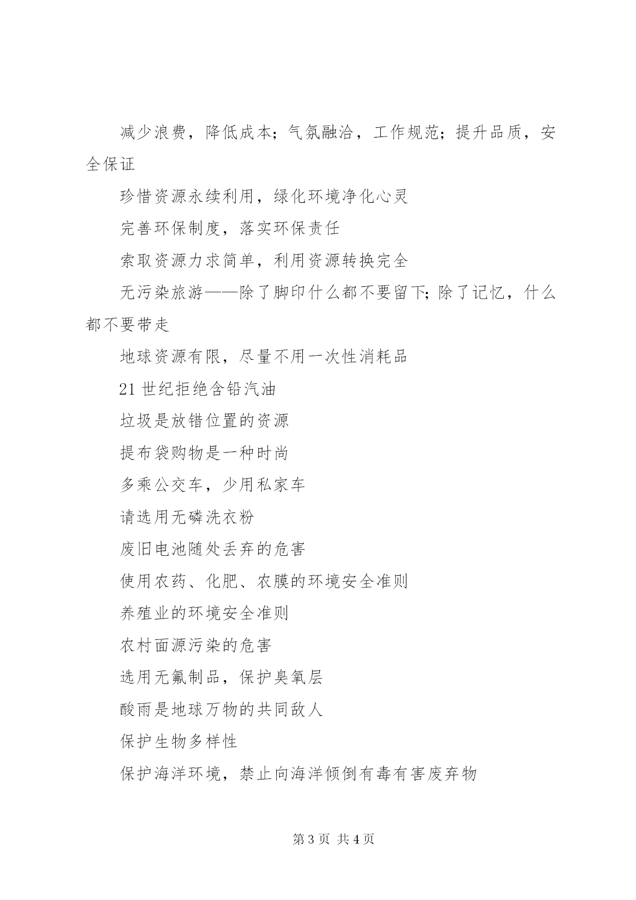 第PAGE\*Arabic\*MERGEFORMAT4页共NUMPAGES\*MERGEFORMAT4页社区环保宣传语落实环保责任,完善环保制度垃圾混置是垃圾,垃圾分类是资源合理利用自然资源,有效保护生态平衡水是生命之源,节约用水就是保护环境环境与人类共存,开发与保护同步地球资源要珍惜,环境保护是共识提高环保意识,争做环保公民保护环境是每个公民应尽的责任保护环境是责任,爱护环境是美德维护社会公德,保护生态环境iso14000是绿色环保与人类和谐环境的基础地球我的家,环保靠大家让地球远离污染,让绿色走进家园生产绿色产品,使用绿色产品建设绿色企业,坚持绿色经营降低生产成本,节约地球资源让我们共同拥有一个绿色的地球工资你高我也高,环保意识要提高绿水青山是我家,大家不要破坏他保护环境,人人有责环境与人类共存,开发与保护同步贯彻环保教育,宣导环保资讯生产绿色产品,节约地球资源全员参与改善,持续环保社区落实环保责任,完善环保制度推展减废运动,做好废弃管理团结一条心,石头变成金推动全员品质活动,提高全员工作士气全员参与、强化管理;精益求精、铸造品质讲求实效、完善管理;提升品质,增创效益预防保养按时做,生产流畅不会错时时寻求效率进步,事事讲究方法技术老毛病、要根治,小问题、要重视人人提案创新,成本自然降低团队精神,是企业文化的核心技术是基础,管理是动力行动是成功的开始,等待是失败的源头有品质才有市场,有改善才有进步累积点滴改进,迈向完美品质以科技为动力,以质量求生存清扫清洁坚持做,亮丽环境真不错减少浪费,降低成本;气氛融洽,工作规范;提升品质,安全保证珍惜资源永续利用,绿化环境净化心灵完善环保制度,落实环保责任索取资源力求简单,利用资源转换完全无污染旅游——除了脚印什么都不要留下;除了记忆,什么都不要带走地球资源有限,尽量不用一次性消耗品21世纪拒绝含铅汽油垃圾是放错位置的资源提布袋购物是一种时尚多乘公交车,少用私家车请选用无磷洗衣粉废旧电池随处丢弃的危害使用农药、化肥、农膜的环境安全准则养殖业的环境安全准则农村面源污染的危害选用无氟制品,保护臭氧层酸雨是地球万物的共同敌人保护生物多样性保护海洋环境,禁止向海洋倾倒有毒有害废弃物购买尾气排放达标的汽车种树种草,有利环保积极推展减废运动,落实做好废弃管理善待地球就是善待自己。拯救地球就是拯救未来。有限的资源,无限的循环。但存方寸地,留与子孙耕。珍惜自然资源,共营生命绿色。人类离不开花草,就像婴儿离不开母亲的怀抱。花草树木对人笑,因为人类爱环保。多种一棵树,世界上就多一片绿色郁郁葱葱,创新州万人齐参与,共建‘绿色生命树’我是有生命的躯干,你是有德行的贤君保护树木,就是保护我们人类少生孩子多种树