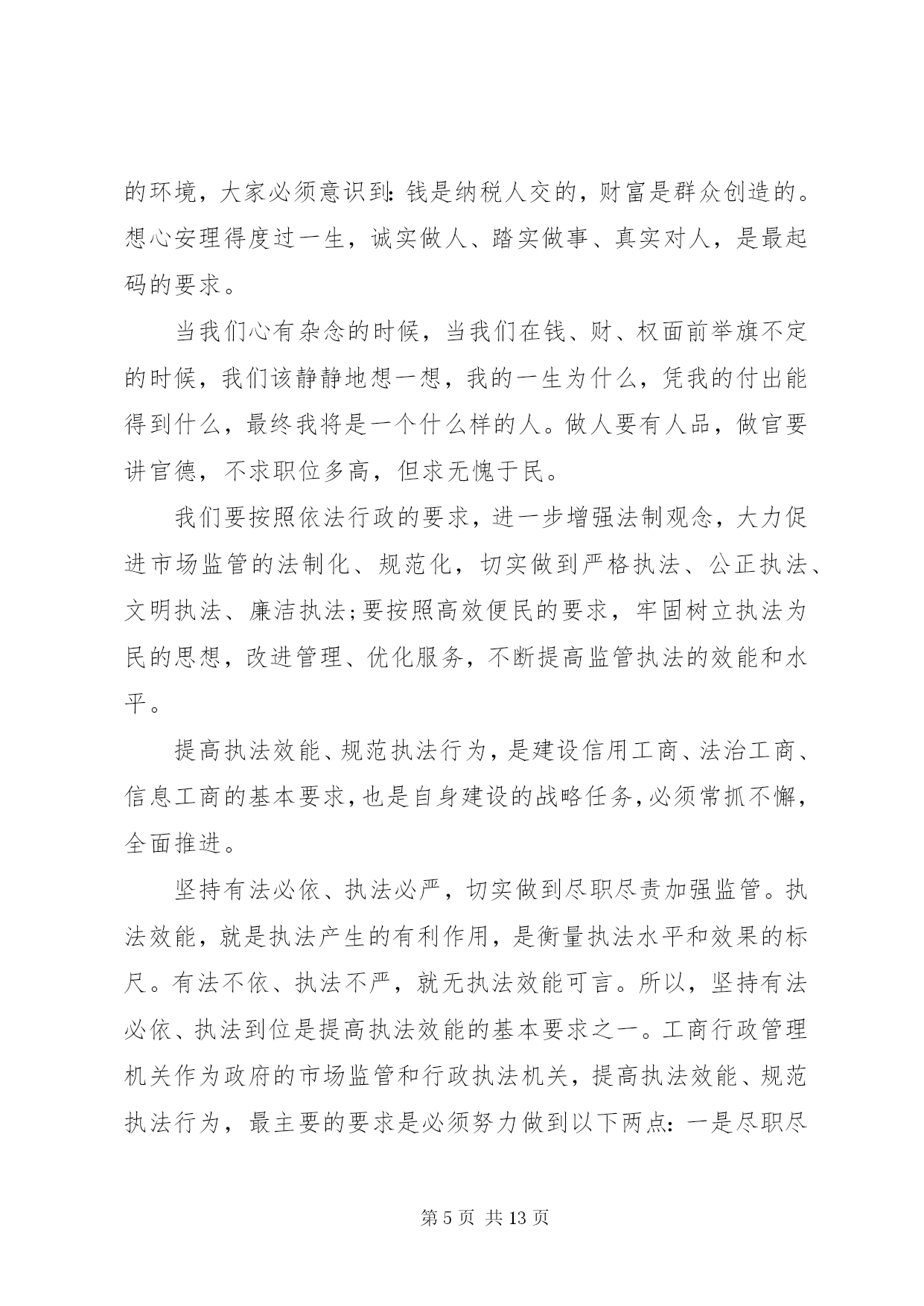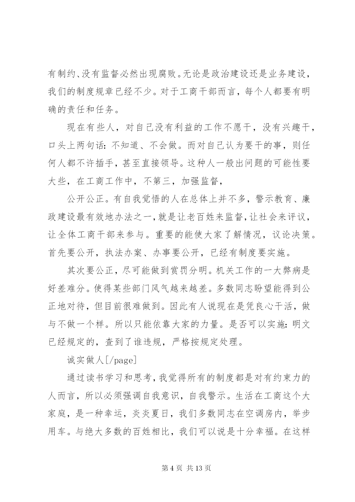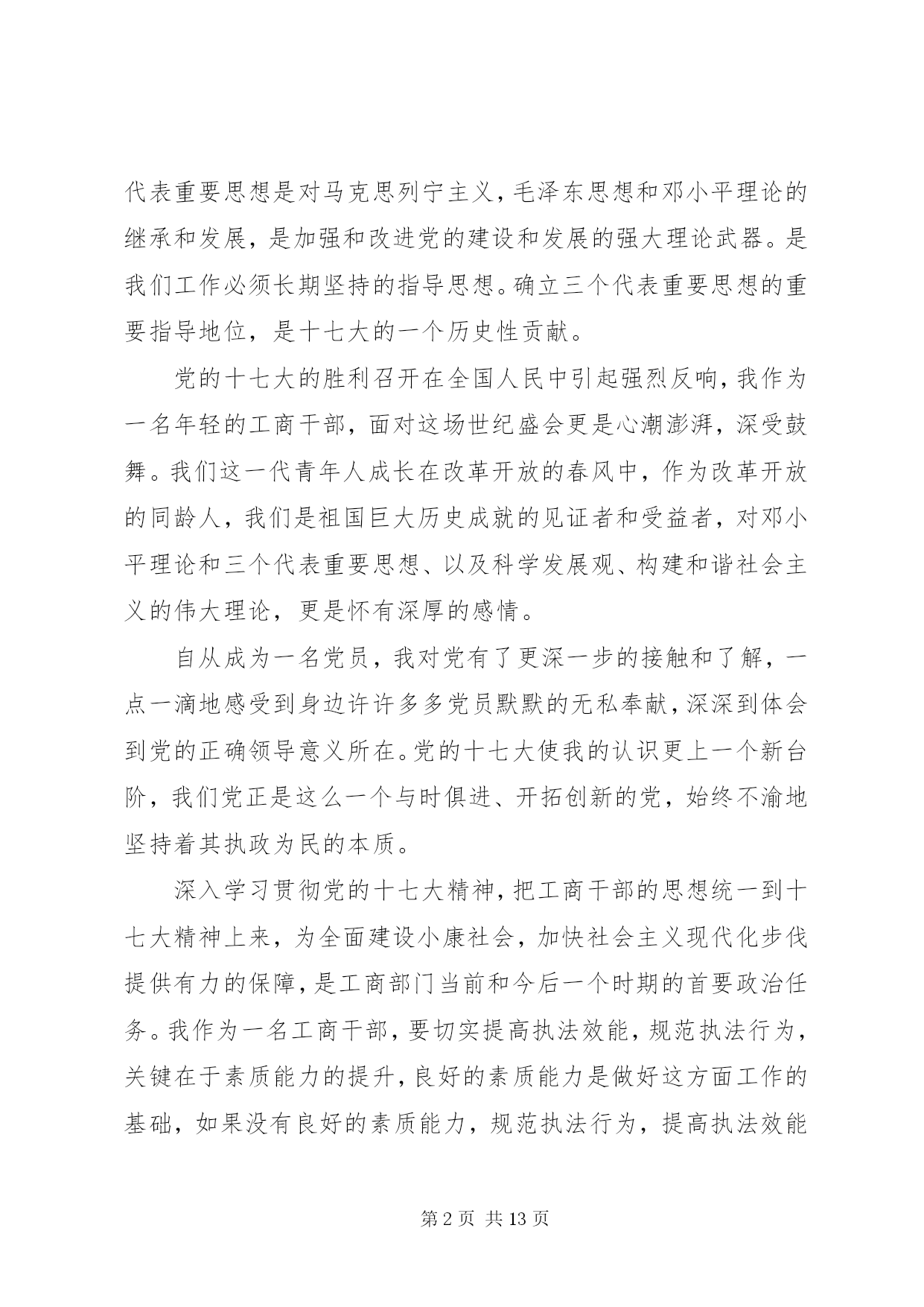 第PAGE\*Arabic\*MERGEFORMAT13页共NUMPAGES\*MERGEFORMAT13页工商心得体会3篇通过学习十七大会议精神,感触颇深。党的十七大是在我国改革发展关键阶段召开的一次重要会议,这是一次团结的大会、胜利的大会、奋进的大会。是继往开来,与时俱进的大会,是动员全党全国人民开创有中国特色社会主义事业新局面的大会。十七大总结了党的十六大以来5年的工作,回顾总结了29年来改革开放的伟大历史进程和宝贵经验。xx同志在党的十七大报告中从历史和时代的高度出发,科学地总结了过去5年的工作和党的十三届四中全会以来的基本经验,深刻阐明了我们党在新世纪坚持举什么旗、走什么路、实现什么奋斗目标等重大问题,对我国改革开放和社会主义现代化建设作出了全面部署,是我们党团结和带领全国各族人民在新世纪新阶段继续奋勇前进的政治宣言和行动纲领。xx同志的报告高屋建瓴,立意高远,内涵丰富,重点突出,思想深刻,是一篇马克思主义的纲领性文献。报告全面系统总结的十条基本经验,是我们党理论创新的重要成果,标志着我们党对共产党执政规律、社会主义建设规律和人类社会发展规律认识水平的进一步提高,对于党和国家事业的发展具有长远的指导作用。学习贯彻十七大精神,要准确把握十七大的基本精神,这是学习和贯彻的前提。三个代表重要思想则是十七大的灵魂。三个代表重要思想是对马克思列宁主义,毛泽东思想和邓小平理论的继承和发展,是加强和改进党的建设和发展的强大理论武器。是我们工作必须长期坚持的指导思想。确立三个代表重要思想的重要指导地位,是十七大的一个历史性贡献。党的十七大的胜利召开在全国人民中引起强烈反响,我作为一名年轻的工商干部,面对这场世纪盛会更是心潮澎湃,深受鼓舞。我们这一代青年人成长在改革开放的春风中,作为改革开放的同龄人,我们是祖国巨大历史成就的见证者和受益者,对邓小平理论和三个代表重要思想、以及科学发展观、构建和谐社会主义的伟大理论,更是怀有深厚的感情。自从成为一名党员,我对党有了更深一步的接触和了解,一点一滴地感受到身边许许多多党员默默的无私奉献,深深到体会到党的正确领导意义所在。党的十七大使我的认识更上一个新台阶,我们党正是这么一个与时俱进、开拓创新的党,始终不渝地坚持着其执政为民的本质。深入学习贯彻党的十七大精神,把工商干部的思想统一到十七大精神上来,为全面建设小康社会,加快社会主义现代化步伐提供有力的保障,是工商部门当前和今后一个时期的首要政治任务。我作为一名工商干部,要切实提高执法效能,规范执法行为,关键在于素质能力的提升,良好的素质能力是做好这方面工作的基础,如果没有良好的素质能力,规范执法行为,提高执法效能就是一句空话。人员整体素质的高低,直接影响到履行职能是否到位,服务效果是否让群众满意。为此,我们坚持以提高思想政治素质为先导,以提高业务素质为基础,以提高勤政廉政素质为保障,全方位提高队伍整体素质,来推动软环境建设,提升服务水平,全力建设服务型工商。第一,以民为本,依法行政。在社会主义市场经济中,企业创造财富,政府创造环境,这是大家分工的不同,是从不同角度对社会的贡献。执法者同时就是服务者,之所以称为人民的公仆也是这个道理。最近有一些工作实例,我认为是衡量依法行政的标准问题。在规范市场行为、整顿市场秩序中,对于那些扰乱市场经济秩序、侵害消费者利益的不法分子一定要严惩不贷,不能讲情说情,心慈手软。但是对于下岗职工或者类似的弱势群体,他们有一些轻微的违法行为,不能简单地以依法行政概念,套用法律条款,作出处罚决定。否则就会引起人民群众的不满,对工商的执法带来副作用,达不到依法行政的目的。这种客观、公正地处理执法中的问题,能有效地防止执法中不规范不廉洁行为的发生。对社会弱势群体的态度,也能反映一个的风格和品德。第二,遵章守纪,明确责任。有良好素质的同志会自觉遵守各项制度、规定,但对大多数人不行,还是需要有制度制约。没有制约、没有监督必然出现腐败。无论是政治建设还是业务建设,我们的制度规章已经不少。对于工商干部而言,每个人都要有明确的责任和任务。现在有些人,对自己没有利益的工作不愿干,没有兴趣干,口头上两句话:不知道、不会做。而对自己认为要干的事,则任何人都不许插手,甚至直接领导。这种人一般出问题的可能性要大些,在工商工作中,不第三,加强监督,公开公正。有自我觉悟的人在总体上并不多,警示教育、廉政建设最有效地办法之一,就是让老百姓来监督,让社会来评议,让全体工商干部来参与。重要的能使大家了解情况,议论决策。首先要公开,执法办案、办事要公开,已经有制度要实施。其次要公正,尽可能做到赏罚分明。机关工作的一大弊病是好差难分。使得某些部门风气越来越差。多数同志盼望能得到公正地对待,但目前很难做到。因此有人说现在是凭良心干活,做与不