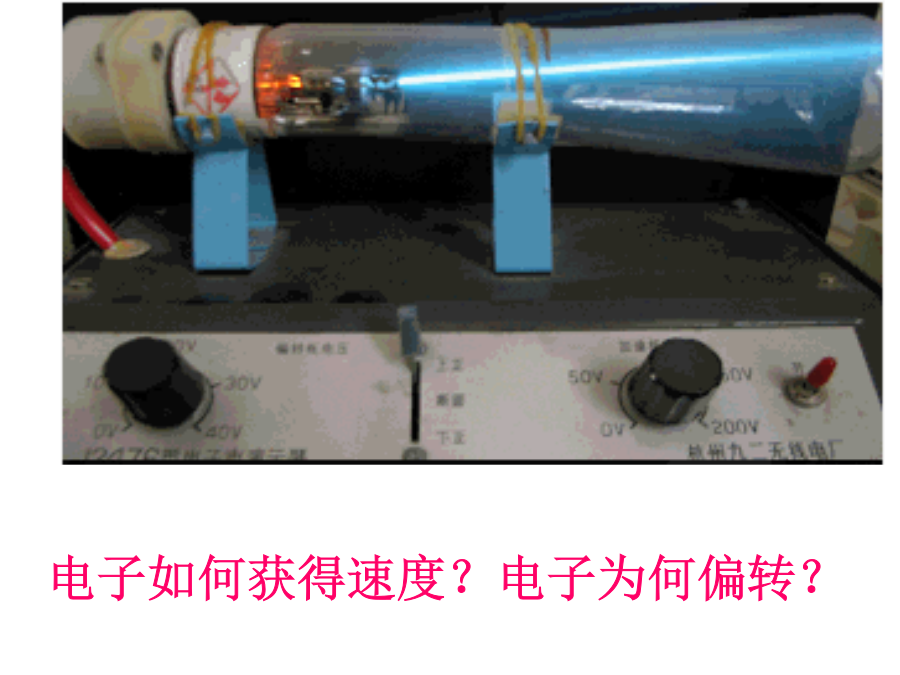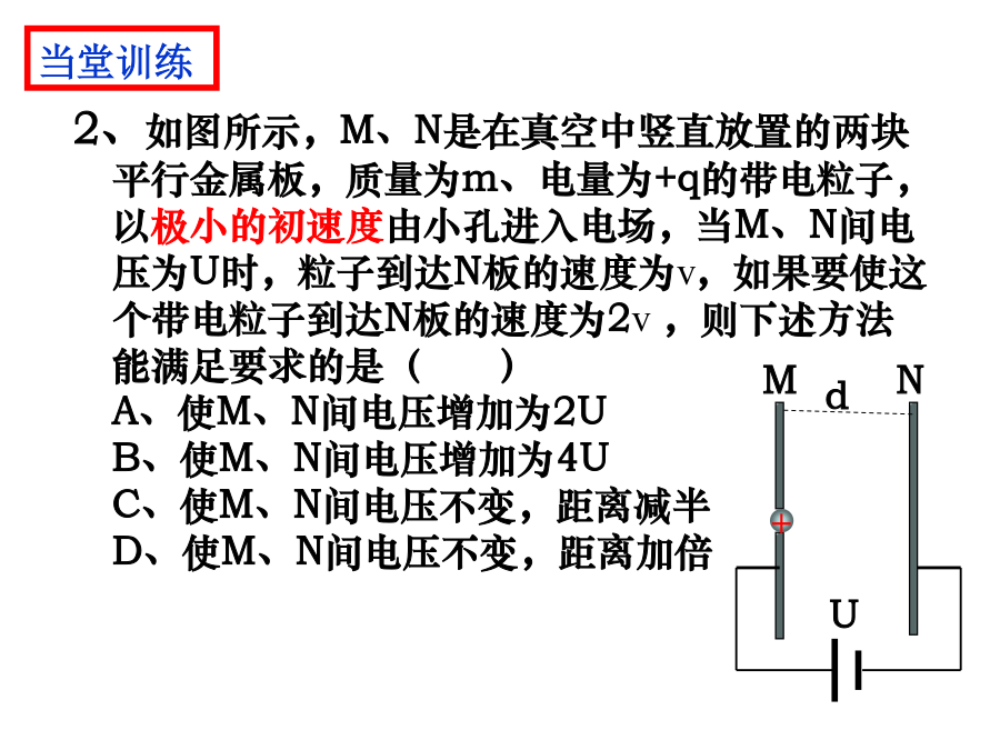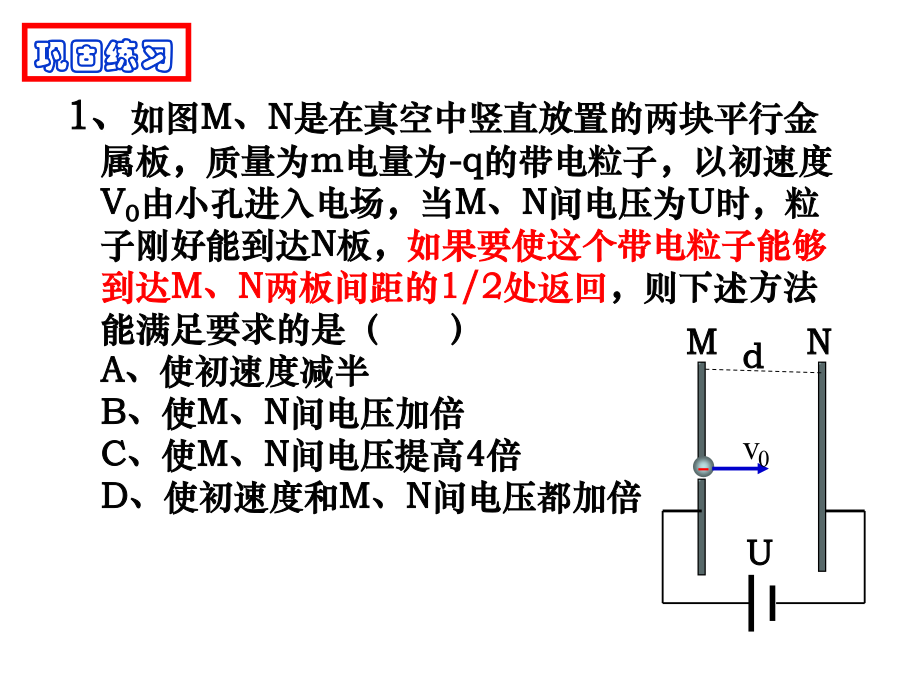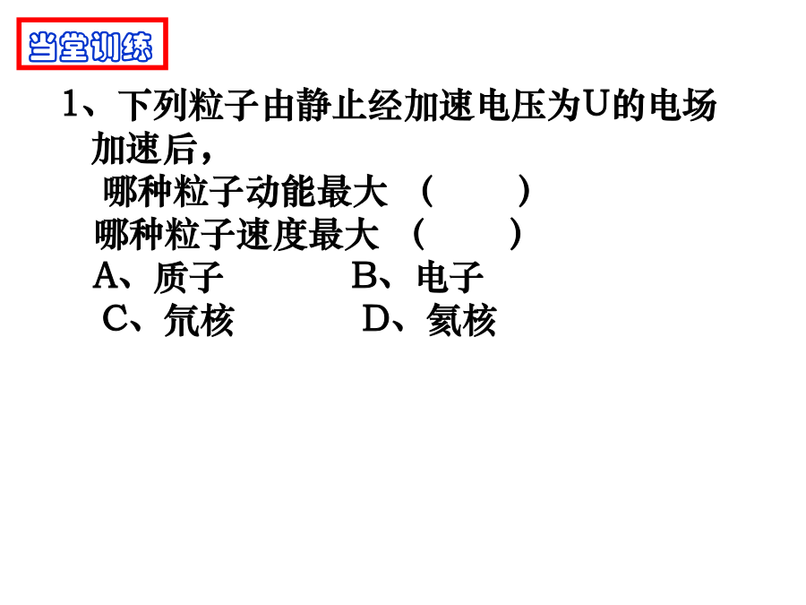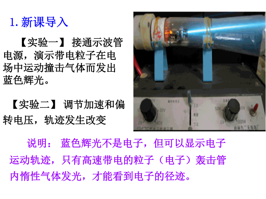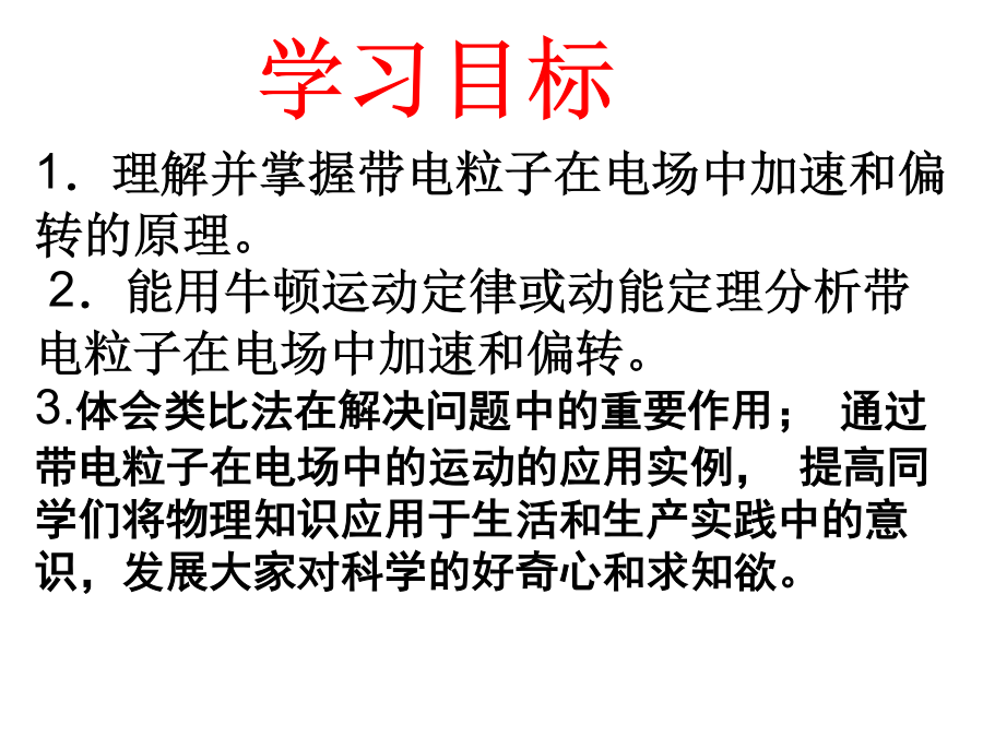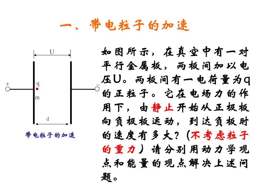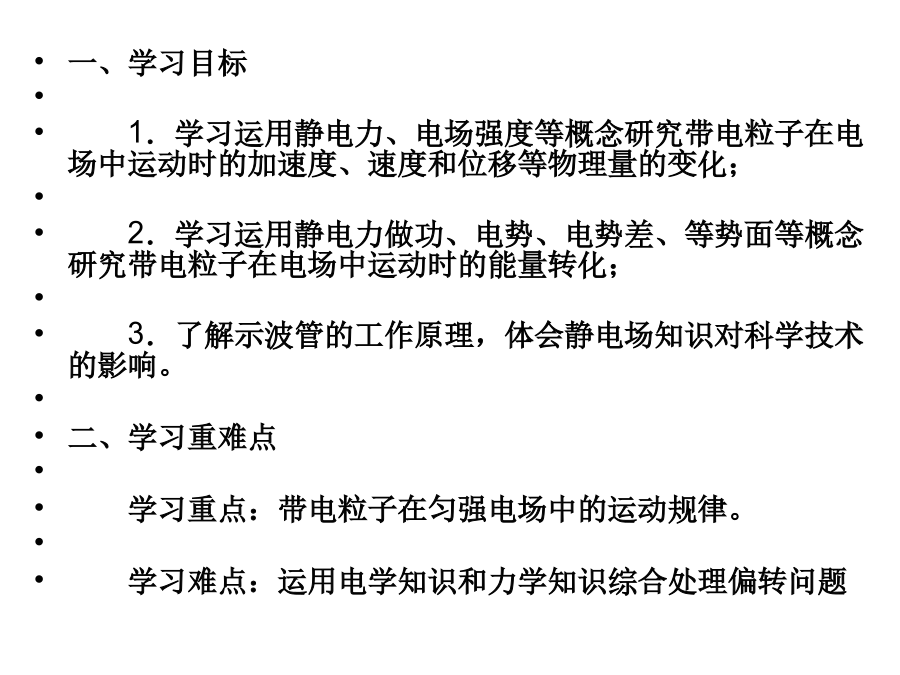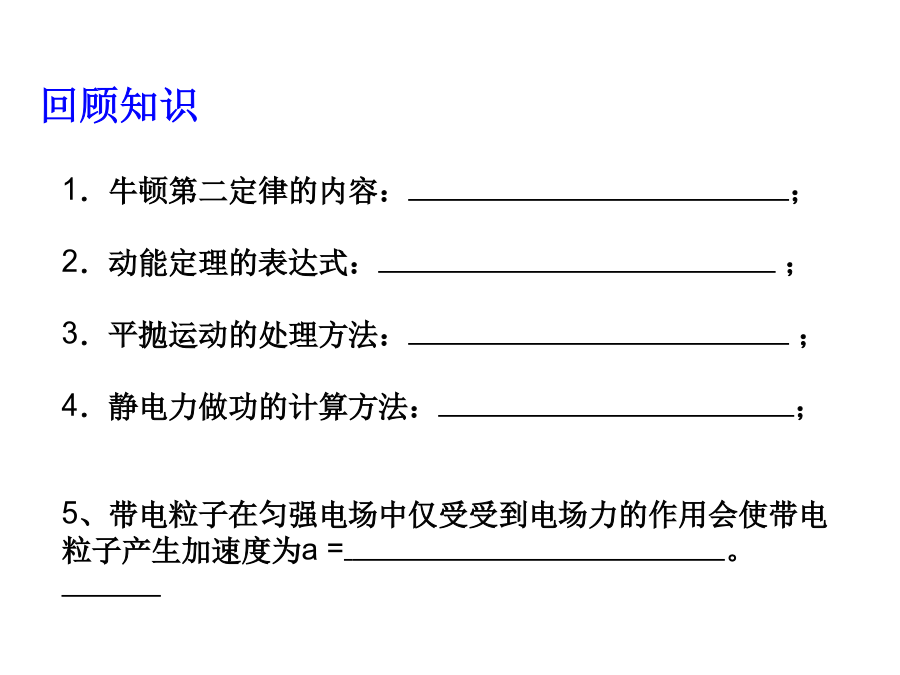 带电粒子在电场中的运动1.牛顿第二定律的内容:;2.动能定理的表达式:;3.平抛运动的处理方法:;4.静电力做功的计算方法:;5、带电粒子在匀强电场中仅受受到电场力的作用会使带电粒子产生加速度为a=。说明:蓝色辉光不是电子,但可以显示电子运动轨迹,只有高速带电的粒子(电子)轰击管内惰性气体发光,才能看到电子的径迹。电子如何获得速度?电子为何偏转?学习目标一、学习目标1.学习运用静电力、电场强度等概念研究带电粒子在电场中运动时的加速度、速度和位移等物理量的变化;2.学习运用静电力做功、电势、电势差、等势面等概念研究带电粒子在电场中运动时的能量转化;3.了解示波管的工作原理,体会静电场知识对科学技术的影响。二、学习重难点学习重点:带电粒子在匀强电场中的运动规律。学习难点:运用电学知识和力学知识综合处理偏转问题一、带电粒子的加速1、下列粒子由静止经加速电压为U的电场加速后,哪种粒子动能最大()哪种粒子速度最大()A、质子B、电子C、氘核D、氦核2、如图所示,M、N是在真空中竖直放置的两块平行金属板,质量为m、电量为+q的带电粒子,以极小的初速度由小孔进入电场,当M、N间电压为U时,粒子到达N板的速度为v,如果要使这个带电粒子到达N板的速度为2v,则下述方法能满足要求的是()A、使M、N间电压增加为2UB、使M、N间电压增加为4UC、使M、N间电压不变,距离减半D、使M、N间电压不变,距离加倍1、如图M、N是在真空中竖直放置的两块平行金属板,质量为m电量为-q的带电粒子,以初速度V0由小孔进入电场,当M、N间电压为U时,粒子刚好能到达N板,如果要使这个带电粒子能够到达M、N两板间距的1/2处返回,则下述方法能满足要求的是()A、使初速度减半B、使M、N间电压加倍C、使M、N间电压提高4倍D、使初速度和M、N间电压都加倍思考题如图所示的电场中有A、B两点,A、B的电势差UAB=100V,一个质量为m=2.0×10-12kg、电量为q=-5.0×10-8C的带电粒子,以初速度v0=3.0×103m/s由A点运动到B点,求粒子到达B点时的速率。(不计粒子重力)如图所示,A、B为平行金属板电容器,两板间的距离为d,在A板的缺口的正上方距离为h的P处,有一静止的、质量为m、带电量为+q的液滴由静止开始自由落下,若要使液滴不落在B板上,两板间场强至少为多大?两板间的电压U至少为多大?作业: