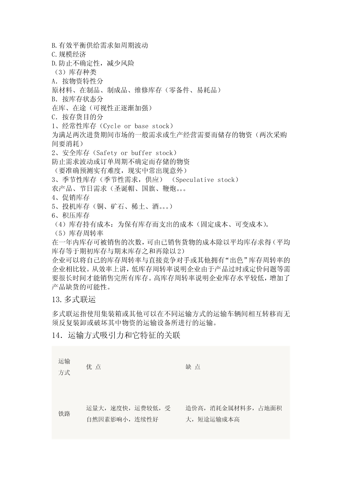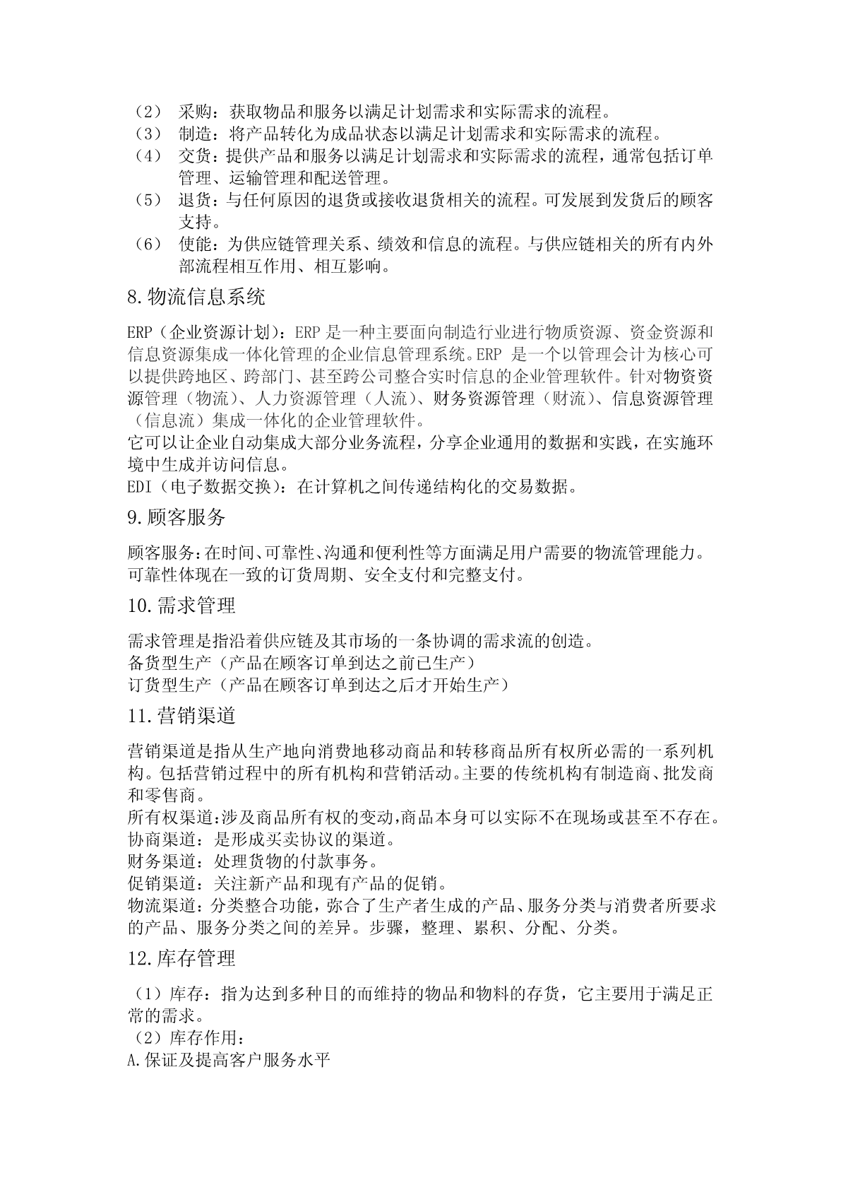 物流管理知识点整合1.什么是物流管理?物流管理是指在社会再生产过程中,根据物质资料实体流动的规律,应用管理的基本原理和科学方法,对物流活动进行计划、组织、指挥、协调、控制和监督,使各项物流活动实现最佳的协调与配合,以降低物流成本,提高物流效率和经济效益。2.什么是供应链?供应链是流程、职能、活动、关系以及产品、服务、信息、资金从原材料生产者直到最终消费者在企业内和企业间移动路径的组合。3.供应链合作供应链合作:供应链成员之间、企业与其供应链或顾客之间建立的正式或非正式的合作关系,以提高各方的整体业务绩效。4.供应链四大使能要素(1)理解顾客权力增加的影响(2)建立适当的关系机构(3)借助技术增强可视性和沟通(4)供应链服务提供商的使用5.实施供应链管理的阻碍要素(1)规制和政治因素(2)缺乏高层管理的承诺(3)不愿分享或使用相关信息(4)不兼容的信息系统(5)不相容的企业文化(6)全球化挑战6.按重要性程度分:关键性物流活动和支持性物流活动(1)关键性物流活动:每一个物流渠道都会发生,或者占总物流成本比重很大,或是有效协调、完成物流工作的关键环节。客户服务、运输、物流信息管理、库存管理(2)支持性物流活动仓储、物料搬运、采购、包装7.SCOR模型流程SCOR模型识别与供应链管理相关的六种流程——计划、采购、制造、交货、退货和使能(1)计划:平衡总需求和供应链以开发最能满足采购、生产和发货需求的一连串活动的流程。(2)采购:获取物品和服务以满足计划需求和实际需求的流程。(3)制造:将产品转化为成品状态以满足计划需求和实际需求的流程。(4)交货:提供产品和服务以满足计划需求和实际需求的流程,通常包括订单管理、运输管理和配送管理。(5)退货:与任何原因的退货或接收退货相关的流程。可发展到发货后的顾客支持。(6)使能:为供应链管理关系、绩效和信息的流程。与供应链相关的所有内外部流程相互作用、相互影响。8.物流信息系统ERP(企业资源计划):ERP是一种主要面向制造行业进行物质资源、资金资源和信息资源集成一体化管理的企业信息管理系统。ERP是一个以管理会计为核心可以提供跨地区、跨部门、甚至跨公司整合实时信息的企业管理软件。针对物资资源管理(物流)、人力资源管理(人流)、财务资源管理(财流)、信息资源管理(信息流)集成一体化的企业管理软件。它可以让企业自动集成大部分业务流程,分享企业通用的数据和实践,在实施环境中生成并访问信息。EDI(电子数据交换):在计算机之间传递结构化的交易数据。9.顾客服务顾客服务:在时间、可靠性、沟通和便利性等方面满足用户需要的物流管理能力。可靠性体现在一致的订货周期、安全支付和完整支付。10.需求管理需求管理是指沿着供应链及其市场的一条协调的需求流的创造。备货型生产(产品在顾客订单到达之前已生产)订货型生产(产品在顾客订单到达之后才开始生产)11.营销渠道营销渠道是指从生产地向消费地移动商品和转移商品所有权所必需的一系列机构。包括营销过程中的所有机构和营销活动。主要的传统机构有制造商、批发商和零售商。所有权渠道:涉及商品所有权的变动,商品本身可以实际不在现场或甚至不存在。协商渠道:是形成买卖协议的渠道。财务渠道:处理货物的付款事务。促销渠道:关注新产品和现有产品的促销。物流渠道:分类整合功能,弥合了生产者生成的产品、服务分类与消费者所要求的产品、服务分类之间的差异。步骤,整理、累积、分配、分类。12.库存管理(1)库存:指为达到多种目的而维持的物品和物料的存货,它主要用于满足正常的需求。(2)库存作用:A.保证及提高客户服务水平B.有效平衡供给需求如周期波动C.规模经济D.防止不确定性,减少风险(3)库存种类A.按物资特性分原材料、在制品、制成品、维修库存(零备件、易耗品)B.按库存状态分在库、在途(可视性正逐渐加强)C.按存货目的分1、经常性库存(Cycleorbasestock)为满足两次进货期间市场的一般需求或生产经营需要而储存的物资(两次采购间要消耗)2、安全库存(Safetyorbufferstock)防止需求波动或订单周期不确定而存储的物资(要准确预测实有难度,现实中常出现意外)3、季节性库存(季节性需求,供应)(Speculativestock)农产品、节日需求(圣诞帽、国旗、鞭炮。。。4、促销库存5、投机库存(铜、矿石、稀土、酒。。。)6、积压库存(4)库存持有成本:为保有库存而支出的成本(固定成本、可变成本)。(5)库存周转率在一年内库存可被销售的次数,可由已销售货物的成本除