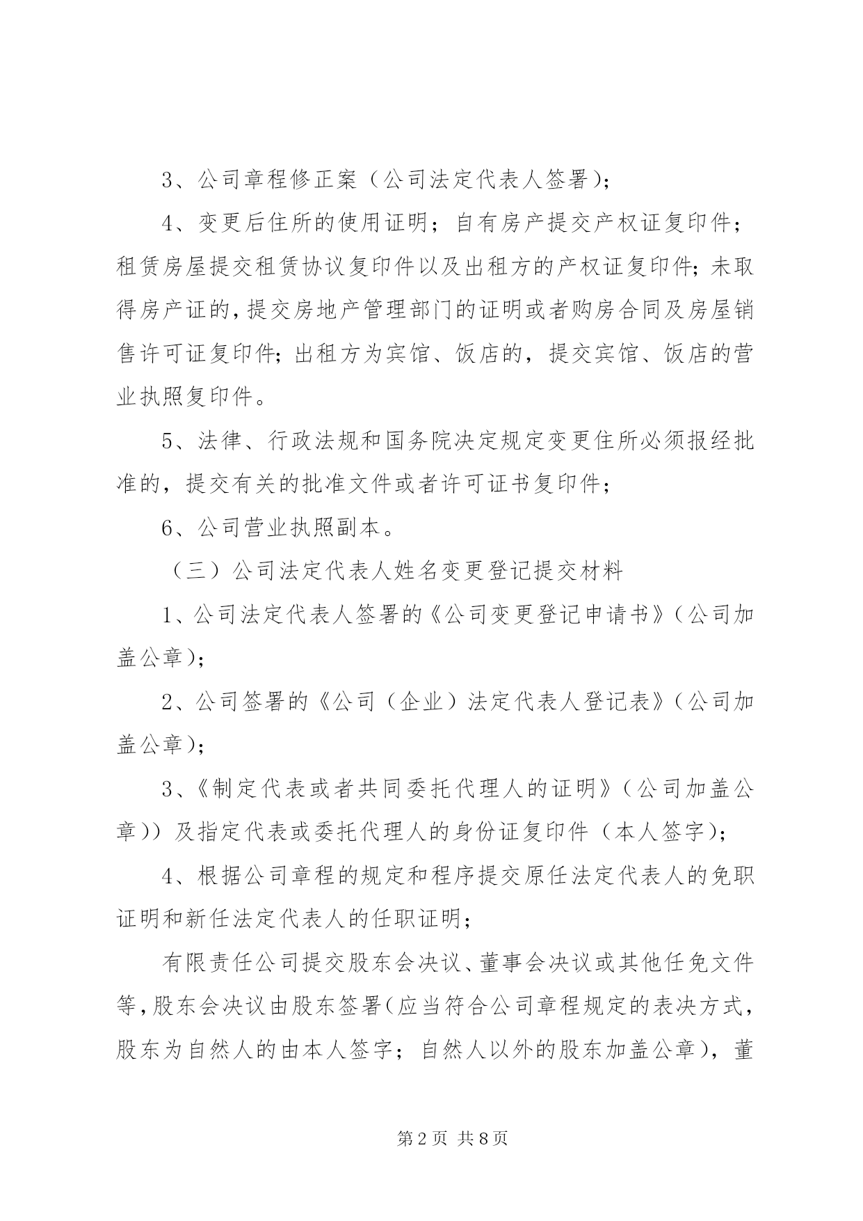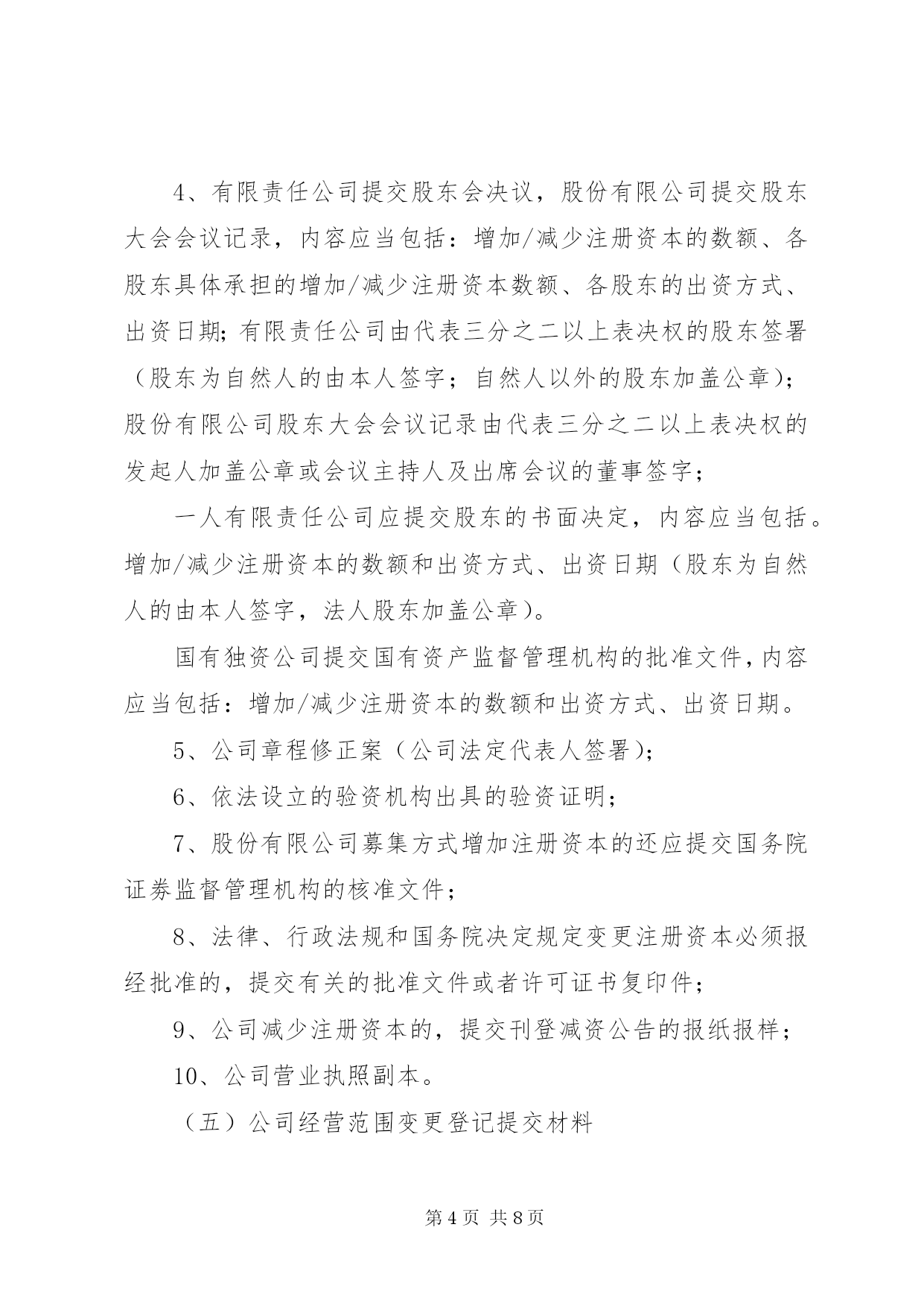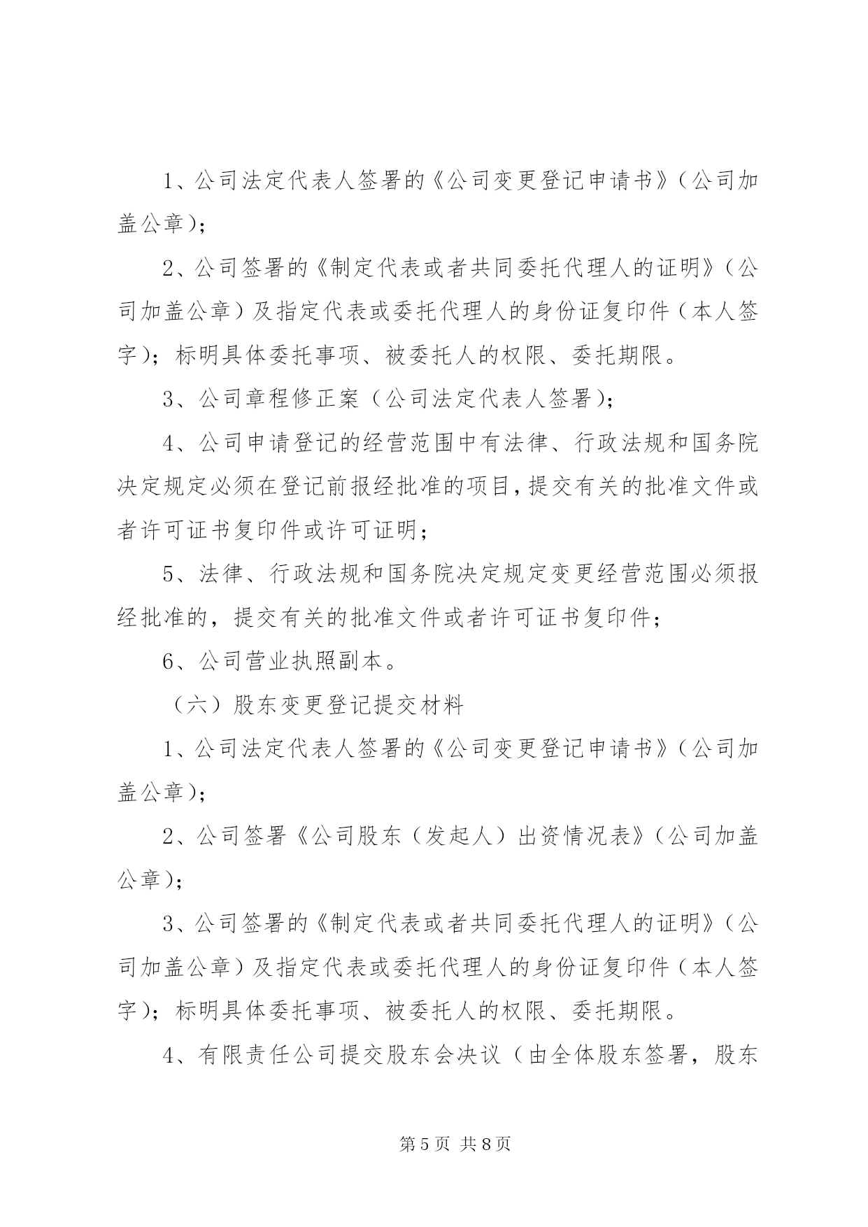 第PAGE\*Arabic\*MERGEFORMAT8页共NUMPAGES\*MERGEFORMAT8页(工商)公司变更登记提交材料公司变更登记提交材料(一)公司名称变更登记提交材料1、公司法定代表人签署的《公司变更登记申请书》(公司加盖公章);2、公司签署的《制定代表或者共同委托代理人的证明》(公司加盖公章)及指定代表或委托代理人的身份证复印件(本人签字);应标明具体委托事项、被委托人的权限、委托期限。3、公司章程修正案(公司法定代表人签署);4、法律、行政法规和国务院决定规定公司名称变更必须报经批准的,提交有关的批准文件或者许可证书复印件;5、公司营业执照副本。公司变更名称,应当向其公司登记机关提出申请,申请名称超出其公司登记机关管辖权限的,向该名称登记权的公司登记机关申报。(二)公司住所变更登记提交材料1、公司法定代表人签署的《公司变更登记申请书》(公司加盖公章);2、公司签署的《制定代表或者共同委托代理人的证明》(公司加盖公章)及指定代表或委托代理人的身份证复印件(本人签字);应标明具体委托事项、被委托人的权限、委托期限。3、公司章程修正案(公司法定代表人签署);4、变更后住所的使用证明;自有房产提交产权证复印件;租赁房屋提交租赁协议复印件以及出租方的产权证复印件;未取得房产证的,提交房地产管理部门的证明或者购房合同及房屋销售许可证复印件;出租方为宾馆、饭店的,提交宾馆、饭店的营业执照复印件。5、法律、行政法规和国务院决定规定变更住所必须报经批准的,提交有关的批准文件或者许可证书复印件;6、公司营业执照副本。(三)公司法定代表人姓名变更登记提交材料1、公司法定代表人签署的《公司变更登记申请书》(公司加盖公章);2、公司签署的《公司(企业)法定代表人登记表》(公司加盖公章);3、《制定代表或者共同委托代理人的证明》(公司加盖公章))及指定代表或委托代理人的身份证复印件(本人签字);4、根据公司章程的规定和程序提交原任法定代表人的免职证明和新任法定代表人的任职证明;有限责任公司提交股东会决议、董事会决议或其他任免文件等,股东会决议由股东签署(应当符合公司章程规定的表决方式,股东为自然人的由本人签字;自然人以外的股东加盖公章),董事会决议由公司董事签字。股份有限公司提交董事会决议或其他任免文件,董事会决议由公司董事签字。国有独资有限责任公司提交出资人或其授权部门的书面决定(加盖公章)、董事会决议(由董事签字)或其他相关材料。一人有限责任公司提交股东的书面决定(股东为自然人的由本人签字,法人股东加盖公章)、董事会决议(由董事签字)或其他相关材料。5、法律、行政法规和国务院决定规定变更法定代表人必须报经批准的,提交有关的批准文件或者许可证书复印件;6、公司营业执照副本。公司变更法定代表人姓名涉及公司董事变动的,应按《公司董事、监事、经理备案提交材料规范》同时提交相关备案材料,相同的材料不必重复提交。(四)公司注册资本变更登记提交材料1、公司法定代表人签署的《公司变更登记申请书》(公司加盖公章);2、公司签署的《公司股东(发起人)出资情况表》(公司加盖公章);3、公司签署的《制定代表或者共同委托代理人的证明》(公司加盖公章)及指定代表或委托代理人的身份证复印件(本人签字);标明具体委托事项、被委托人的权限、委托期限。4、有限责任公司提交股东会决议,股份有限公司提交股东大会会议记录,内容应当包括:增加/减少注册资本的数额、各股东具体承担的增加/减少注册资本数额、各股东的出资方式、出资日期;有限责任公司由代表三分之二以上表决权的股东签署(股东为自然人的由本人签字;自然人以外的股东加盖公章);股份有限公司股东大会会议记录由代表三分之二以上表决权的发起人加盖公章或会议主持人及出席会议的董事签字;一人有限责任公司应提交股东的书面决定,内容应当包括。增加/减少注册资本的数额和出资方式、出资日期(股东为自然人的由本人签字,法人股东加盖公章)。国有独资公司提交国有资产监督管理机构的批准文件,内容应当包括:增加/减少注册资本的数额和出资方式、出资日期。5、公司章程修正案(公司法定代表人签署);6、依法设立的验资机构出具的验资证明;7、股份有限公司募集方式增加注册资本的还应提交国务院证劵监督管理机构的核准文件;8、法律、行政法规和国务院决定规定变更注册资本必须报经批准的,提交有关的批准文件或者许可证书复印件;9、公司减少注册资本的,提交刊登减资公告的报纸报样;10、公司营业执照副本。(五)公司经营范围变更登记提交材料1、公司法定代表人签署的《公司变更登记申请书》(公司加盖公章);2、公司签署的《制定代表或者共同委托代理人的证明》(公司加盖公章)及指定代表或委托代理人的身份证复印件(本人签字);标明具体委托事项、被委托人的权限