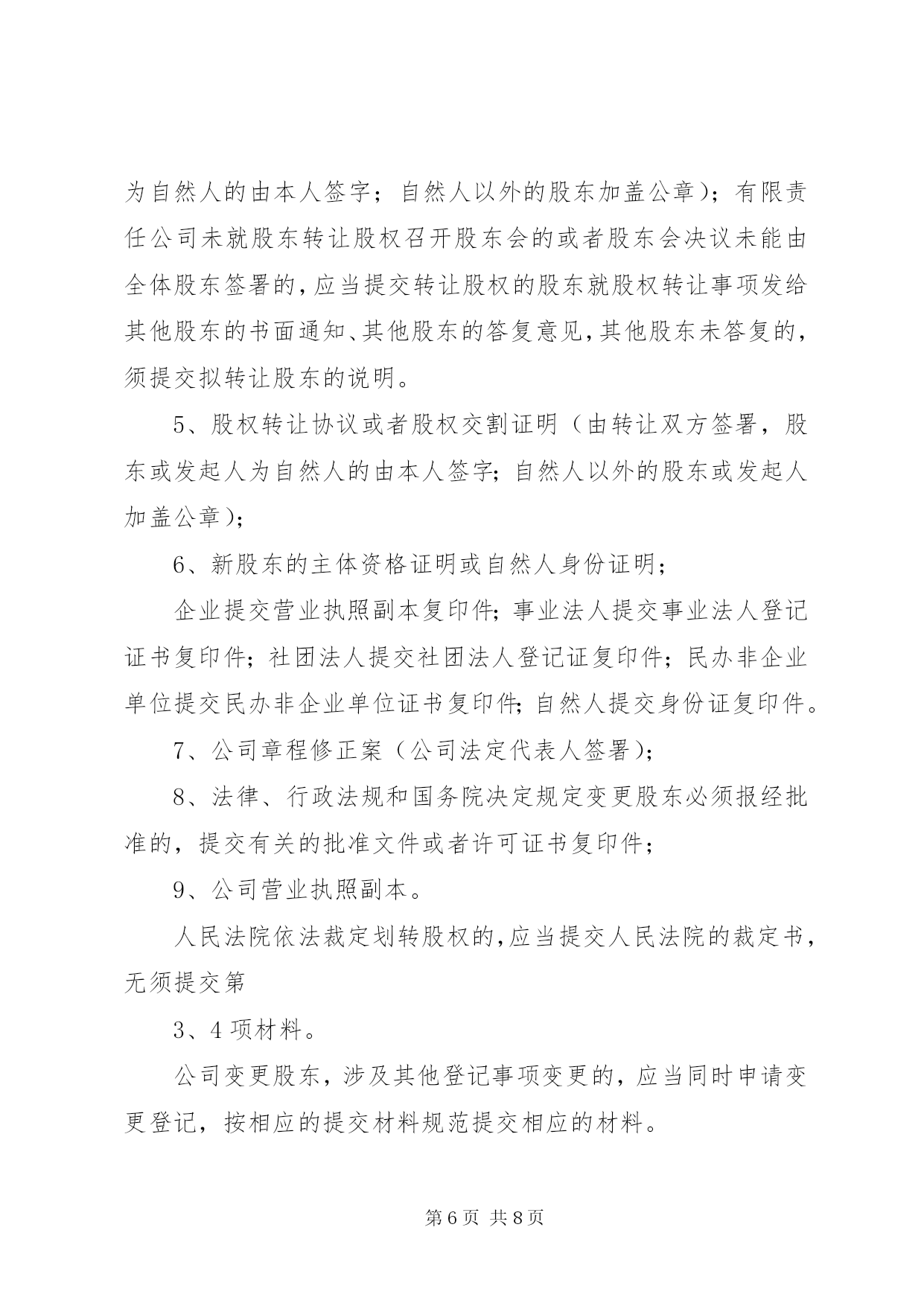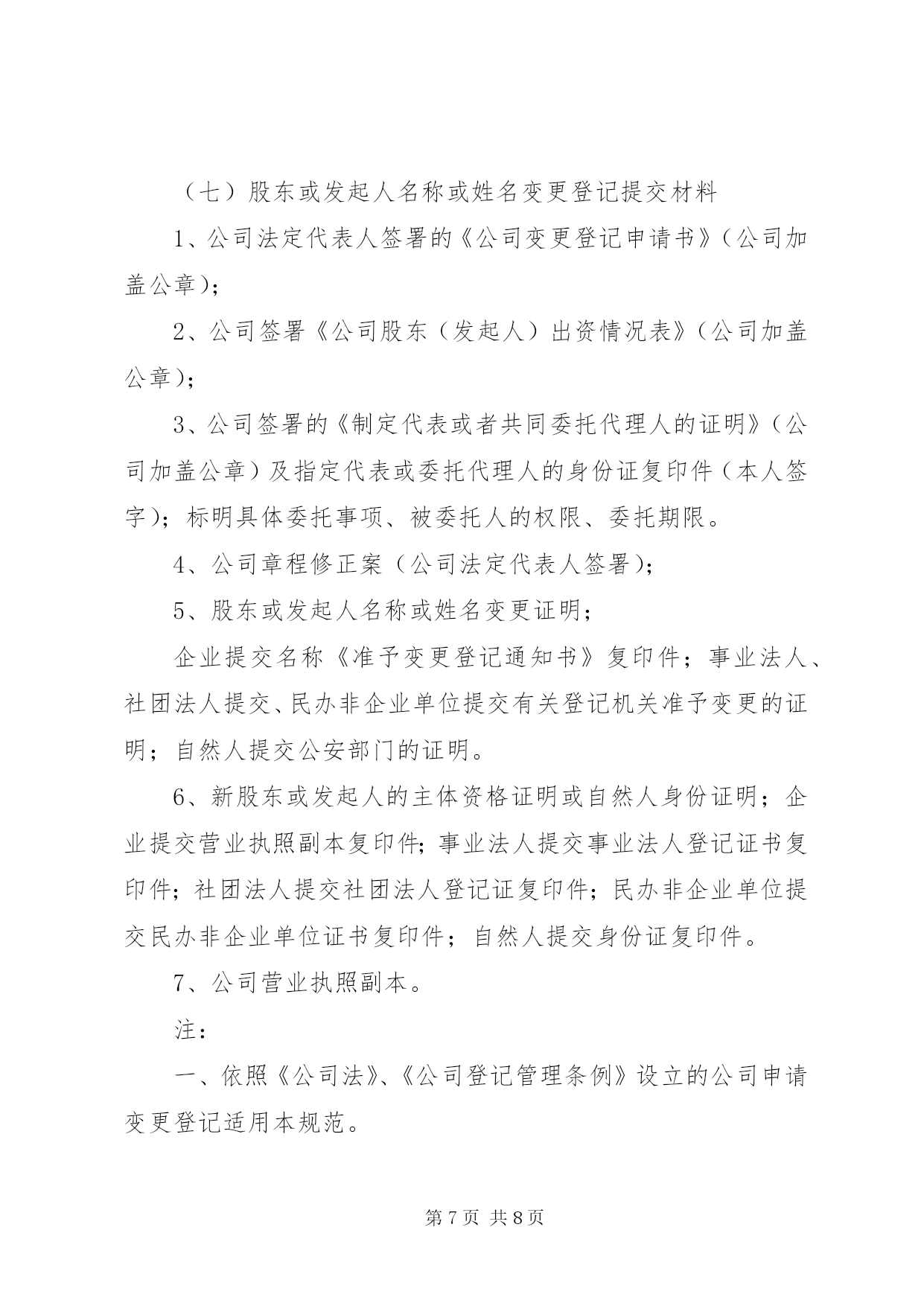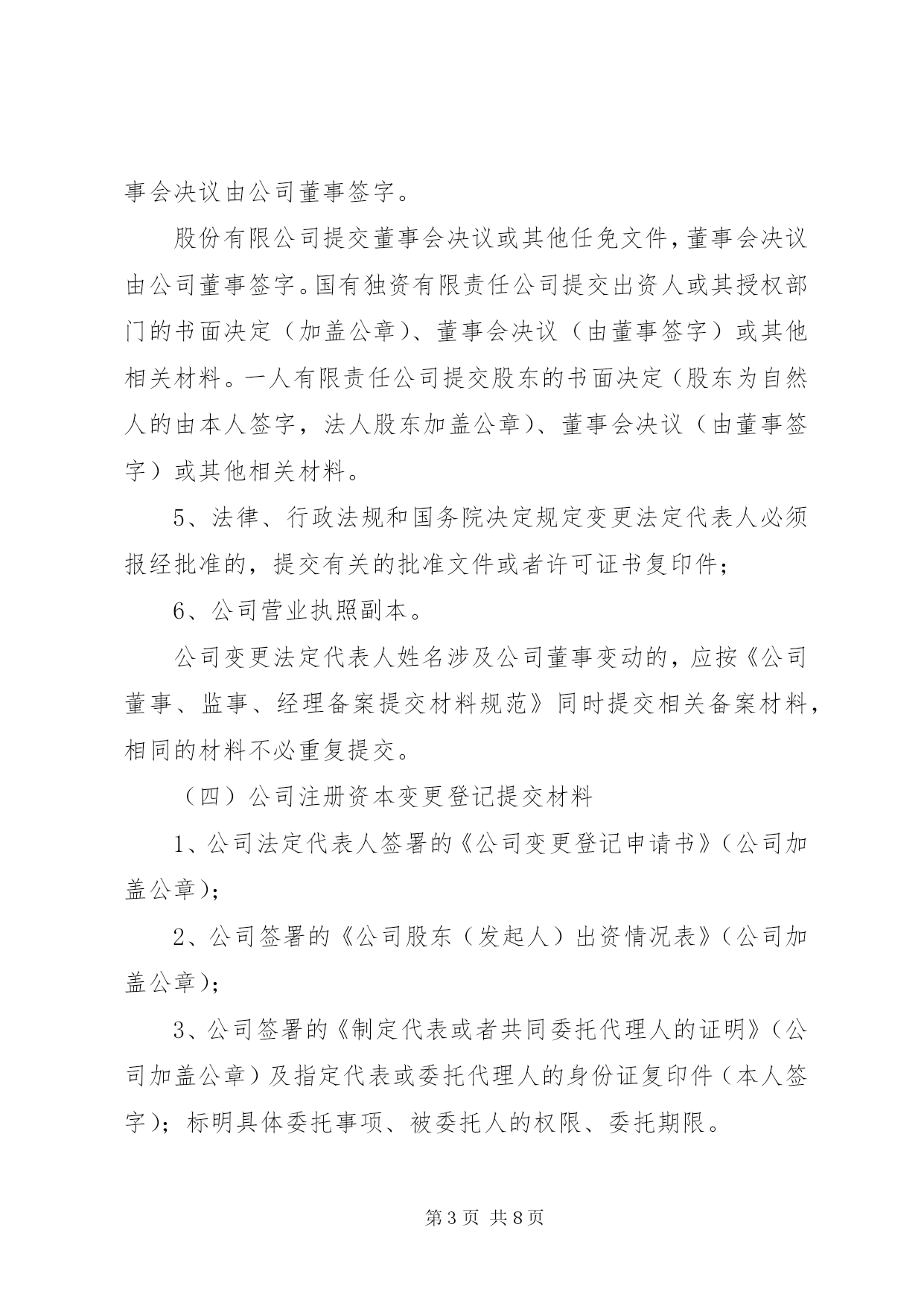 第PAGE\*Arabic\*MERGEFORMAT8页共NUMPAGES\*MERGEFORMAT8页(工商)公司变更登记提交材料公司变更登记提交材料(一)公司名称变更登记提交材料1、公司法定代表人签署的《公司变更登记申请书》(公司加盖公章);2、公司签署的《制定代表或者共同委托代理人的证明》(公司加盖公章)及指定代表或委托代理人的身份证复印件(本人签字);应标明具体委托事项、被委托人的权限、委托期限。3、公司章程修正案(公司法定代表人签署);4、法律、行政法规和国务院决定规定公司名称变更必须报经批准的,提交有关的批准文件或者许可证书复印件;5、公司营业执照副本。公司变更名称,应当向其公司登记机关提出申请,申请名称超出其公司登记机关管辖权限的,向该名称登记权的公司登记机关申报。(二)公司住所变更登记提交材料1、公司法定代表人签署的《公司变更登记申请书》(公司加盖公章);2、公司签署的《制定代表或者共同委托代理人的证明》(公司加盖公章)及指定代表或委托代理人的身份证复印件(本人签字);应标明具体委托事项、被委托人的权限、委托期限。3、公司章程修正案(公司法定代表人签署);4、变更后住所的使用证明;自有房产提交产权证复印件;租赁房屋提交租赁协议复印件以及出租方的产权证复印件;未取得房产证的,提交房地产管理部门的证明或者购房合同及房屋销售许可证复印件;出租方为宾馆、饭店的,提交宾馆、饭店的营业执照复印件。5、法律、行政法规和国务院决定规定变更住所必须报经批准的,提交有关的批准文件或者许可证书复印件;6、公司营业执照副本。(三)公司法定代表人姓名变更登记提交材料1、公司法定代表人签署的《公司变更登记申请书》(公司加盖公章);2、公司签署的《公司(企业)法定代表人登记表》(公司加盖公章);3、《制定代表或者共同委托代理人的证明》(公司加盖公章))及指定代表或委托代理人的身份证复印件(本人签字);4、根据公司章程的规定和程序提交原任法定代表人的免职证明和新任法定代表人的任职证明;有限责任公司提交股东会决议、董事会决议或其他任免文件等,股东会决议由股东签署(应当符合公司章程规定的表决方式,股东为自然人的由本人签字;自然人以外的股东加盖公章),董事会决议由公司董事签字。股份有限公司提交董事会决议或其他任免文件,董事会决议由公司董事签字。国有独资有限责任公司提交出资人或其授权部门的书面决定(加盖公章)、董事会决议(由董事签字)或其他相关材料。一人有限责任公司提交股东的书面决定(股东为自然人的由本人签字,法人股东加盖公章)、董事会决议(由董事签字)或其他相关材料。5、法律、行政法规和国务院决定规定变更法定代表人必须报经批准的,提交有关的批准文件或者许可证书复印件;6、公司营业执照副本。公司变更法定代表人姓名涉及公司董事变动的,应按《公司董事、监事、经理备案提交材料规范》同时提交相关备案材料,相同的材料不必重复提交。(四)公司注册资本变更登记提交材料1、公司法定代表人签署的《公司变更登记申请书》(公司加盖公章);2、公司签署的《公司股东(发起人)出资情况表》(公司加盖公章);3、公司签署的《制定代表或者共同委托代理人的证明》(公司加盖公章)及指定代表或委托代理人的身份证复印件(本人签字);标明具体委托事项、被委托人的权限、委托期限。4、有限责任公司提交股东会决议,股份有限公司提交股东大会会议记录,内容应当包括:增加/减少注册资本的数额、各股东具体承担的增加/减少注册资本数额、各股东的出资方式、出资日期;有限责任公司由代表三分之二以上表决权的股东签署(股东为自然人的由本人签字;自然人以外的股东加盖公章);股份有限公司股东大会会议记录由代表三分之二以上表决权的发起人加盖公章或会议主持人及出席会议的董事签字;一人有限责任公司应提交股东的书面决定,内容应当包括。增加/减少注册资本的数额和出资方式、出资日期(股东为自然人的由本人签字,法人股东加盖公章)。国有独资公司提交国有资产监督管理机构的批准文件,内容应当包括:增加/减少注册资本的数额和出资方式、出资日期。5、公司章程修正案(公司法定代表人签署);6、依法设立的验资机构出具的验资证明;7、股份有限公司募集方式增加注册资本的还应提交国务院证劵监督管理机构的核准文件;8、法律、行政法规和国务院决定规定变更注册资本必须报经批准的,提交有关的批准文件或者许可证书复印件;9、公司减少注册资本的,提交刊登减资公告的报纸报样;10、公司营业执照副本。(五)公司经营范围变更登记提交材料1、公司法定代表人签署的《公司变更登记申请书》(公司加盖公章);2、公司签署的《制定代表或者共同委托代理人的证明》(公司加盖公章)及指定代表或委托代理人的身份证复印件(本人签字);标明具体委托事项、被委托人的权限