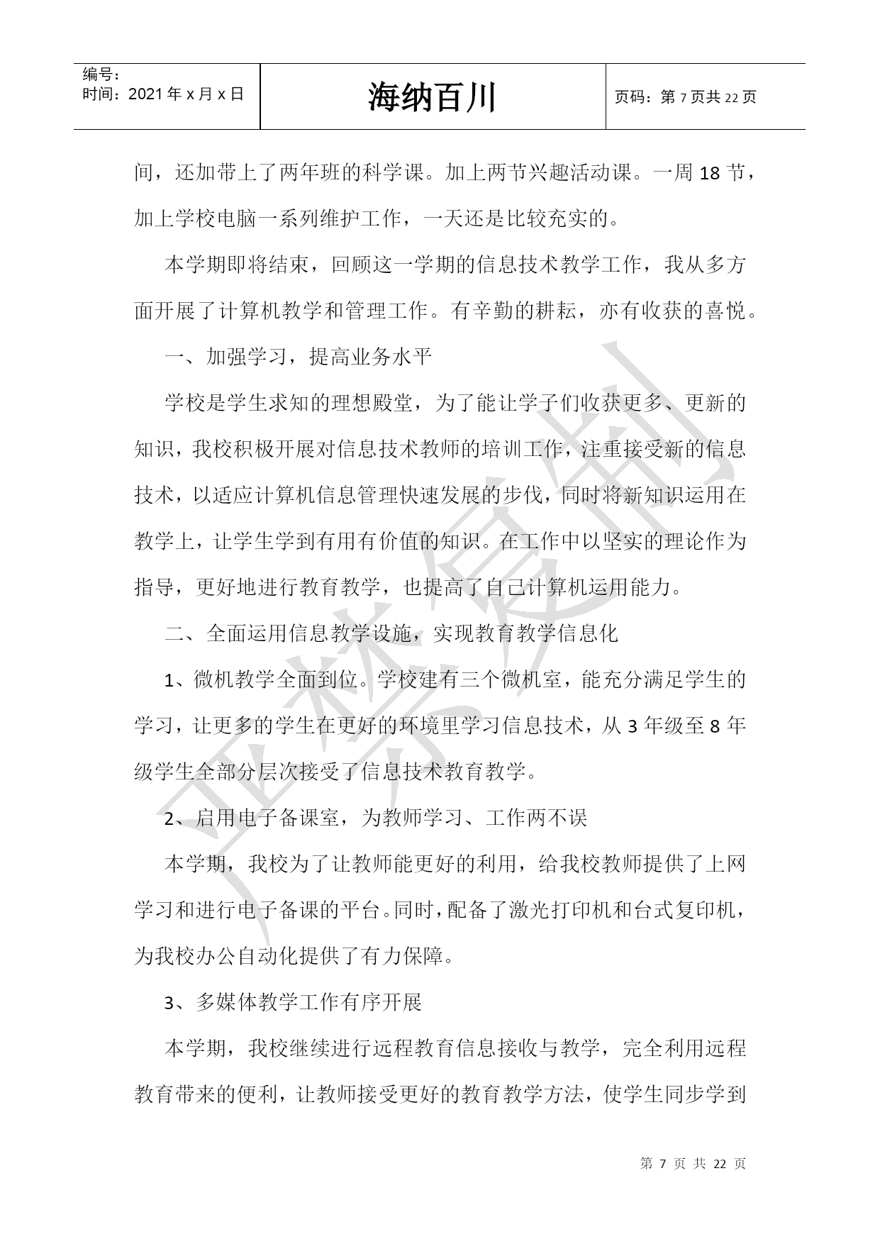 编号:时间:2021年x月x日海纳百川页码:第PAGE22页共NUMPAGES22页第PAGE\*MERGEFORMAT22页共NUMPAGES\*MERGEFORMAT22页学校信息技术教学工作总结第1篇:上学校信息技术教学工作总结信息技术工作总(2021—2021学年度第一学期)结六盘山镇第二小学2021年01月10日信息技术教学工作总结时光飞逝,转眼间一个学期又要结束了,真的感叹:时间你走得好快!回过头来望望,想想这一个学期我真的做了好多事情,不论是工作中还是自身的业务水平都得到了很大的提高,充实了许多,增长了不少人生经历。一、教学工作从开学我就给自己制定了一套严谨的工作计划,其中最主要的,也是最需要自己去努力的,就是本学期内一定要把各年级的课程备好,并制作课件以便上课的时候能更直观形象的将每节课所要学习的内容的操作步骤完整的展示给学生看,让教学过程更直观更简单,更好地完成教学任务。现在的各年级学生大部份已熟练掌握电脑的操作及使用方法。当然还是有少数几个学生掌握程度并不理想,似乎有些惧怕去驾驭这些电脑,还有一部分学生对计算机的学习理解不清晰,沉迷于网络游戏而忽视了知识性,这点在下学期是我必须要去努力攻克的难点。二、学校工作我严格要求自己,工作实干,并能完成学校给予的各项任务。完成了各个年级的教学工作;完成了学校微机室电脑及其它设备的维护;全校多媒体设备及教师电脑的日常维护;学生的学籍信息上传及维护工作;学校接收远程教学资源的工作;教师的电子信息维护工作;并完成学校领导安排的其他工作。三、考勤方面在做好各项教育教学工作的同时,严格遵守学校的各项规章制度。处理好学校工作与个人之间的关系,做到了不迟到,不早退。准时参加学校各项会议、校本培训。在课程改革推进的今天,社会对教师的素质要求更高,在今后的教育教学工作中,我将立足实际,认真分析和研究好教材、大纲,研究好学生,争取学校领导、师生的支持,创造性地搞好信息技术课的教学,使我的工作有所进取,更加严格要求自己,发扬优点,改正缺点,开拓前进。信息技术教学工作总结南村小学张吉方2021年9月1日信息技术教学工作总结时光飞逝,转眼间一个学期又要结束了,真的感叹:时间你走得好快!回过头来望望,想想这一个学期我真的做了好多事情,不论是工作中还是自身的业务水平都得到了很大的提高,充实了许多,增长了不少人生经历。一、教育教学方面本学期担任三至六年级共十二个班级的信息技术课,一学期来,认真备课、上课,严格要求学生,尊重学生,发扬教学民主,使学生学有所得。不断提高自己的教学水平和思想觉悟,并顺利完成教育教学任务。二、管理工作方面作为学校唯一的信息技术课教师,自然而然地就成为了学校计算机教室、网络中心的管理员,还有很多的临时性与计算机网络有关的工作,都保质保量的完成。三、自身业务水平的提高信息技术是一门特殊的课程,它不同于传统的课程,它的更新速度快得实在让人不敢怠慢,只要你有稍微的不留神,你绝对被抛得远远的,而且你永远无法追赶上它的脚步,所以对于我来说,不断地接受新知识,不断地在日常的设备维护中积累经验是十分重要的。因此,不论是看电脑杂志,还是在互联网上查阅资料,我都非常认真,更甚者,我会不断地去接触一些新鲜的东西或软件,在使用的过程中掌握它们的操作方法,使用技巧。这对于平时的教学都是很有帮助的,而且对自己业务水平的提高也是非常有好处的。今后,我还将一如既往的学习各种理论知识,增加实践经验,努力在业务水平上能不断进步,不断更新。四、今后努力的方向1、努力学习更多新知识,并传授给学生,注重对学生能力的培养。2、对差生多些关心,多点爱心,多一些耐心,使他们在对计算机的认识上有更大的进步。3、在日常的设备维护工作中多实践,多尝试,努力做到每一次的实践都能有所收获。4、多阅读相关杂志,多在互联网上查阅资料,充分利用好互联网资源。以上是本人在本学期信息技术教学工作中的总结。社会在发展,时代在前进,学生的特点和问题也在发生着不断的变化。教育教学工作,是一项常做常新、永无止境的工作。作为教育工,必须以高度的敏感性和自觉性,及时发现、研究和解决学生教育和管理工作中的新情况、新问题,掌握其特点,发现其规律,尽职尽责地做好工作,我要以“内强素质、外树形像、加快发展、争创一流!”为目标,踏实工作,服务于教,努力为学校的发展贡献自己的一份力量。时光荏苒,转眼一个学期的工作结束了,回顾本学期的工作,有辛勤过后的快乐,也有耕耘过后的收获,现在做以下总结:一、思想方面工作以来我在思想上积极要求进步,忠诚党的教育事业,服从领导的分配,遵守劳动纪律,团结同志,热心帮助同志,教育目的明确,态度端正,钻研业务,勤奋刻苦;为人师表,有奉献精神。二、教