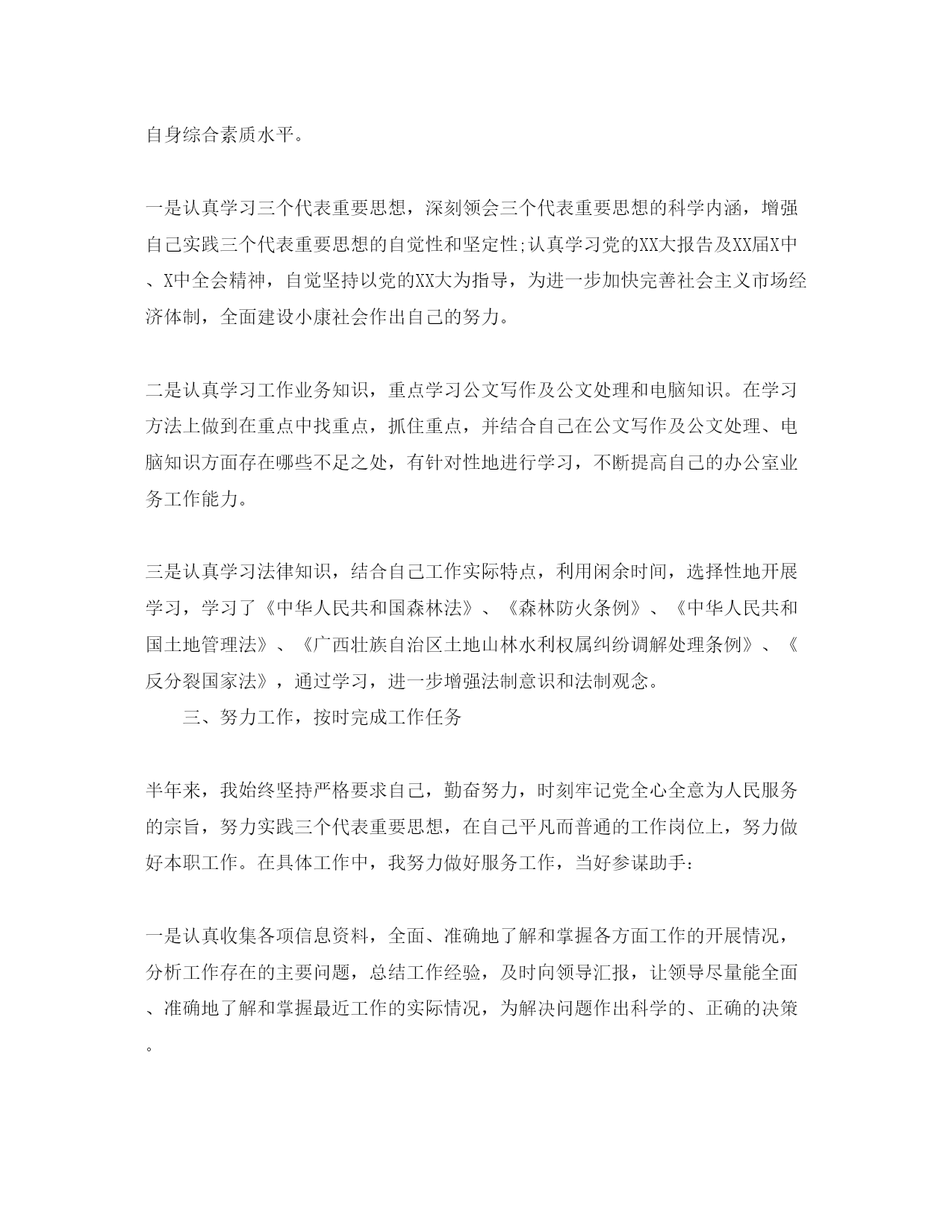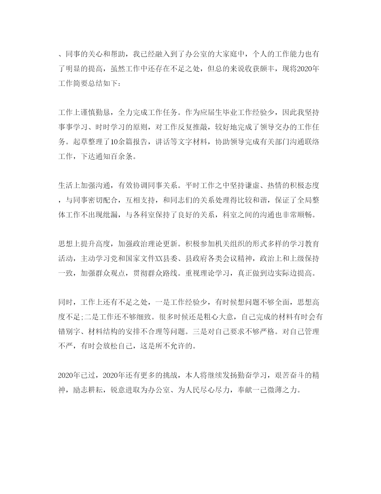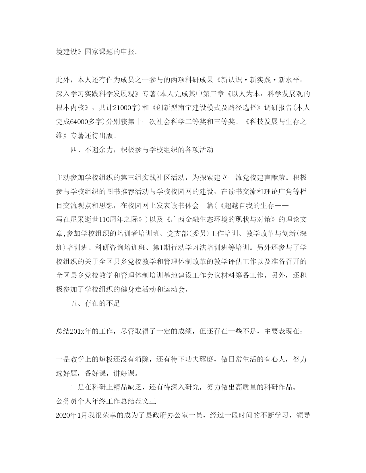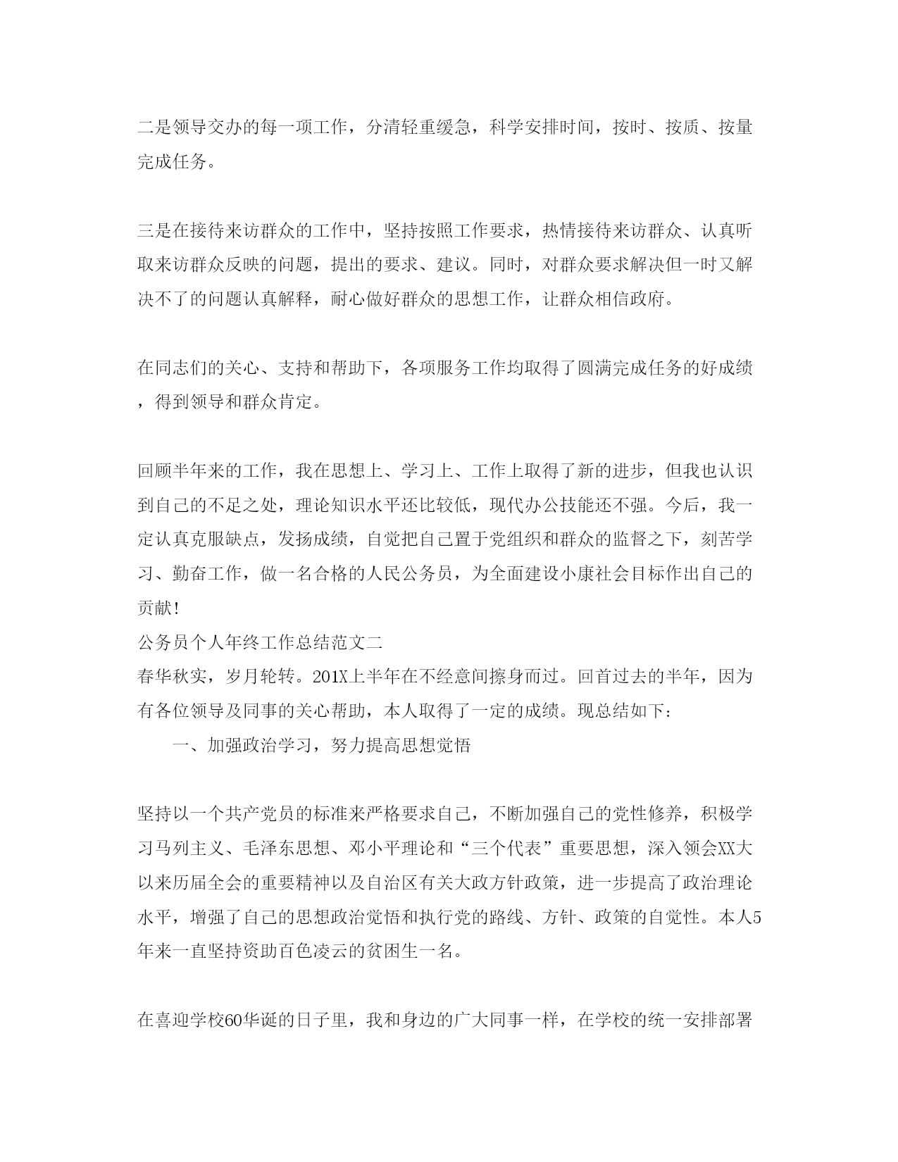 此资料由网络收集而来,如有侵权请告知上传者立即删除。资料共分享,我们负责传递知识。公务员个人年终工作总结公务员代表国家和人民行使国家权力,公务员队伍的工作能力和工作态度直接关系到政府机关的工作质量和效率,关系到各级政府的执政水平和行政管理能力。今天小编给大家整理了公务员个人年终工作总结,希望对大家有所帮助。公务员个人年终工作总结范文一2020年,我坚持以马克思、列宁主义,毛泽东思想,邓小平理论和三个代表重要思想为指导,自觉加强理论学习,认真学习三个代表重要思想、党的XX大报告及XX届X中X中全会精神,刻苦钻研业务知识,努力提高理论知识和业务工作水平,公务员个人年终总结。遵纪守法,努力工作,认真完成领导交办的各项工作任务,在同志们的关心、支持和帮助下,思想、学习和工作等方面取得了新的进步。现总结如下:一、严于律已,自觉加强党性锻炼,党性修养和政治思想觉悟进一步提高半年来,我始终坚持运用马克思列宁主义的立尝观点和方法论,运用辩证唯物主义与历史唯物主义去分析和观察事物,明辨是非,坚持真理,坚持正确的世界观、人生观、价值观,用正确的世界观、人生观、价值观指导自己的学习、工作和生活实践,在思想上积极构筑抵御资产阶级民主和自由化、拜金主义、自由主义等一切腐朽思想侵蚀的坚固防线。热爱祖国,热爱中国共产党,热爱社会主义,拥护中国共产党的领导,拥护改革开放,坚信社会主义最终必然战胜资本主义,对社会主义充满必胜的信心。认真贯彻执行党的路线、方针、政策,为加快社会主义建设事业认真做好本职工作。工作积极主动,勤奋努力,不畏艰难,尽职尽责,在平凡的工作岗位上作出力所能及的贡献。二、强化理论和业务学习,不断提高自身综合素质我重视加强理论和业务知识学习,在工作中,坚持一边工作一边学习,不断提高自身综合素质水平。一是认真学习三个代表重要思想,深刻领会三个代表重要思想的科学内涵,增强自己实践三个代表重要思想的自觉性和坚定性;认真学习党的XX大报告及XX届X中、X中全会精神,自觉坚持以党的XX大为指导,为进一步加快完善社会主义市场经济体制,全面建设小康社会作出自己的努力。二是认真学习工作业务知识,重点学习公文写作及公文处理和电脑知识。在学习方法上做到在重点中找重点,抓住重点,并结合自己在公文写作及公文处理、电脑知识方面存在哪些不足之处,有针对性地进行学习,不断提高自己的办公室业务工作能力。三是认真学习法律知识,结合自己工作实际特点,利用闲余时间,选择性地开展学习,学习了《中华人民共和国森林法》、《森林防火条例》、《中华人民共和国土地管理法》、《广西壮族自治区土地山林水利权属纠纷调解处理条例》、《反分裂国家法》,通过学习,进一步增强法制意识和法制观念。三、努力工作,按时完成工作任务半年来,我始终坚持严格要求自己,勤奋努力,时刻牢记党全心全意为人民服务的宗旨,努力实践三个代表重要思想,在自己平凡而普通的工作岗位上,努力做好本职工作。在具体工作中,我努力做好服务工作,当好参谋助手:一是认真收集各项信息资料,全面、准确地了解和掌握各方面工作的开展情况,分析工作存在的主要问题,总结工作经验,及时向领导汇报,让领导尽量能全面、准确地了解和掌握最近工作的实际情况,为解决问题作出科学的、正确的决策。二是领导交办的每一项工作,分清轻重缓急,科学安排时间,按时、按质、按量完成任务。三是在接待来访群众的工作中,坚持按照工作要求,热情接待来访群众、认真听取来访群众反映的问题,提出的要求、建议。同时,对群众要求解决但一时又解决不了的问题认真解释,耐心做好群众的思想工作,让群众相信政府。在同志们的关心、支持和帮助下,各项服务工作均取得了圆满完成任务的好成绩,得到领导和群众肯定。回顾半年来的工作,我在思想上、学习上、工作上取得了新的进步,但我也认识到自己的不足之处,理论知识水平还比较低,现代办公技能还不强。今后,我一定认真克服缺点,发扬成绩,自觉把自己置于党组织和群众的监督之下,刻苦学习、勤奋工作,做一名合格的人民公务员,为全面建设小康社会目标作出自己的贡献!公务员个人年终工作总结范文二春华秋实,岁月轮转。201X上半年在不经意间擦身而过。回首过去的半年,因为有各位领导及同事的关心帮助,本人取得了一定的成绩。现总结如下:一、加强政治学习,努力提高思想觉悟坚持以一个共产党员的标准来严格要求自己,不断加强自己的党性修养,积极学习马列主义、毛泽东思想、邓小平理论和“三个代表”重要思想,深入领会XX大以来历届全会的重要精神以及自治区有关大政方针政策,进一步提高了政治理论水平,增强了自己的思想政治觉悟和执行党的路线、方针、政策的自觉性。本人5年来一直坚持资助百色凌云的贫困生一名。在喜迎学校60华诞的日子里,我和身边的广大同事一样,在学校的统一安排部署下,积极参
