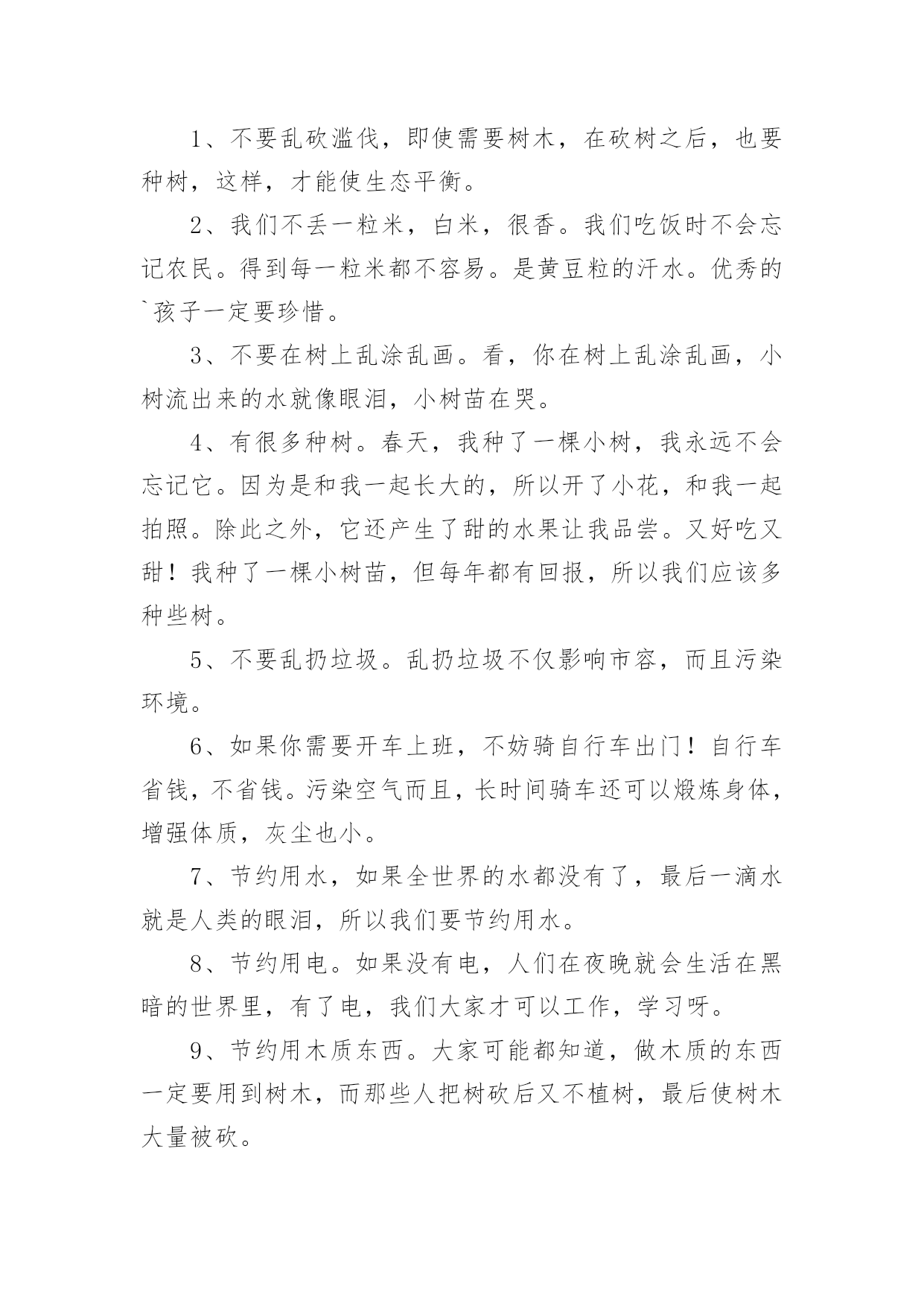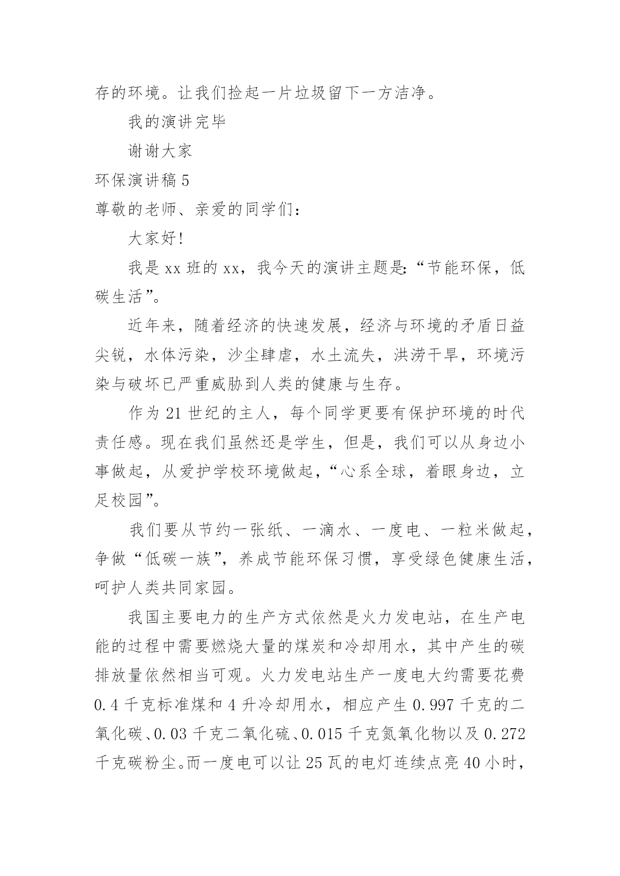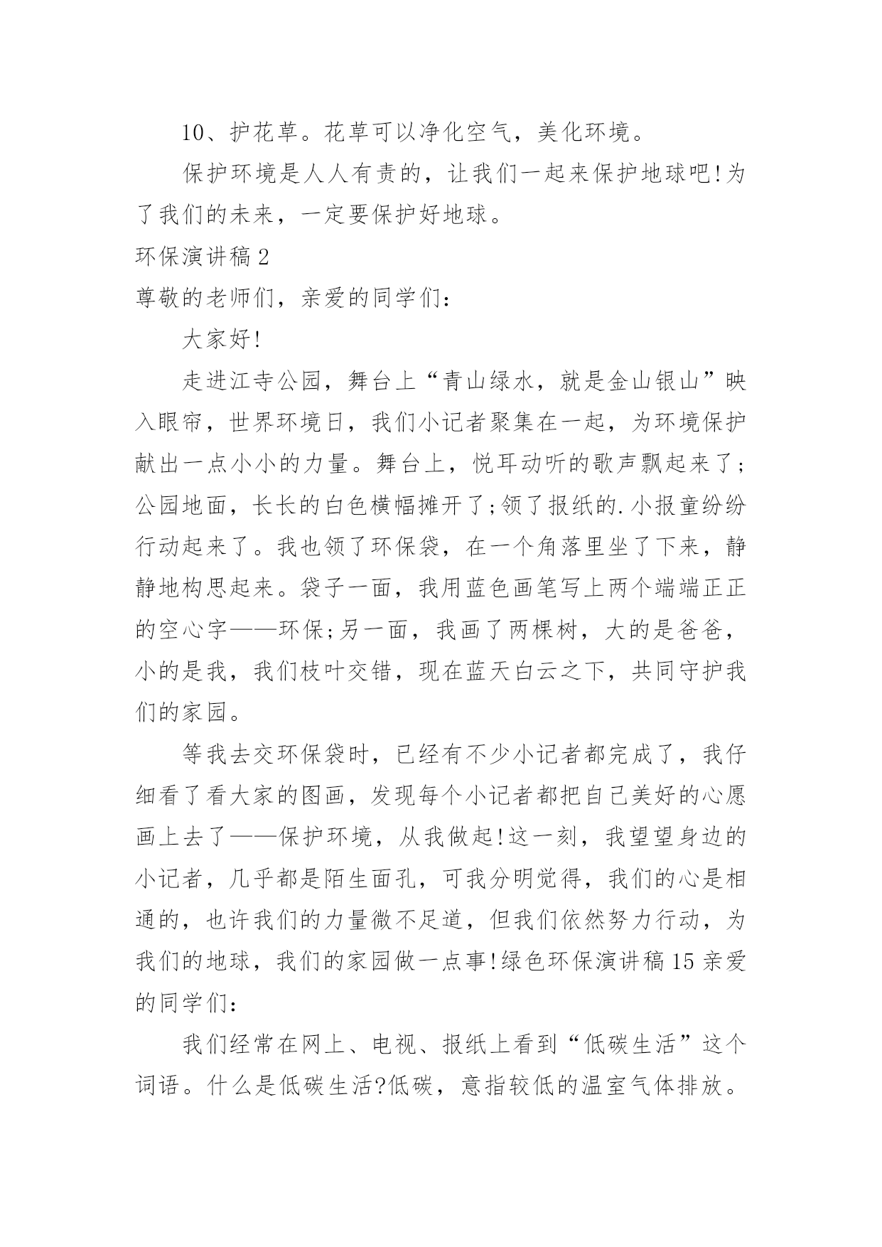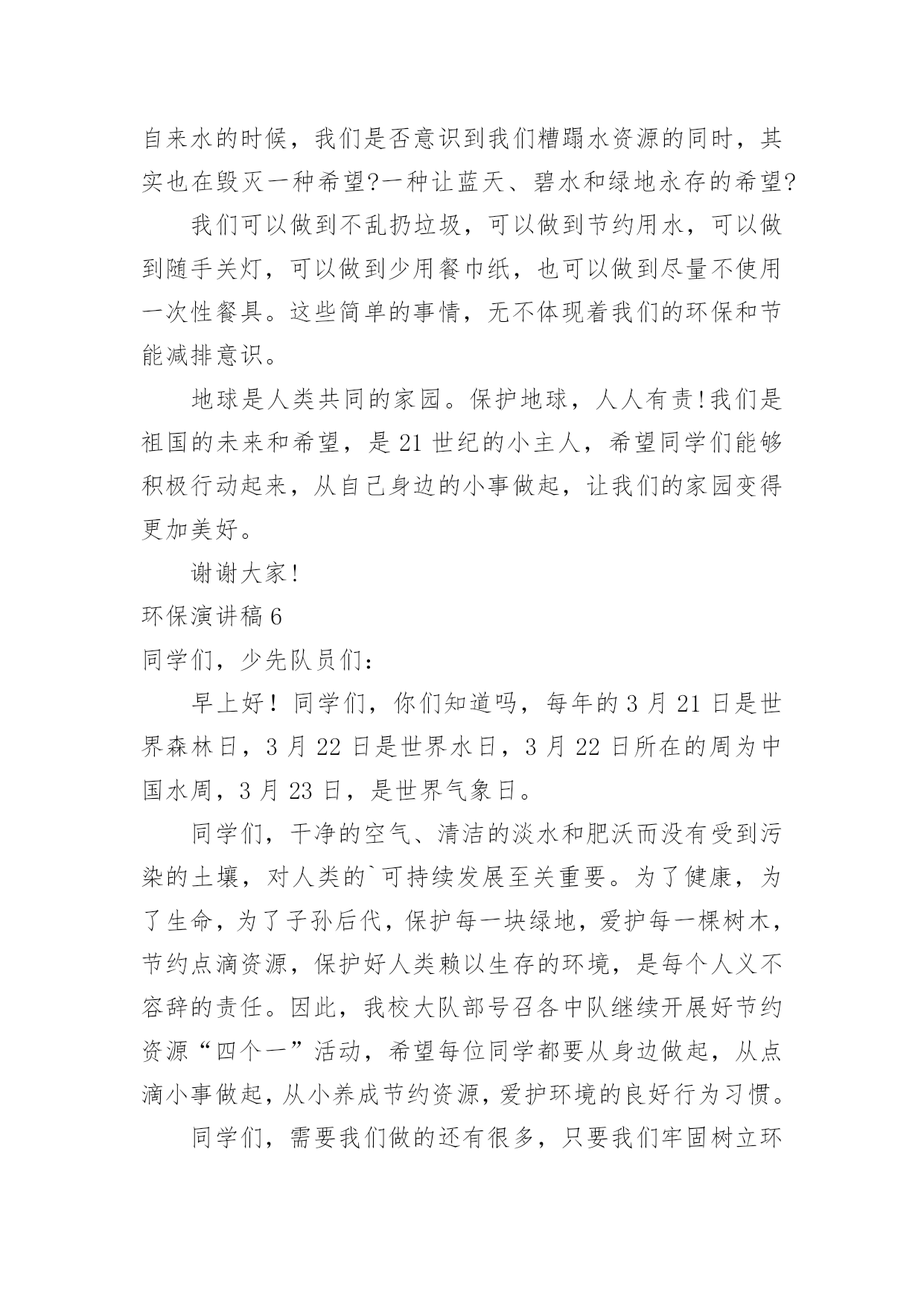 环保演讲稿环保演讲稿【汇总15篇】演讲稿是为了在会议或重要活动上表达自己意见、看法或汇报思想工作情况而事先准备好的文稿。在现在的社会生活中,我们使用上演讲稿的情况与日俱增,怎么写演讲稿才能避免踩雷呢?以下是小编为大家整理的环保演讲稿,欢迎阅读,希望大家能够喜欢。环保演讲稿1所有少先队员:大家好。中国改革XX年后,生活越来越富裕。然而,我们的环境遭受了无尽的破坏。频繁的沙尘暴、严重的沙漠化、污水泛滥、空气污染、森林砍伐……这些都让我们想起了人类。地球虽然寂静,但地球环境的恶化给人们带来了报复和惩罚。面对各种灾难,我们不得不承认,面对自然,人类是极其渺小的。我们在调查原因的时候,往往忘记了这是人类破坏环境造成的恶果。所有的灾难都在提醒人类,人类正在毁灭地球的进步,毁灭自己。地球只有一个,我们不能移动到其他星球。尊重地球意味着尊重我们自己的生命,拯救地球意味着拯救未来。所以,善待自然资源就是善待自己。因此,我提出一些建议:1、不要乱砍滥伐,即使需要树木,在砍树之后,也要种树,这样,才能使生态平衡。2、我们不丢一粒米,白米,很香。我们吃饭时不会忘记农民。得到每一粒米都不容易。是黄豆粒的汗水。优秀的`孩子一定要珍惜。3、不要在树上乱涂乱画。看,你在树上乱涂乱画,小树流出来的水就像眼泪,小树苗在哭。4、有很多种树。春天,我种了一棵小树,我永远不会忘记它。因为是和我一起长大的,所以开了小花,和我一起拍照。除此之外,它还产生了甜的水果让我品尝。又好吃又甜!我种了一棵小树苗,但每年都有回报,所以我们应该多种些树。5、不要乱扔垃圾。乱扔垃圾不仅影响市容,而且污染环境。6、如果你需要开车上班,不妨骑自行车出门!自行车省钱,不省钱。污染空气而且,长时间骑车还可以煅炼身体,增强体质,灰尘也小。7、节约用水,如果全世界的水都没有了,最后一滴水就是人类的眼泪,所以我们要节约用水。8、节约用电。如果没有电,人们在夜晚就会生活在黑暗的世界里,有了电,我们大家才可以工作,学习呀。9、节约用木质东西。大家可能都知道,做木质的东西一定要用到树木,而那些人把树砍后又不植树,最后使树木大量被砍。10、护花草。花草可以净化空气,美化环境。保护环境是人人有责的,让我们一起来保护地球吧!为了我们的未来,一定要保护好地球。环保演讲稿2尊敬的老师们,亲爱的同学们:大家好!走进江寺公园,舞台上“青山绿水,就是金山银山”映入眼帘,世界环境日,我们小记者聚集在一起,为环境保护献出一点小小的力量。舞台上,悦耳动听的歌声飘起来了;公园地面,长长的白色横幅摊开了;领了报纸的.小报童纷纷行动起来了。我也领了环保袋,在一个角落里坐了下来,静静地构思起来。袋子一面,我用蓝色画笔写上两个端端正正的空心字——环保;另一面,我画了两棵树,大的是爸爸,小的是我,我们枝叶交错,现在蓝天白云之下,共同守护我们的家园。等我去交环保袋时,已经有不少小记者都完成了,我仔细看了看大家的图画,发现每个小记者都把自己美好的心愿画上去了——保护环境,从我做起!这一刻,我望望身边的小记者,几乎都是陌生面孔,可我分明觉得,我们的心是相通的,也许我们的力量微不足道,但我们依然努力行动,为我们的地球,我们的家园做一点事!绿色环保演讲稿15亲爱的同学们:我们经常在网上、电视、报纸上看到“低碳生活”这个词语。什么是低碳生活?低碳,意指较低的温室气体排放。就是低能量,低消耗的生活方式。简单理解,低碳生活就是返璞归真地去进行人与自然的活动。因此低碳生活是我国提倡生活方式之一。低碳生活代表着更健康、更自然、更安全的生活,同时也是一种低成本、低代价的生活方式。如何做到低碳生活呢?只有从小事做起,身体力行。我准备这样做:随手关灯、开关、拔插头,这是第一步,也是个人修养的表现。不坐电梯爬楼梯,省下大家的电,换自己的健康。第二、在我们玩电脑、看电视时应尽量将屏幕亮度调低一点,这样就能减少一些电耗。第三、多步行,骑自行车,少坐汽车。四、少用纸巾,重拾手帕,保护森林。少用塑料袋和快餐盒,减少白色污染。让我们行动起来吧!从我做起,从小事做起,走进低碳生活,创造美好的生活环境!环保演讲稿3老师们、同学们:早上好!今天我的题目是《让我们共同爱护学校环境,爱护我们的家》。每当你跨入校园大门,步入教室时,你是否感觉到好象走进自己的另一个家。是的,校园就是我们的家,我们将在这里学习、生活、长大。我们每位同学都是大荣小学的家庭成员。校园,是我们学习工作的重要场所。校园环境卫生的好坏直接影响到老师和我们每一个同学的学习和生活,同时,校园环境也是一个学校文明程度的重要标志,是学校对外形象好坏的直观影响因素,也是学校学生整体素质的一个反映。可想而知环境对于我们的重要性。谁不想生活在舒适的环境中呢?碧绿的草坪,干净的走廊,洁白的墙壁,艳丽的花朵。哪一样不是我们渴望见到的