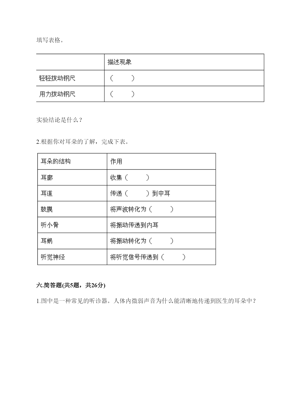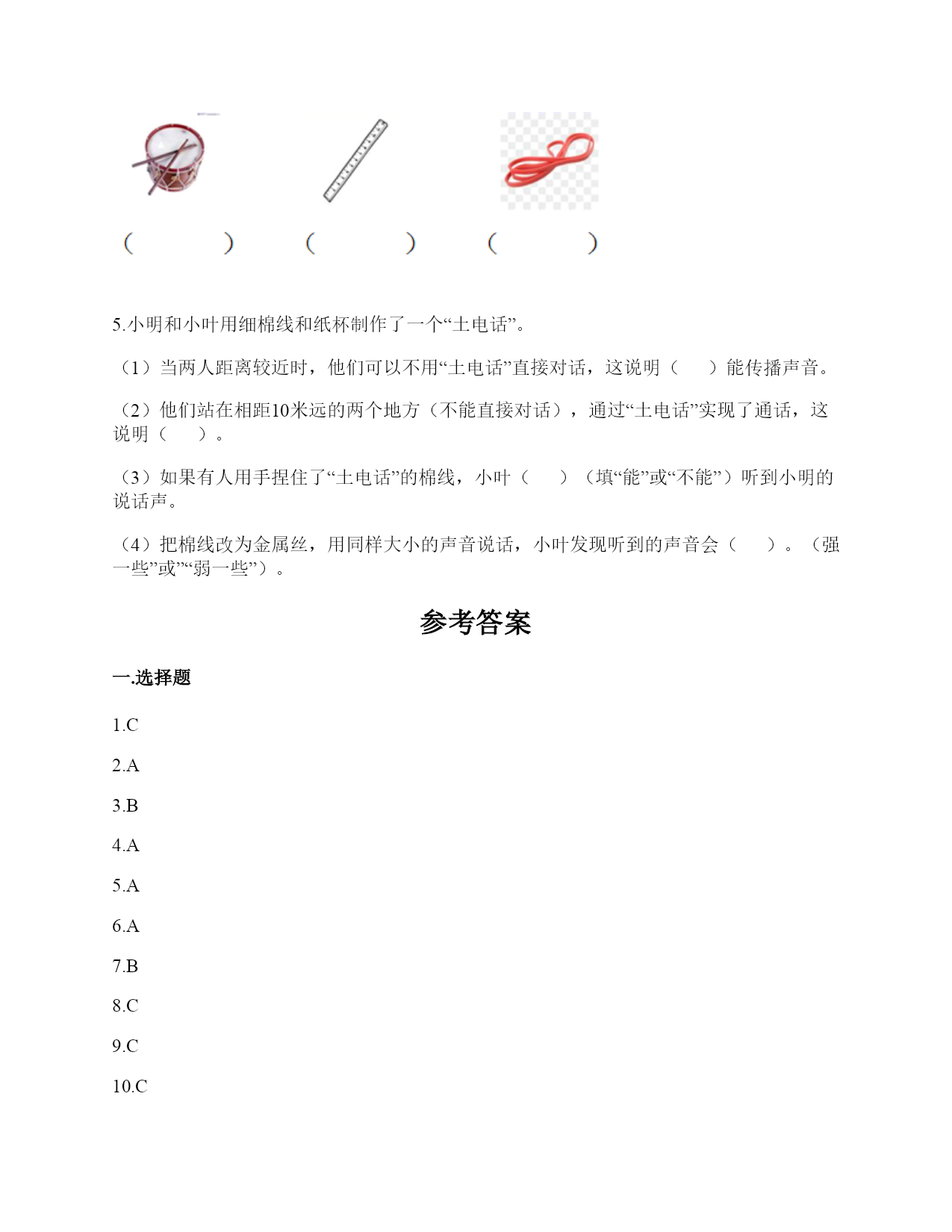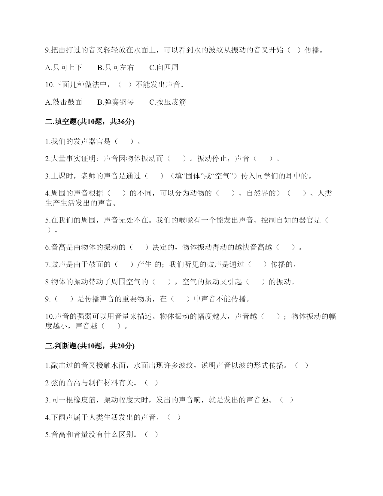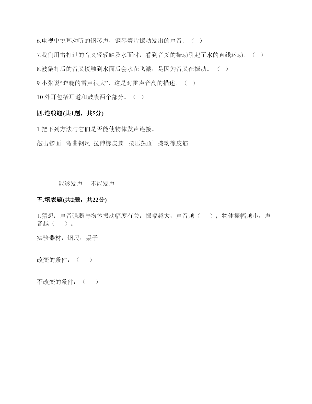 小学科学《声音》练习题一.选择题(共10题,共20分)1.电影《铁道游击队》中的队员们为了抗日,经常将耳朵贴在钢轨上,这样做主要是()。A.卧倒,防止敌人发现自己B.防止敌人的机枪扫射C.因为声音在钢轨中传播比在空气中快,能提前听到日军火车到来2.利用棉线和纸杯制作的“土电话”,声音主要是通过()从话简传到听筒的。A.棉线B.空气C.话筒3.古琴是我国历史悠久的乐器,由7根长短相同、粗细不同的弦组成。小雅弹古琴时,要使它发出的声音更响一些,可以()。A.弹更粗的琴弦B.弹得更用力一些C.轻轻地弹4.下列物质中,声音在()中传播速度最快。A.铁轨B.大海C.空气5.演奏家停止拨琴弦,琴声还能持续产生,主要原因是()。A.琴弦还在振动B.人们还沉浸在音乐中C.空气能传播声音6.下列关于声音说法正确的是()。A.敲鼓时鼓面振动幅度大,声音越高B.乐器振动的越快,声音越强C.蚊子发出的声音比牛发出的声音音量弱7.我们能够发出声音的器官是()。A.舌B.声带C.鳃8.下列关于声音传播的叙述,正确的是()。A.老师讲课的声音传播到我们的耳朵中,没有依靠任何物质B.真空中也能传声C.敲锣时,要使锣停止发声,可用手使劲按住锣面不让其振动9.把击打过的音叉轻轻放在水面上,可以看到水的波纹从振动的音叉开始()传播。A.只向上下B.只向左右C.向四周10.下面几种做法中,()不能发出声音。A.敲击鼓面B.弹奏钢琴C.按压皮筋二.填空题(共10题,共36分)1.我们的发声器官是()。2.大量事实证明:声音因物体振动而()。振动停止,声音()。3.上课时,老师的声音是通过()(填“固体”或“空气”)传入同学们的耳中的。4.周围的声音根据()的不同,可以分为动物的()、自然界的)()、人类生产生活发出的声音。5.在我们的周围,声音无处不在。我们的喉咙有一个能发出声音、控制自如的器官是()。6.音高是由物体的振动的()决定的,物体振动得动的越快音高越()。7.鼓声是由于鼓面的()产生的;我们听见的鼓声是通过()传播的。8.物体的振动带动了周围空气的(),空气的振动又引起()的振动。9.()是传播声音的重要物质,在()中声音不能传播。10.声音的强弱可以用音量来描述。物体振动的幅度越大,声音越();物体振动的幅度越小,声音越()。三.判断题(共10题,共20分)1.敲击过的音叉接触水面,水面出现许多波纹,说明声音以波的形式传播。()2.弦的音高与制作材料有关。()3.同一根橡皮筋,振动幅度大时,发出的声音响,就是发出的声音强。()4.下雨声属于人类生活发出的声音。()5.音高和音量没有什么区别。()6.电视中悦耳动听的钢琴声,钢琴簧片振动发出的声音。()7.我们用击打过的音叉轻轻触及水面时,看到音叉的振动引起了水的直线运动。()8.被敲打后的音叉接触到水面后会水花飞溅,是因为音叉在振动。()9.小张说“昨晚的雷声很大”,这是对雷声音高的描述。()10.外耳包括耳道和鼓膜两个部分。()四.连线题(共1题,共5分)1.把下列方法与它们是否能使物体发声连接。敲击锣面弯曲钢尺拉伸橡皮筋按压鼓面拨动橡皮筋能够发声不能发声五.填表题(共2题,共22分)1.猜想:声音强弱与物体振动幅度有关,振幅越大,声音越();物体振幅越小,声音越()。实验器材:钢尺,桌子改变的条件:()不改变的条件:()填写表格。实验结论是什么?2.根据你对耳朵的了解,完成下表。六.简答题(共5题,共26分)1.图中是一种常见的听诊器。人体内微弱声音为什么能清晰地传递到医生的耳朵中?2.停止敲锣后,在一段时间内还能听到锣声,这是为什么?3.二胡有两根弦,空弦拉的时候,发出的声音有高有低,这是为什么?4.在相同力量下,能影响弦发出高低不同声音的因素有哪些?5.抽出玻璃罩内的空气,闹钟的声音有什么变化?怎样解释我们看到的现象?声音的传播与空气有关系吗?七.材料题(共3题,共17分)1.小明和小刚用细棉线连接两个纸杯做了个“土电话”。之后俩人相距5米,一端的小明轻声讲话,另一端的小刚也能听得很清楚,为什么?在用“土电话”时,如果其中一人用手捏住棉线,另一个人就听不到声音了,为什么?2.唐朝著名诗人白居易在《琵琶行》中有“大弦嘈嘈如急雨,小弦切切如私语”的诗句。意思是粗弦嘈嘈,好像是疾风骤雨,细弦切切,好像是儿女私语。根据所学的知识,说一说弦的粗细对音高有什么影响?还有哪些因素能影响音高?3.如图所示:在一块木板上钉两个钉子,在两个钉子之间绑一根橡皮筋,拨弹橡皮筋,观察比较声音高低的变化。实验记录如下:实验说明:物体振动得越快,发出的声音就越();物体振动得越